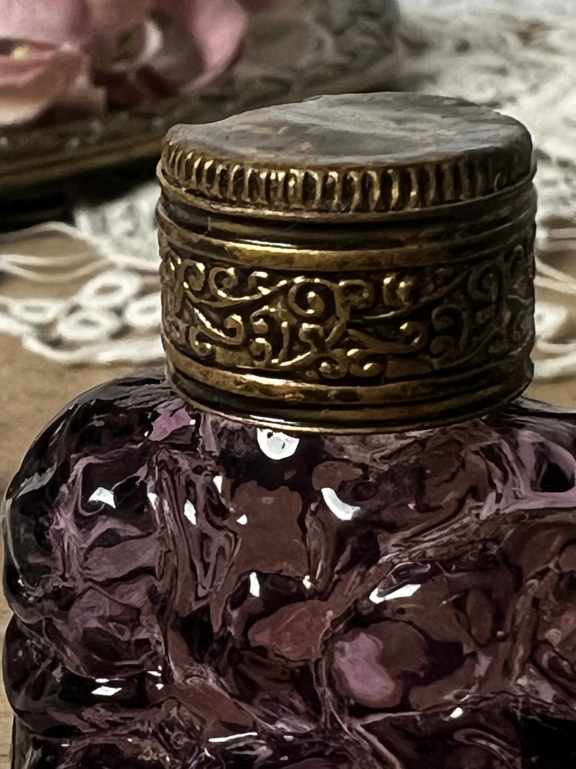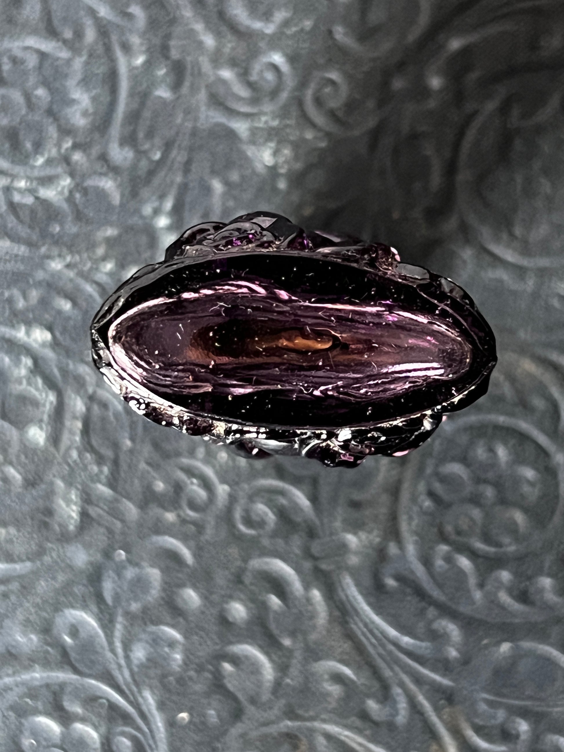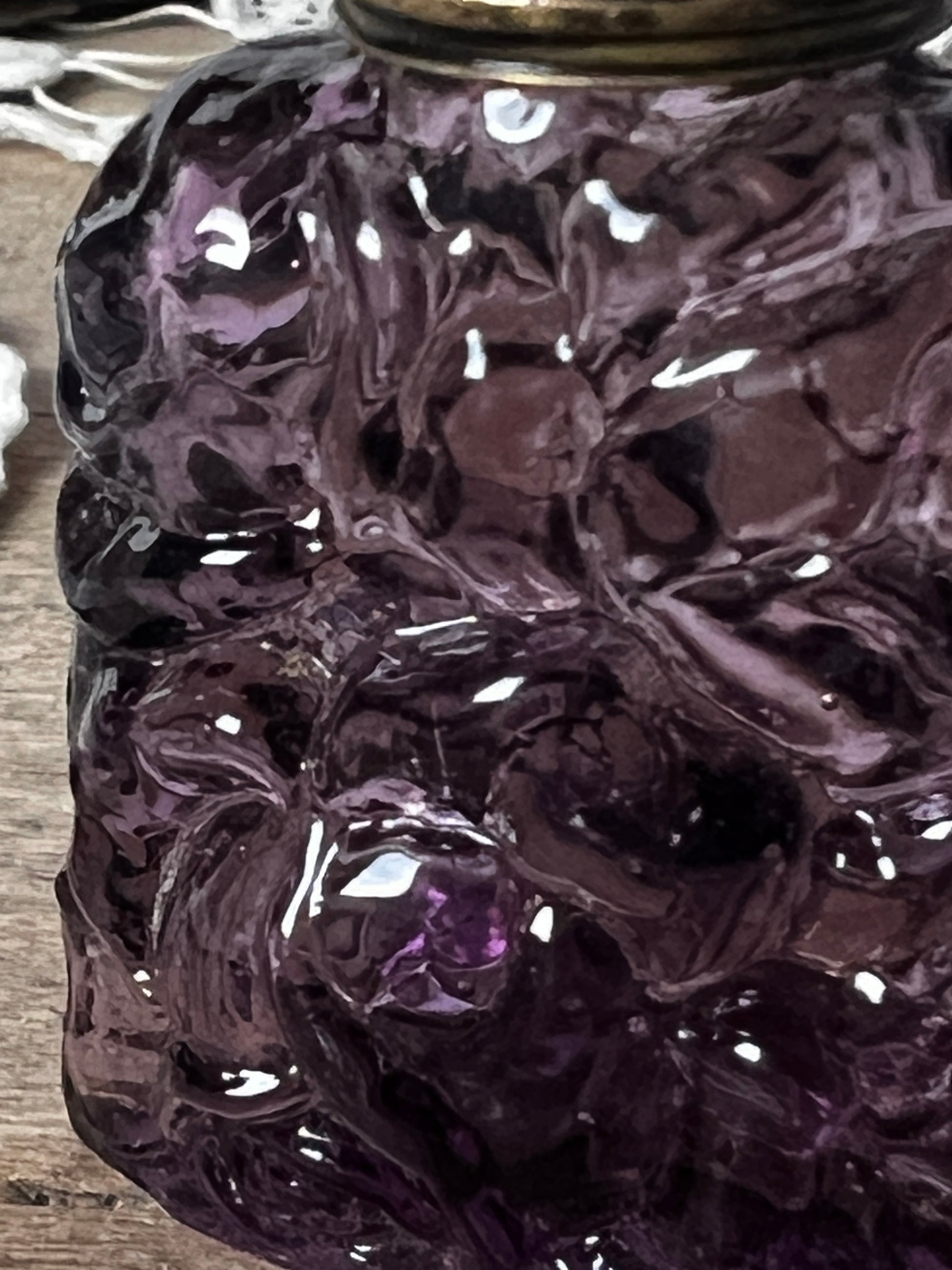 落ち着きあるヴィオレットカラーのガラスの表面全体に施された細工模様が美しく蓋の装飾も印象的
