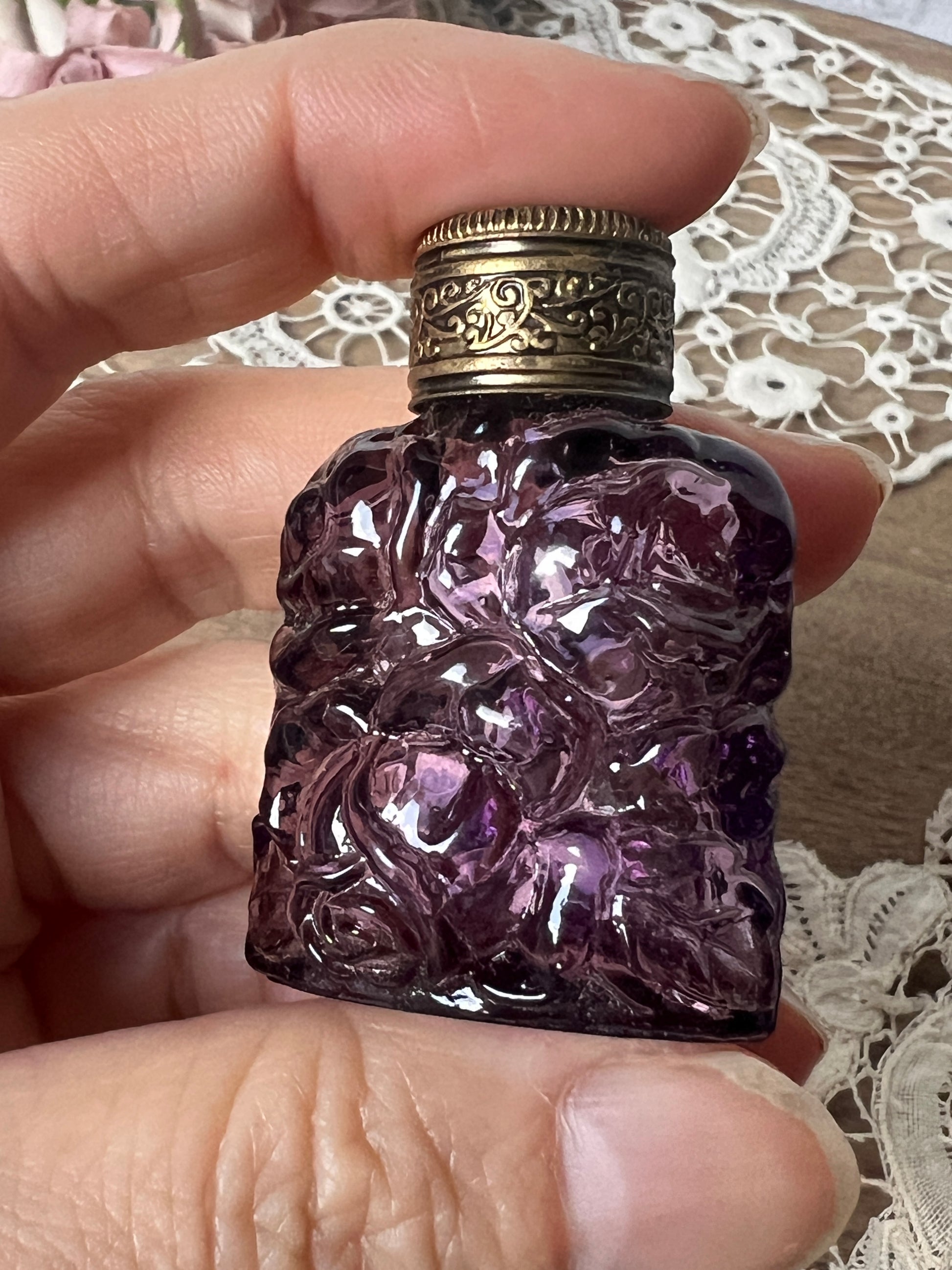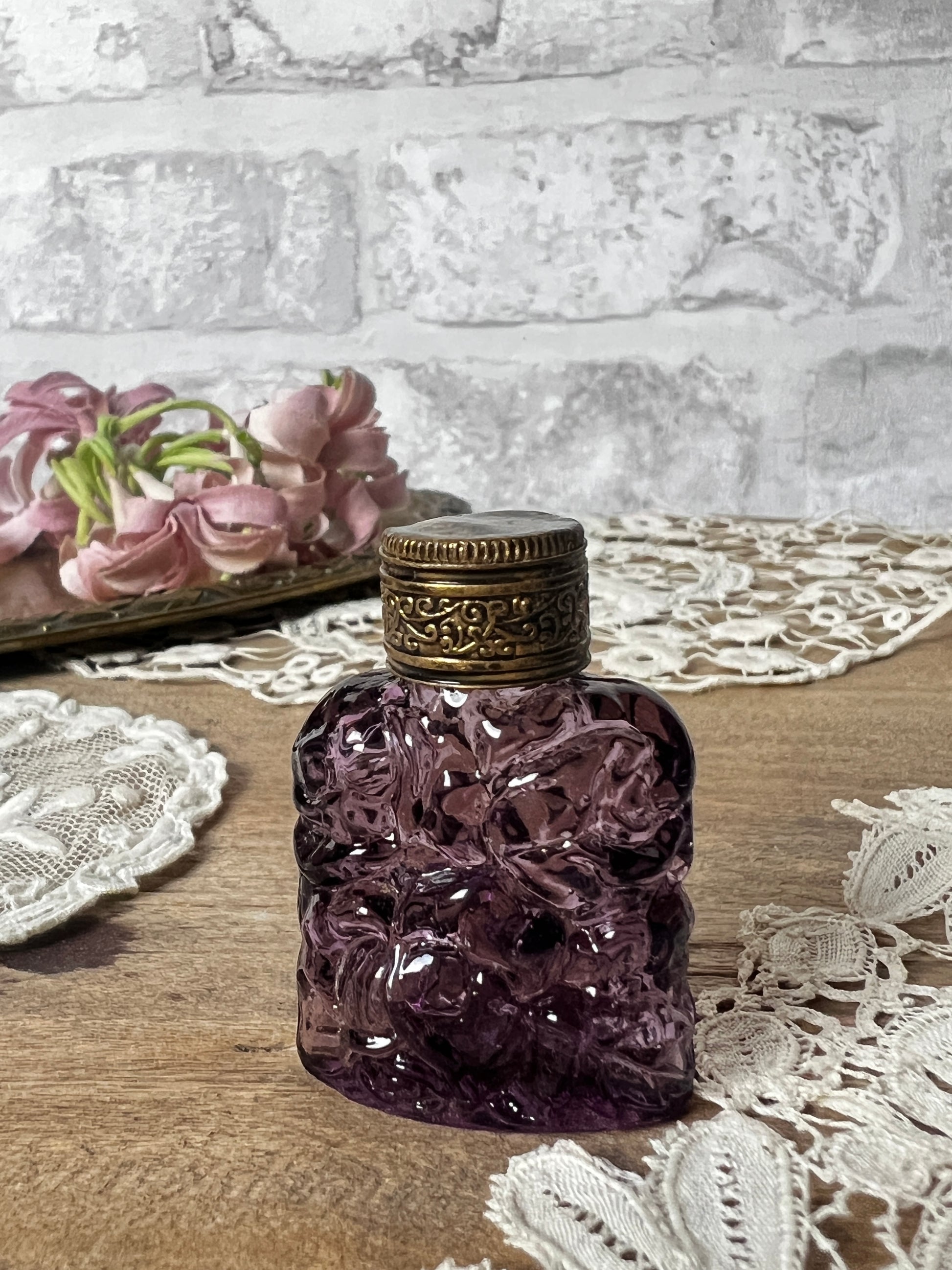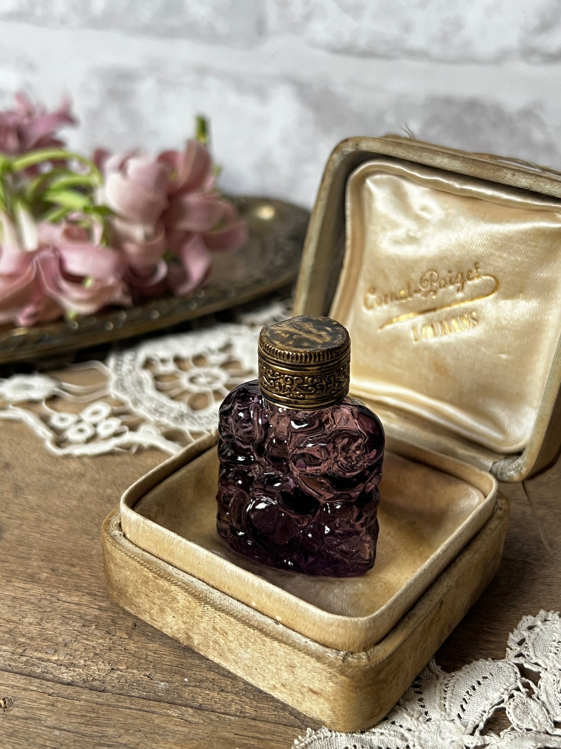 落ち着きあるヴィオレットカラーのガラスの表面全体に施された細工模様が美しく蓋の装飾も印象的
