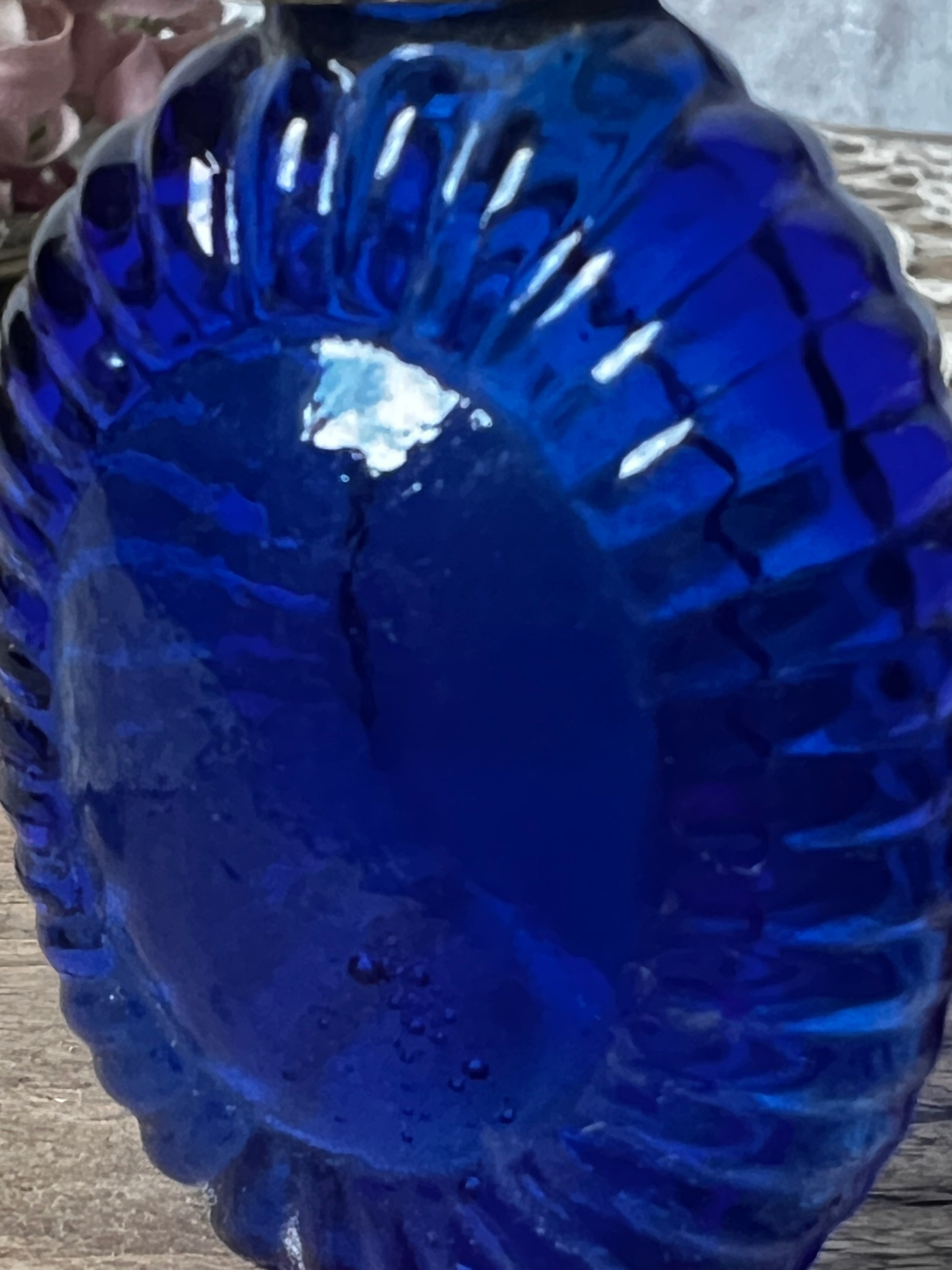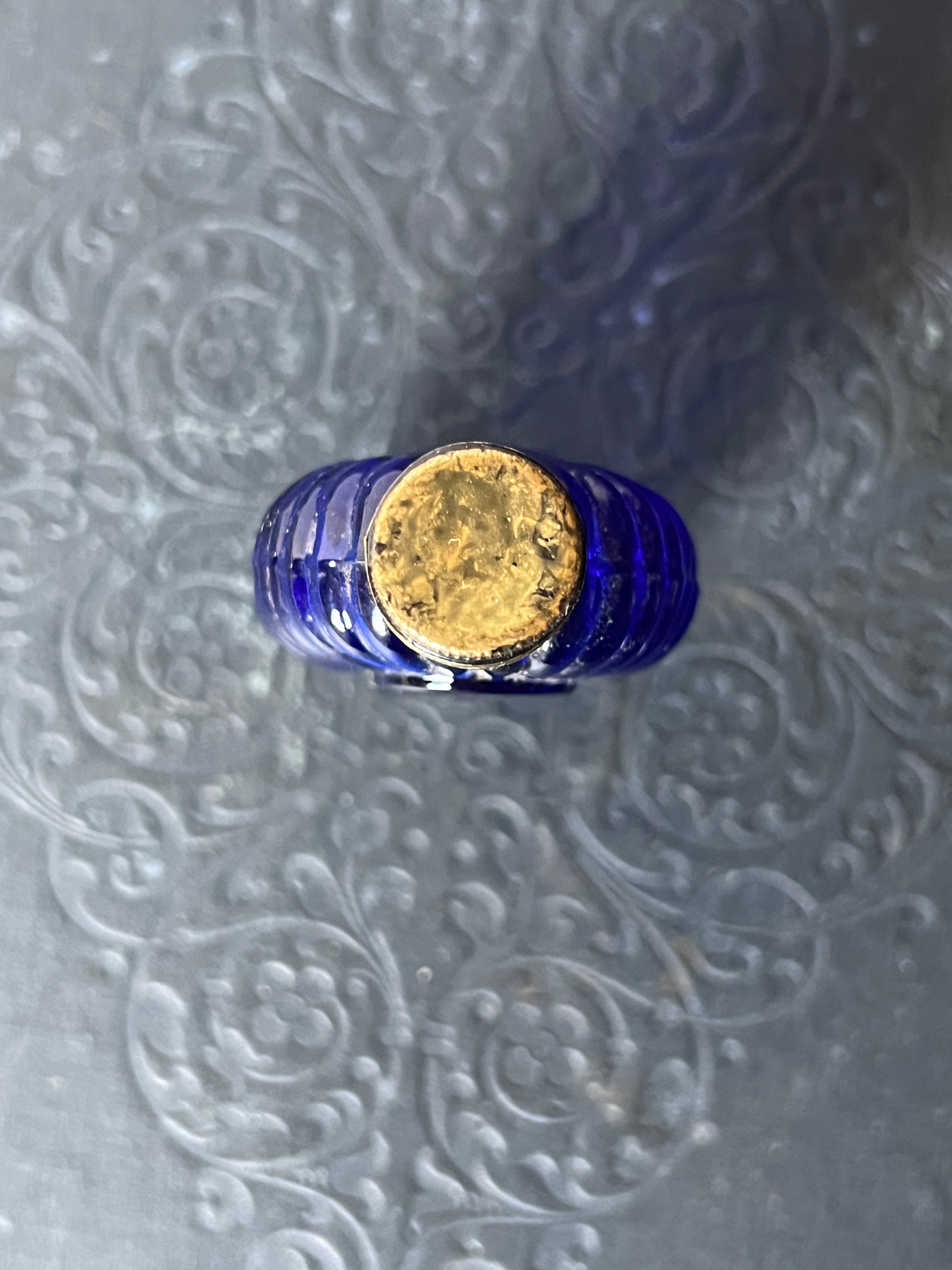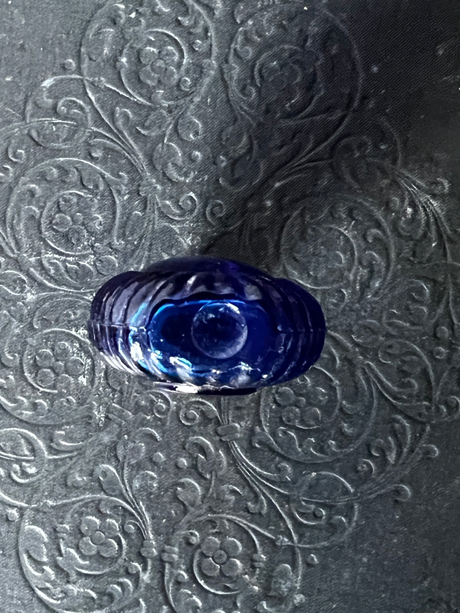 深みあるブルーのガラス表面の細工模様が美しく蓋の装飾も印象的