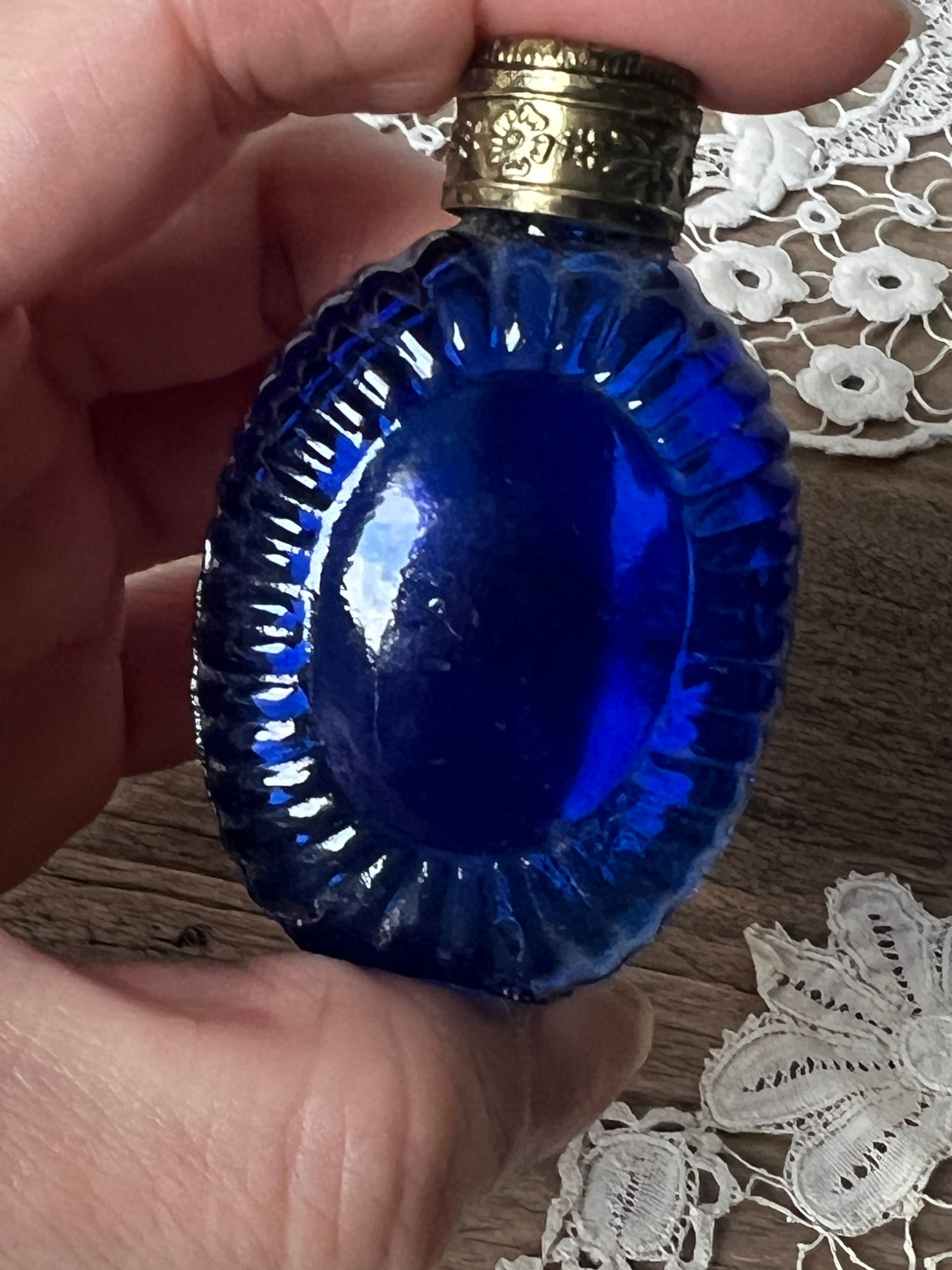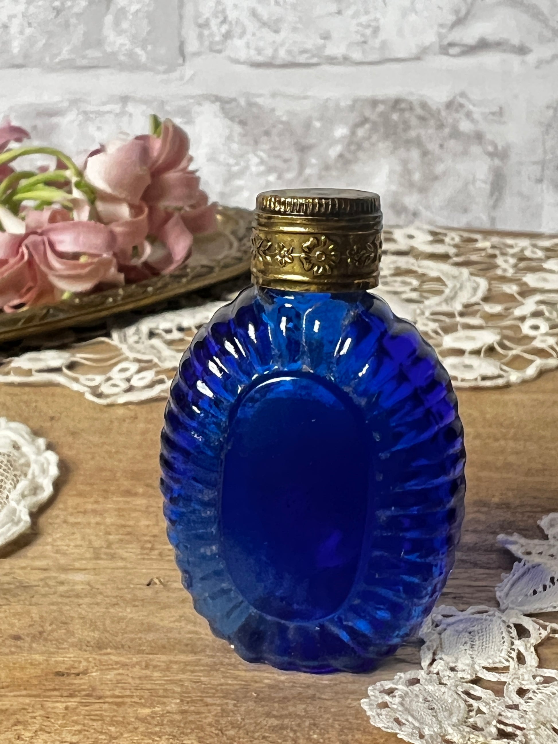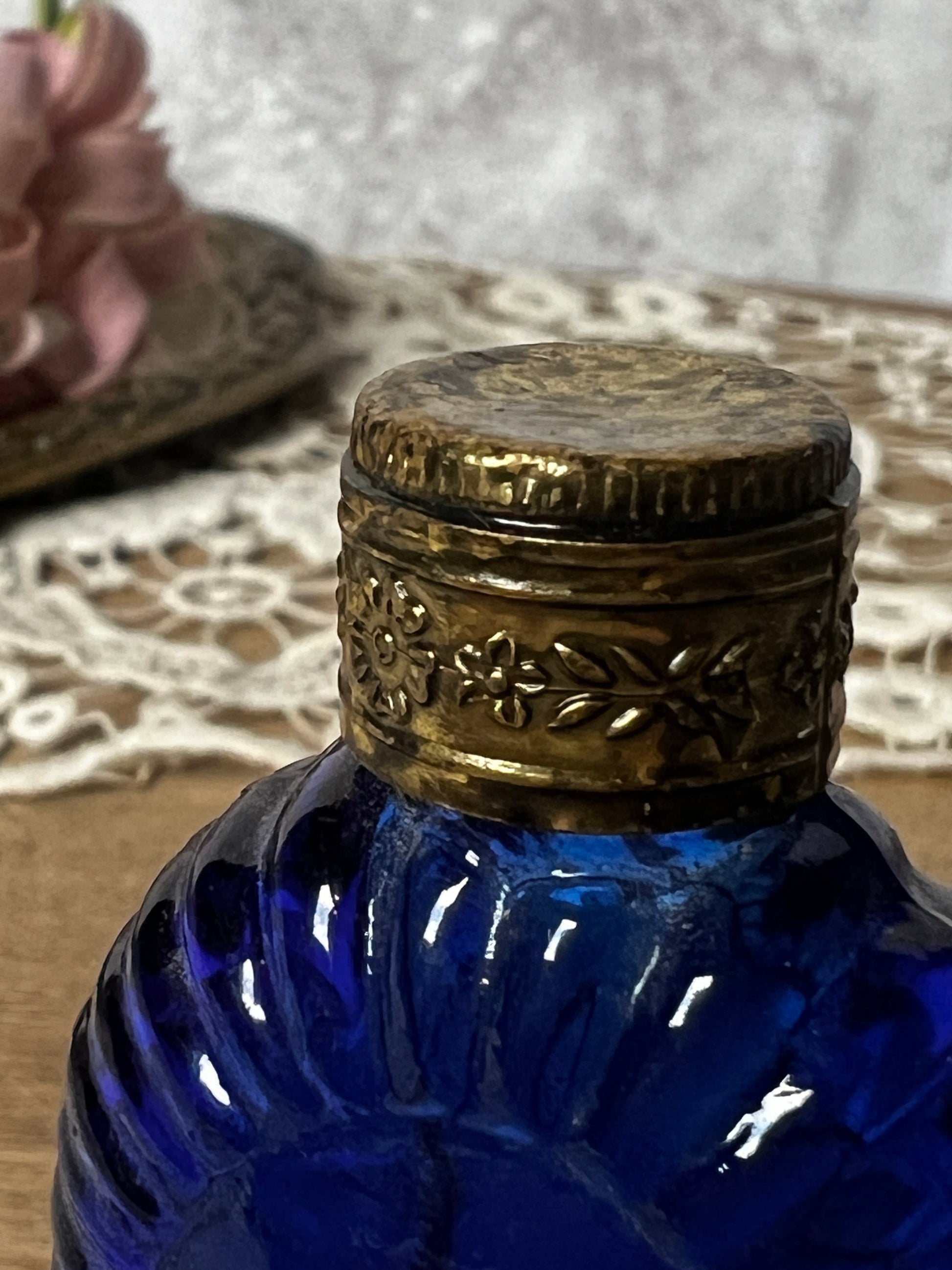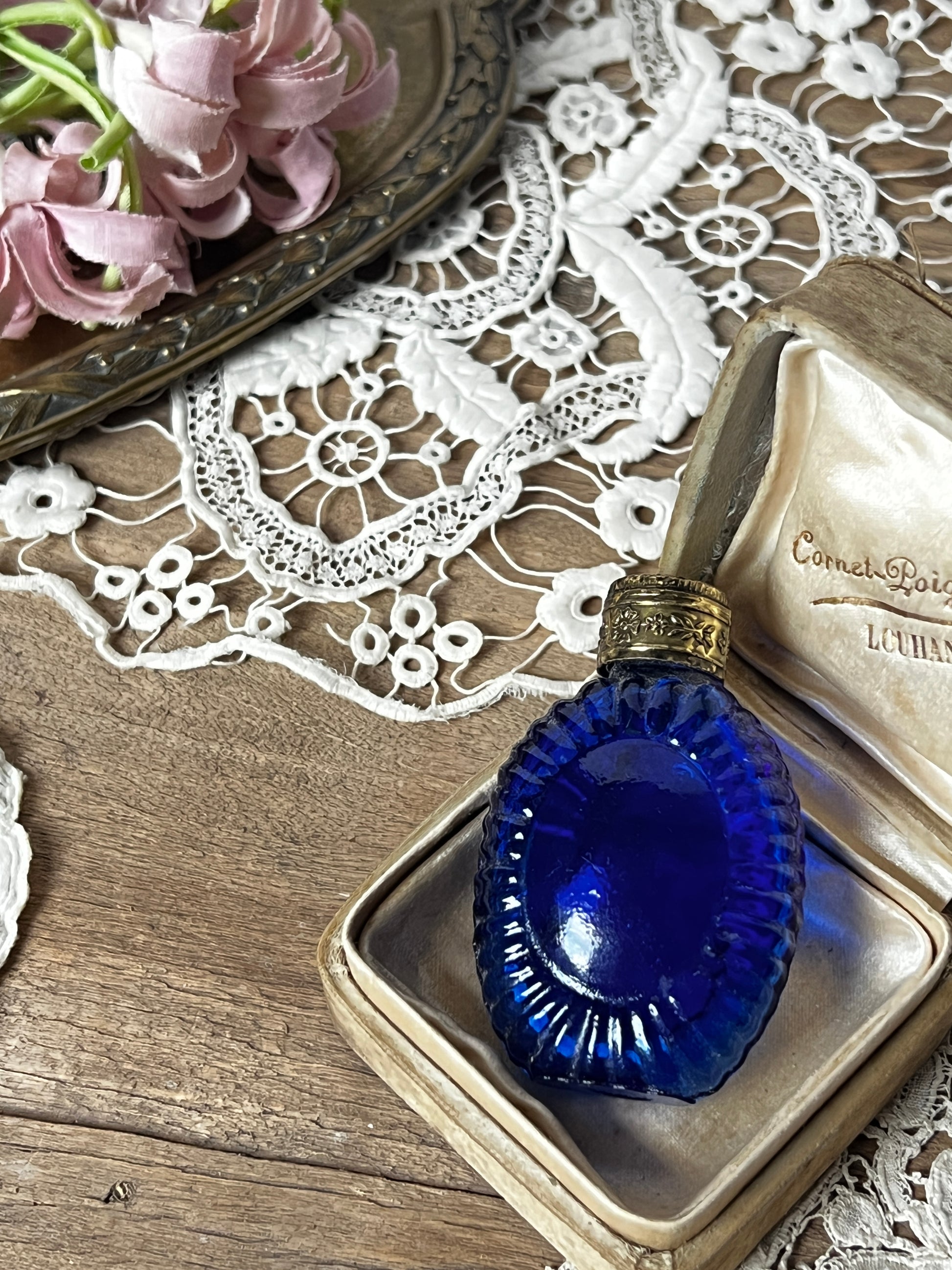 深みあるブルーのガラス表面の細工模様が美しく蓋の装飾も印象的