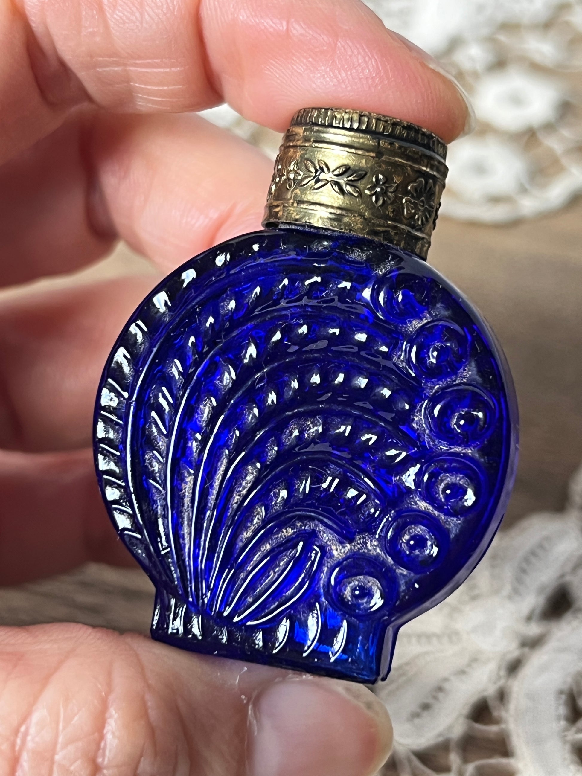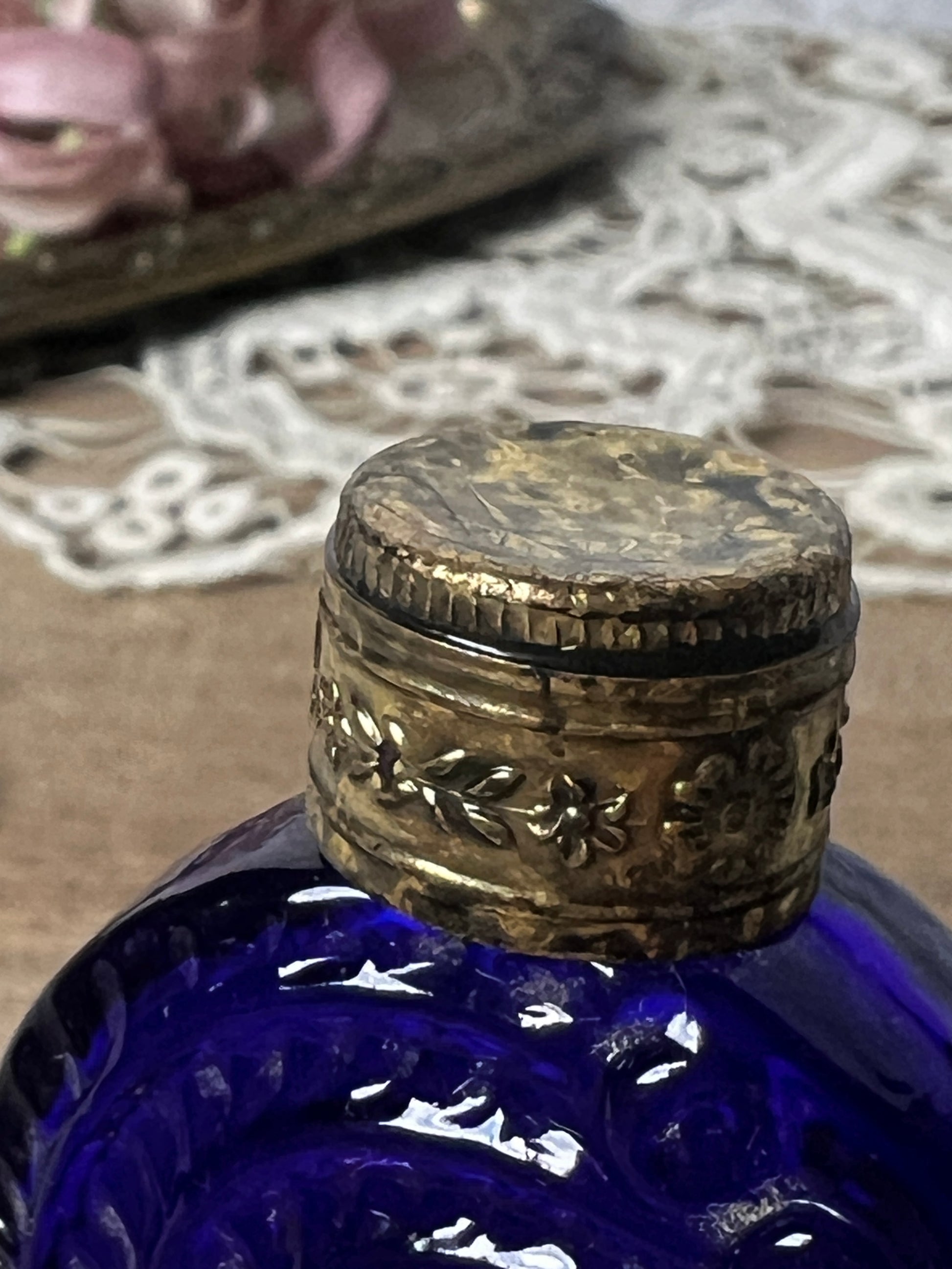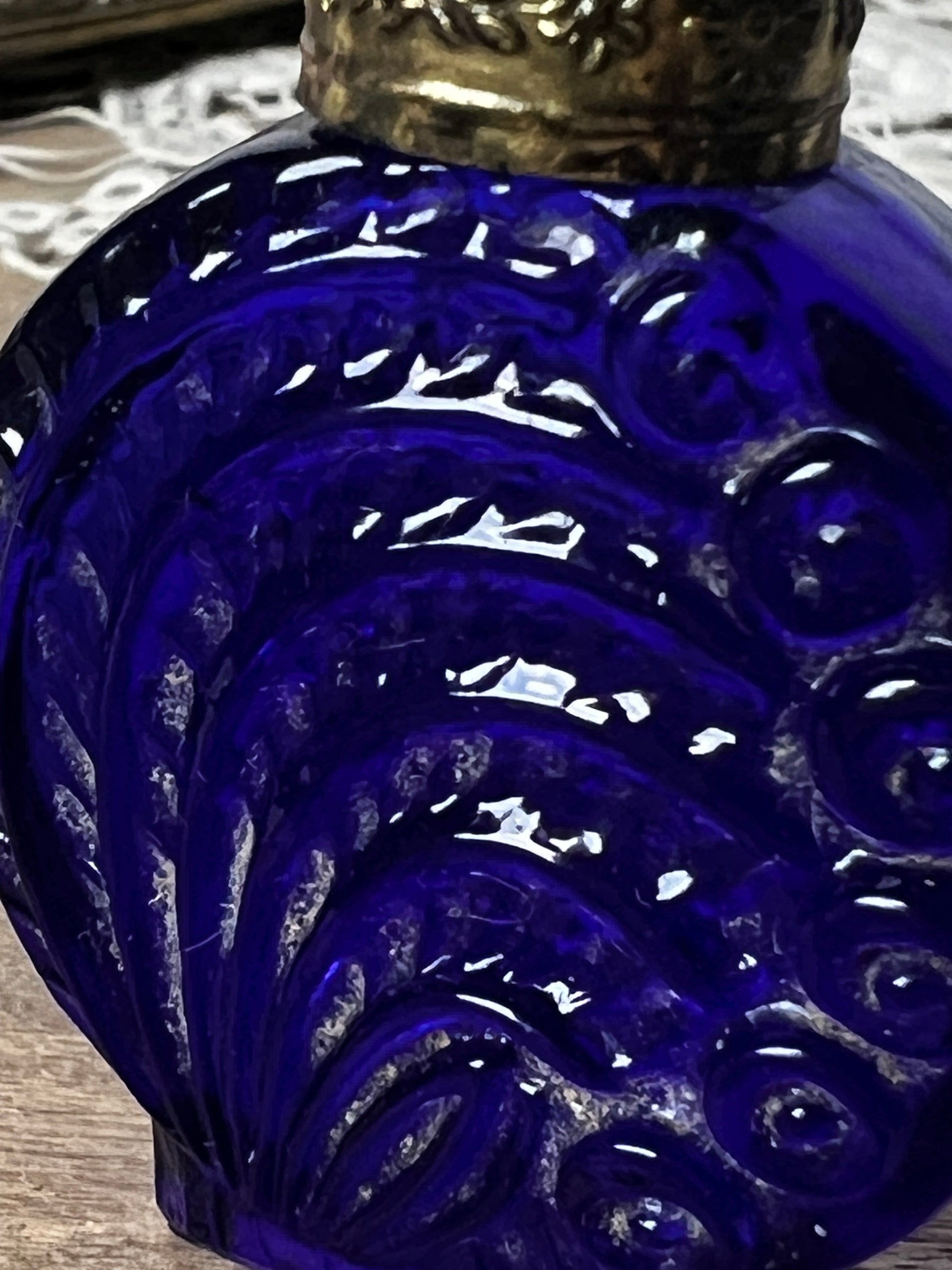 ブルーのガラスの表面全体に施された細工模様が美しく蓋の装飾も印象的