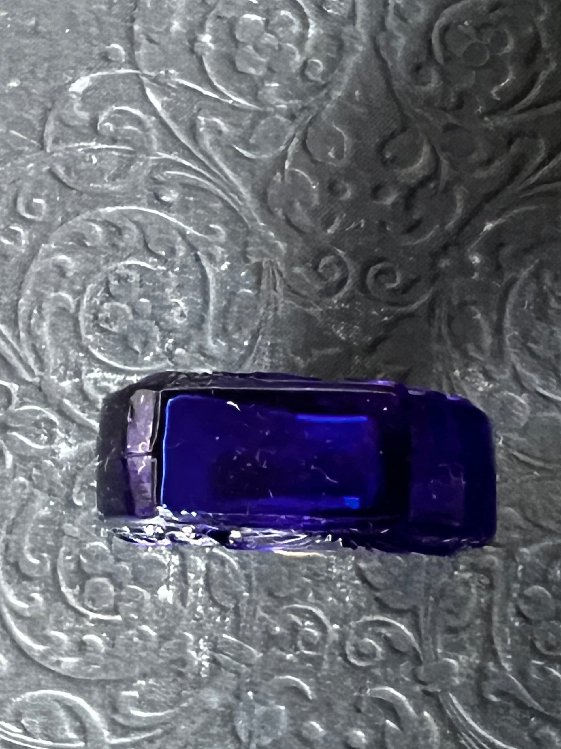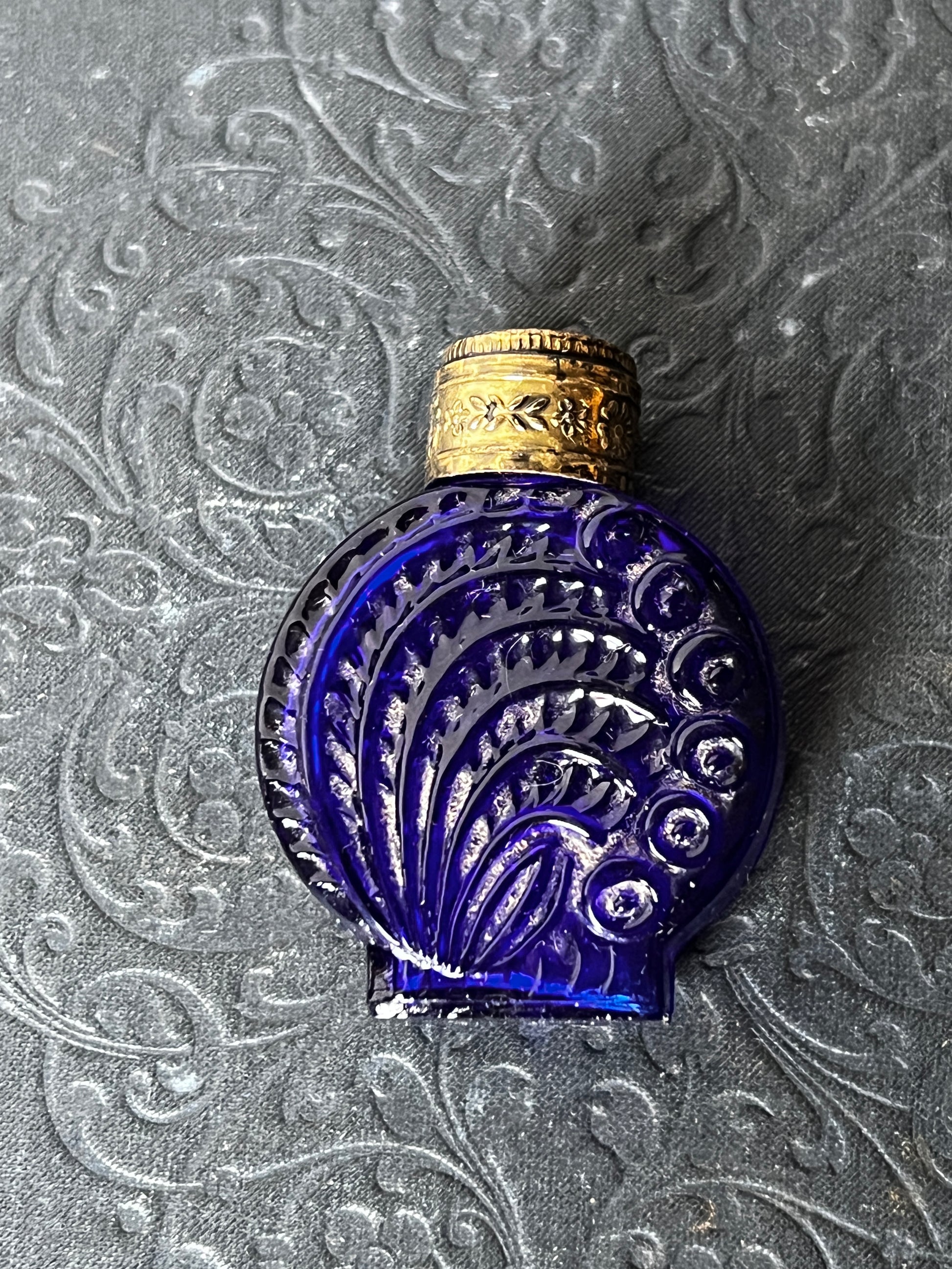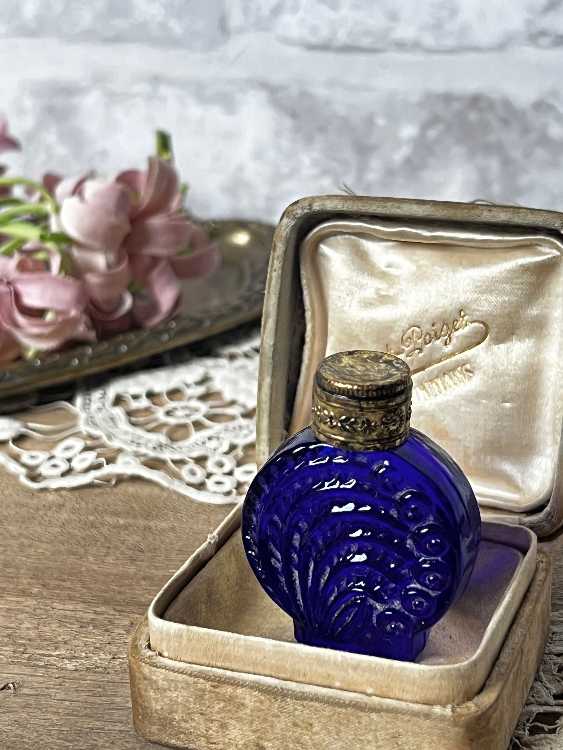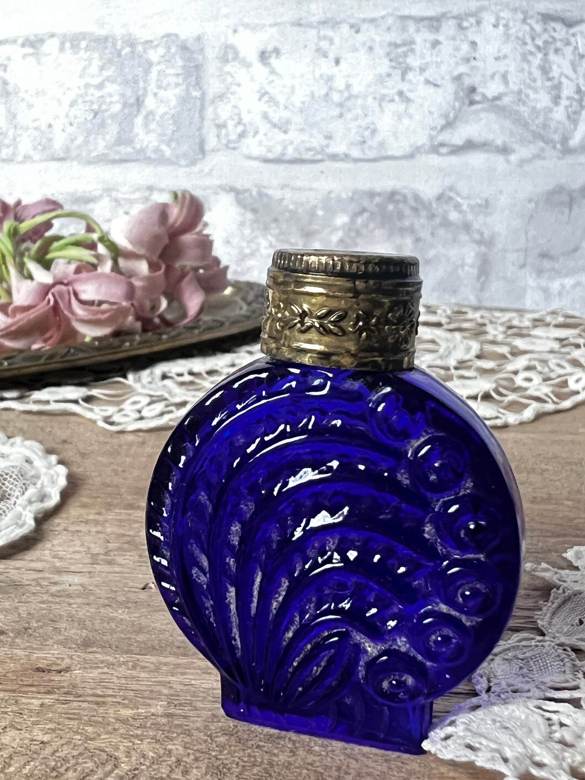 ブルーのガラスの表面全体に施された細工模様が美しく蓋の装飾も印象的