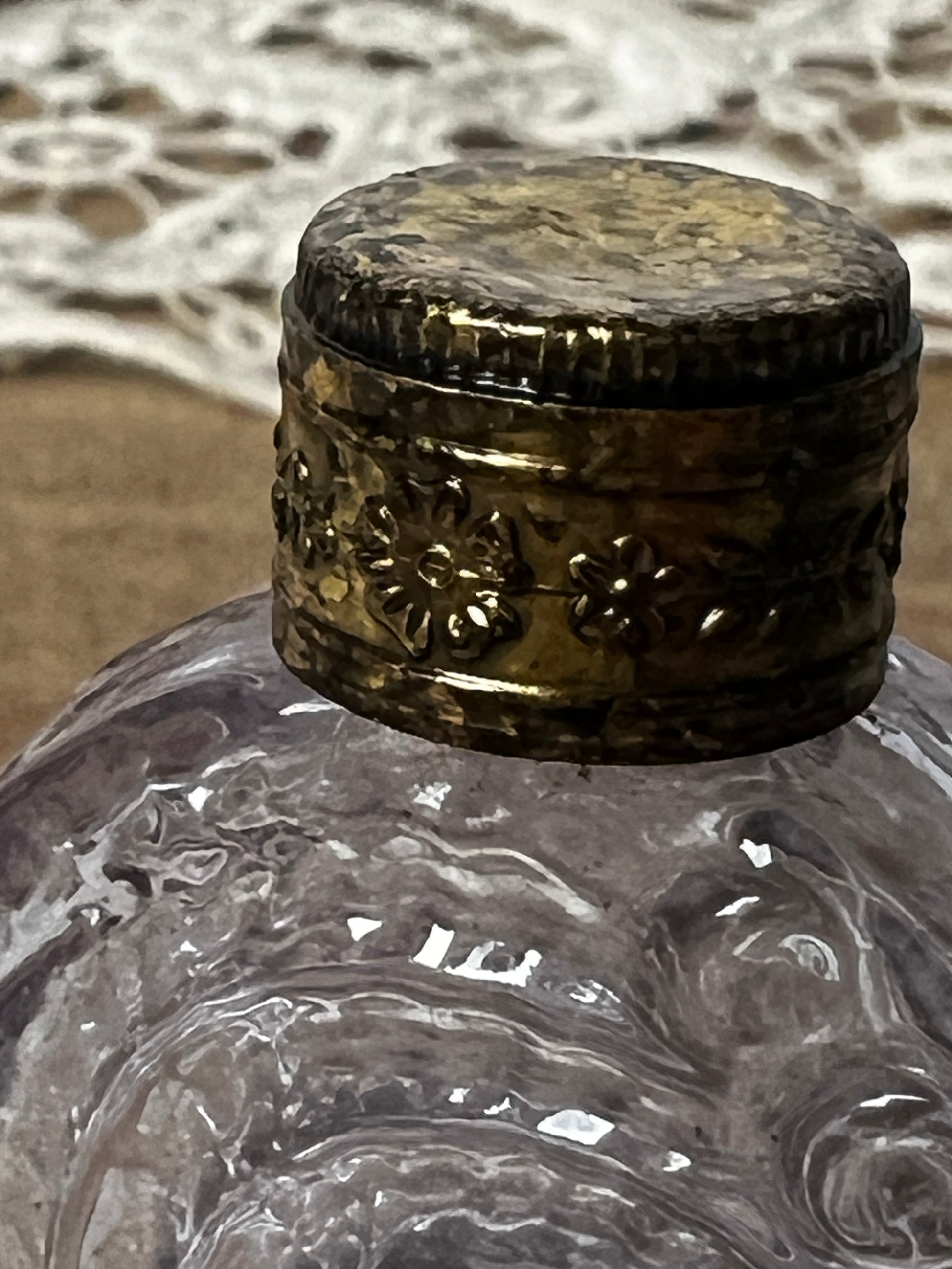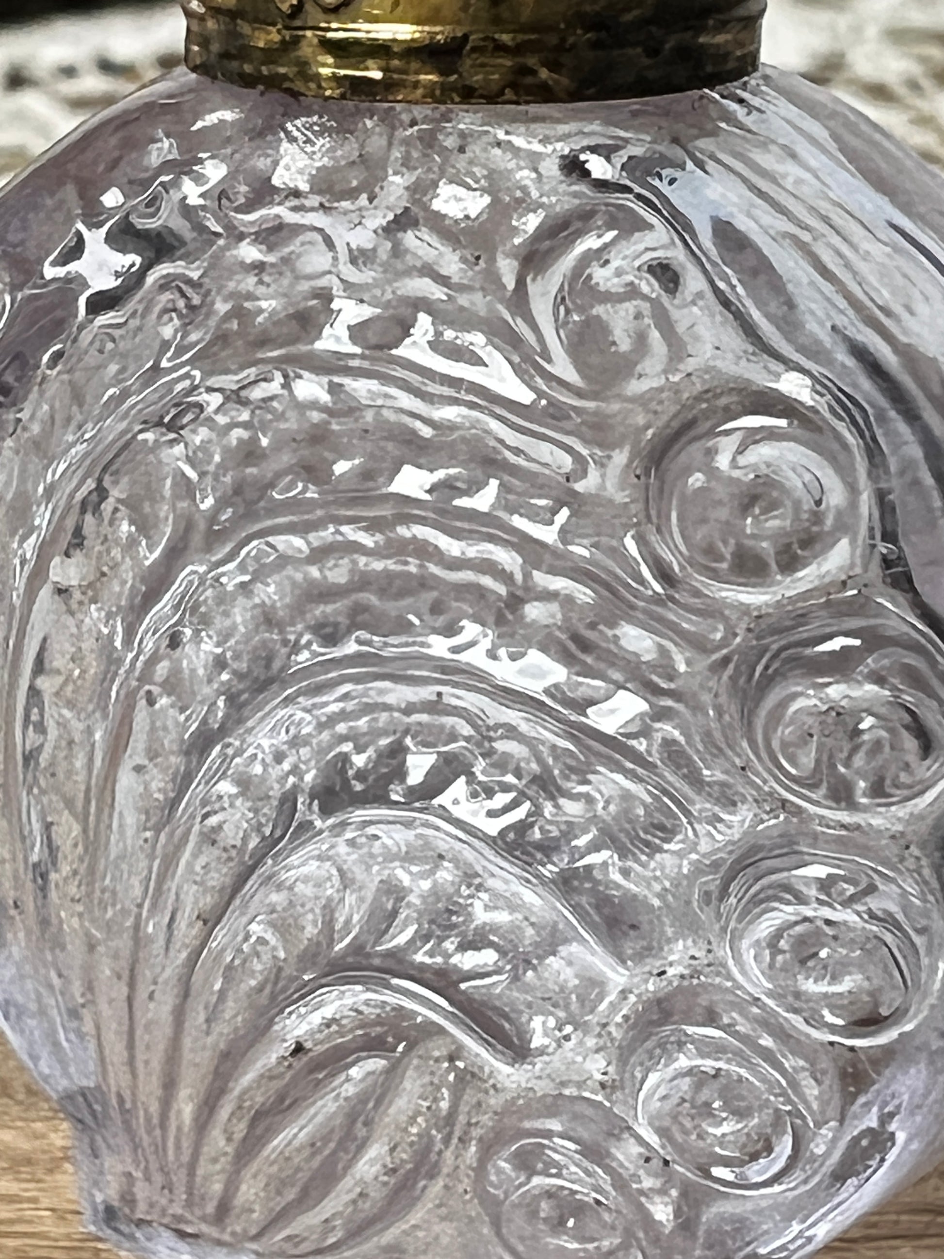 ラヴェンダーカラーのガラスの表面全体に施された細工模様が美しく蓋の装飾も印象的