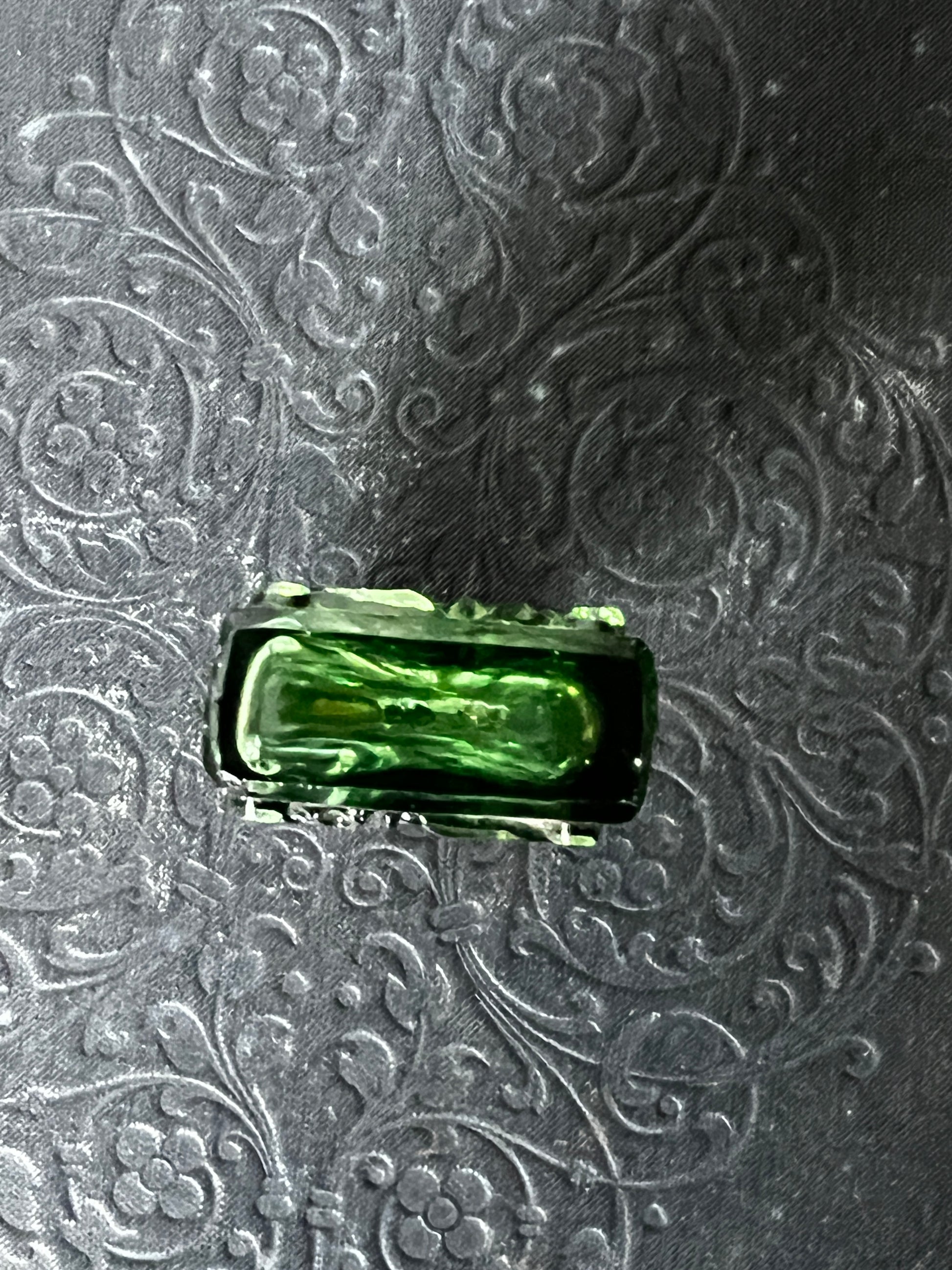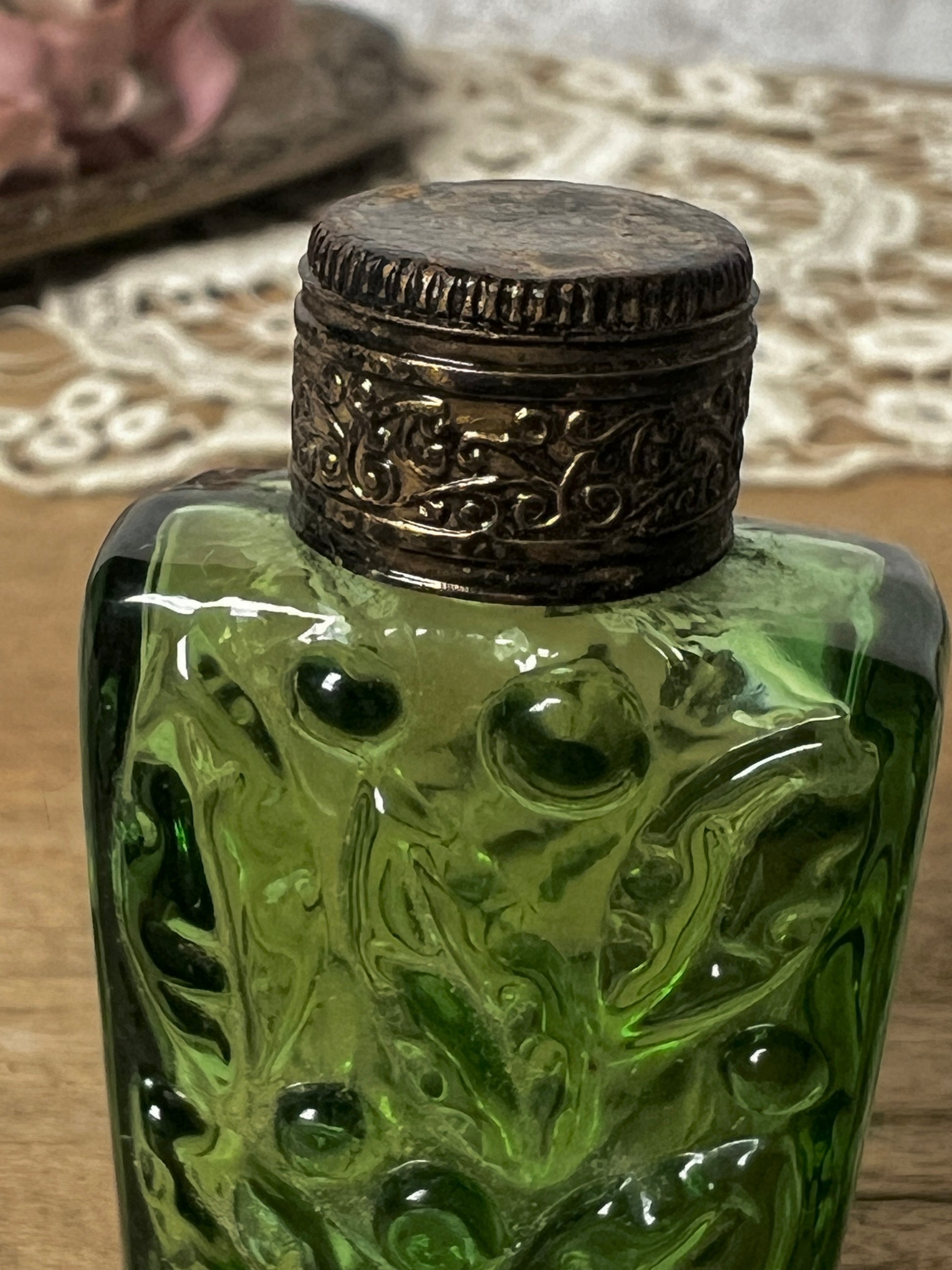 グリーンのガラス表面全体に施された細工模様が美しく蓋の装飾も印象的