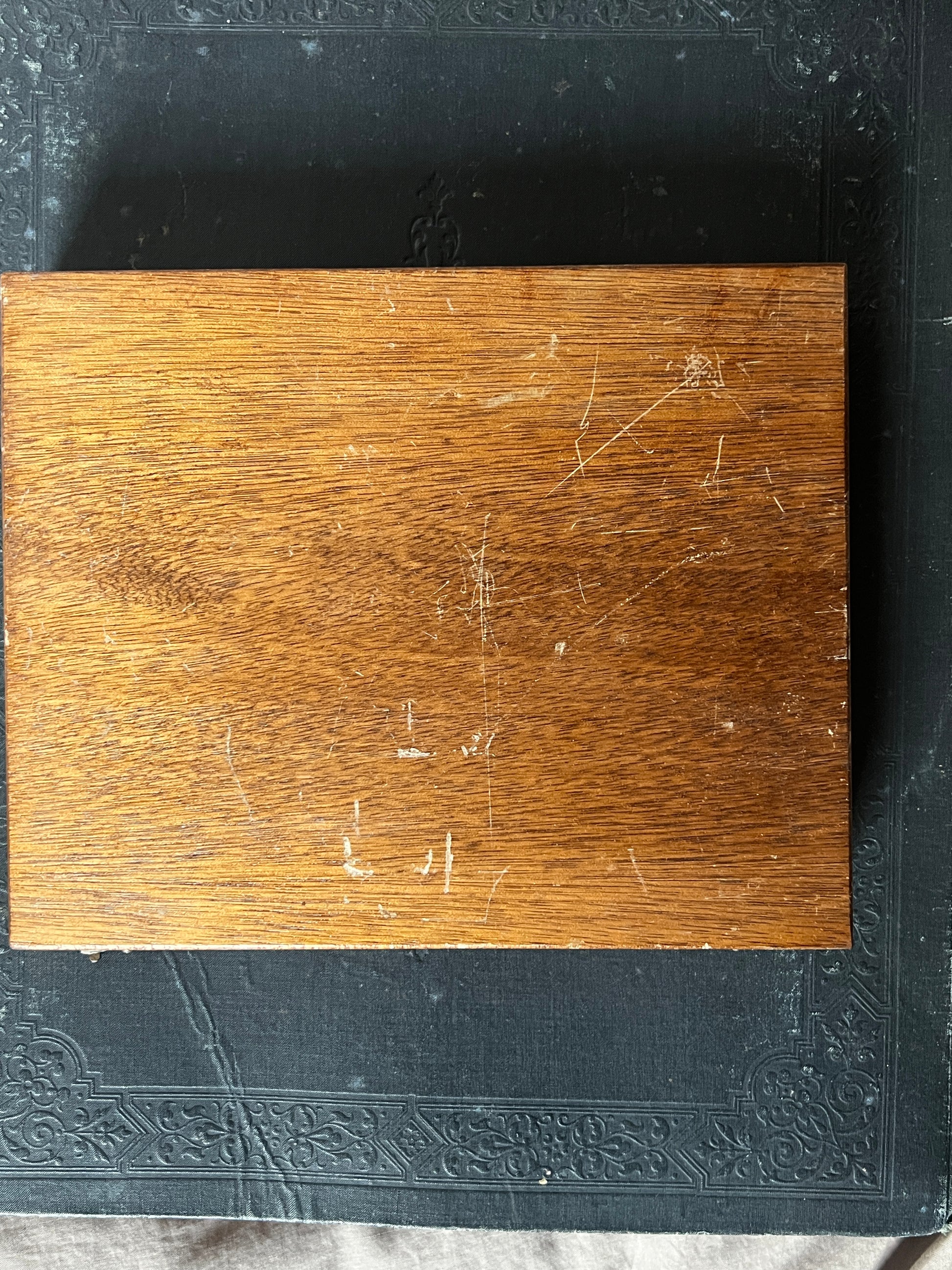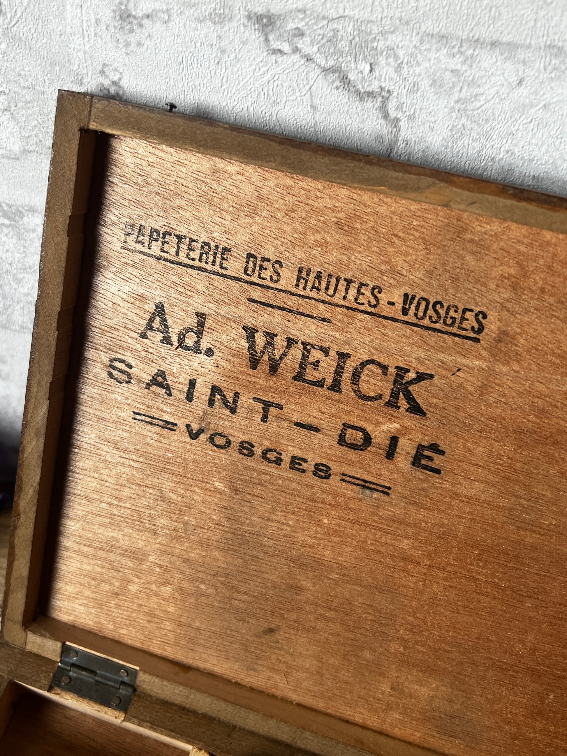 木箱には留め金が付いており、蓋の裏には「Papeterie des Hautes Vosges Ad. WEICK Saint-Dié Vosges」と印字があります