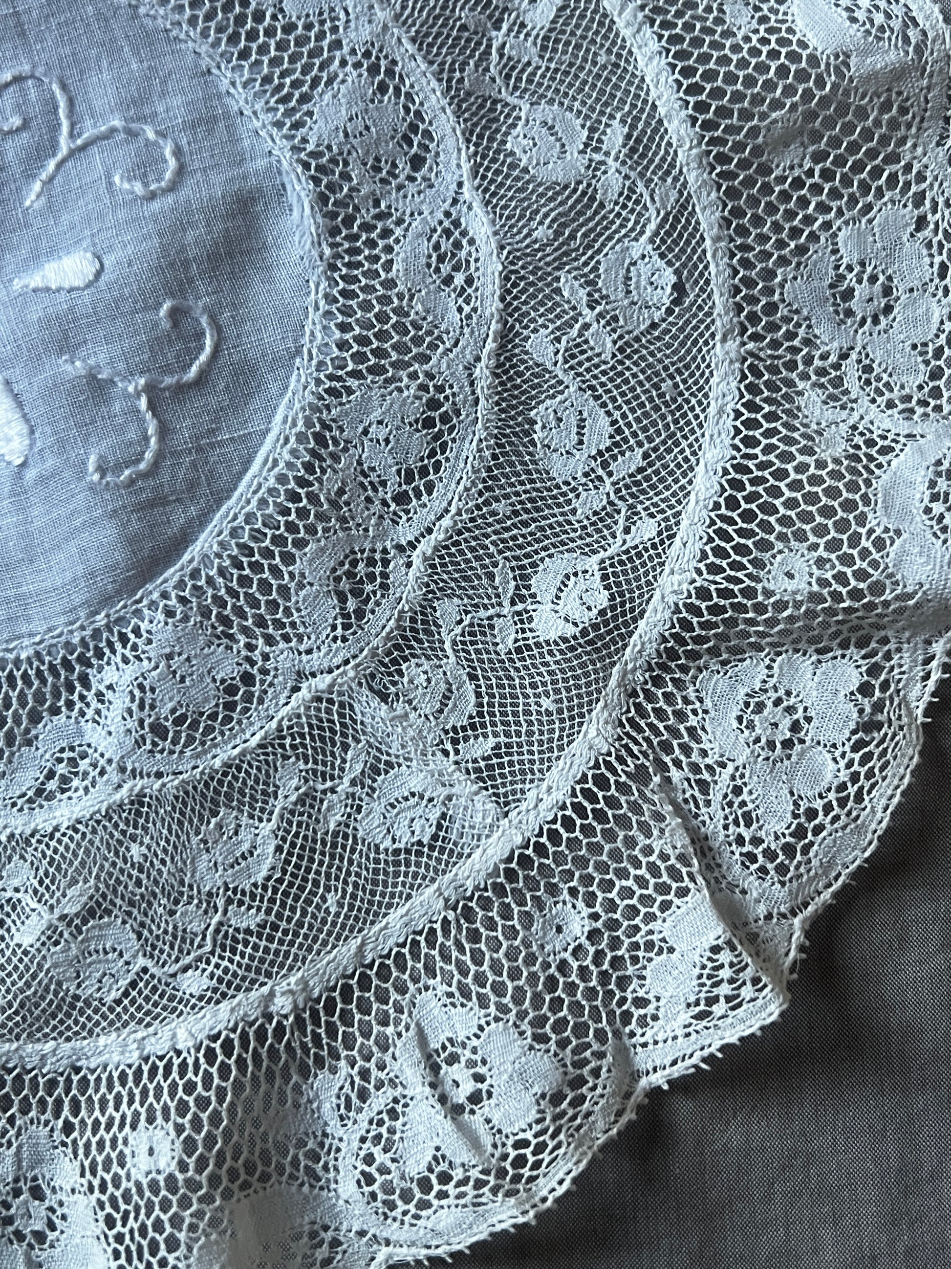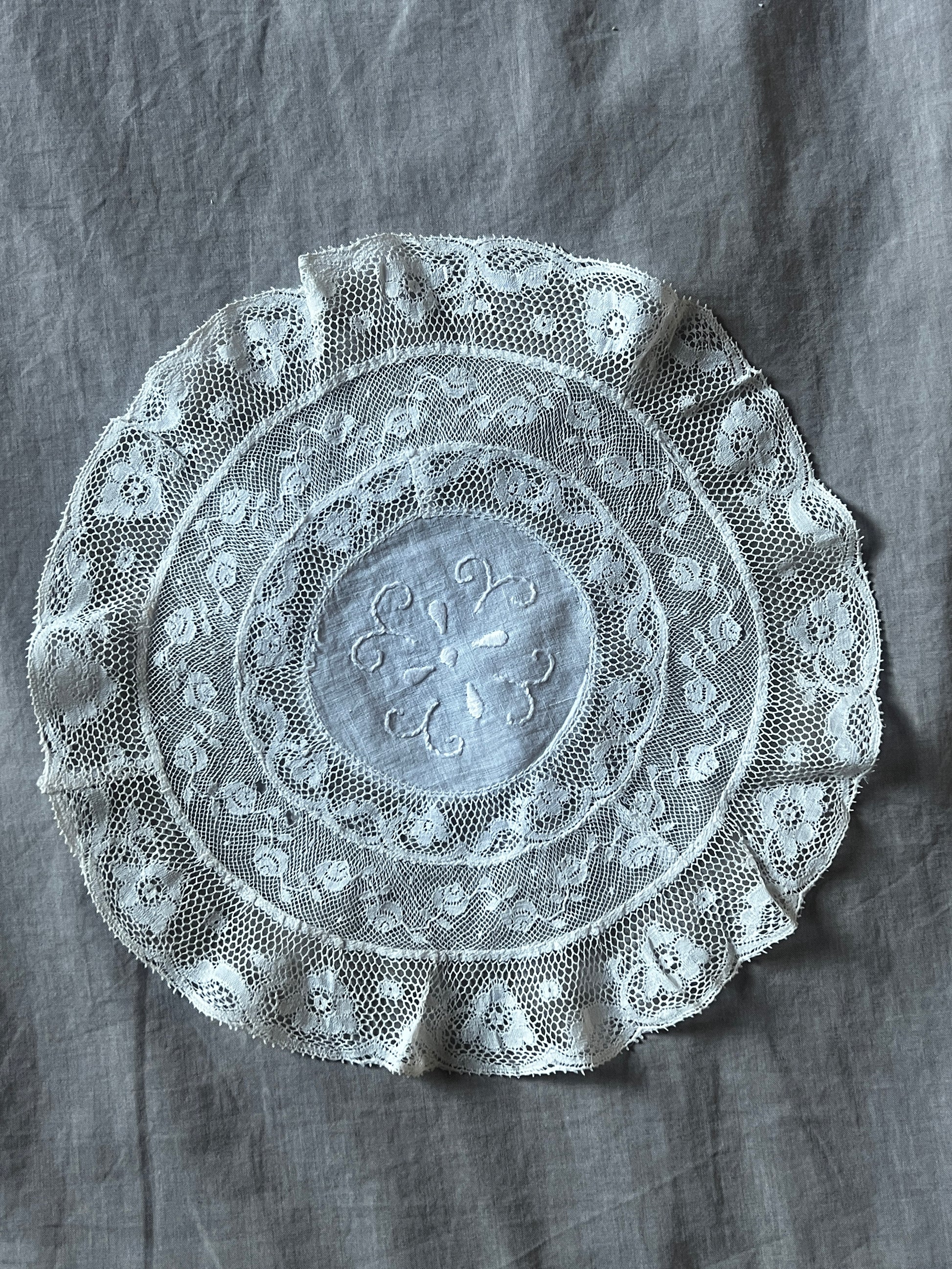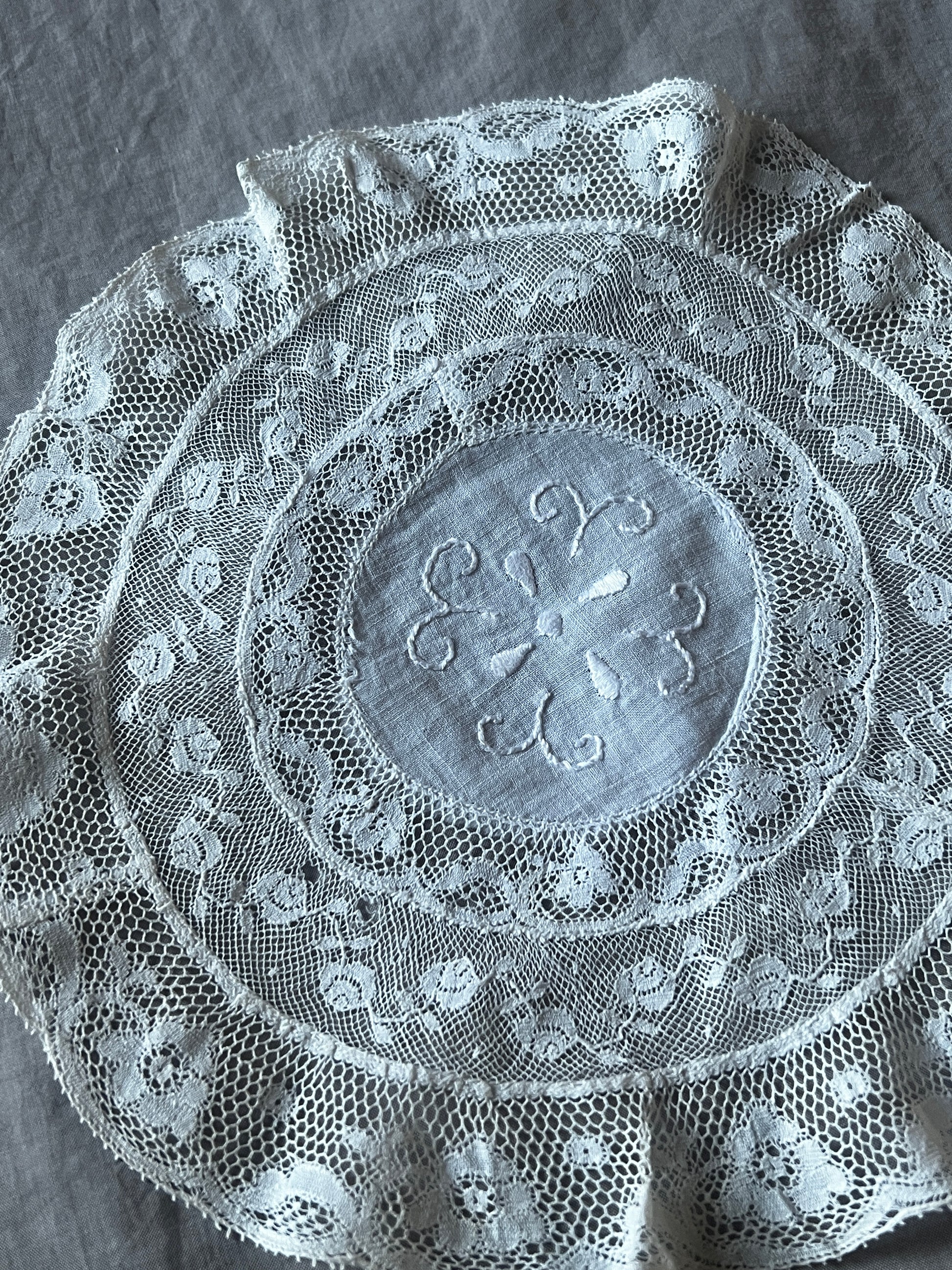 刺繍布とヴァランシエンヌレースを組み合わせて仕立てられたドイリーです