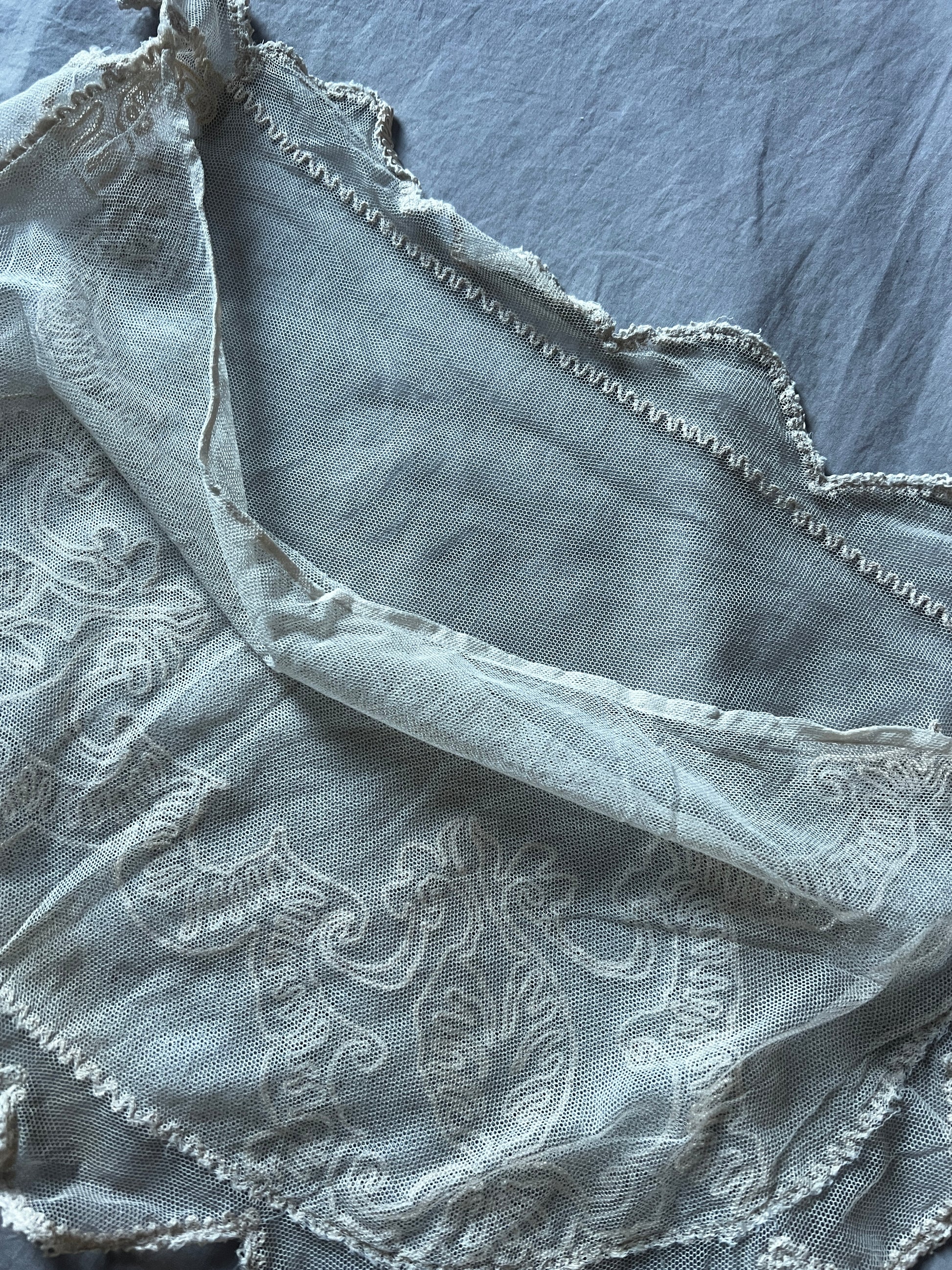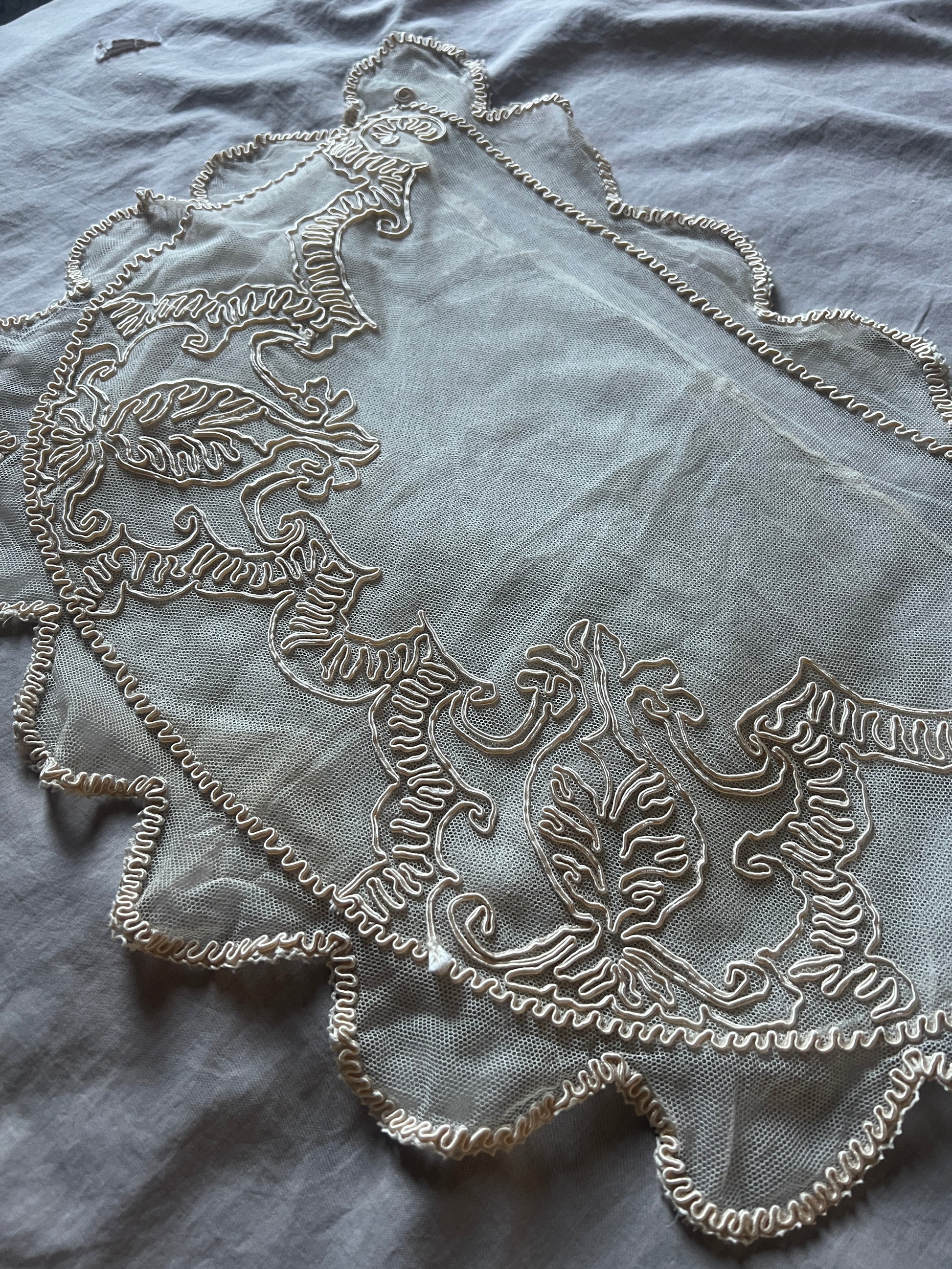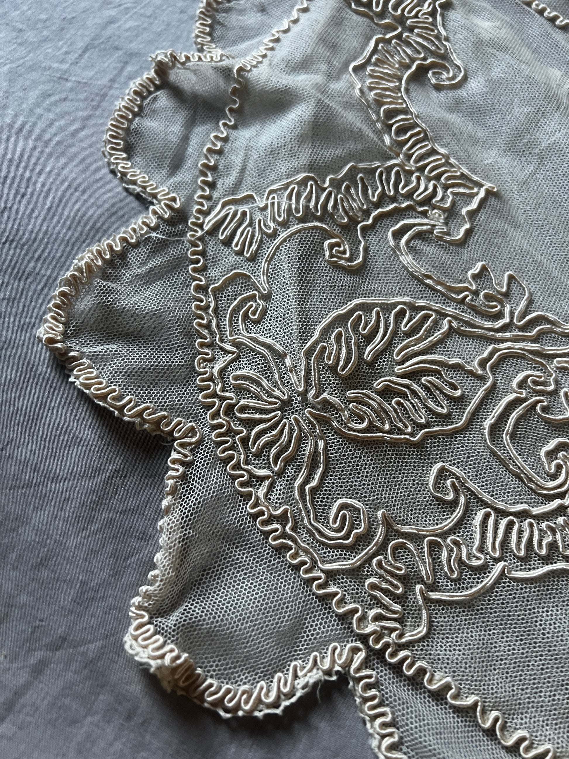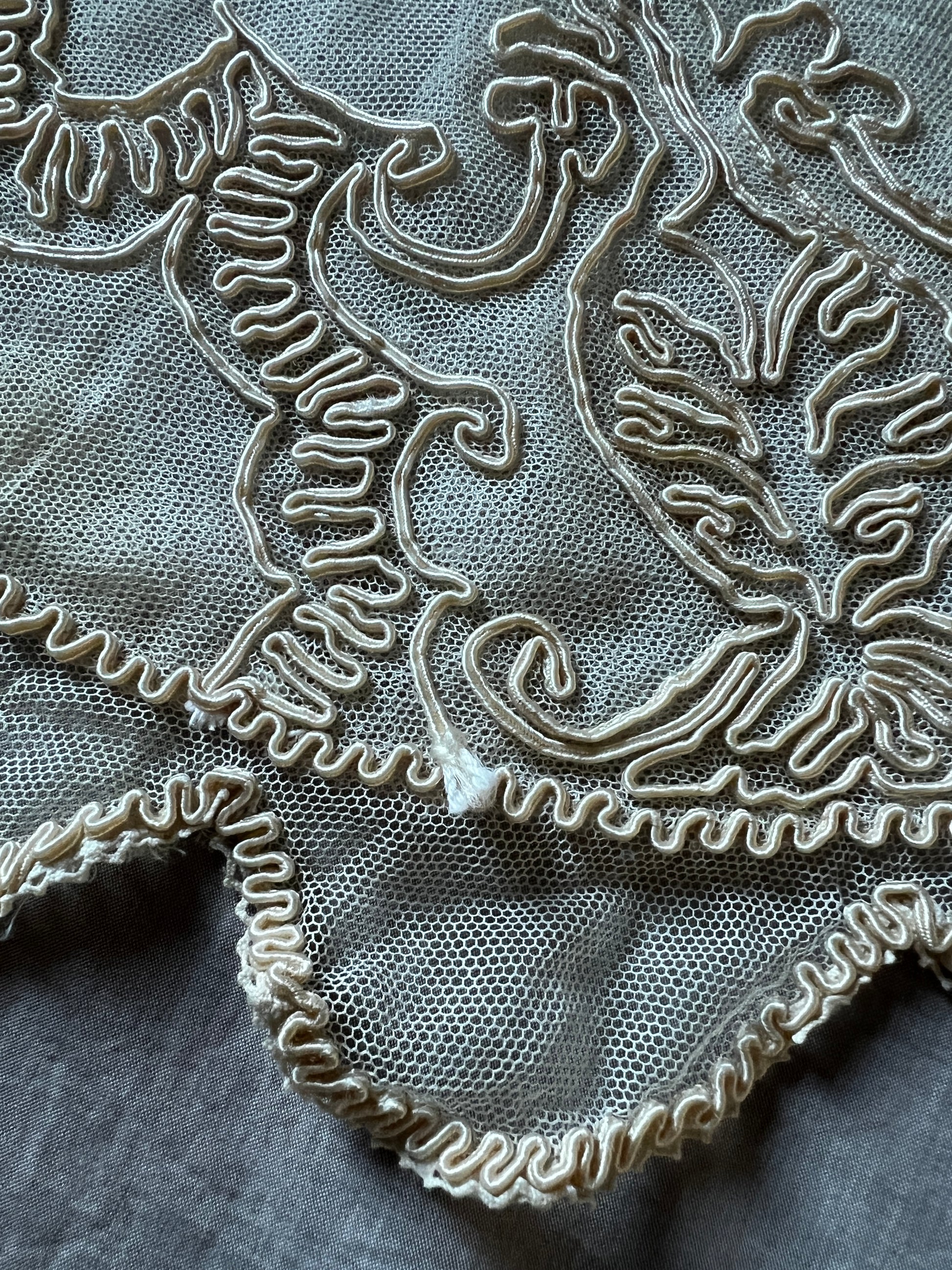 ほんのりミルクティー色のチュールレースにコード刺繍が重ねられた、優美な半月形のクッションカバーです