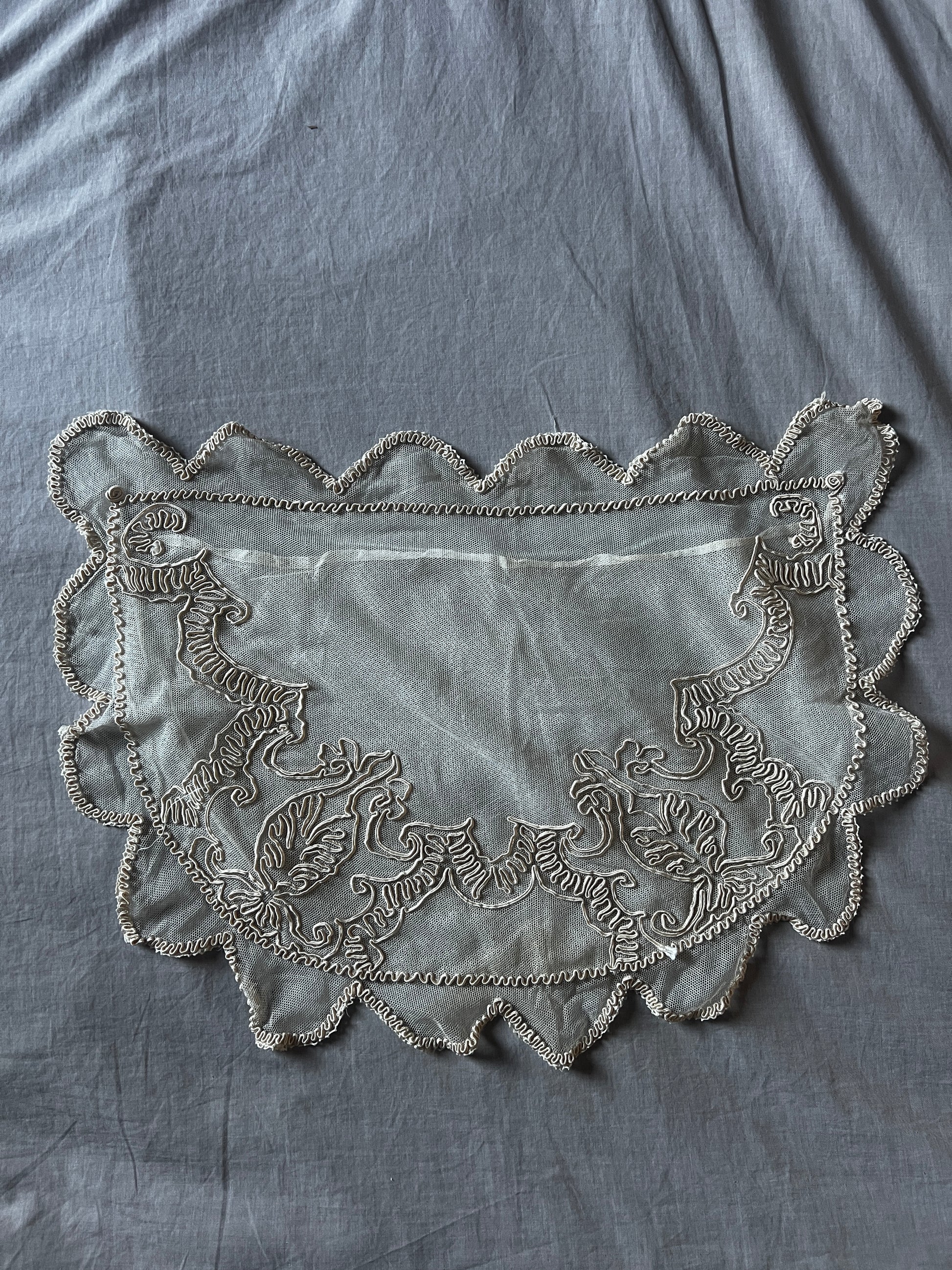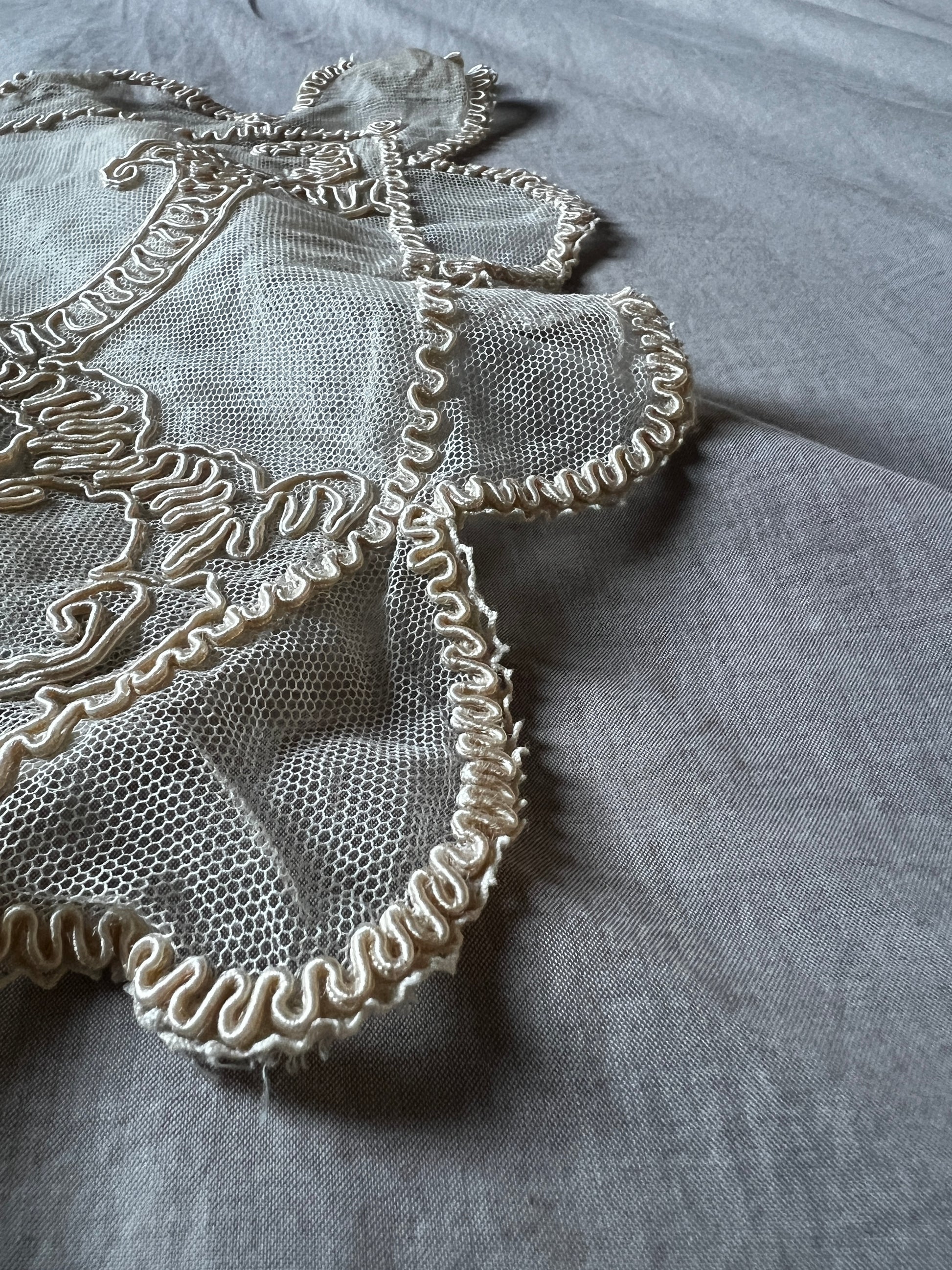繊細なチュールの透け感と、立体的なコード刺繍の表情が柔らかく調和し、置くだけで上品なアクセントに