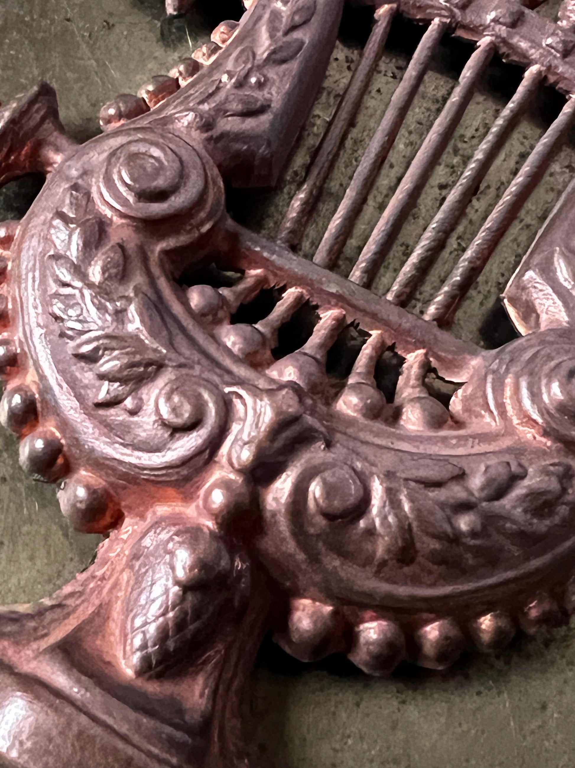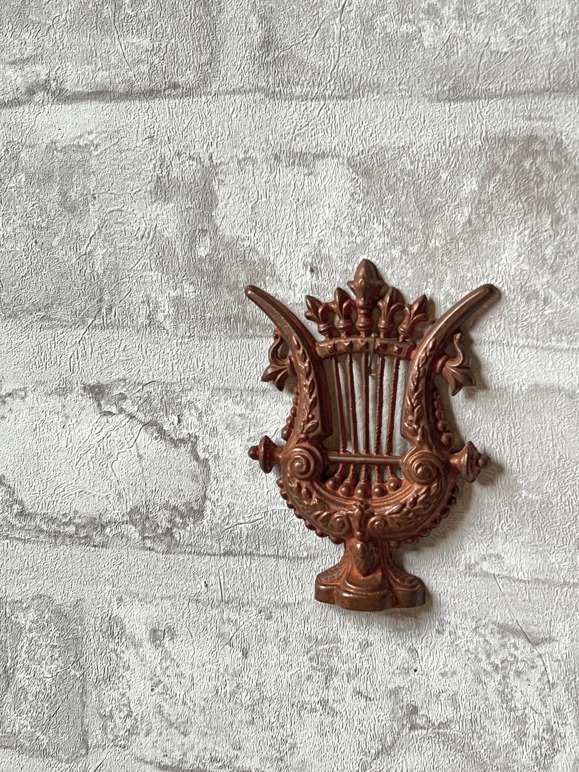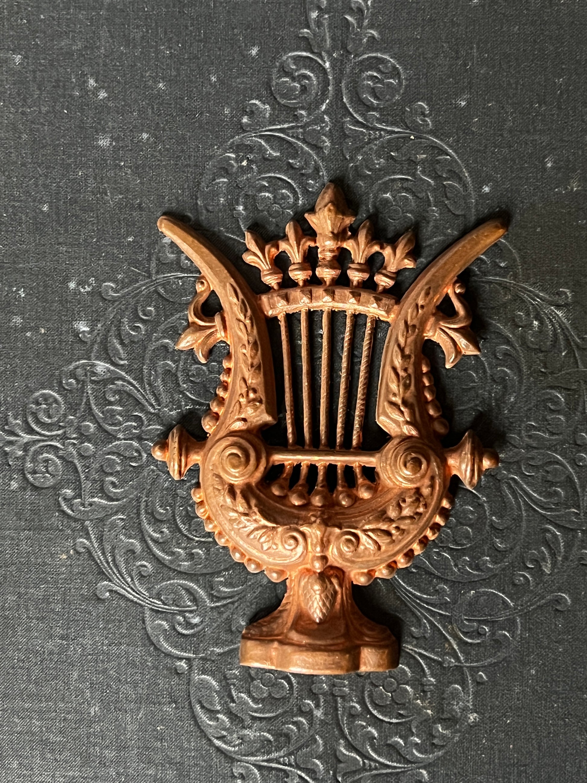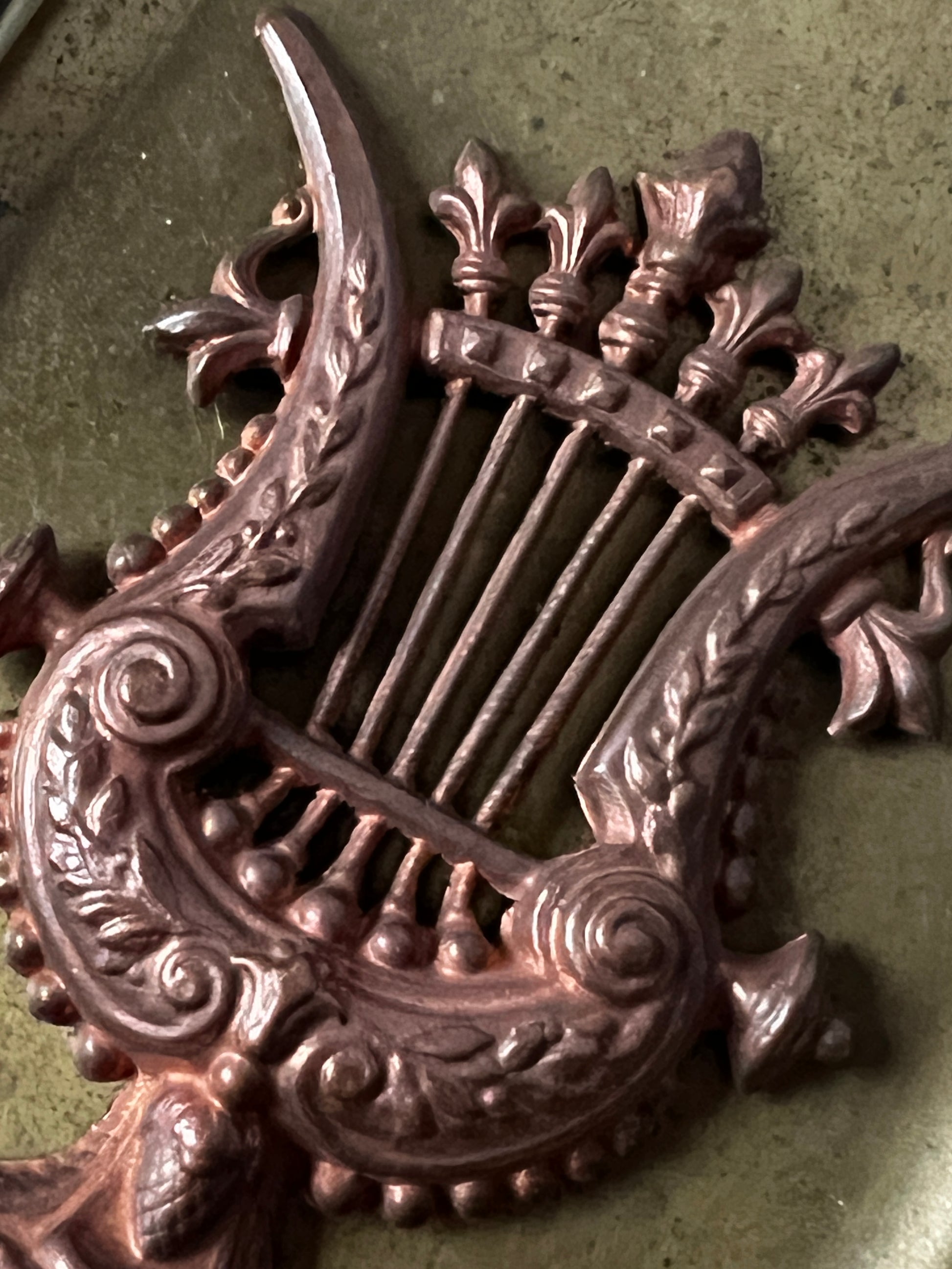 打ち出し加工で繊細に竪琴を描いた、ブロンズ製の美しいレリーフです