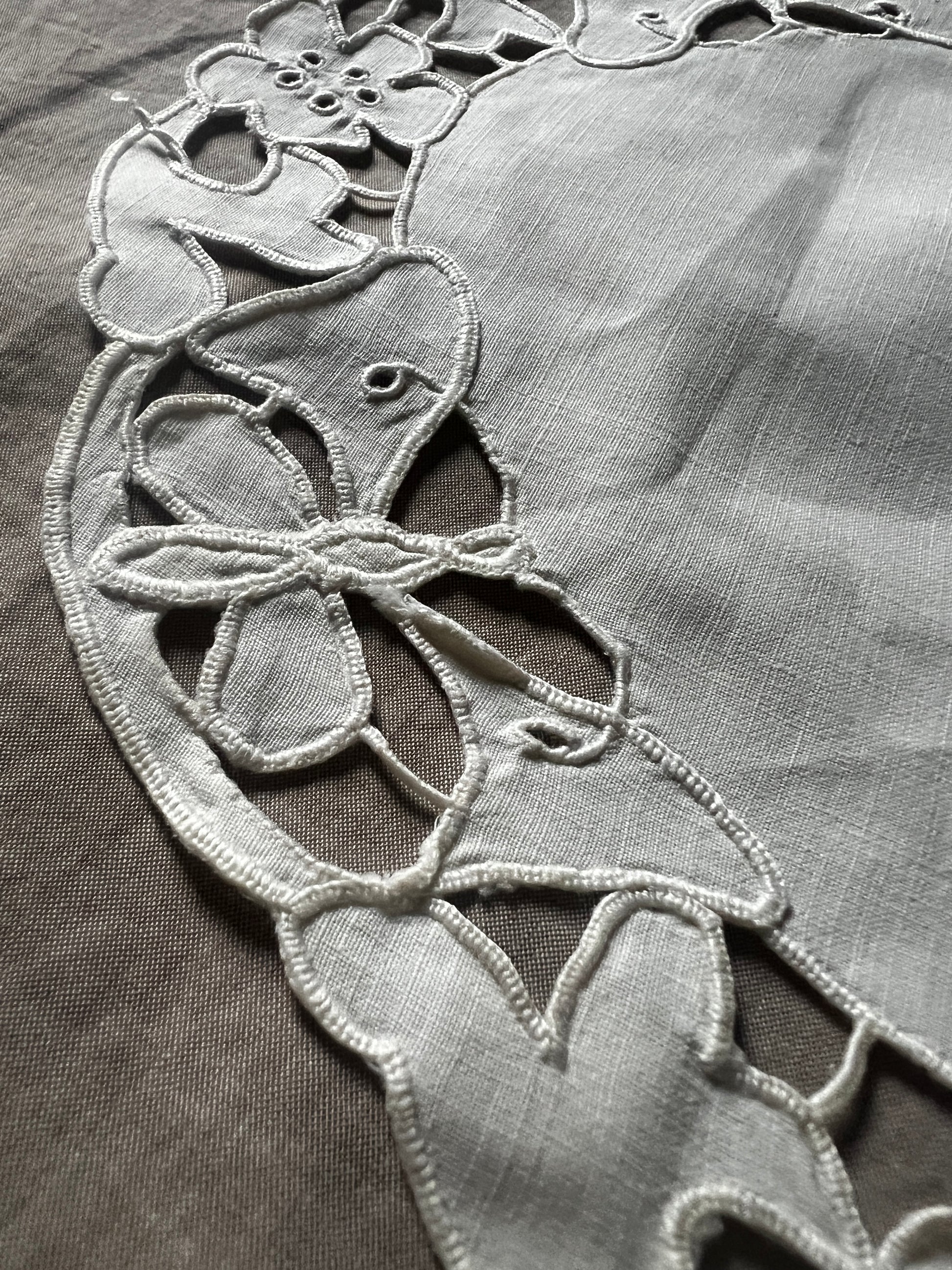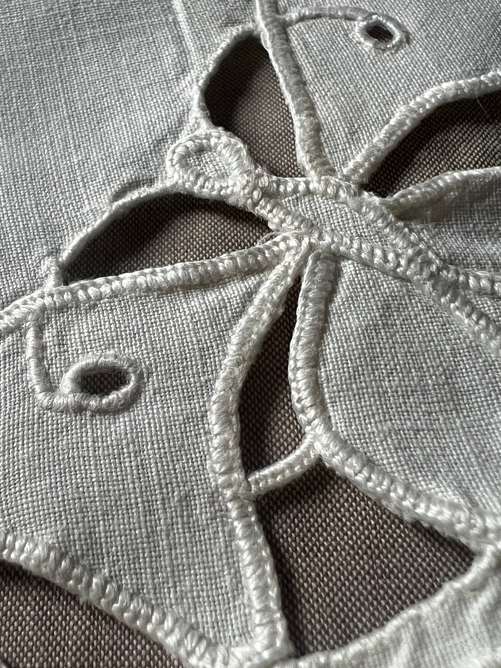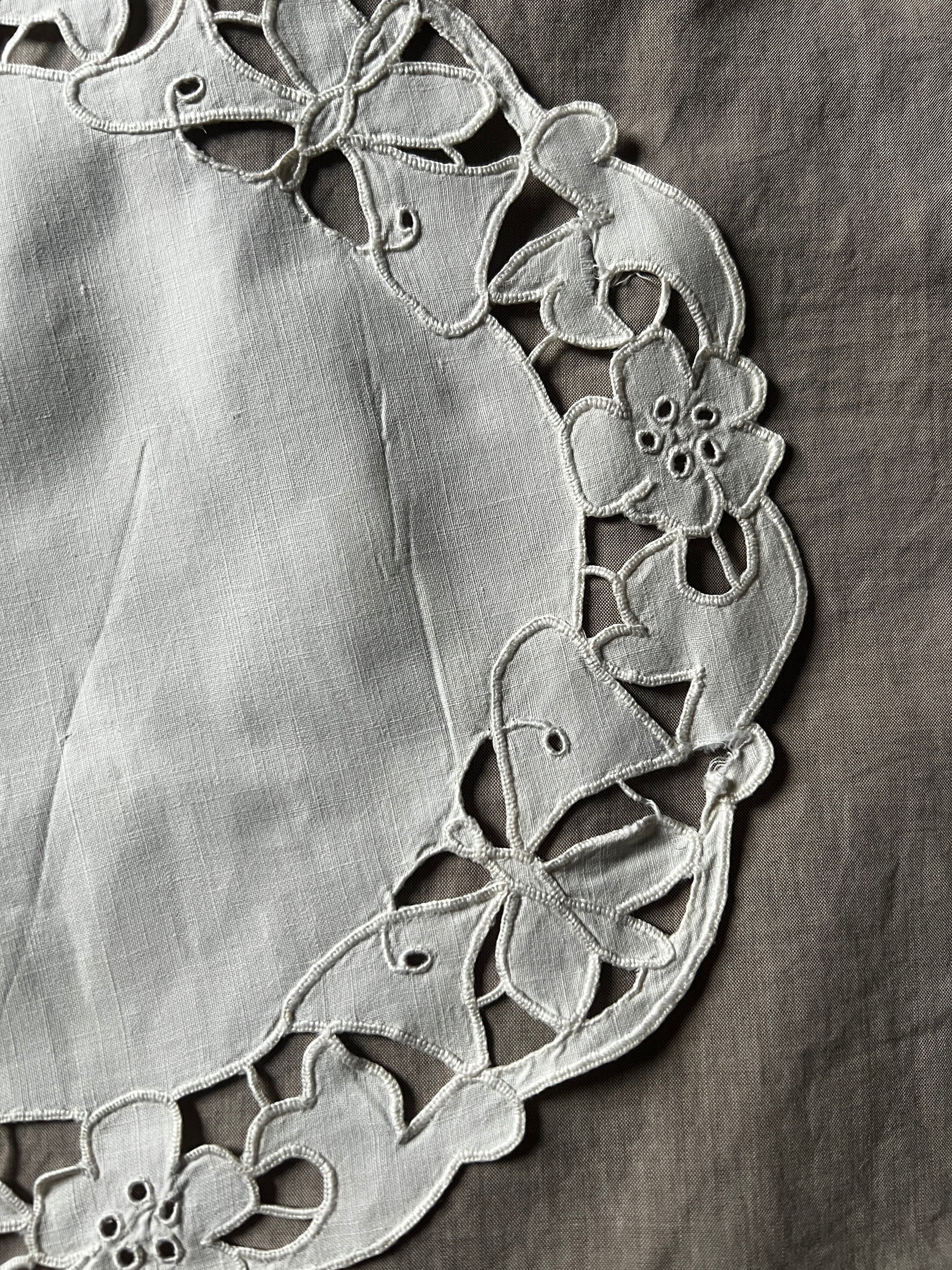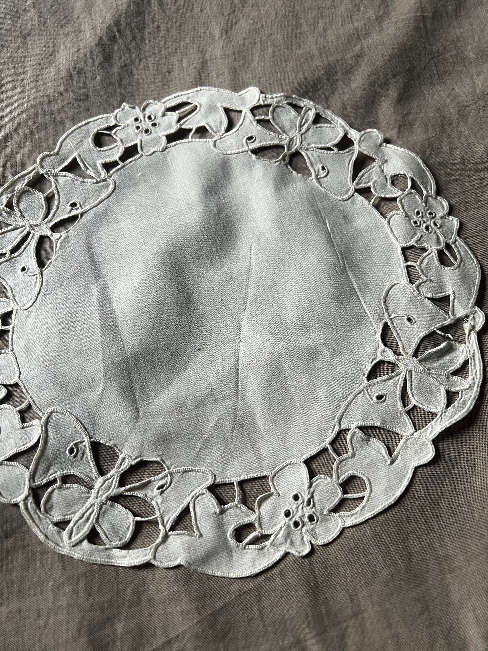 端正なステッチで花や蝶のモチーフを丁寧に描いたドイリーです