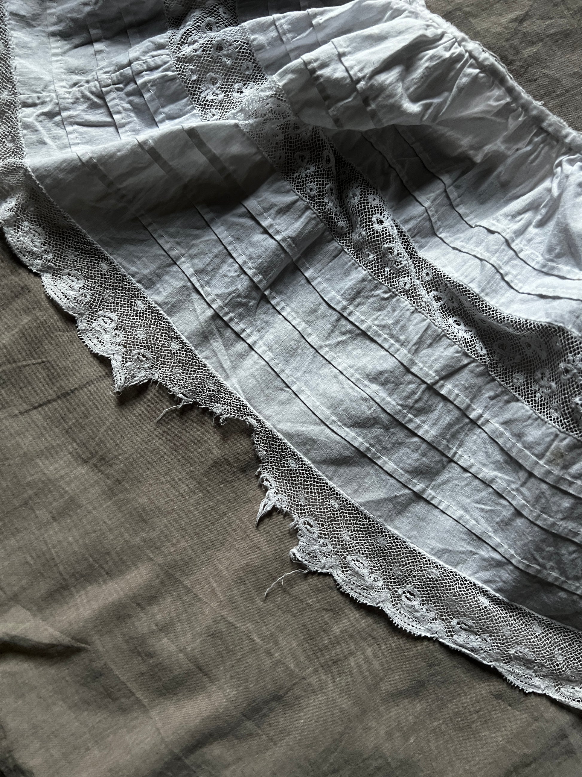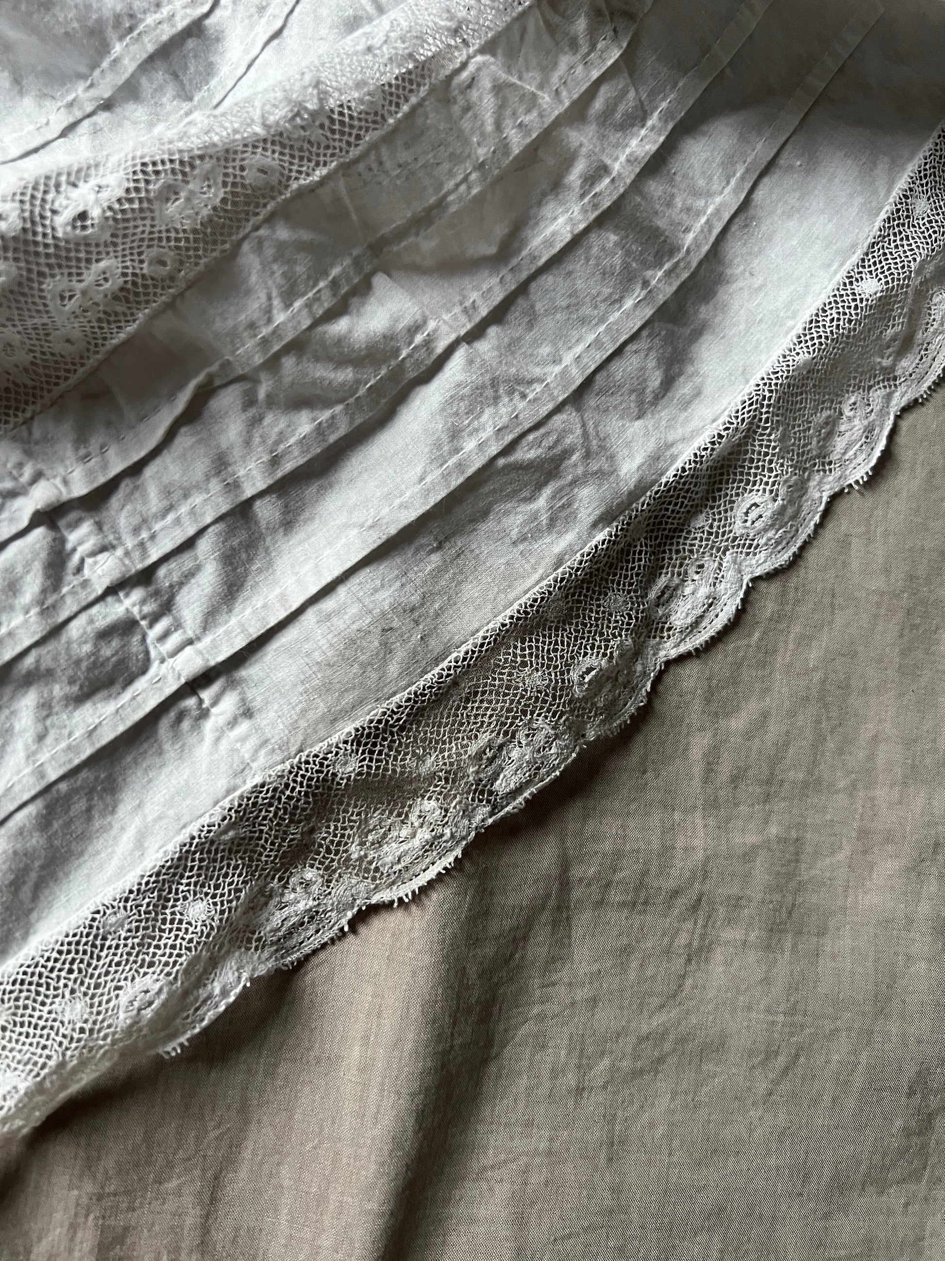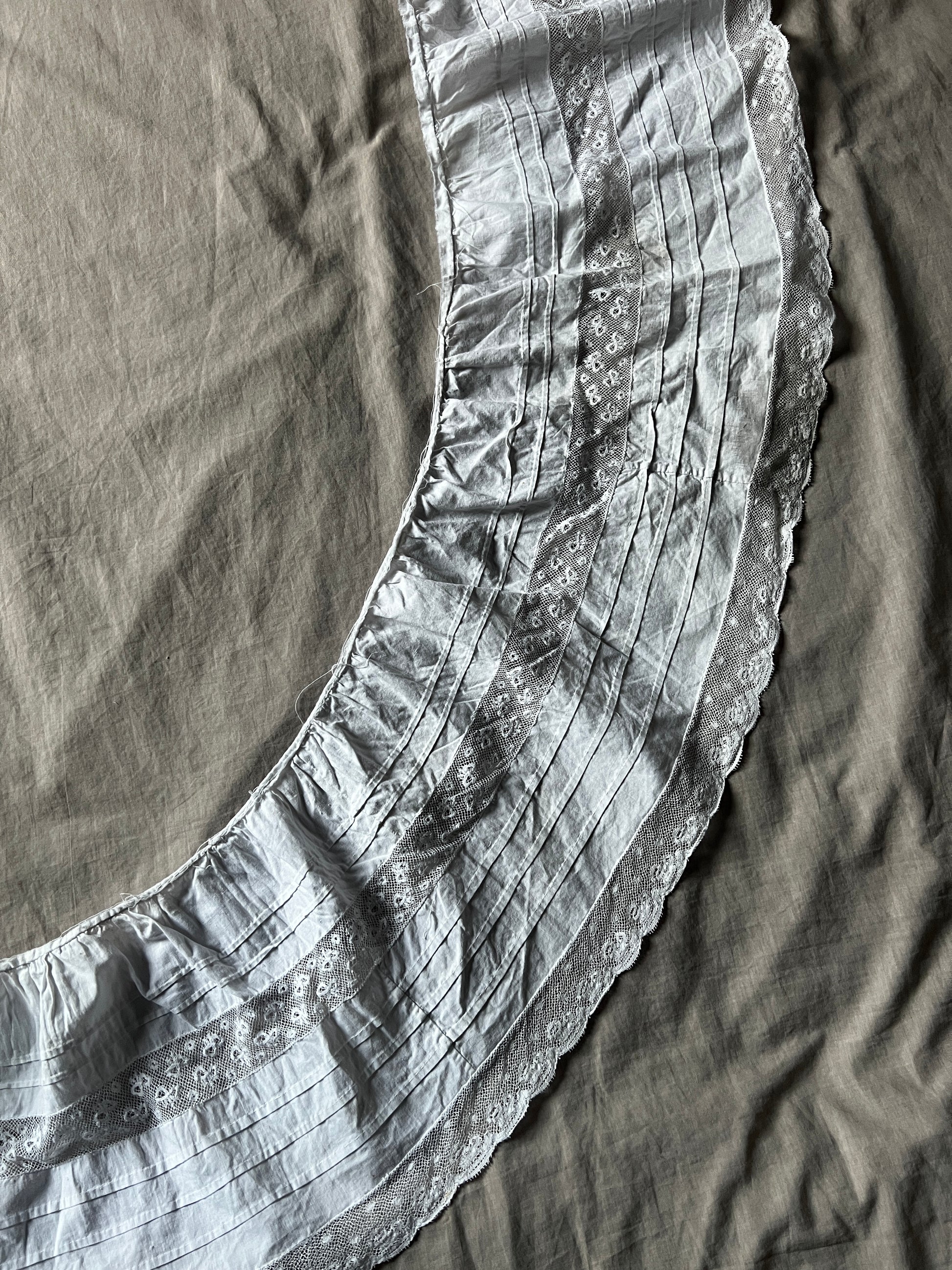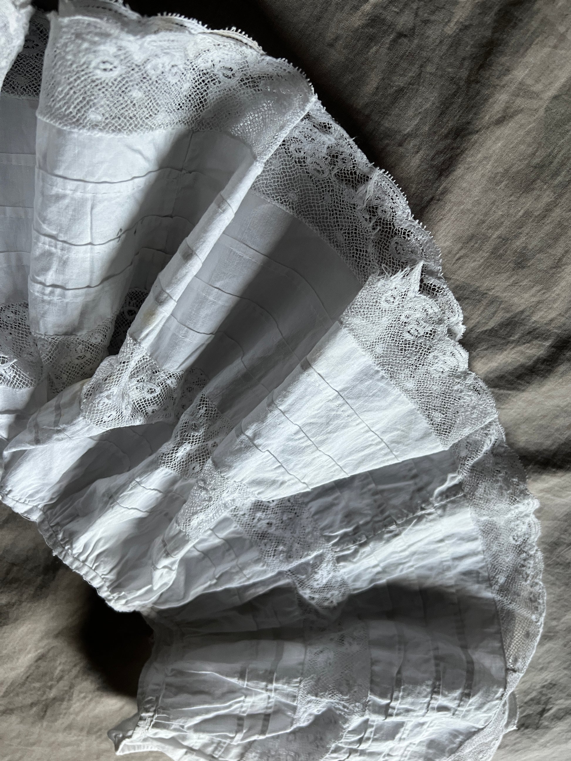 ピンタックとレースのフリルで丁寧にデザインされたドレスの裾部分です