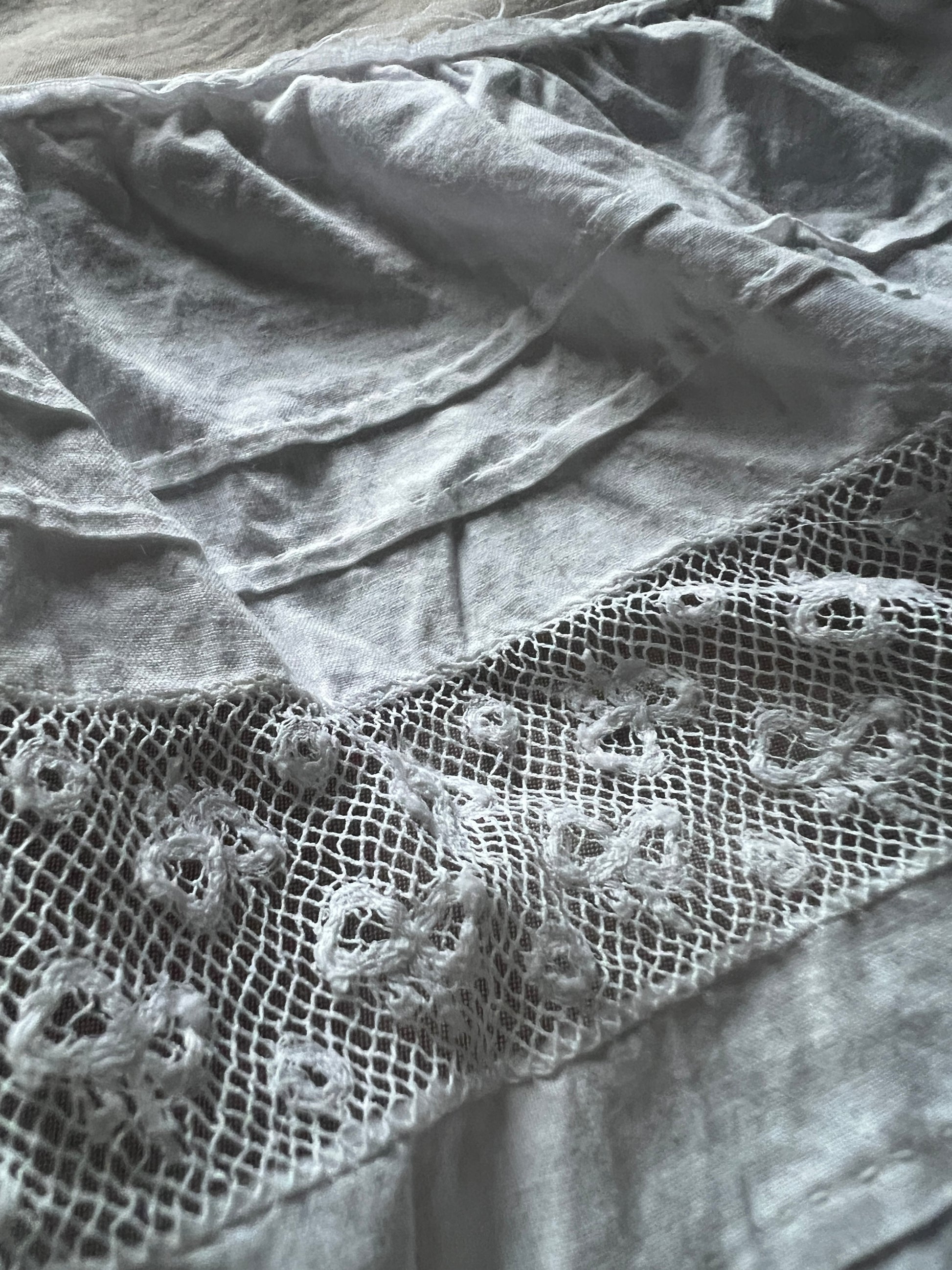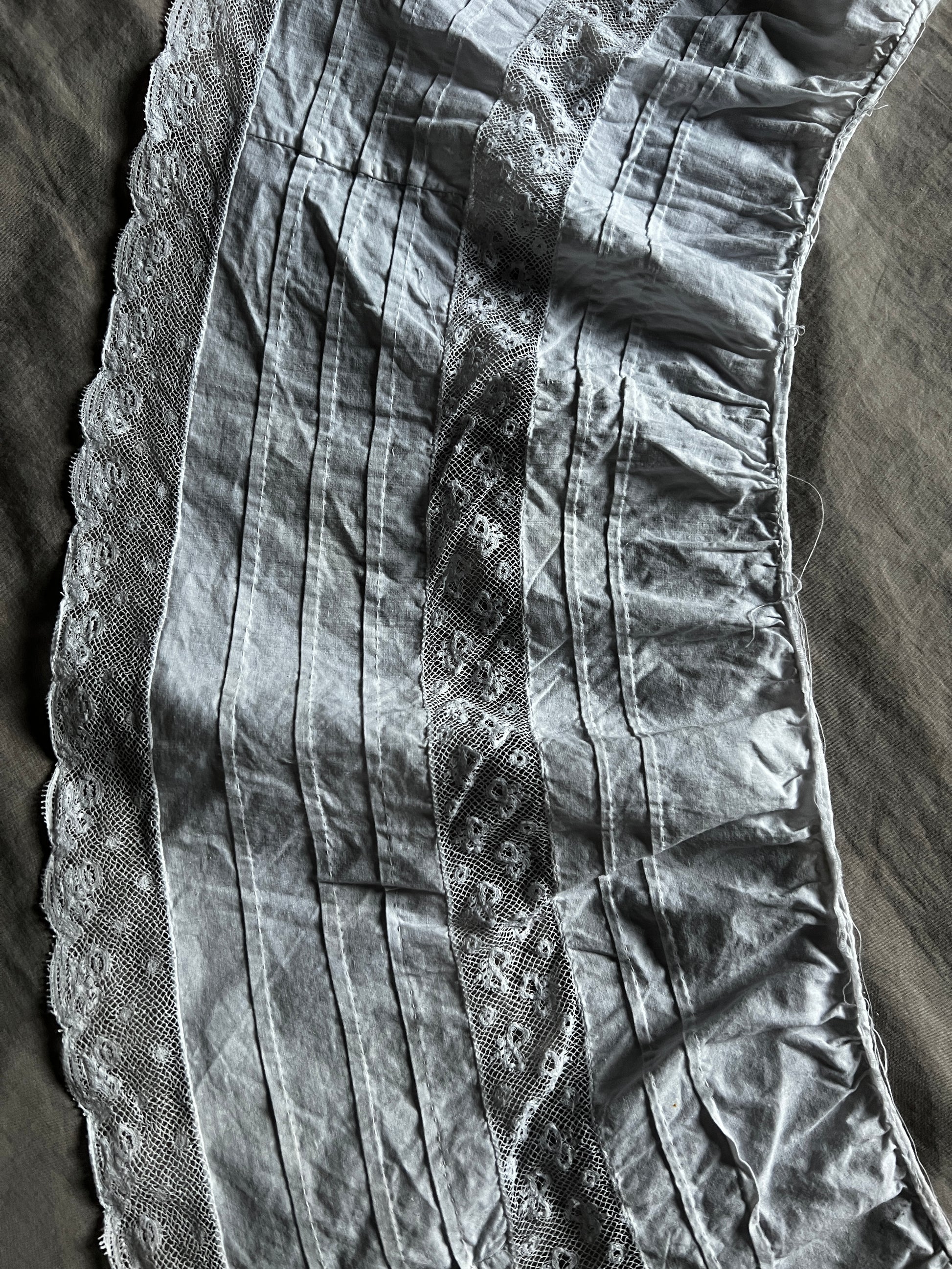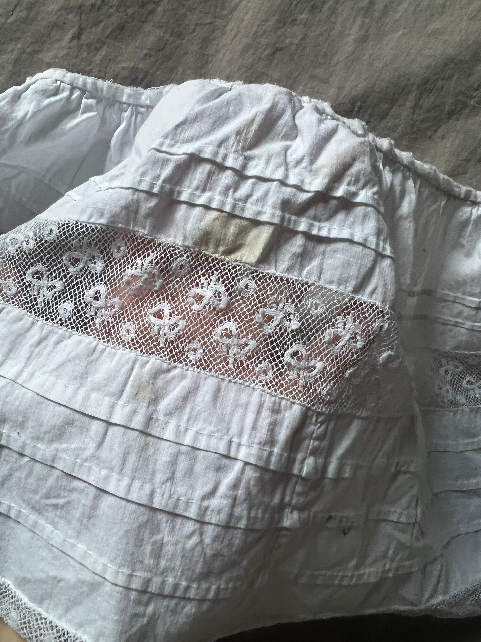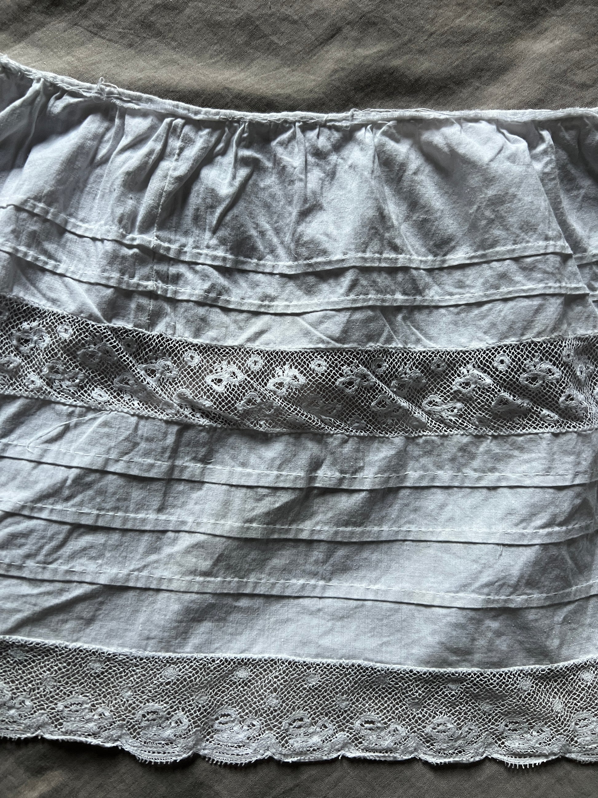 ピンタックとレースのフリルで丁寧にデザインされたドレスの裾部分です