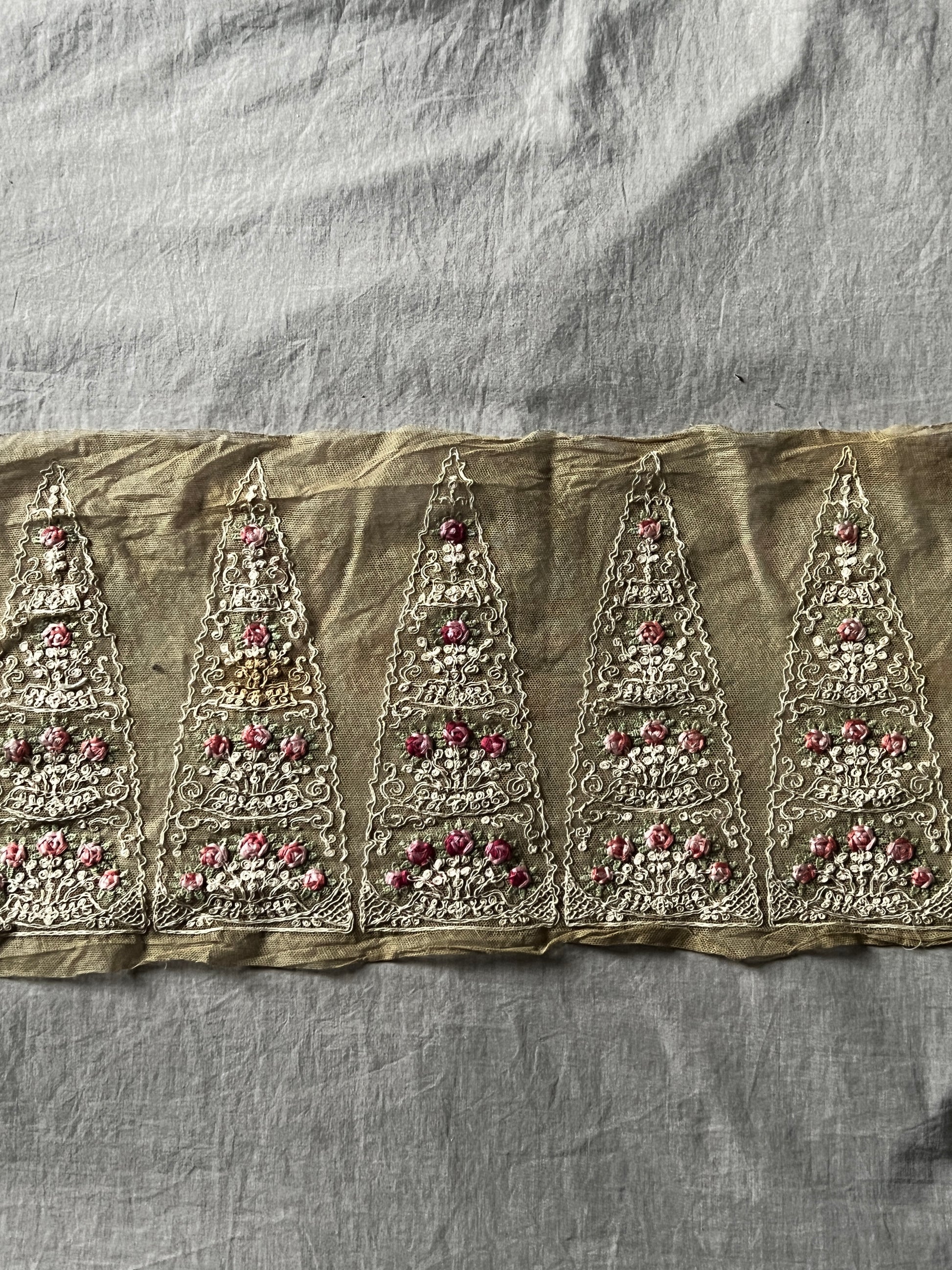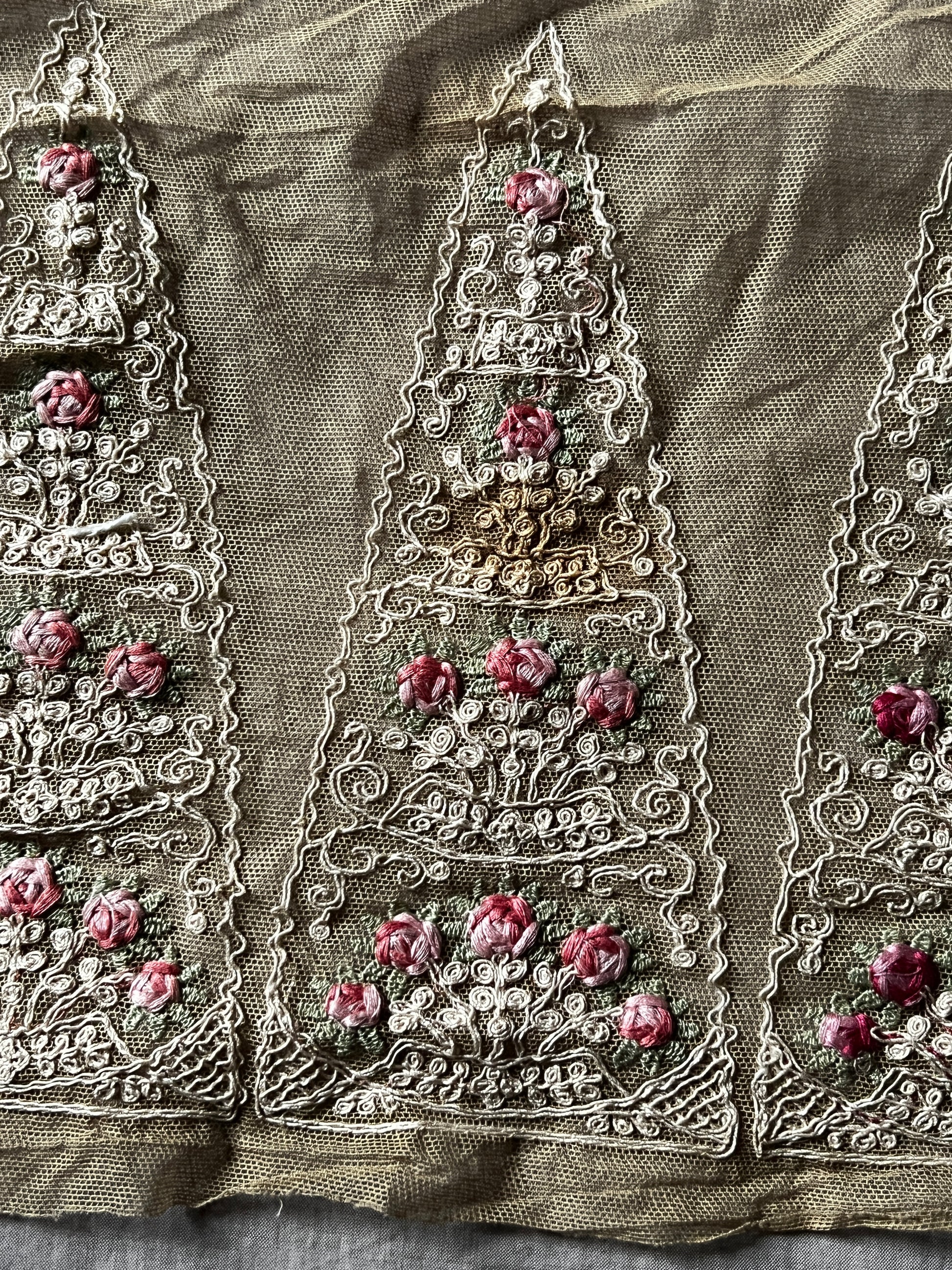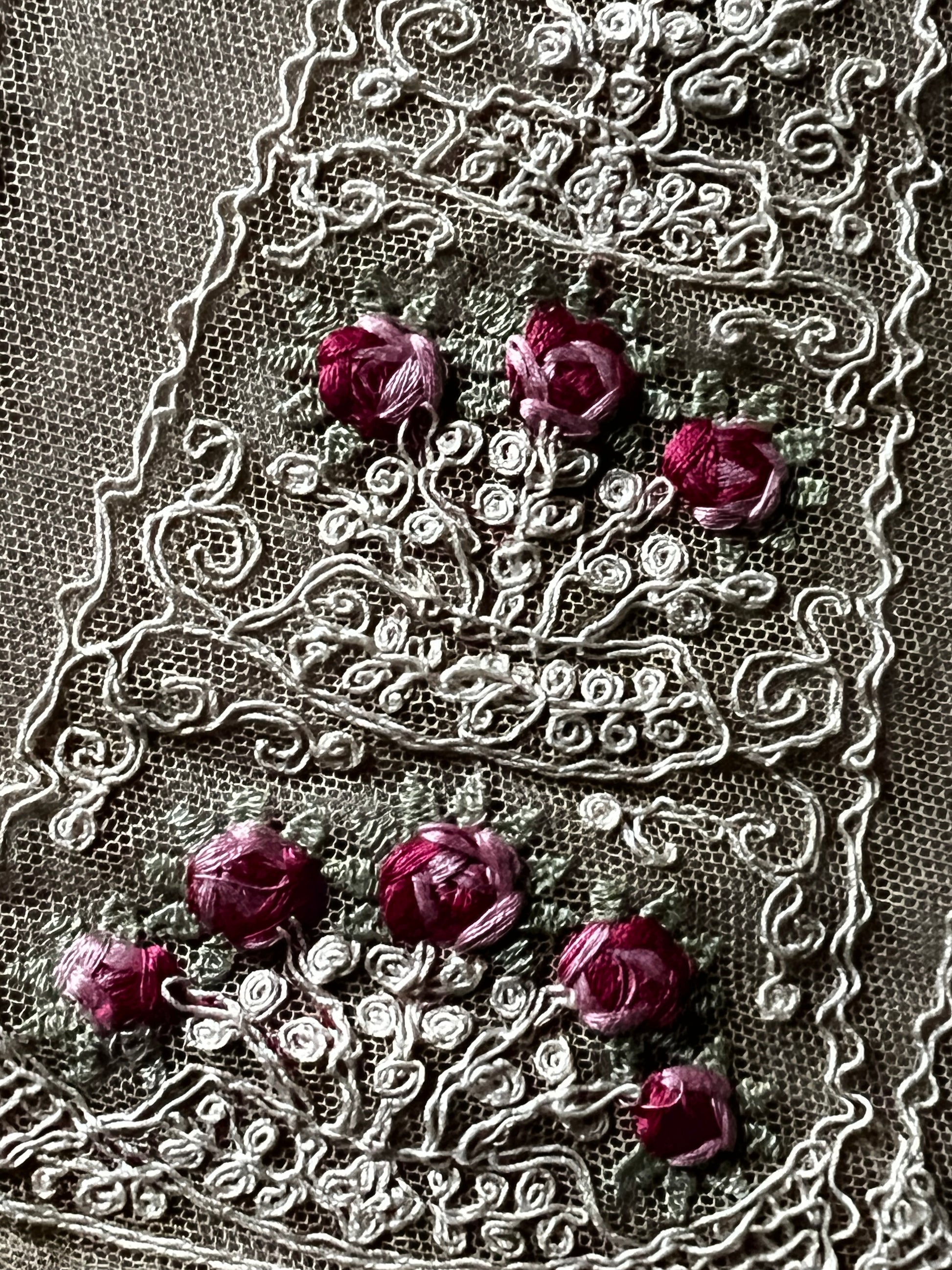 カフェオレ色のチュール地に暖かみのある色味の糸で薔薇の刺繍が施されたレースです