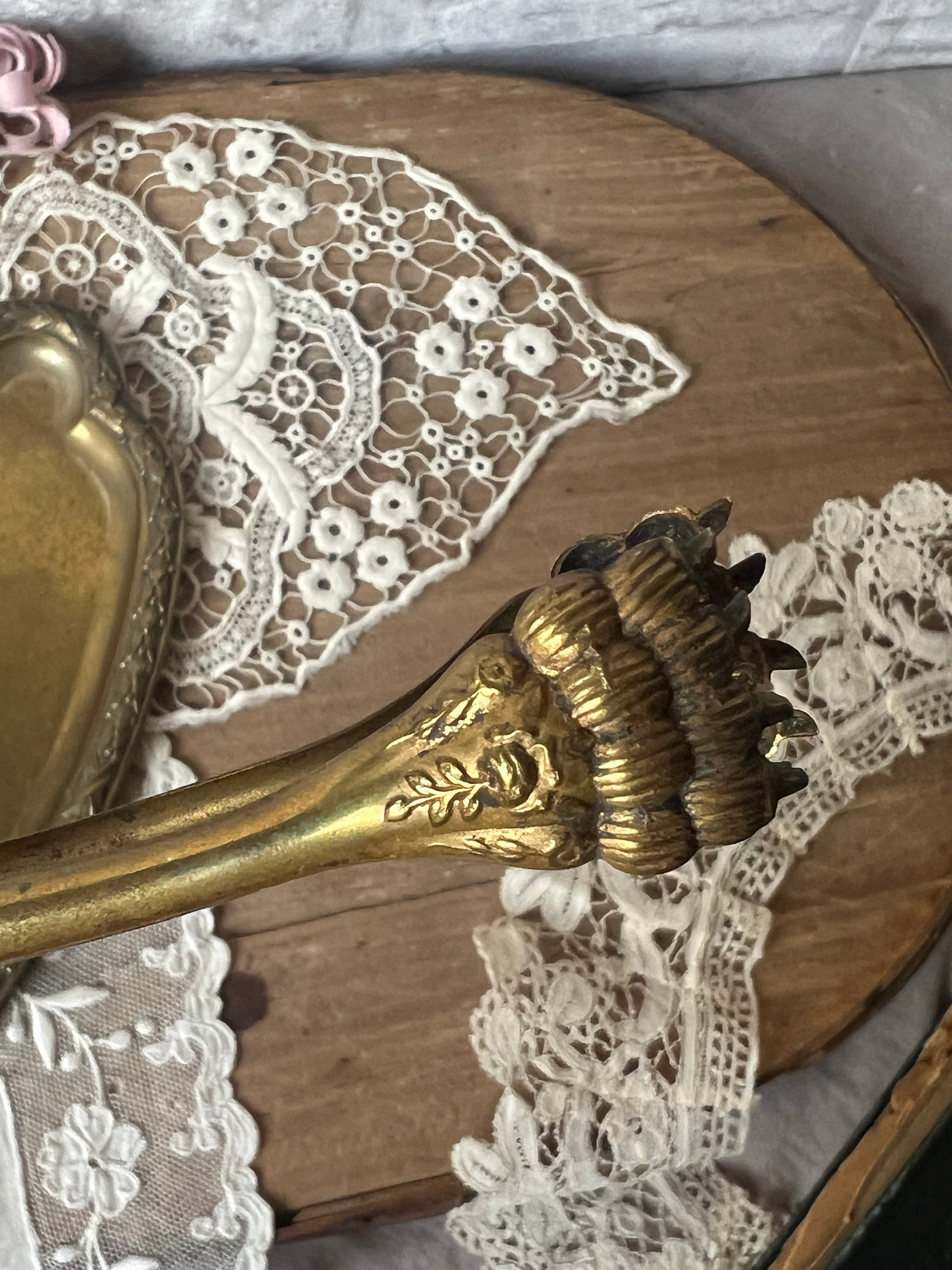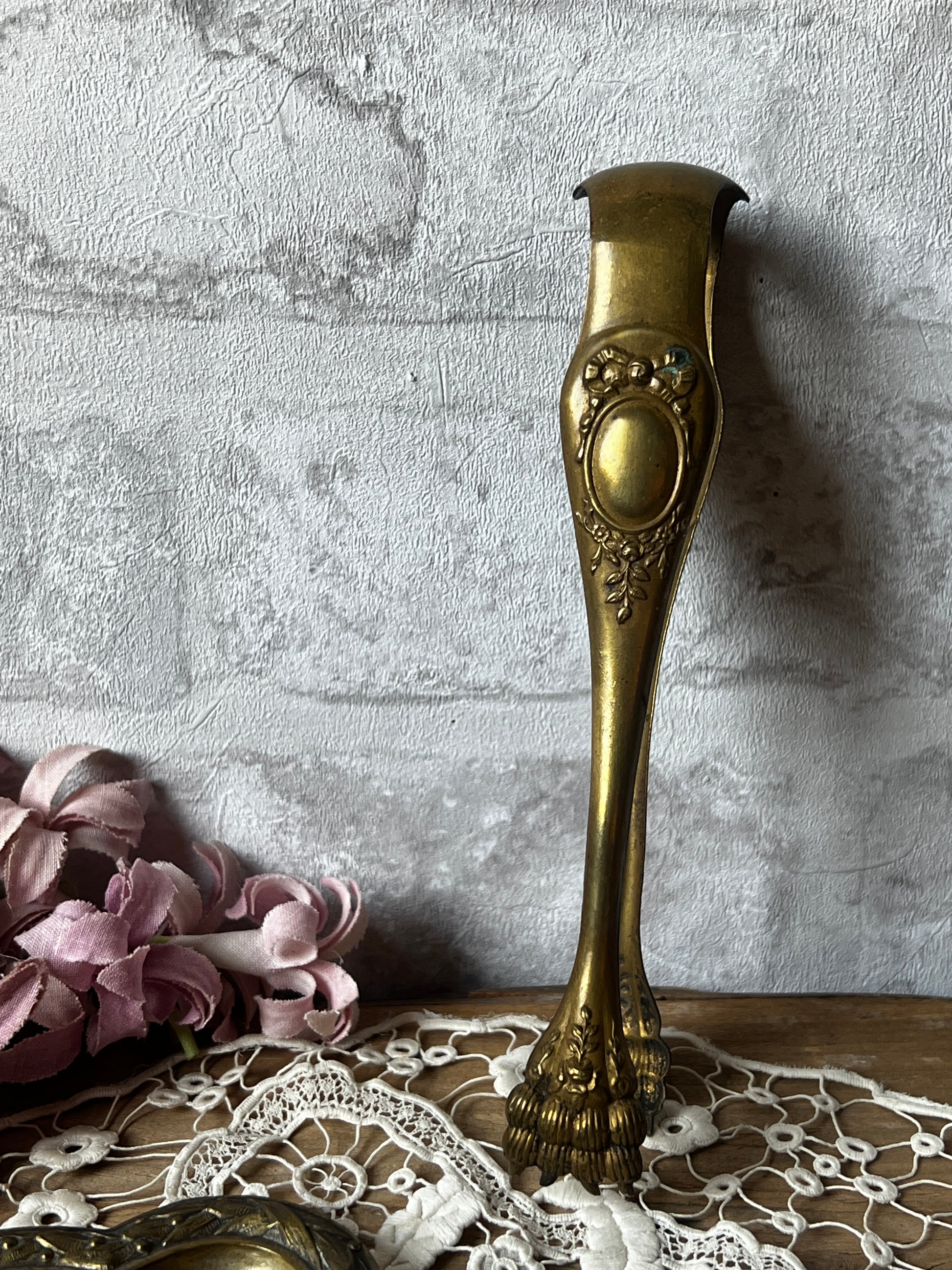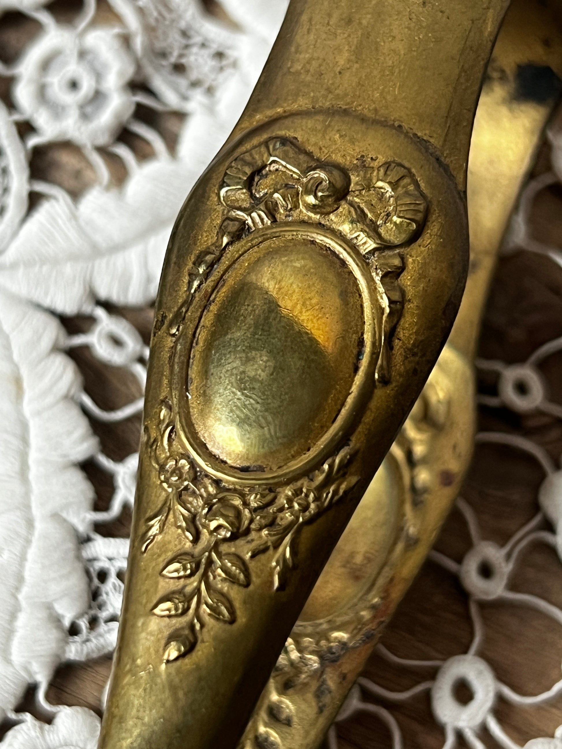 真鍮の色味が美しく、中央部分は装飾的なオーバル型のレリーフとリボンや植物のモチーフが施されています