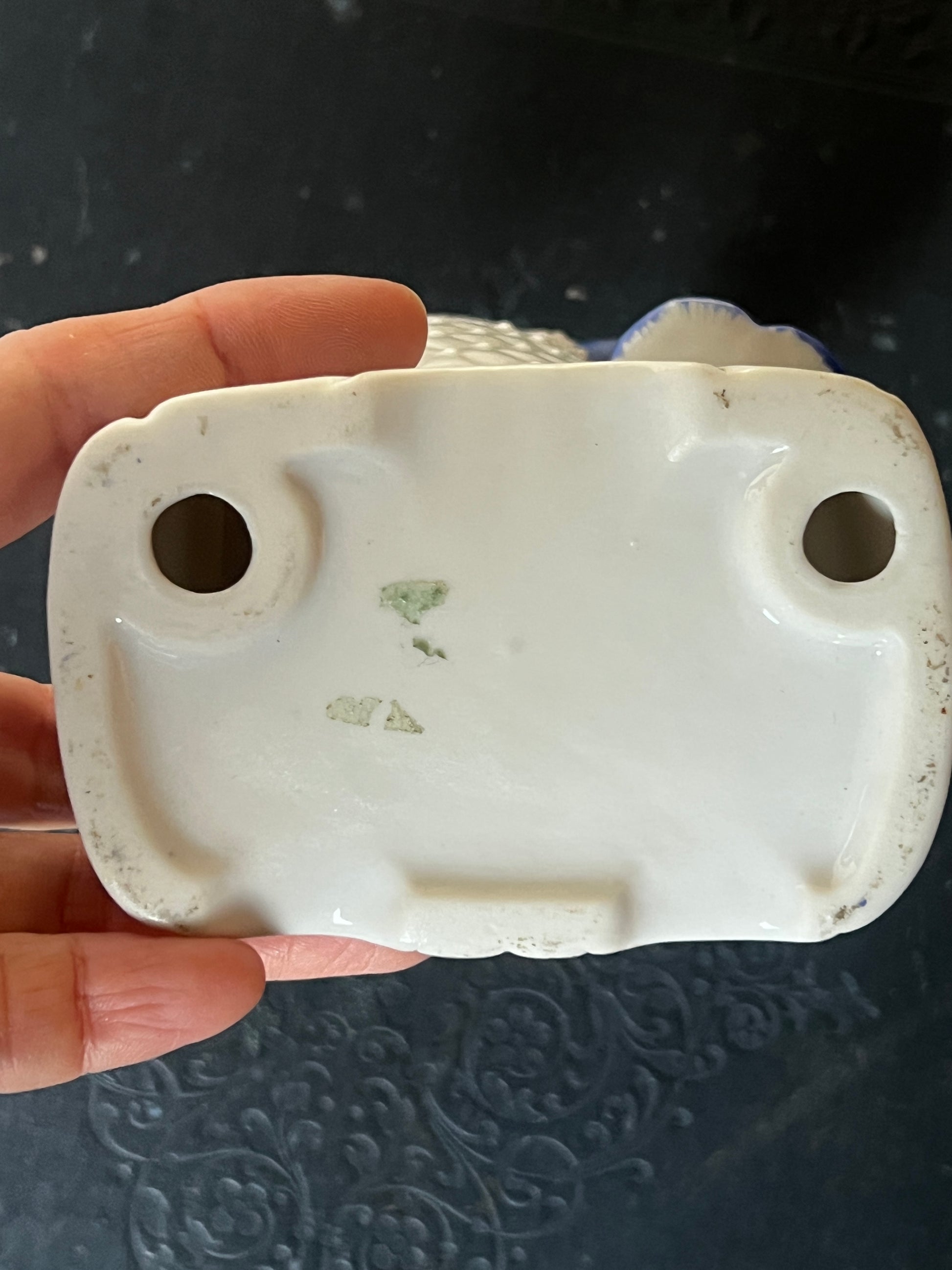 これは、本物のレースを磁器に貼り付け焼き付けた技法によるもので、立体感のあるフリルが表現されています