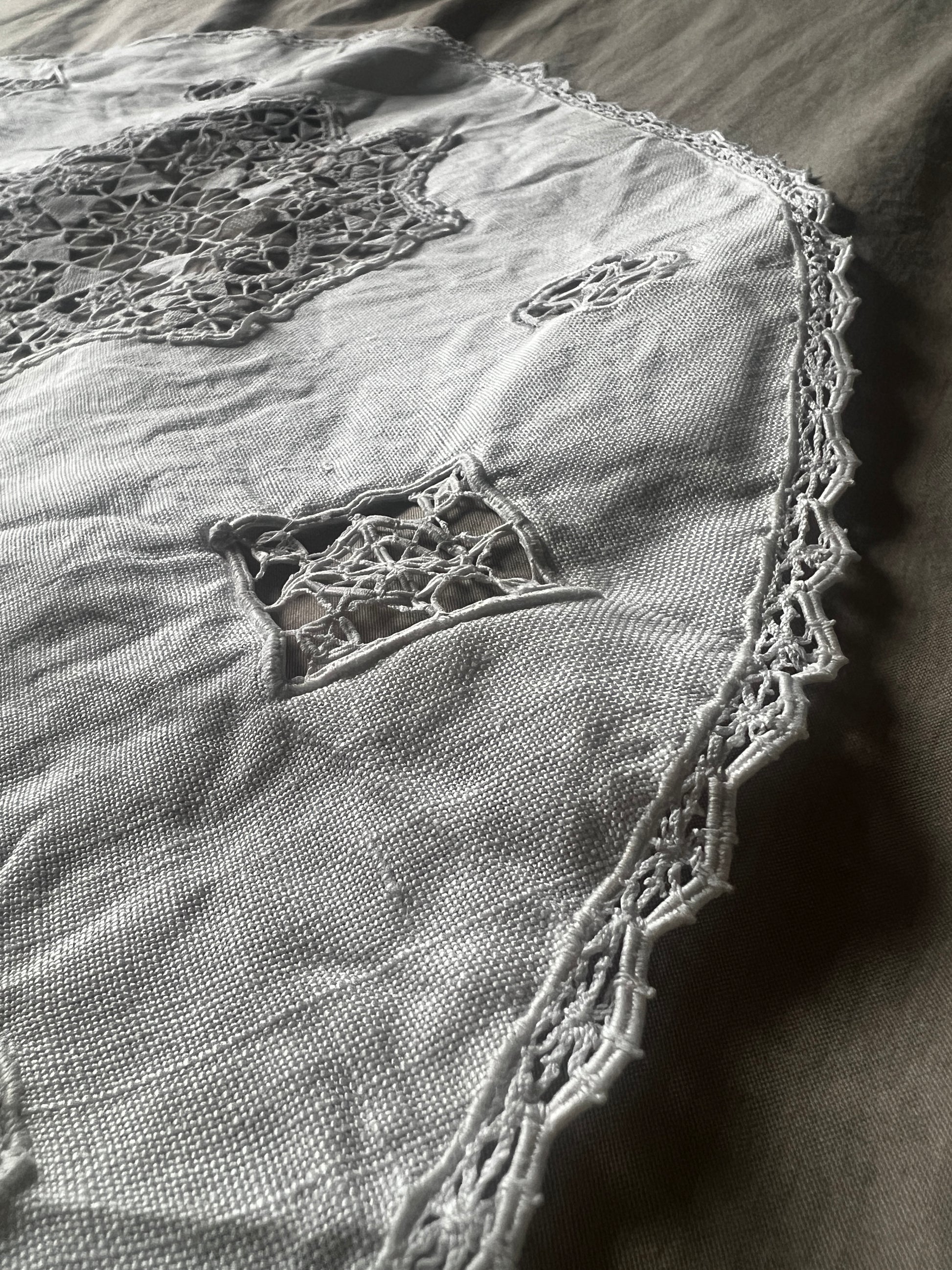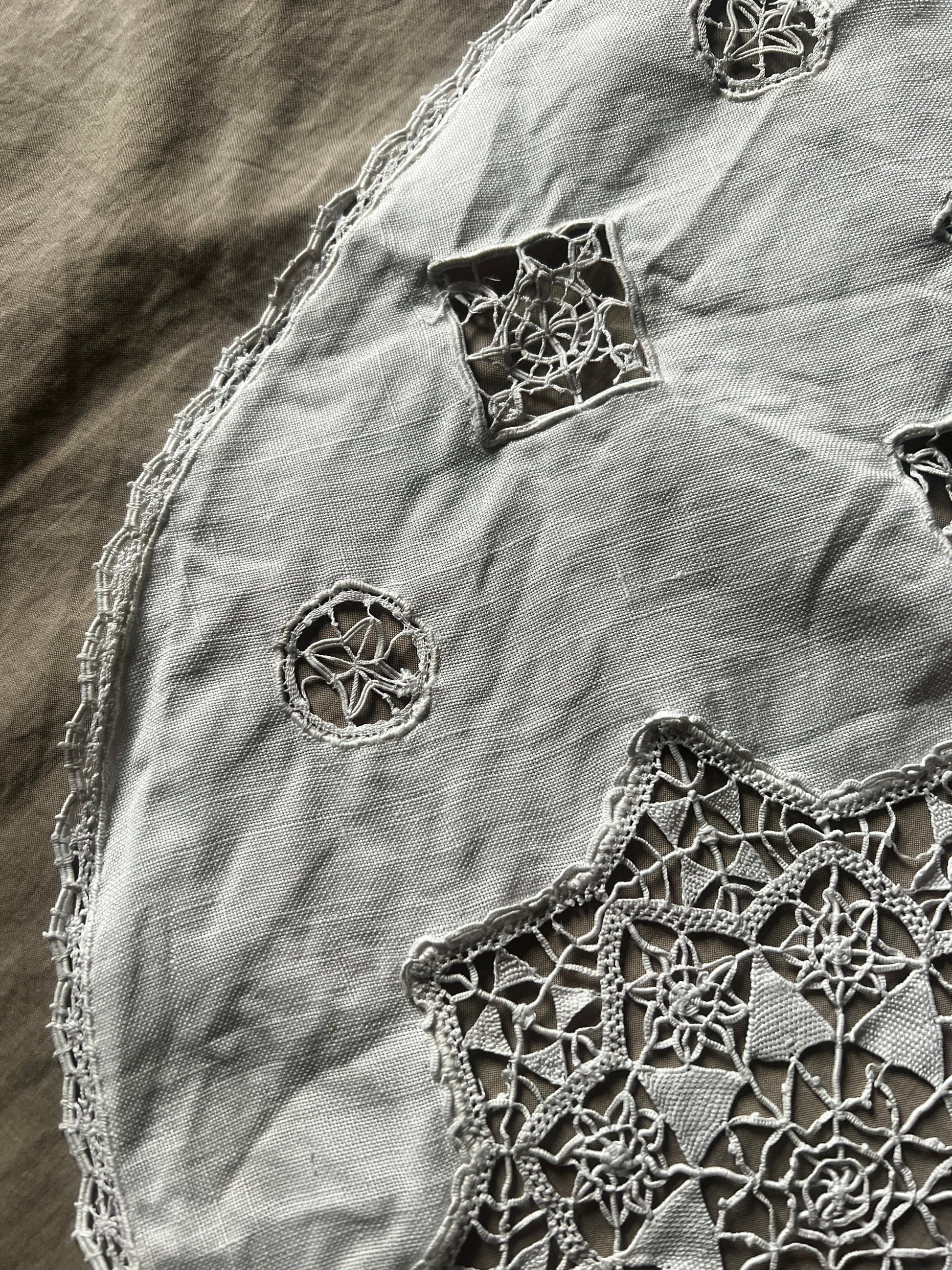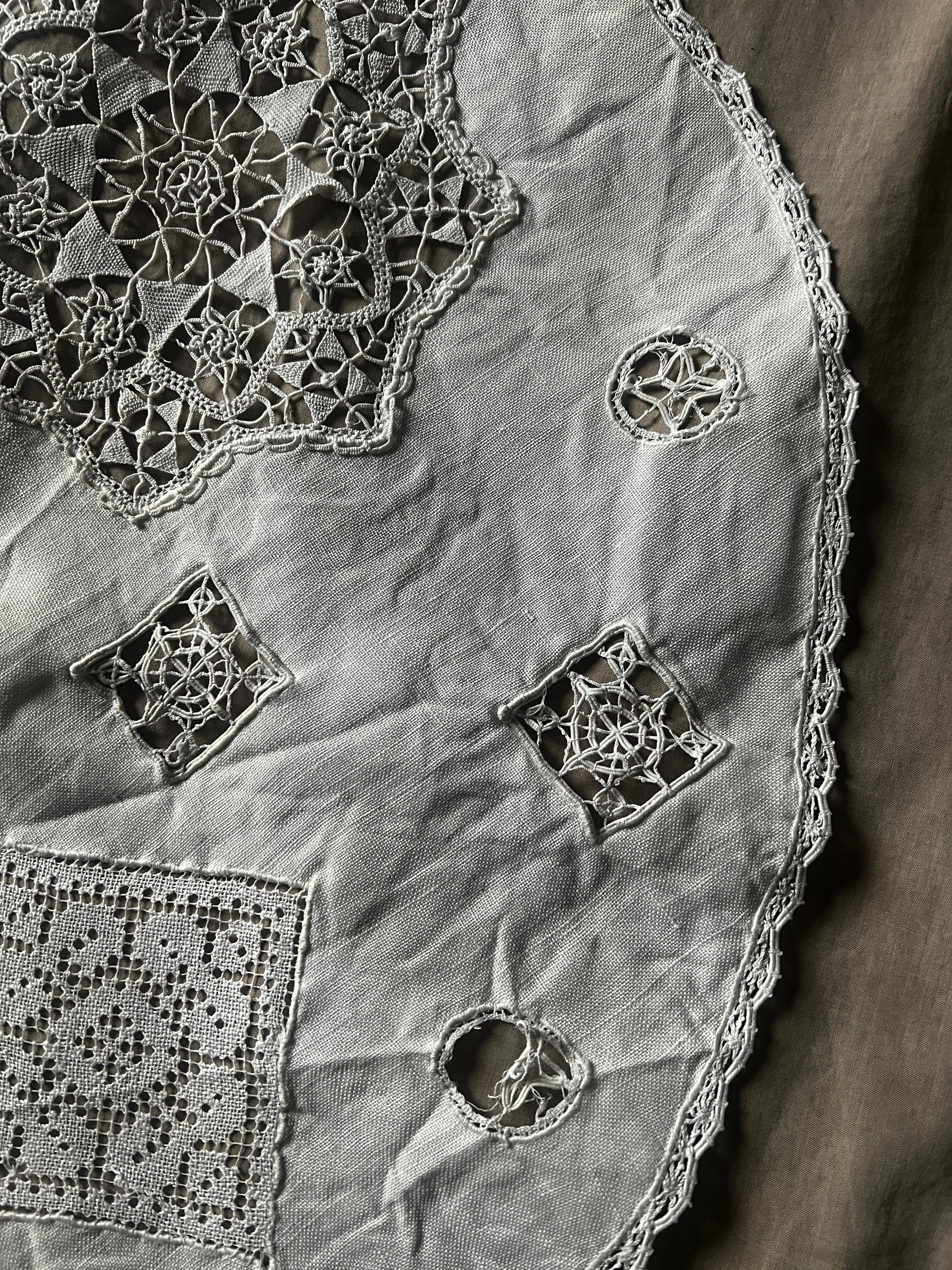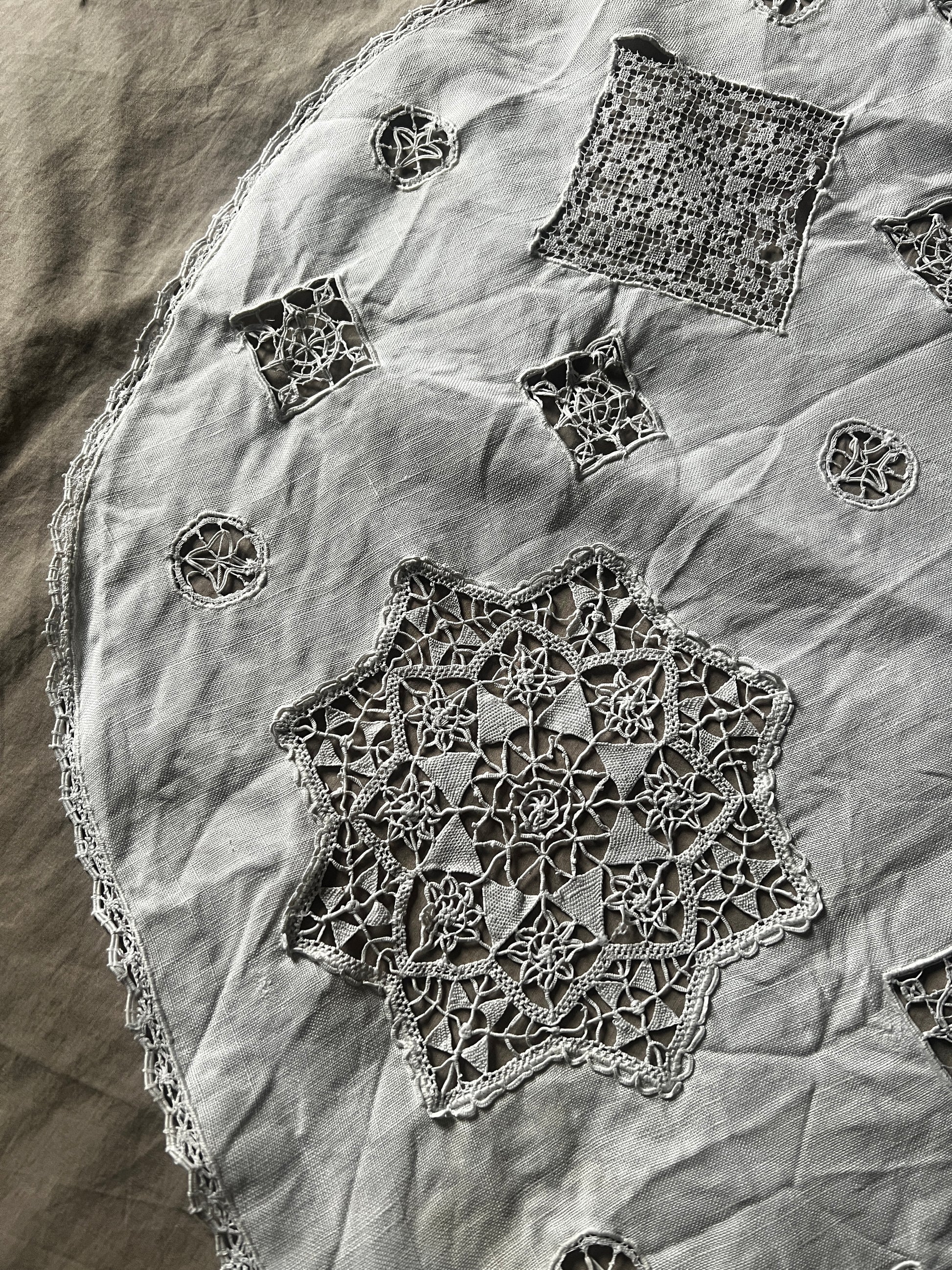 たくさんのレースモチーフがリネンクロスの上に丁寧にインサートされた愛らしい雰囲気のお品です