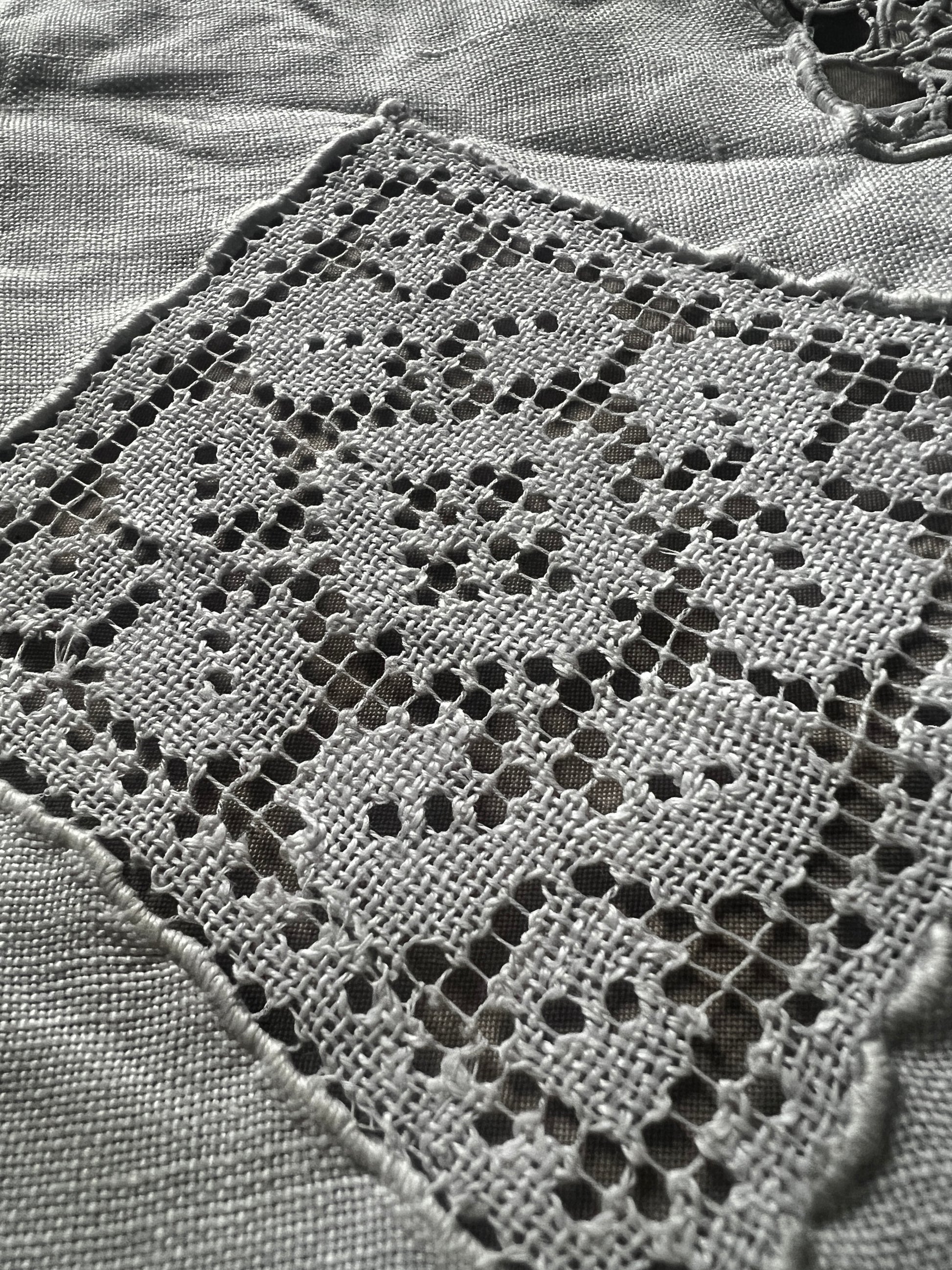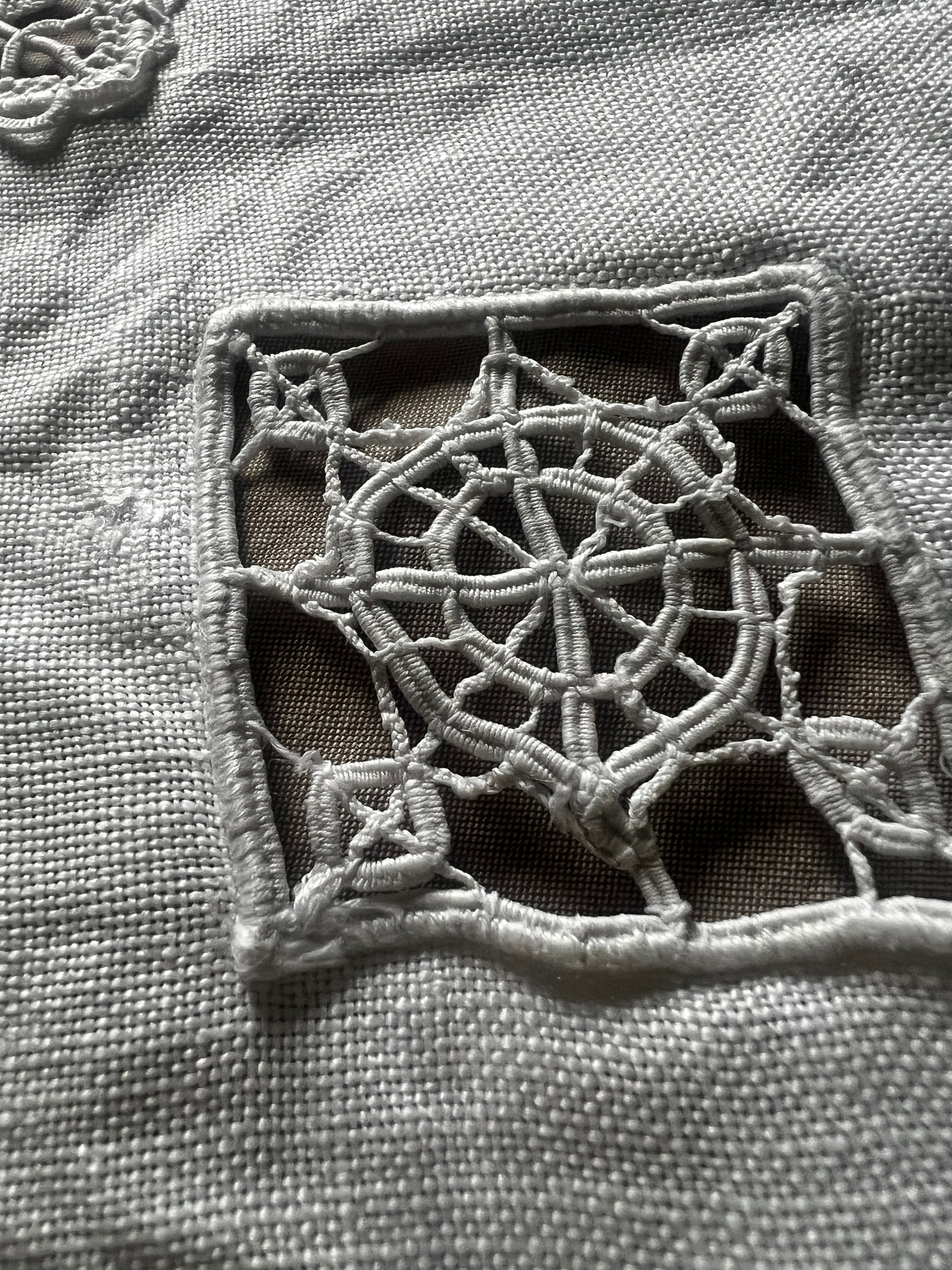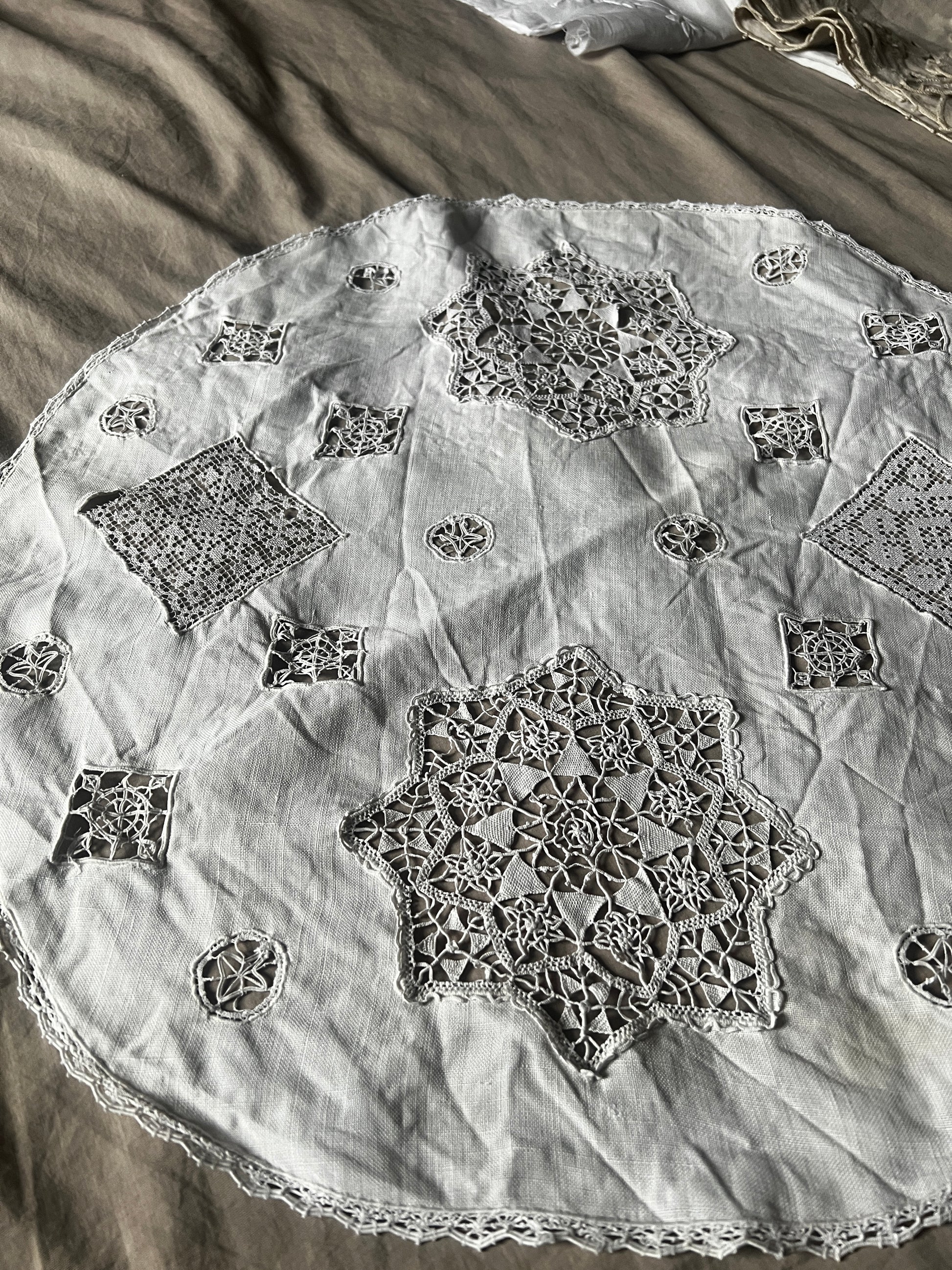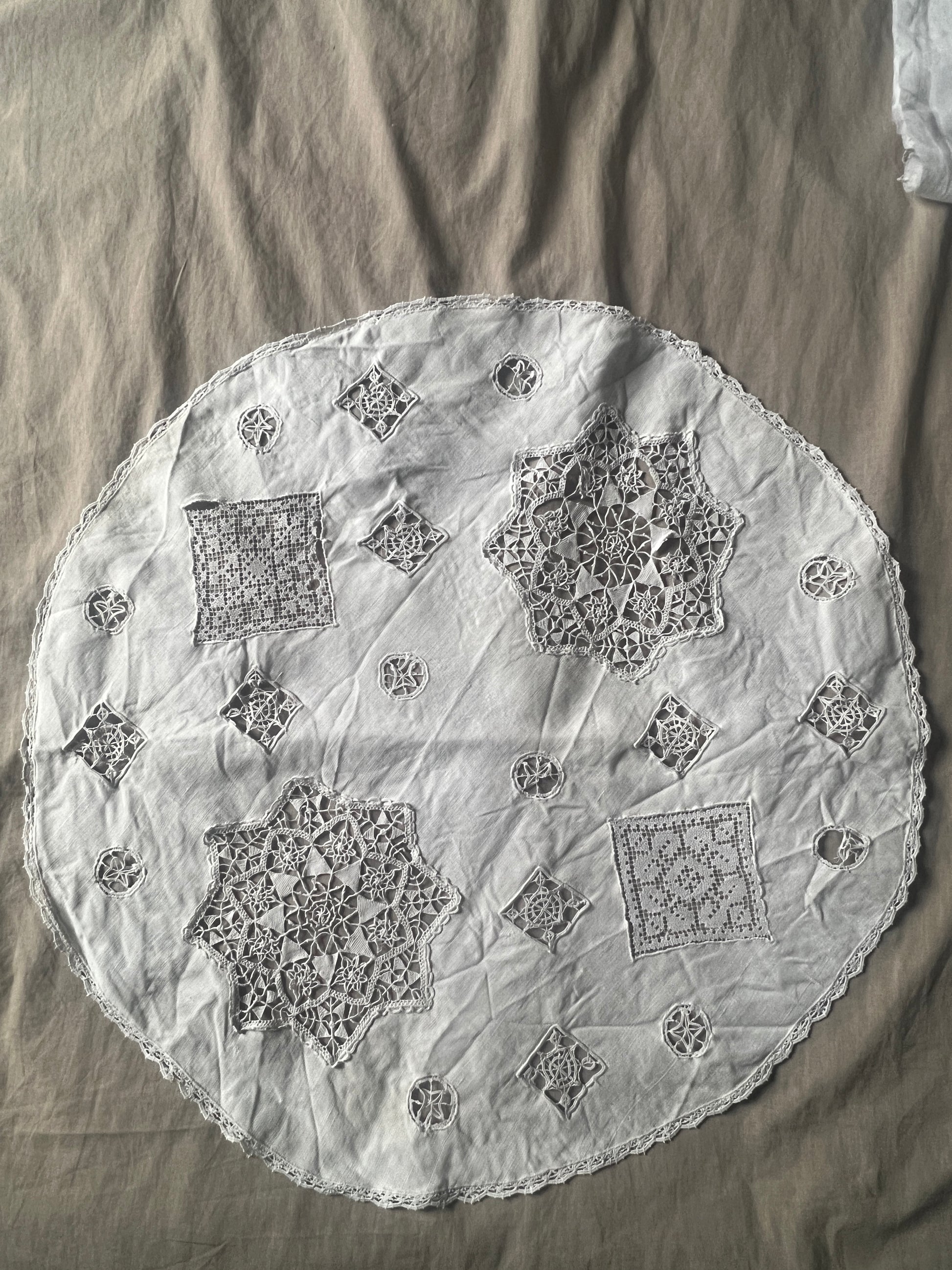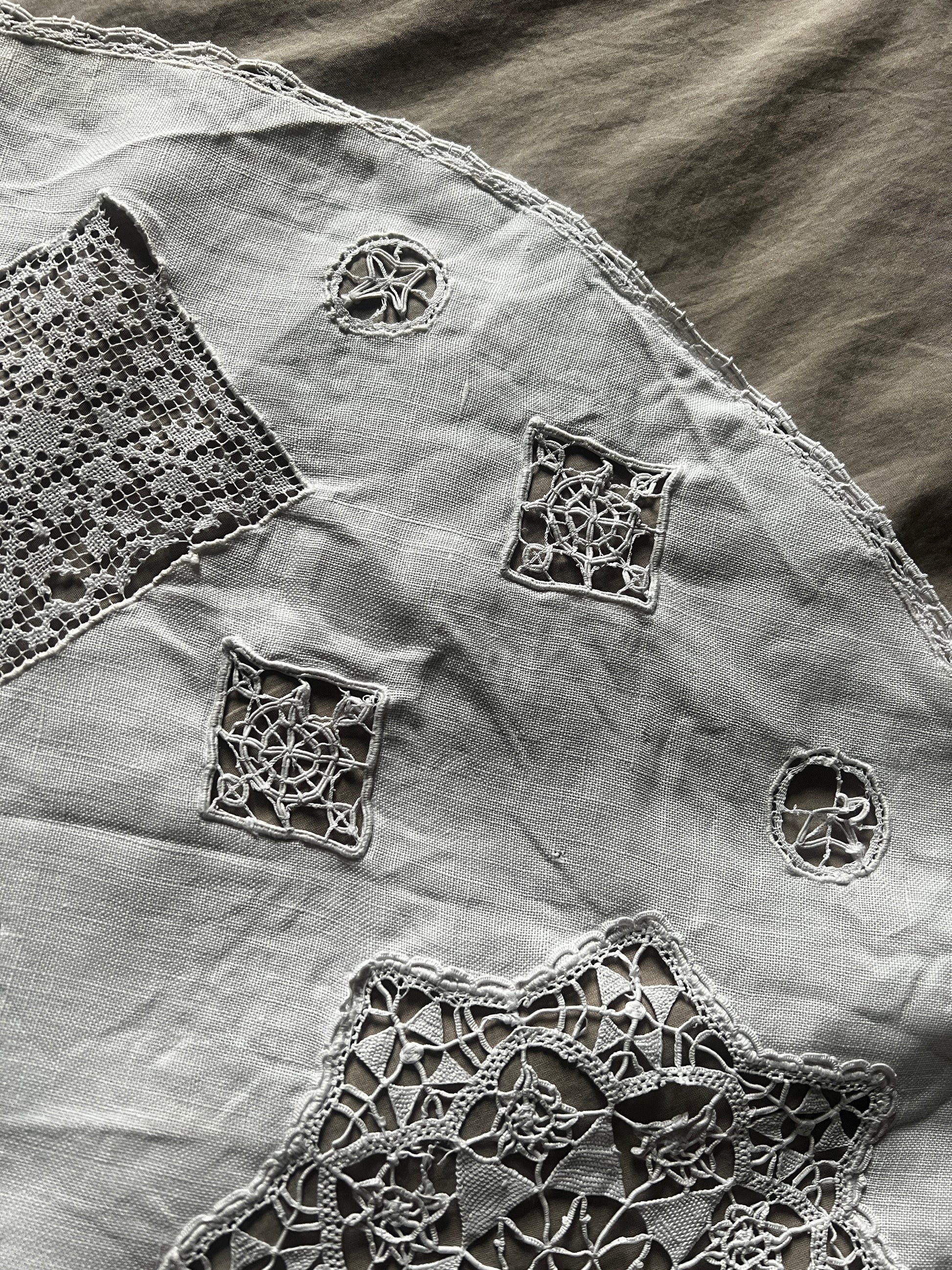 たくさんのレースモチーフがリネンクロスの上に丁寧にインサートされた愛らしい雰囲気のお品です
