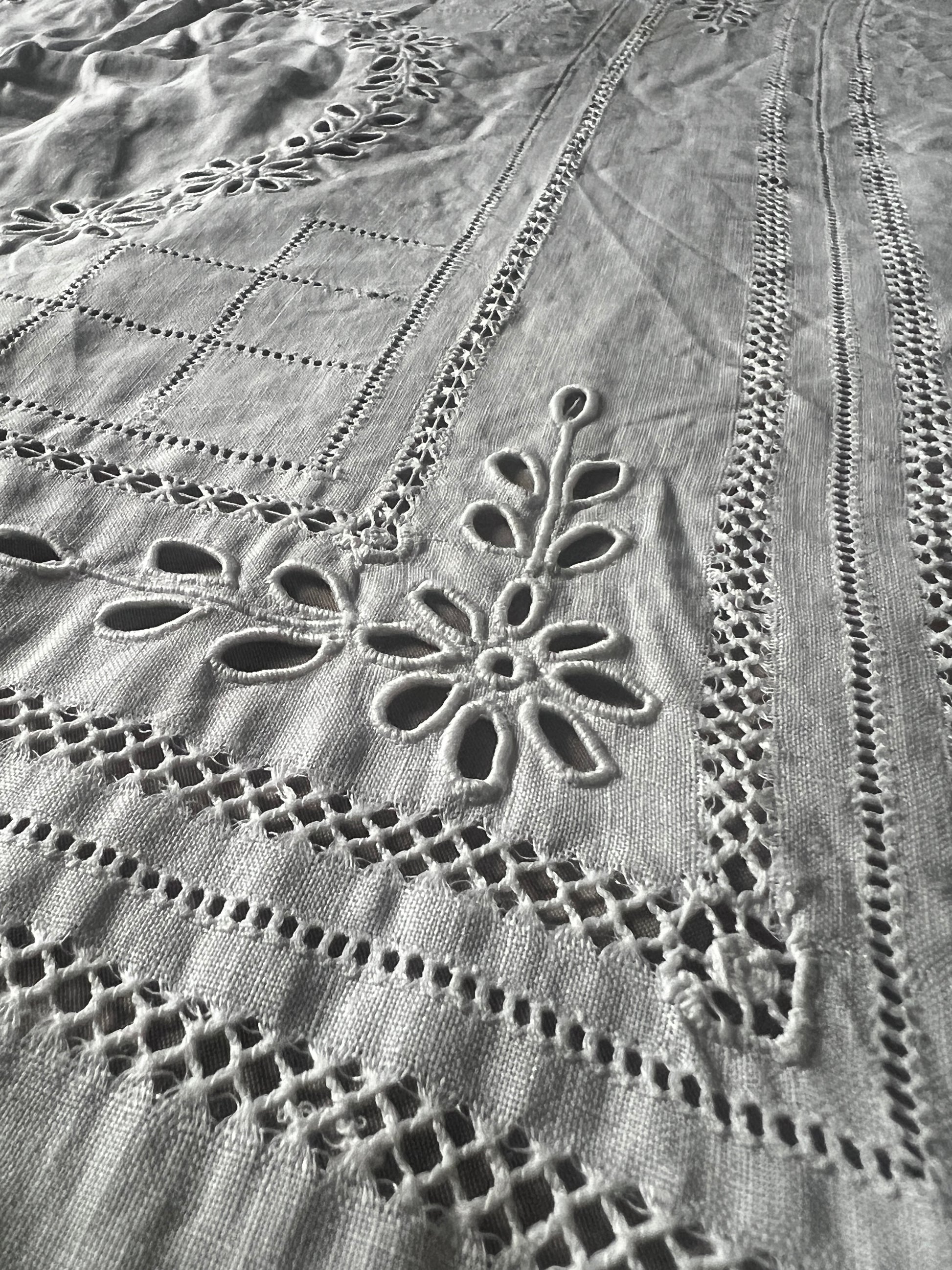 手触りの良いリネン地に丁寧な刺繍が一面に施された大判クロスです