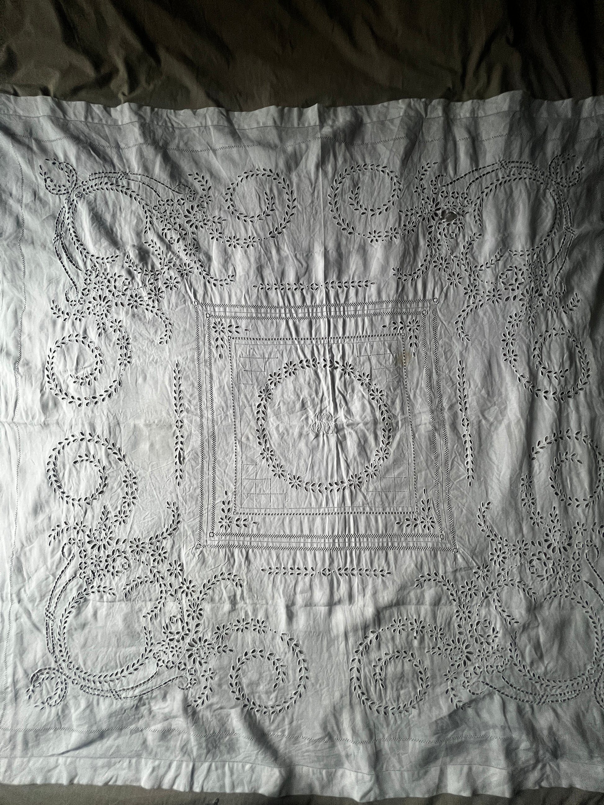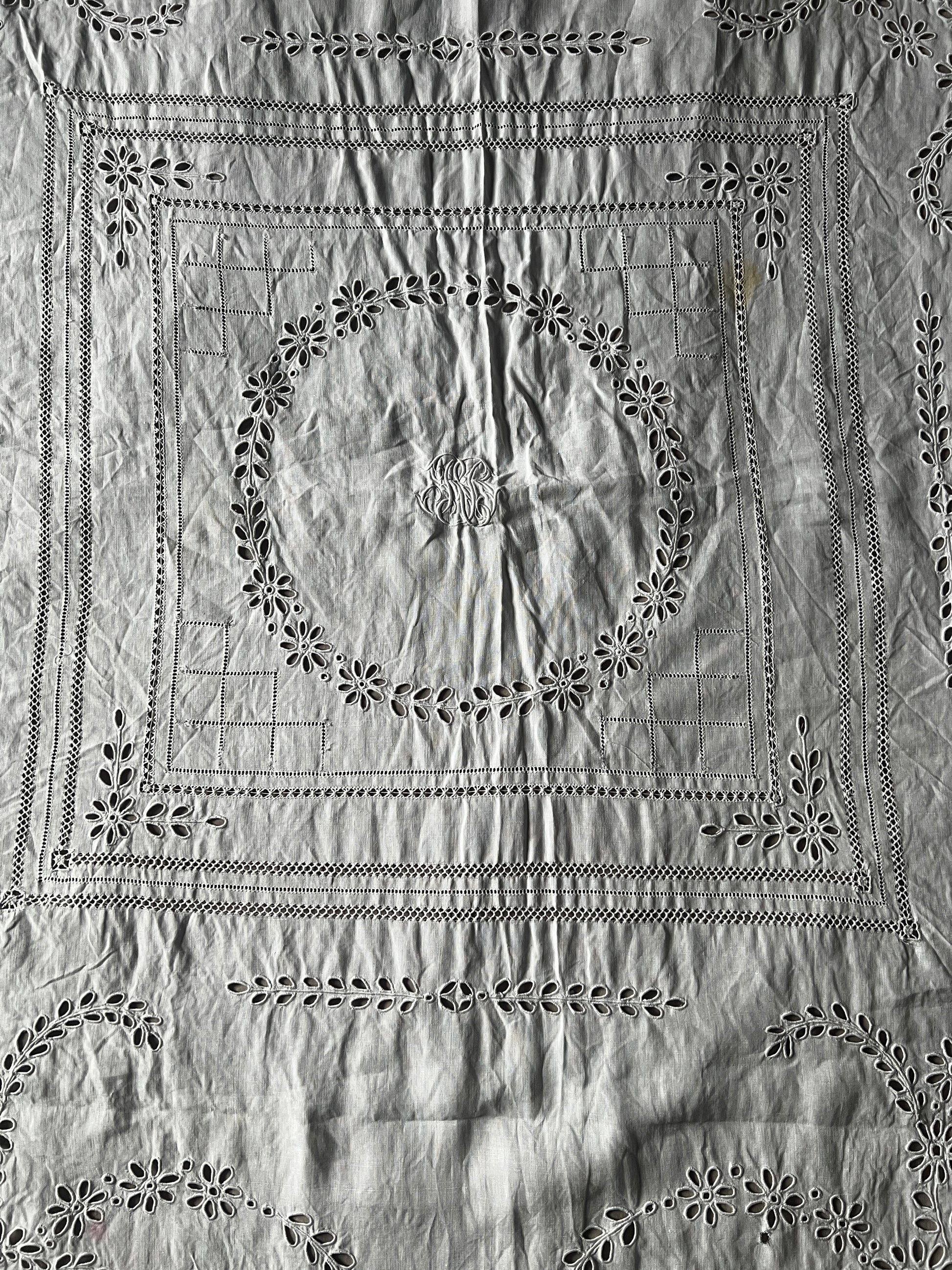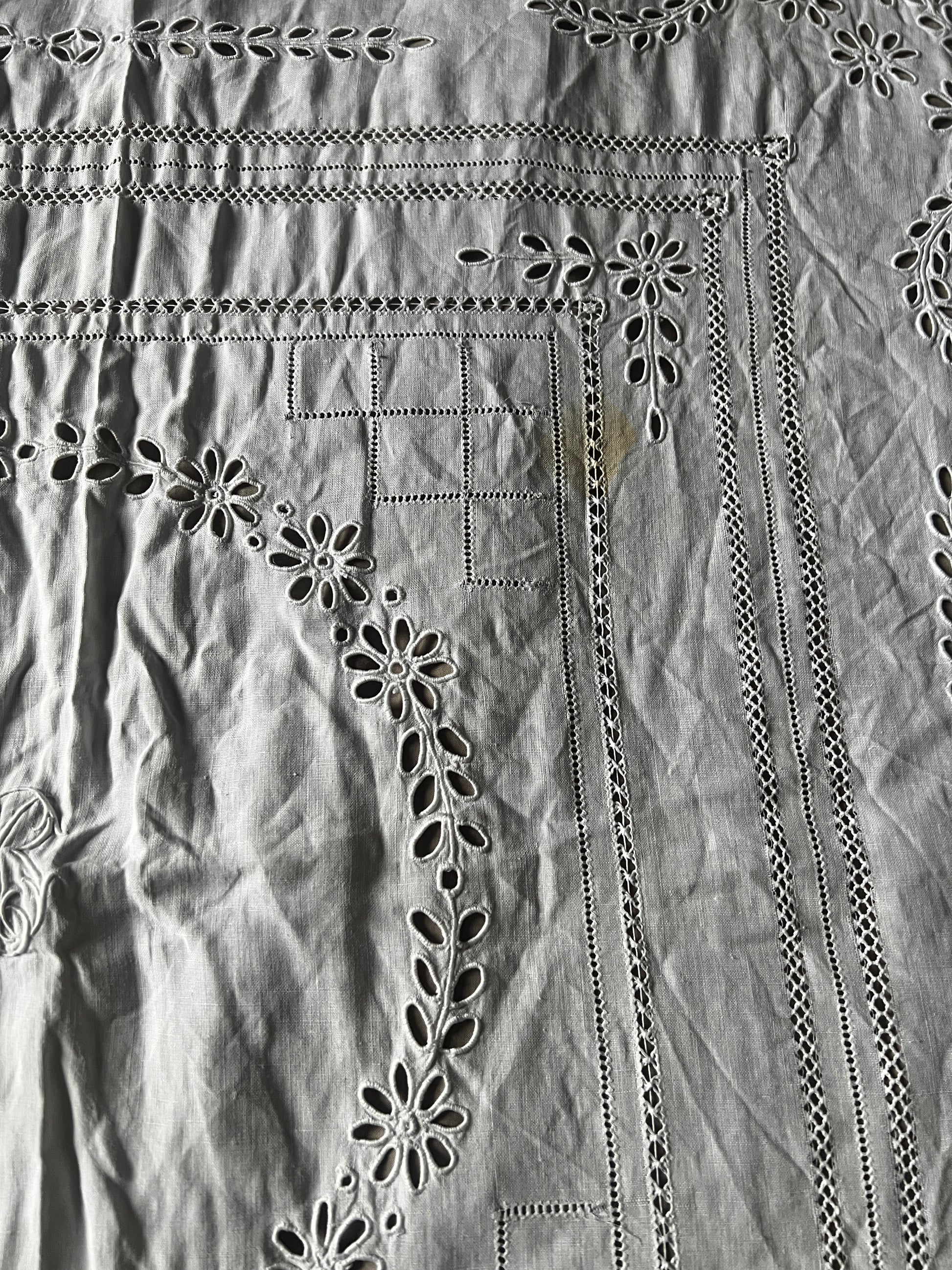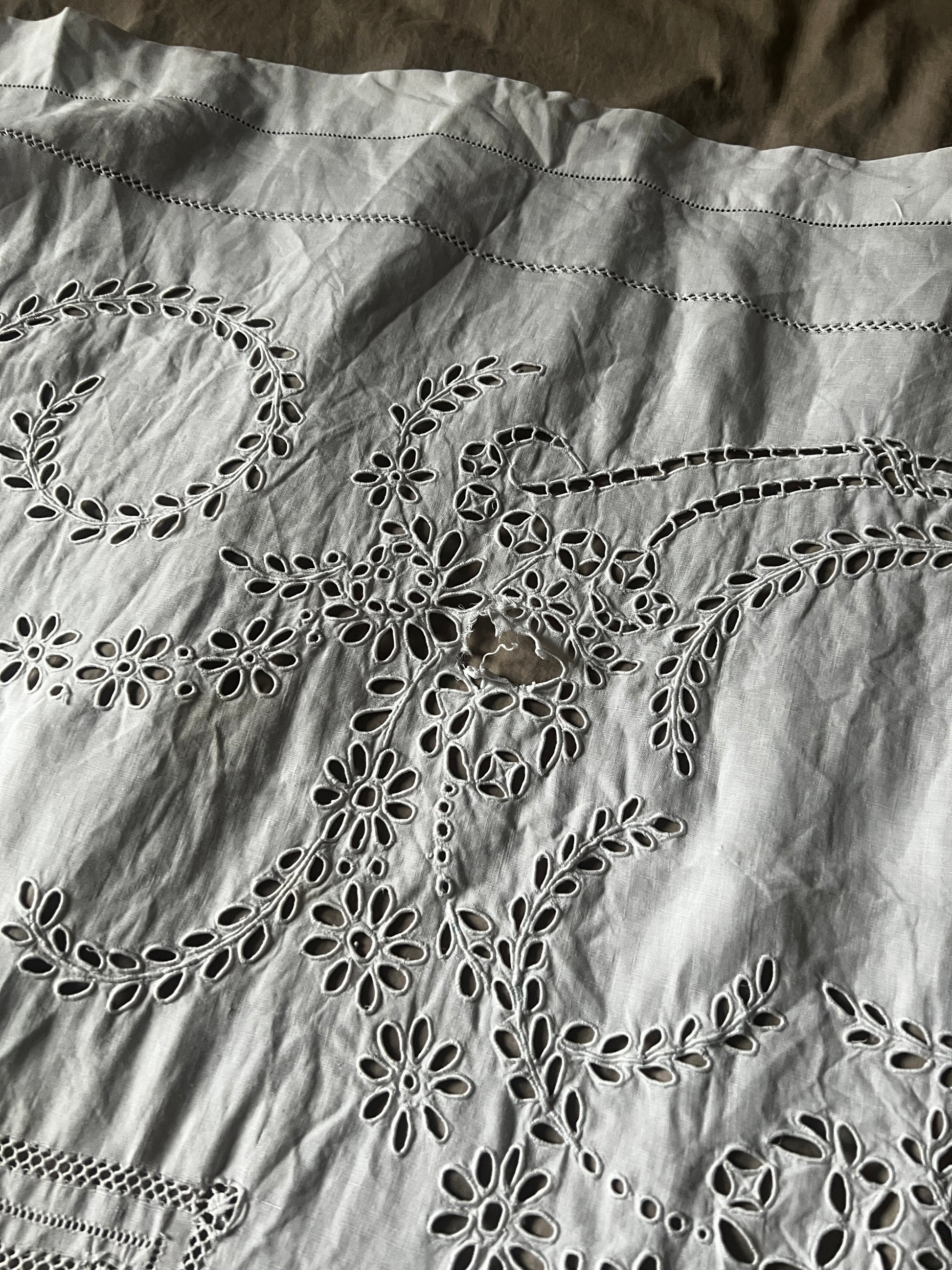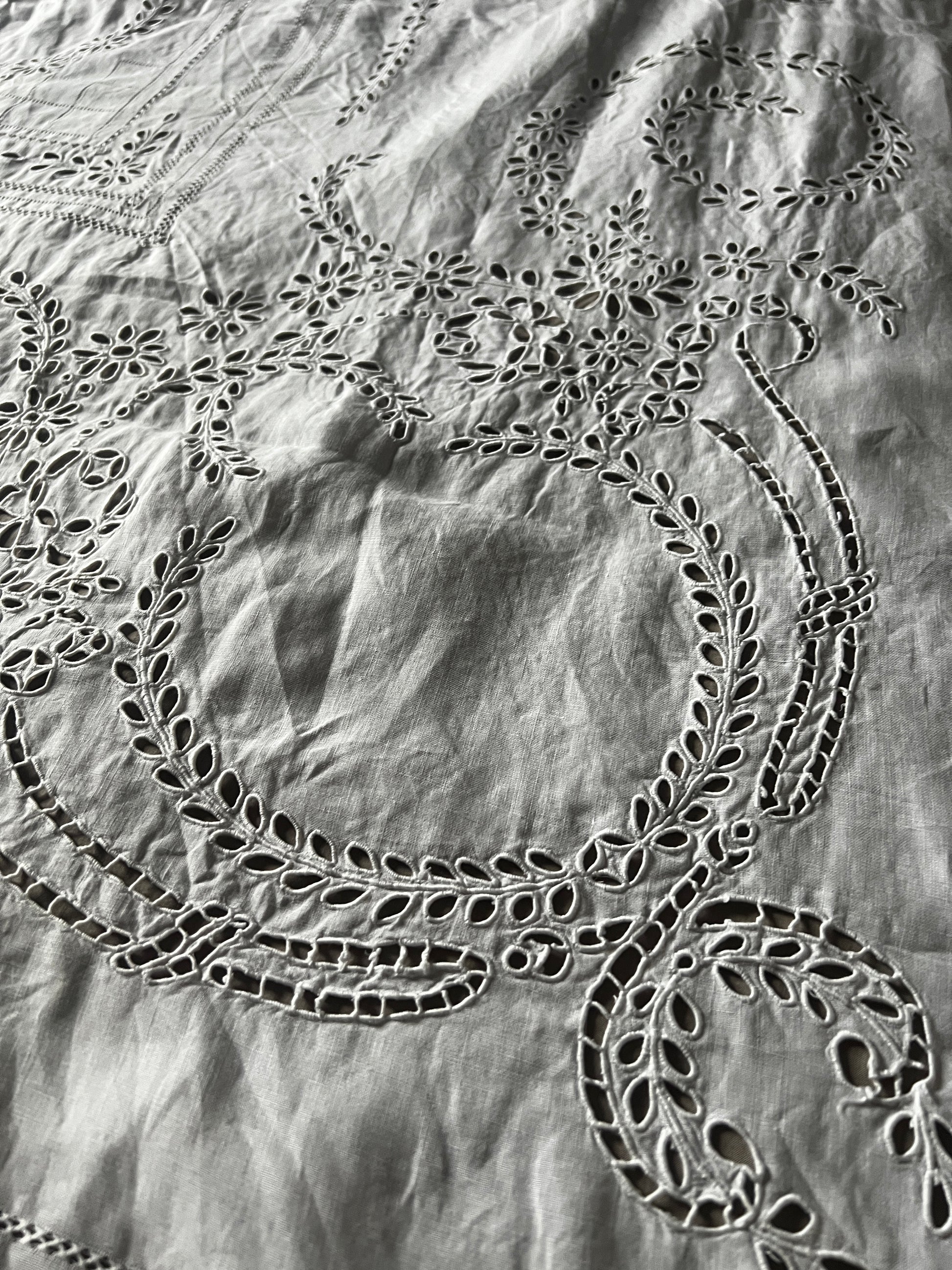 縁にはカットワーク刺繍とドロンワークが施され、中央には気品あるモノグラム刺繍が配されています
