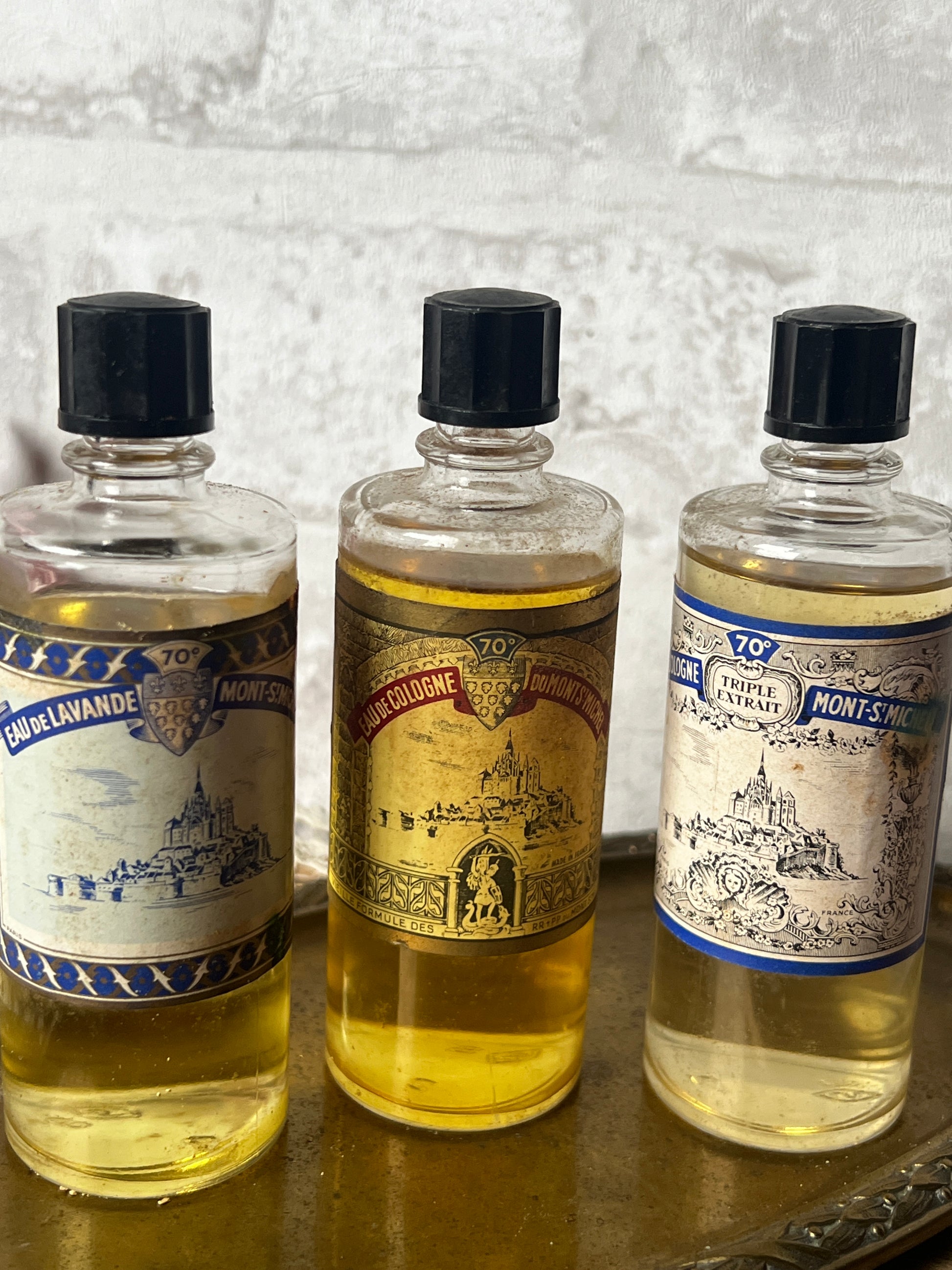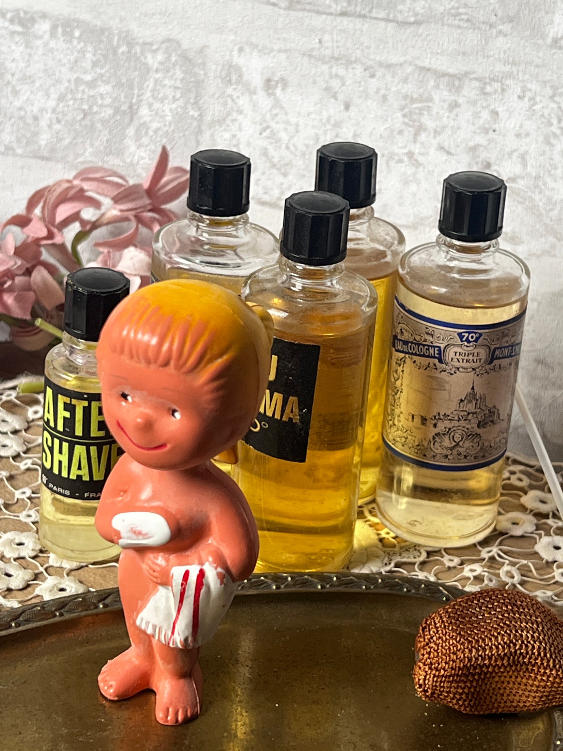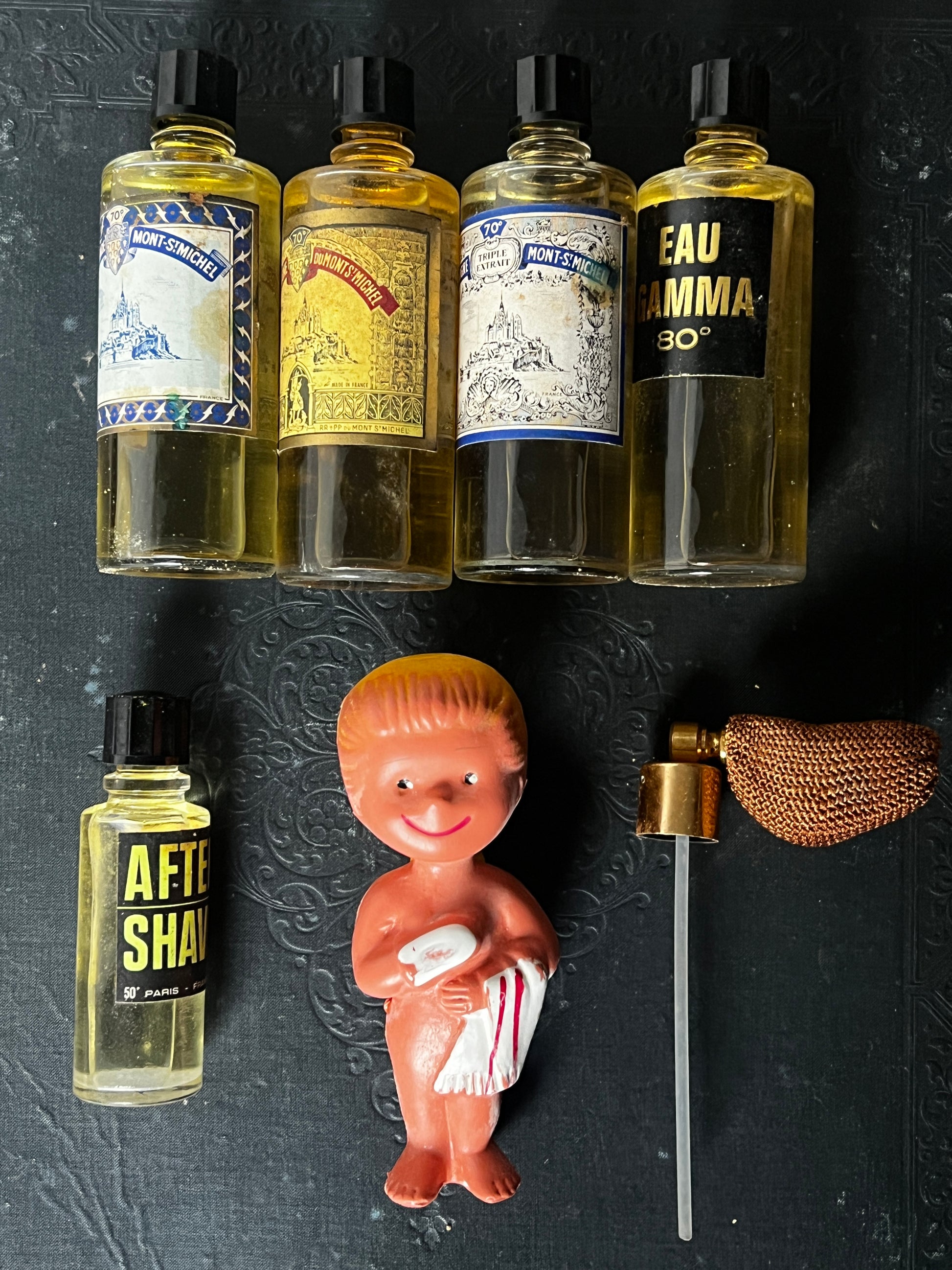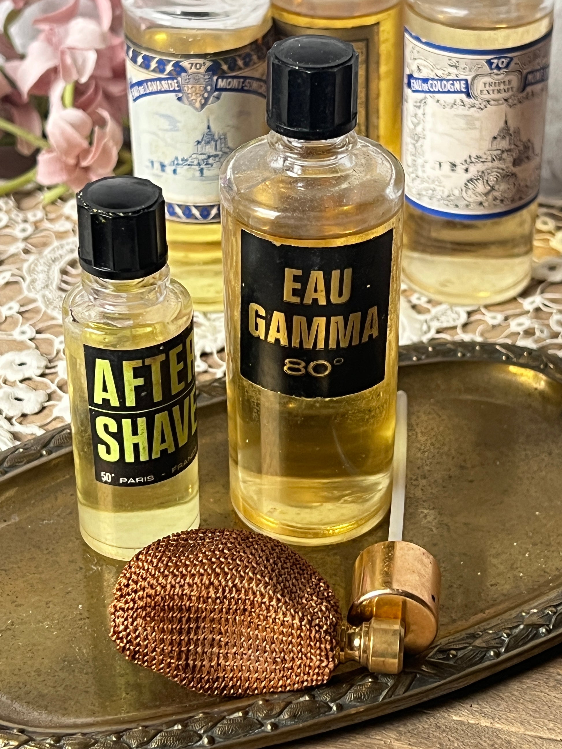 小瓶は計5本(大4・小1)で、内容はモンサンミッシェルのオードコロン2種、ラベンダー水1本、EAU GAMMA 1本、アフターシェイブ1本と、多彩なラインナップ