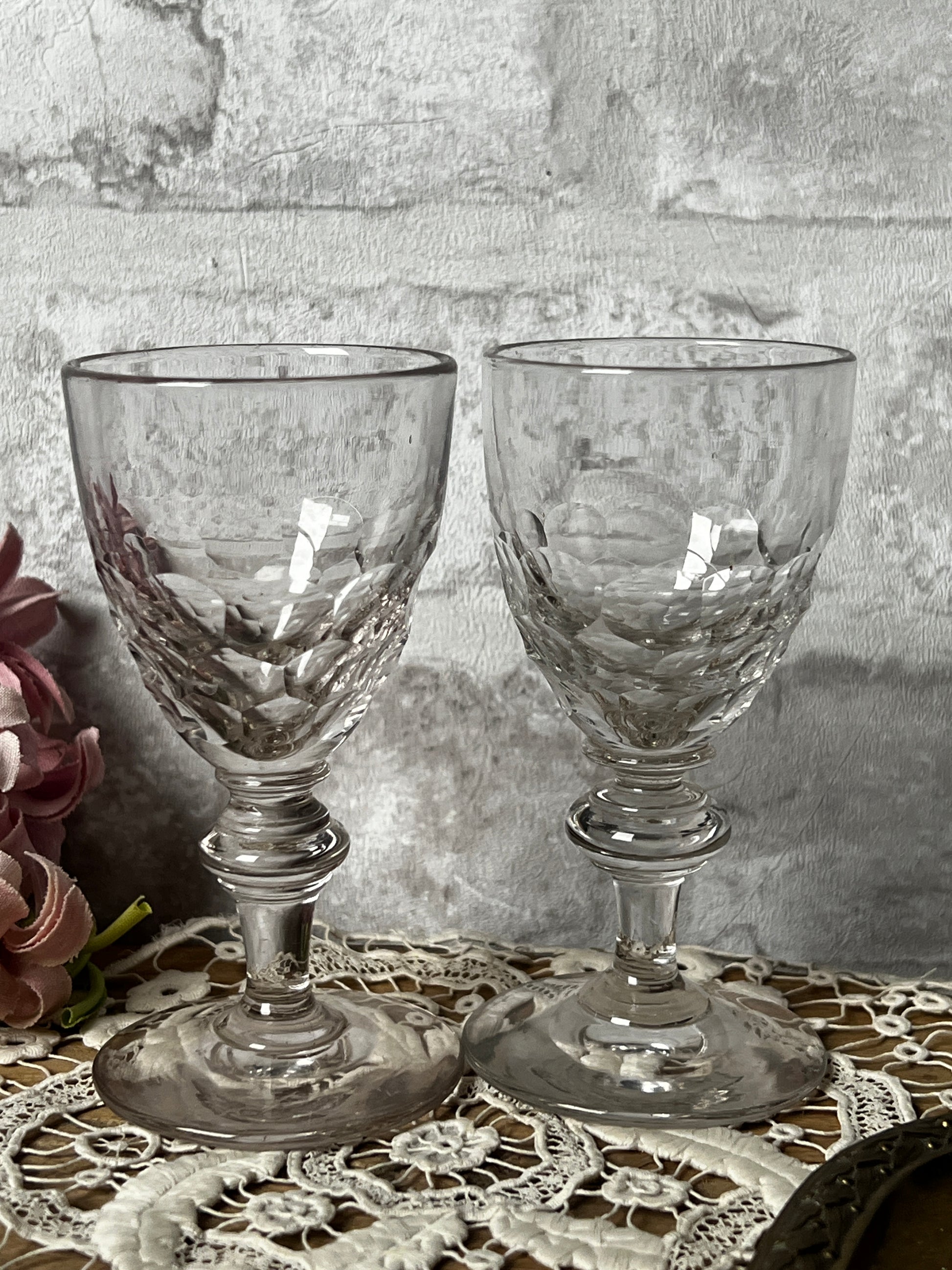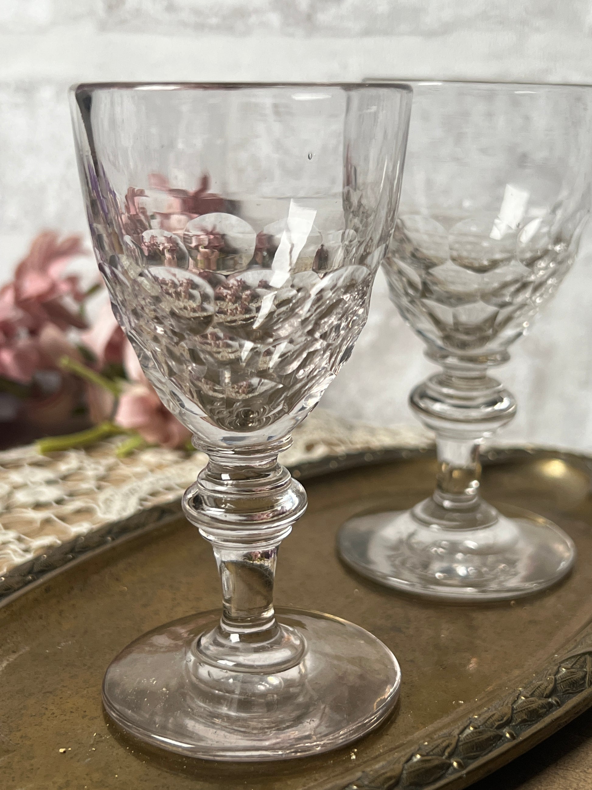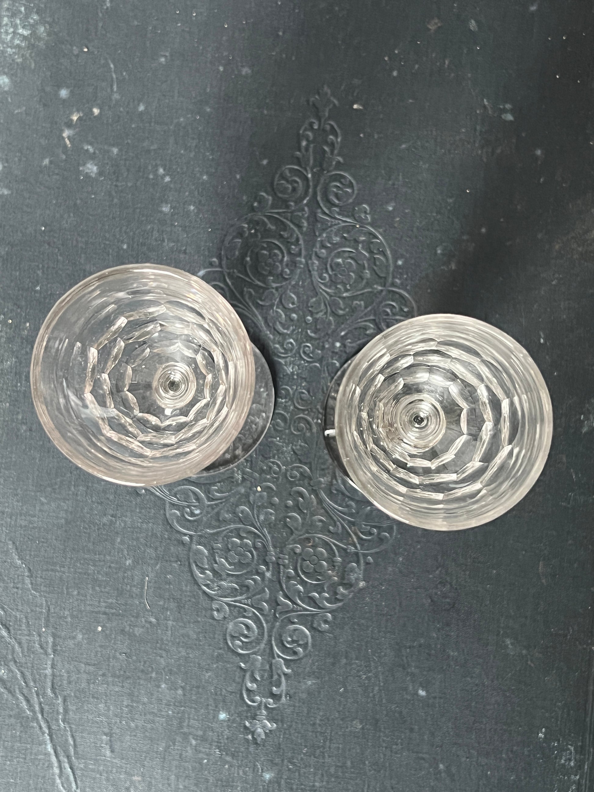 うろこのようなカットが生み出す陰影が美しい、オールドガラスのリキュールグラス・ペアセットです