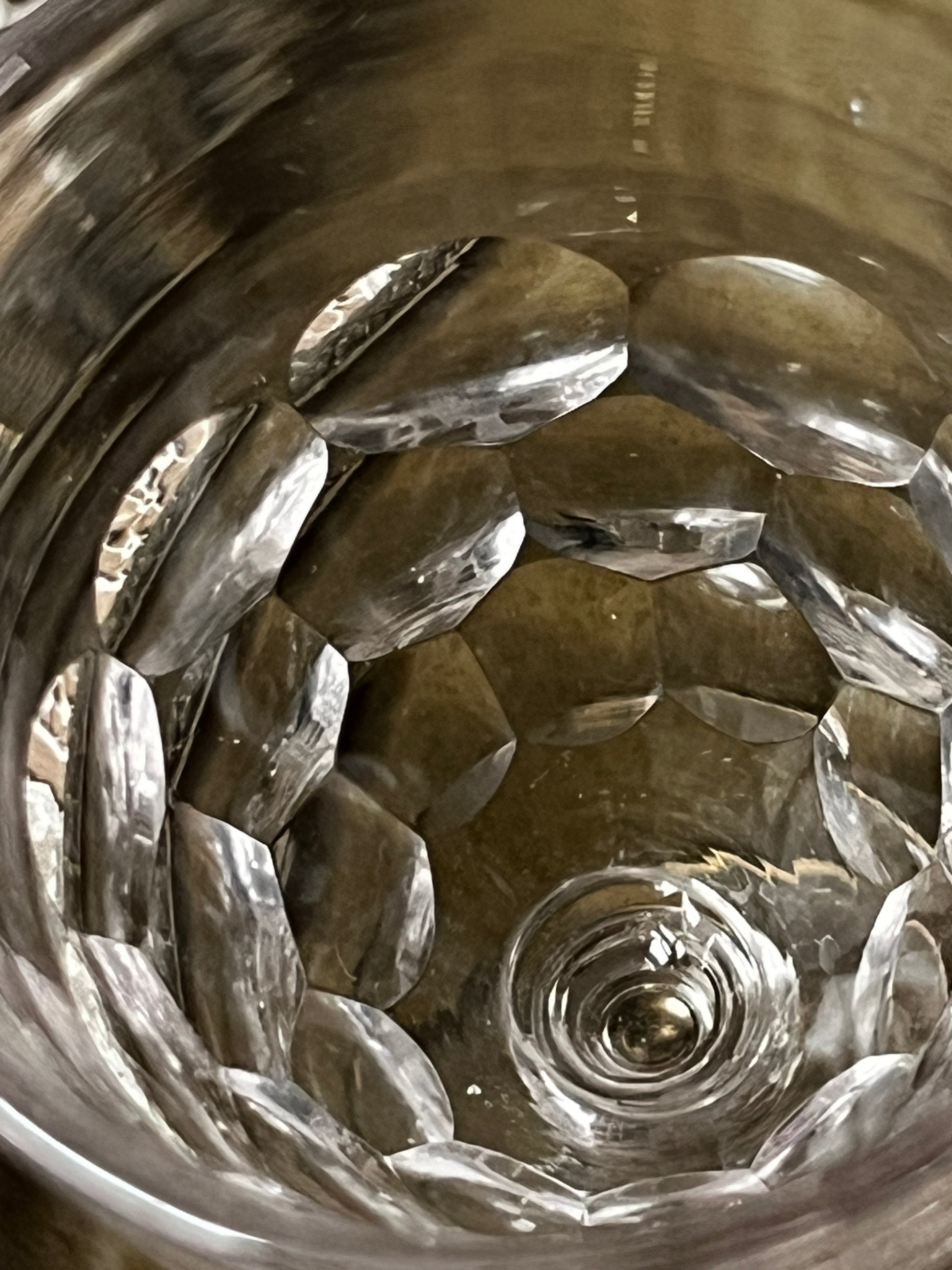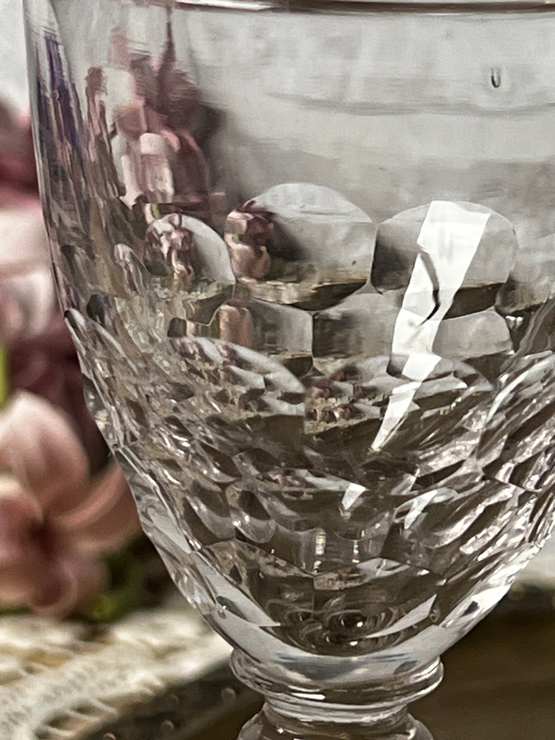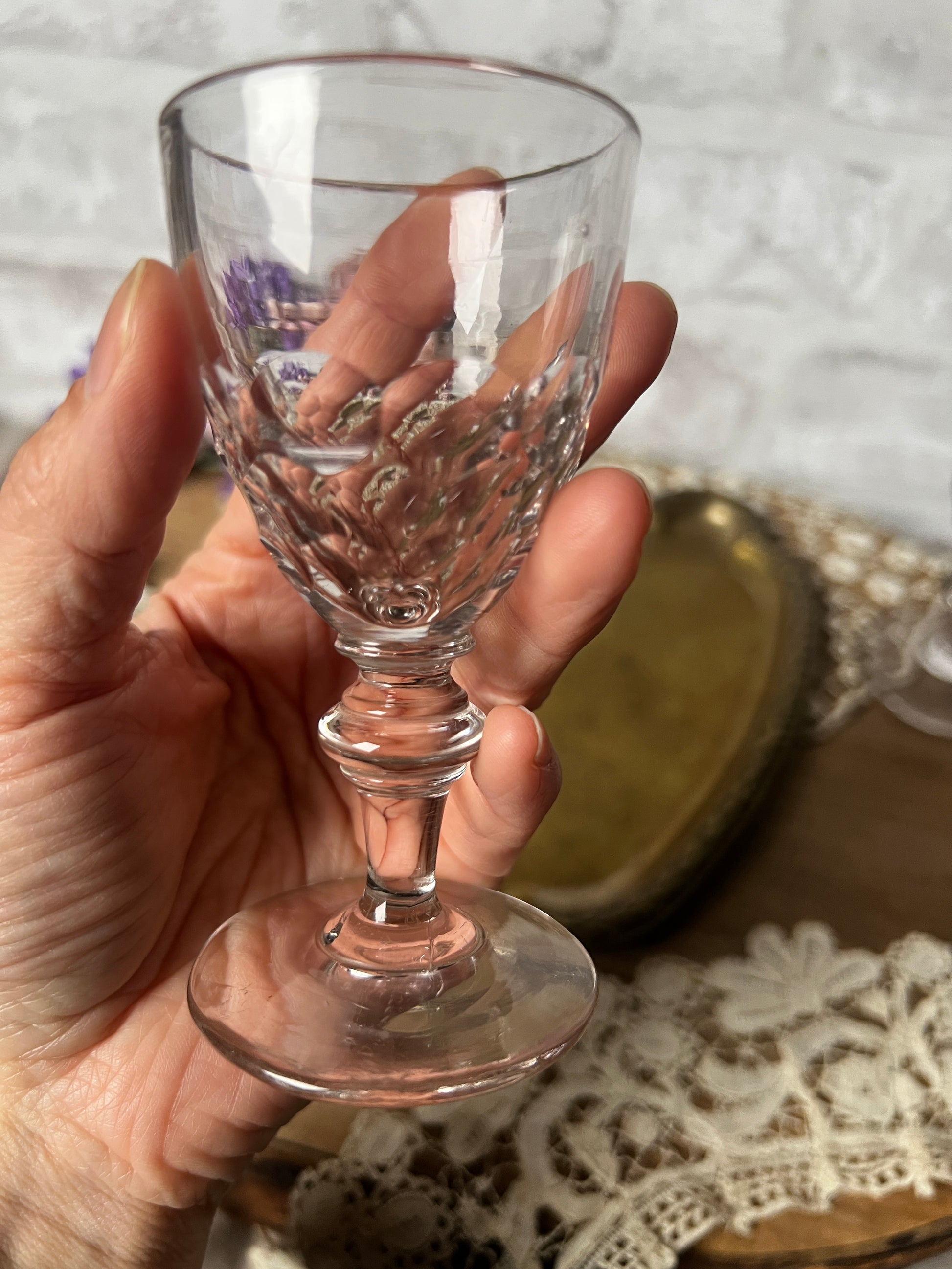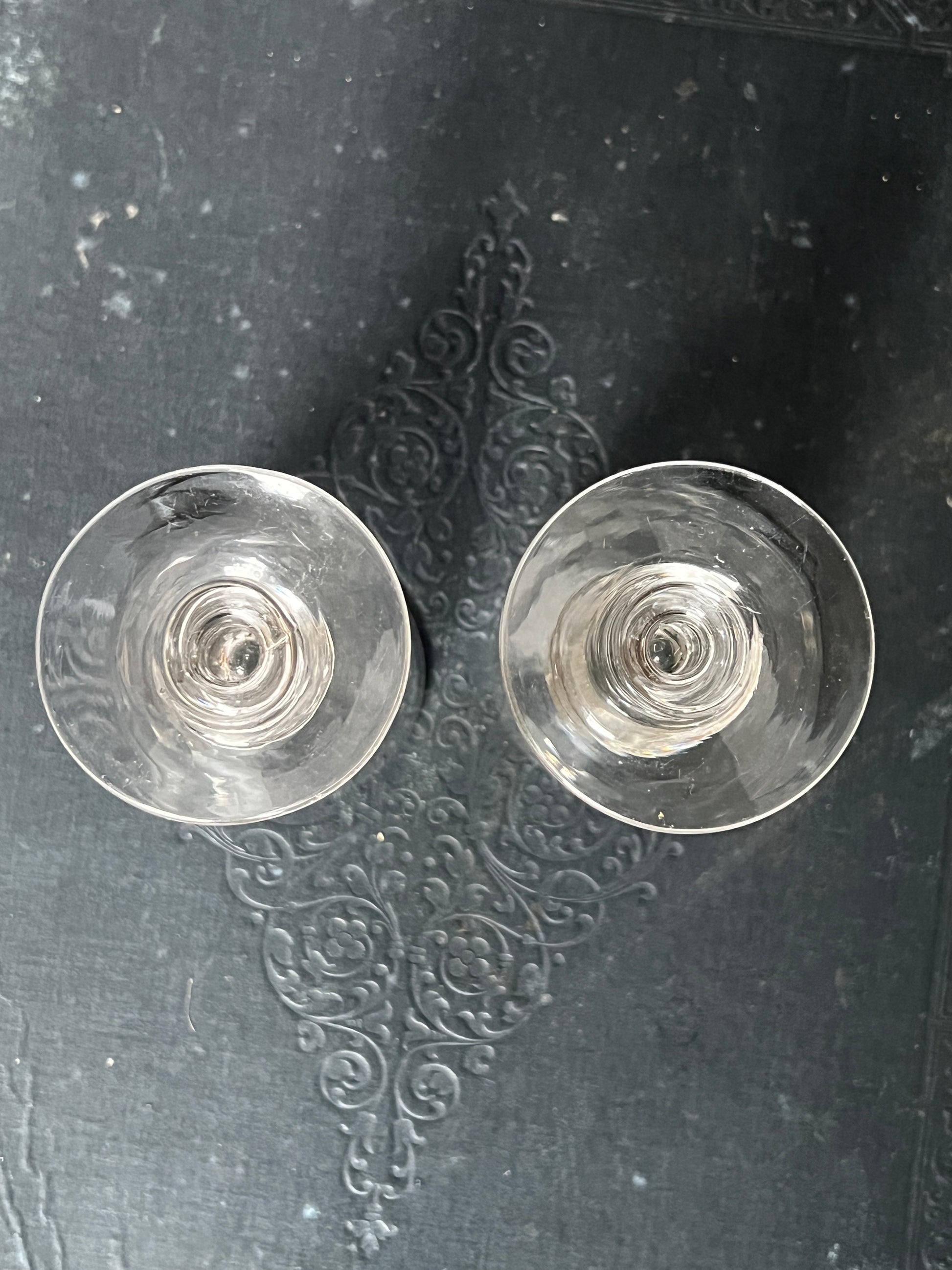 うろこのようなカットが生み出す陰影が美しい、オールドガラスのリキュールグラス・ペアセットです