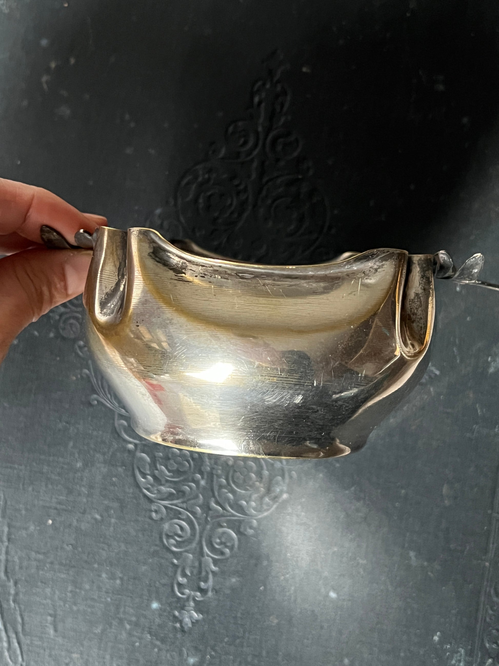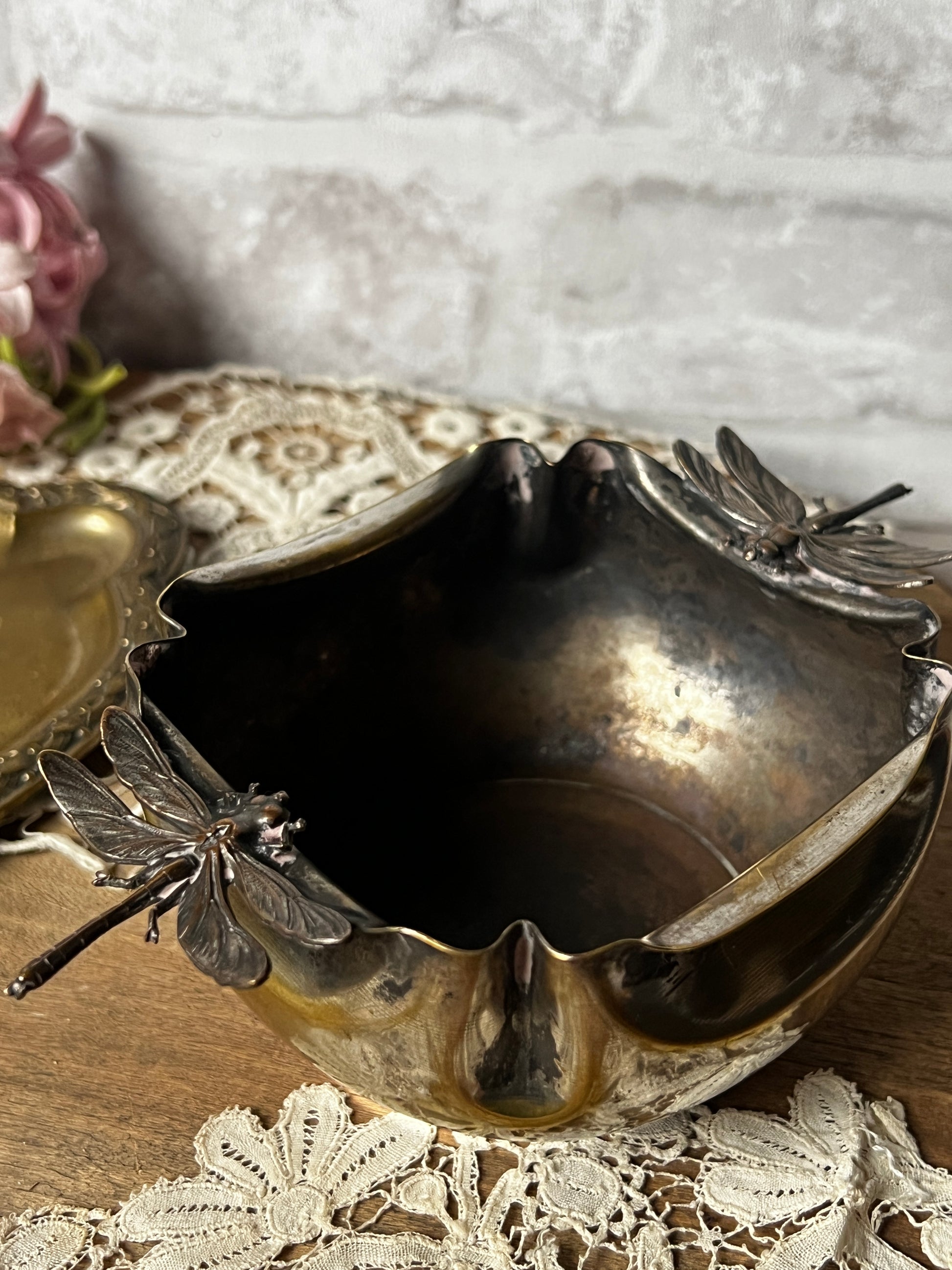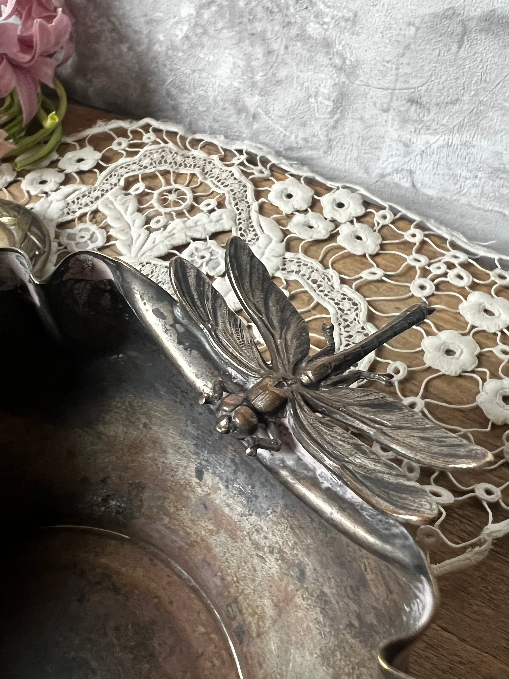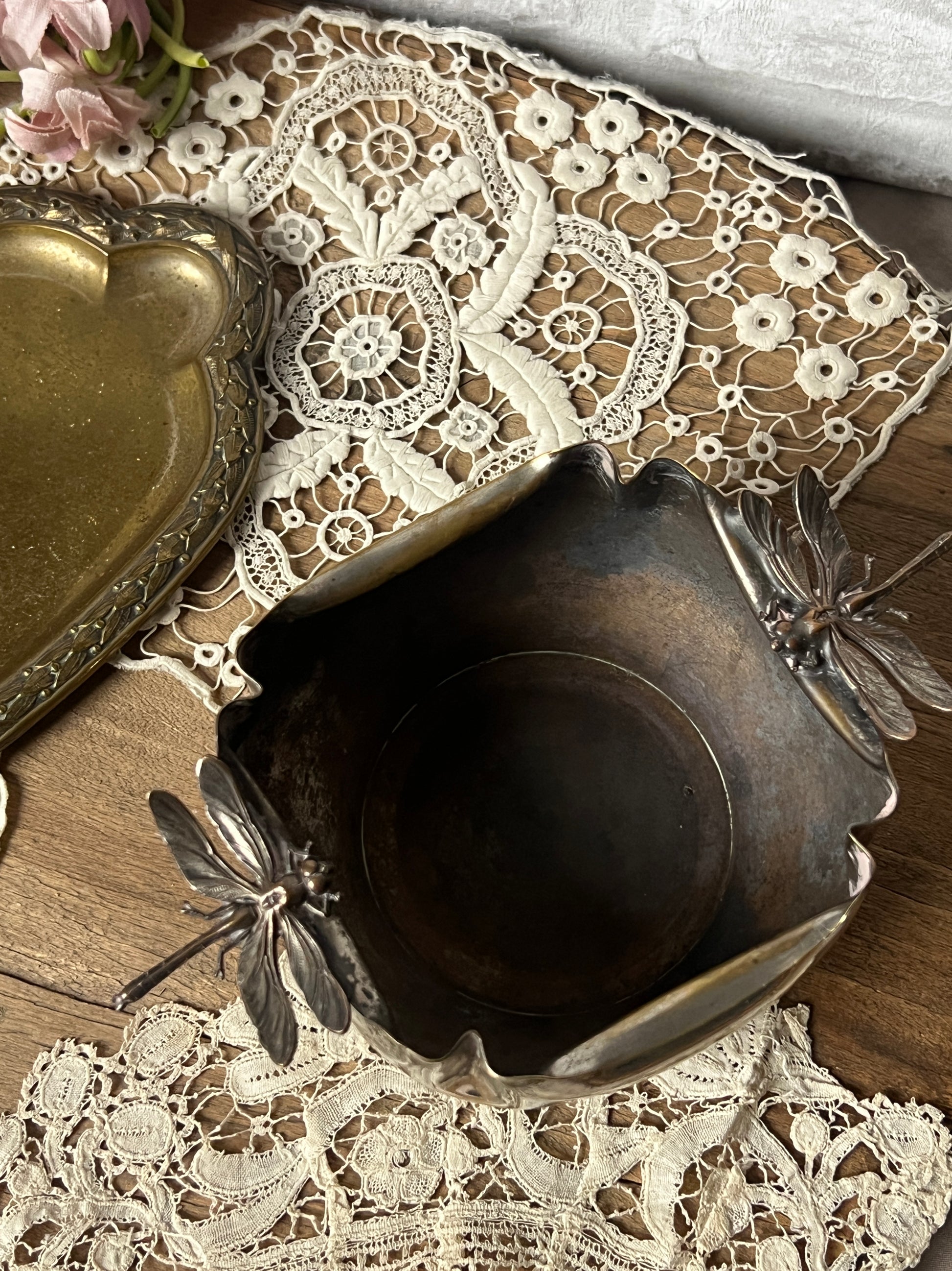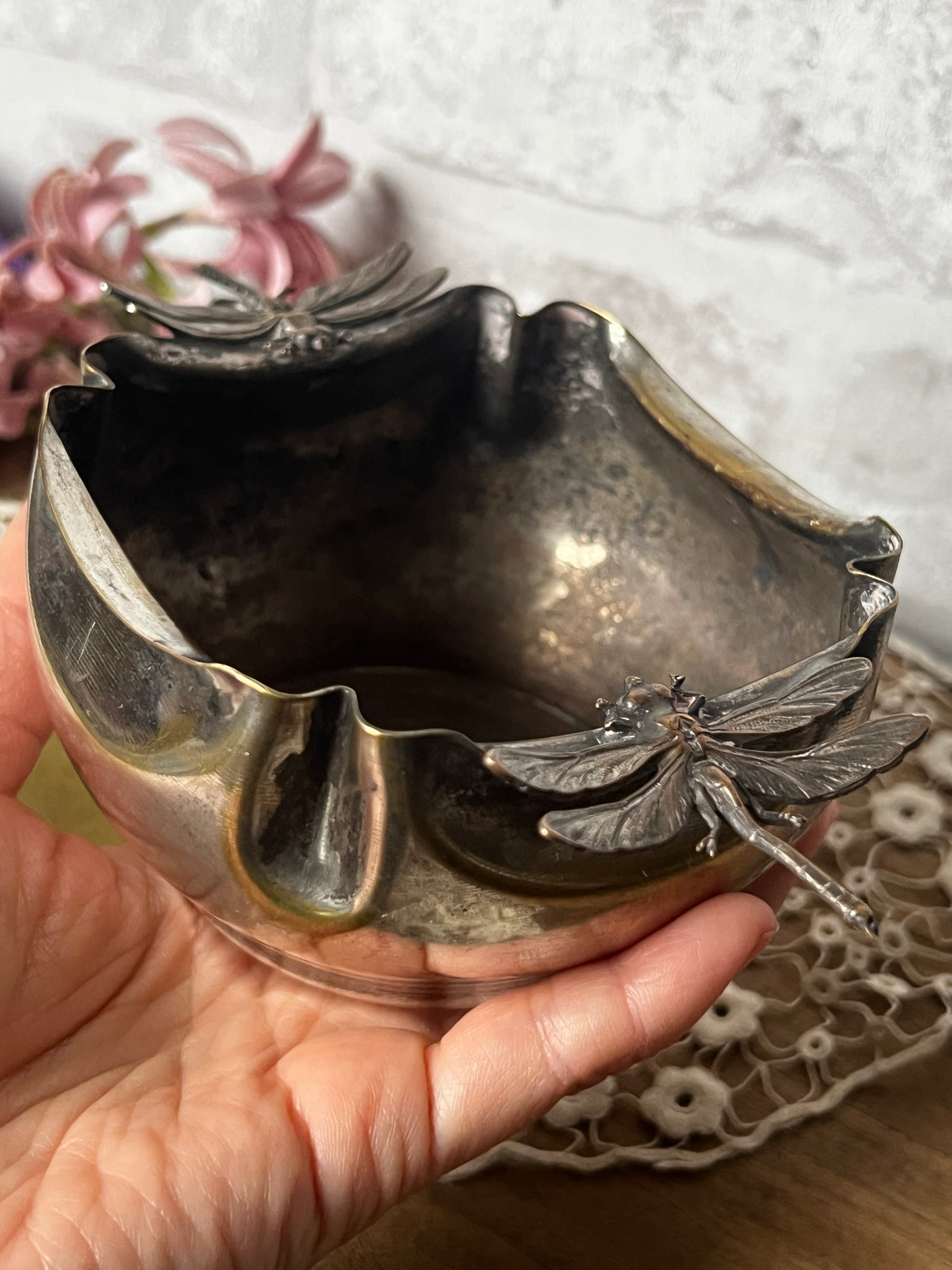 トンボの装飾が目を引く、美しい銀メッキの器です