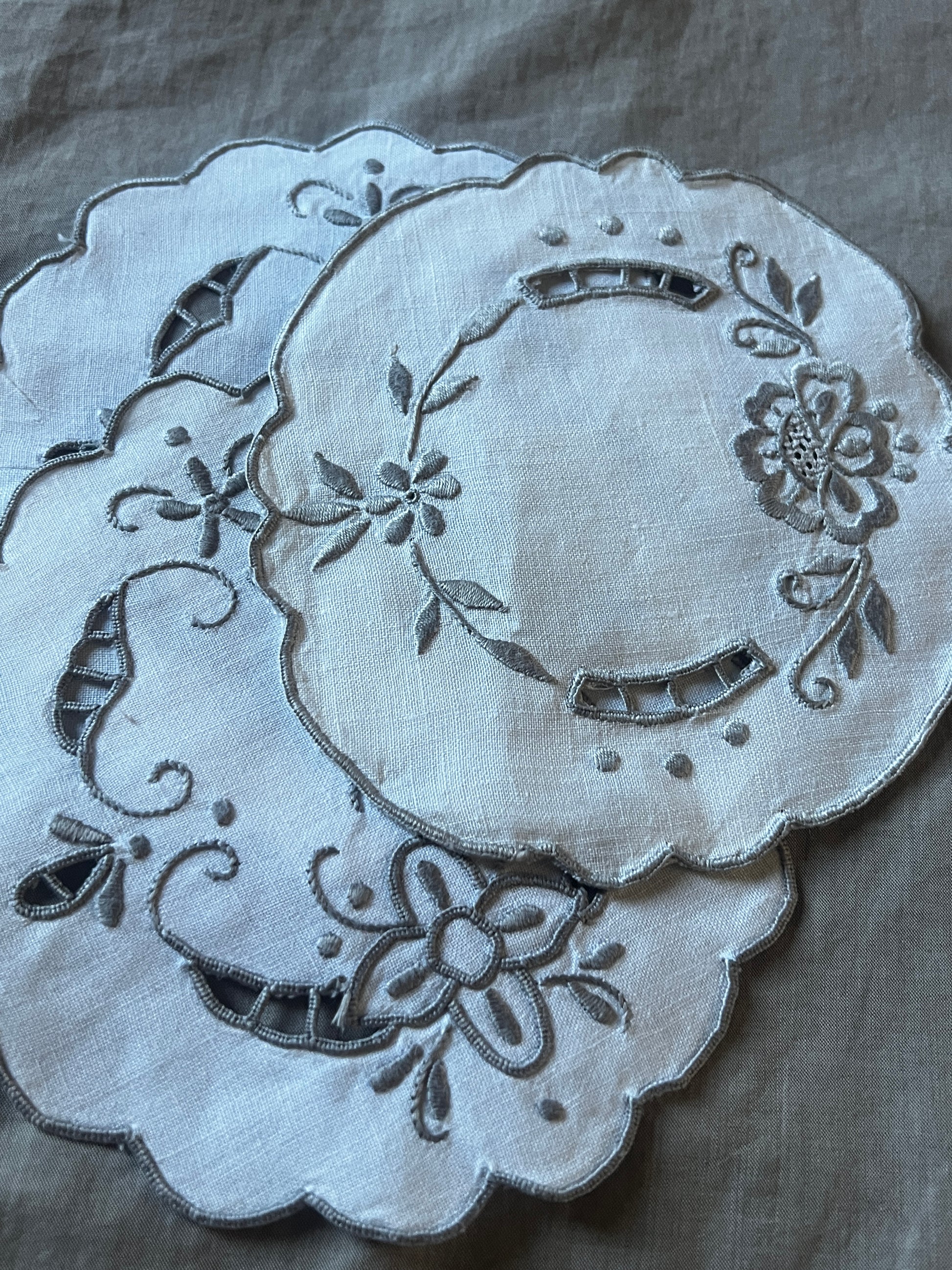 グレイベージュの糸で丁寧に刺繍が施されたミニドイリー3枚セットです