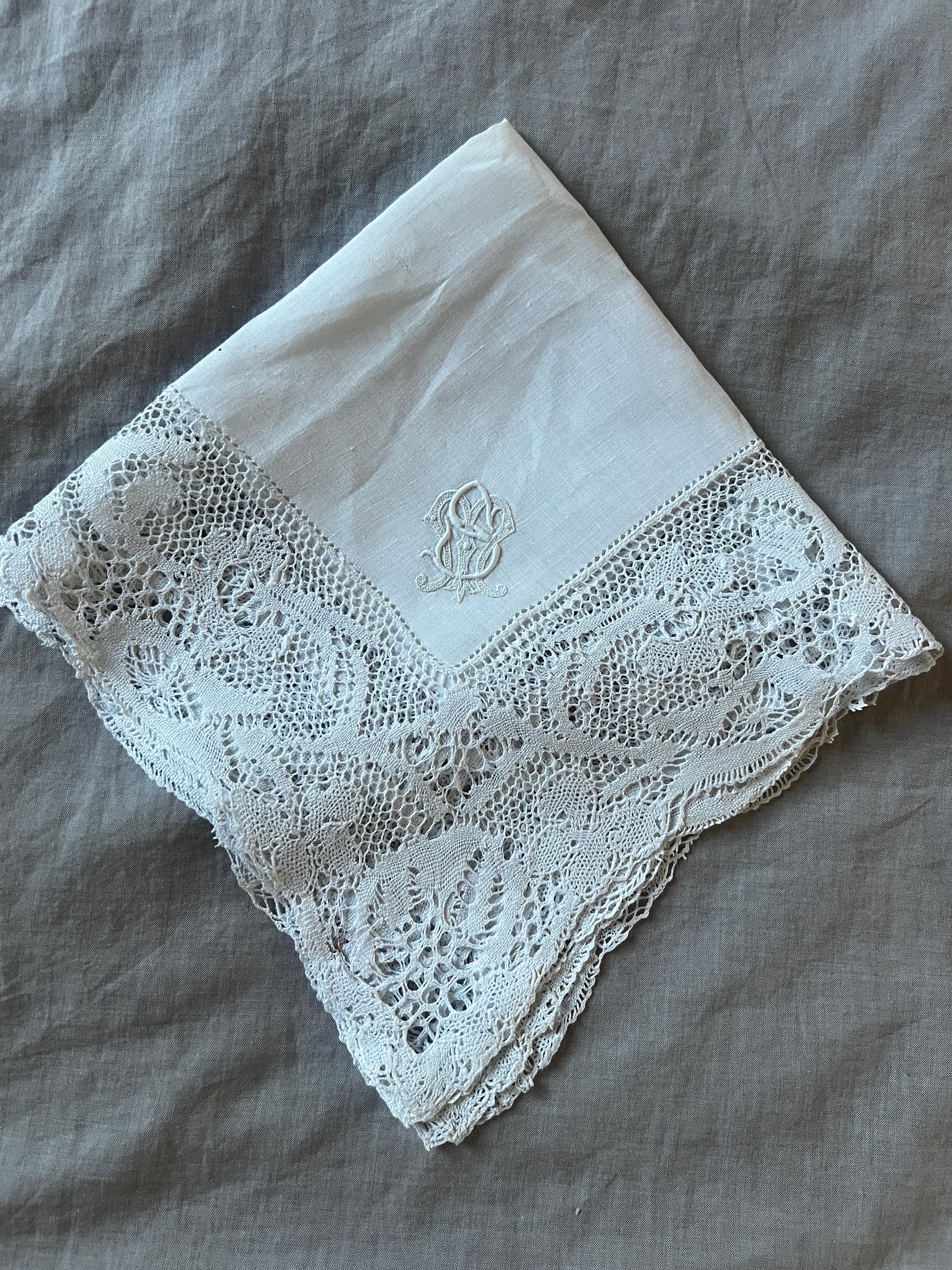 繊細なステッチで描かれたモノグラム刺繍が目を引く、美しいハンカチです