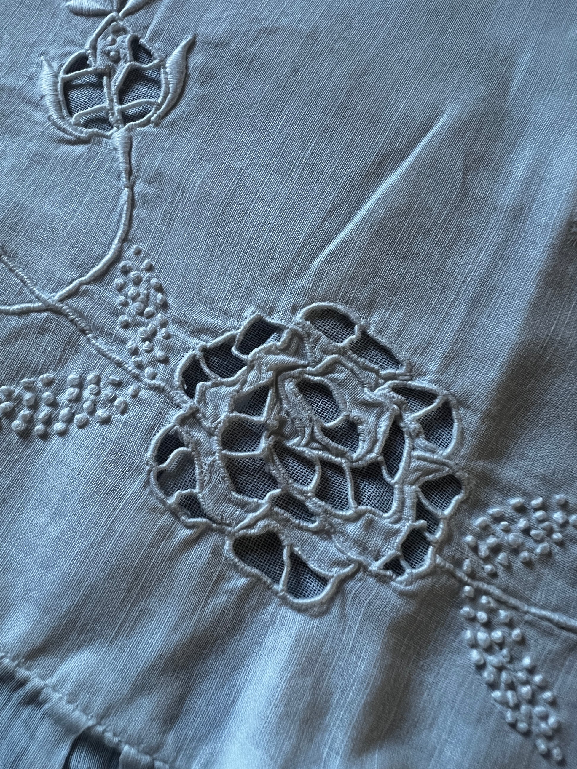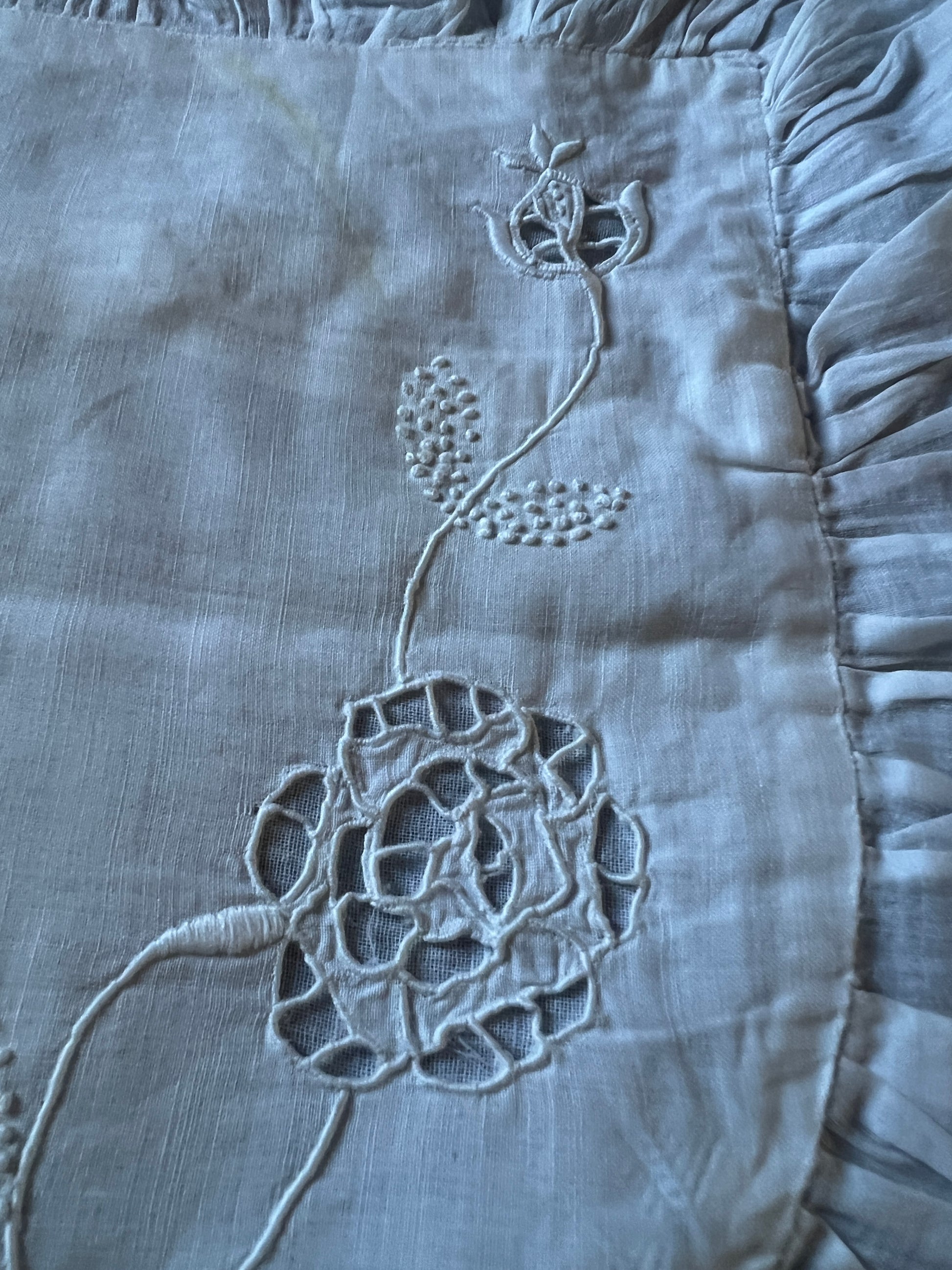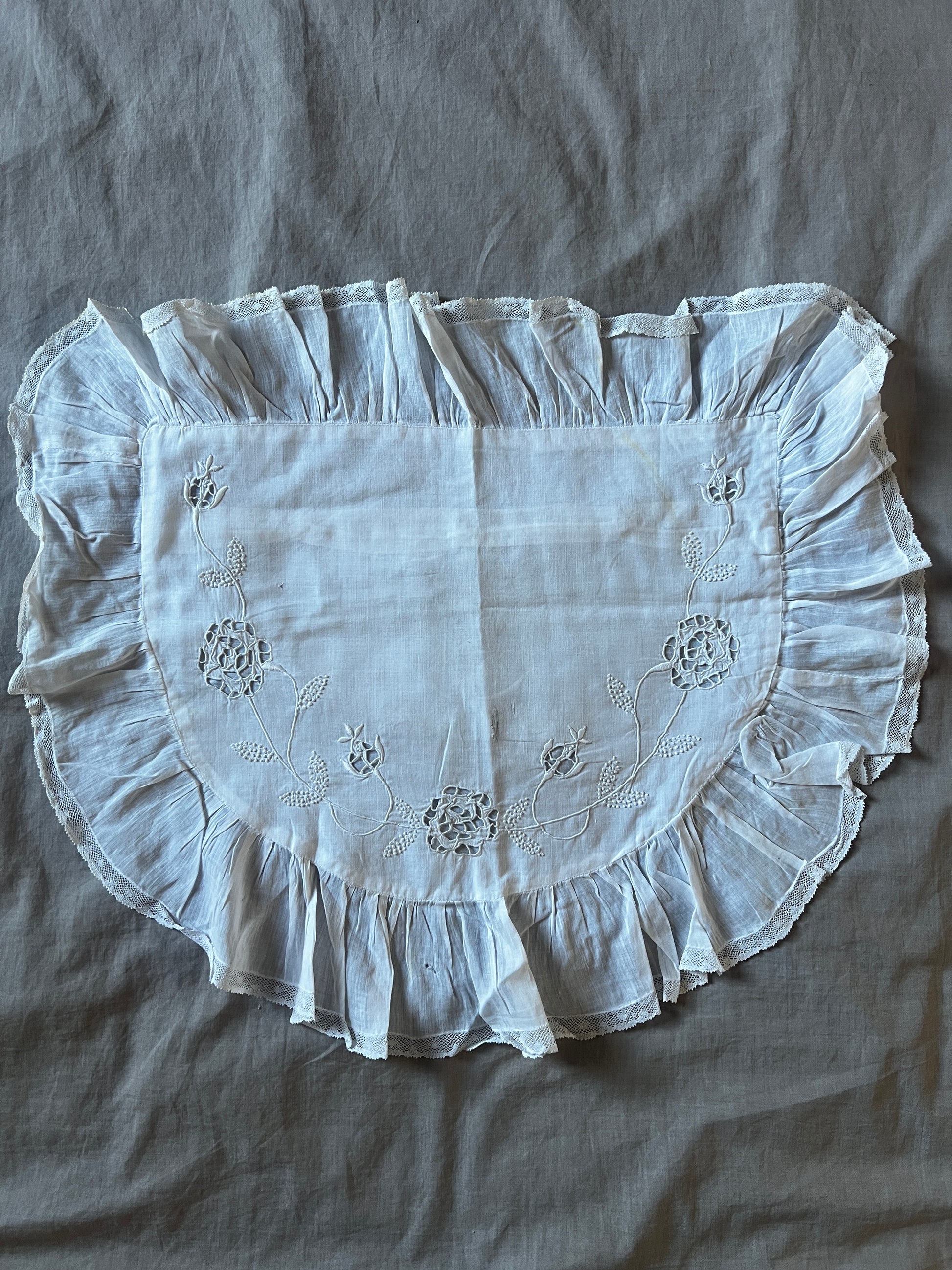 白刺繍の繊細なステッチが美しい、半月形のクッションカバーです