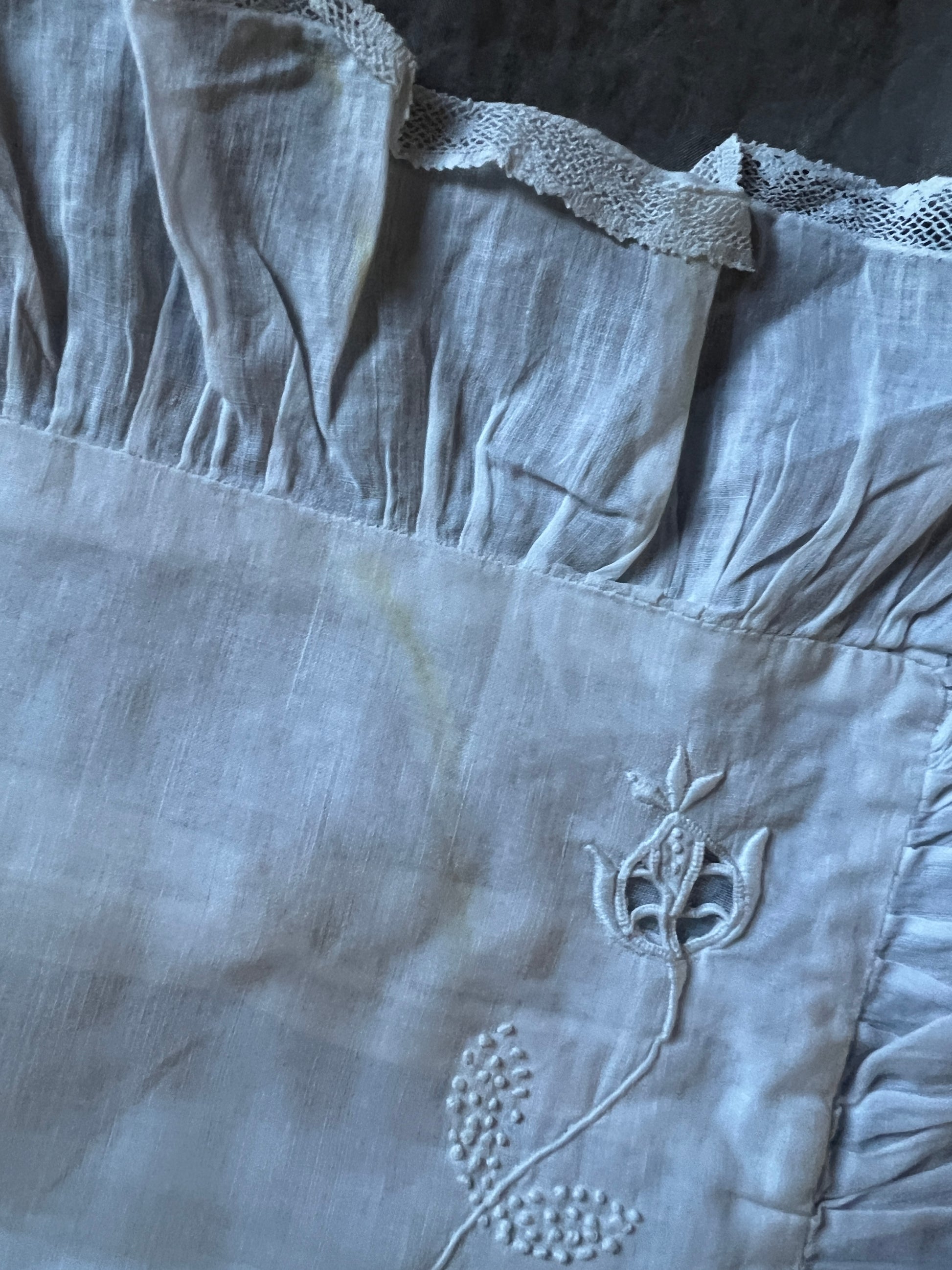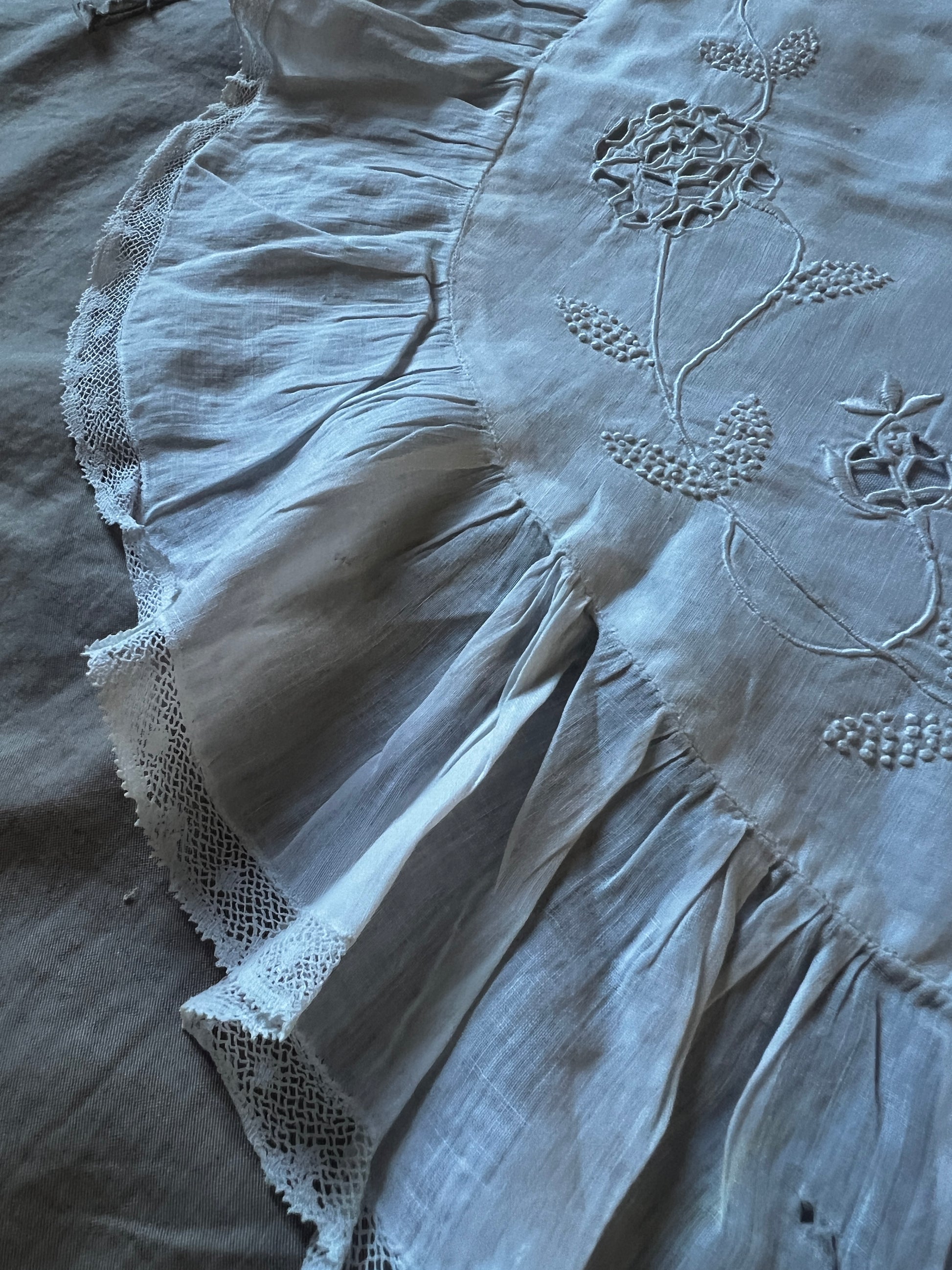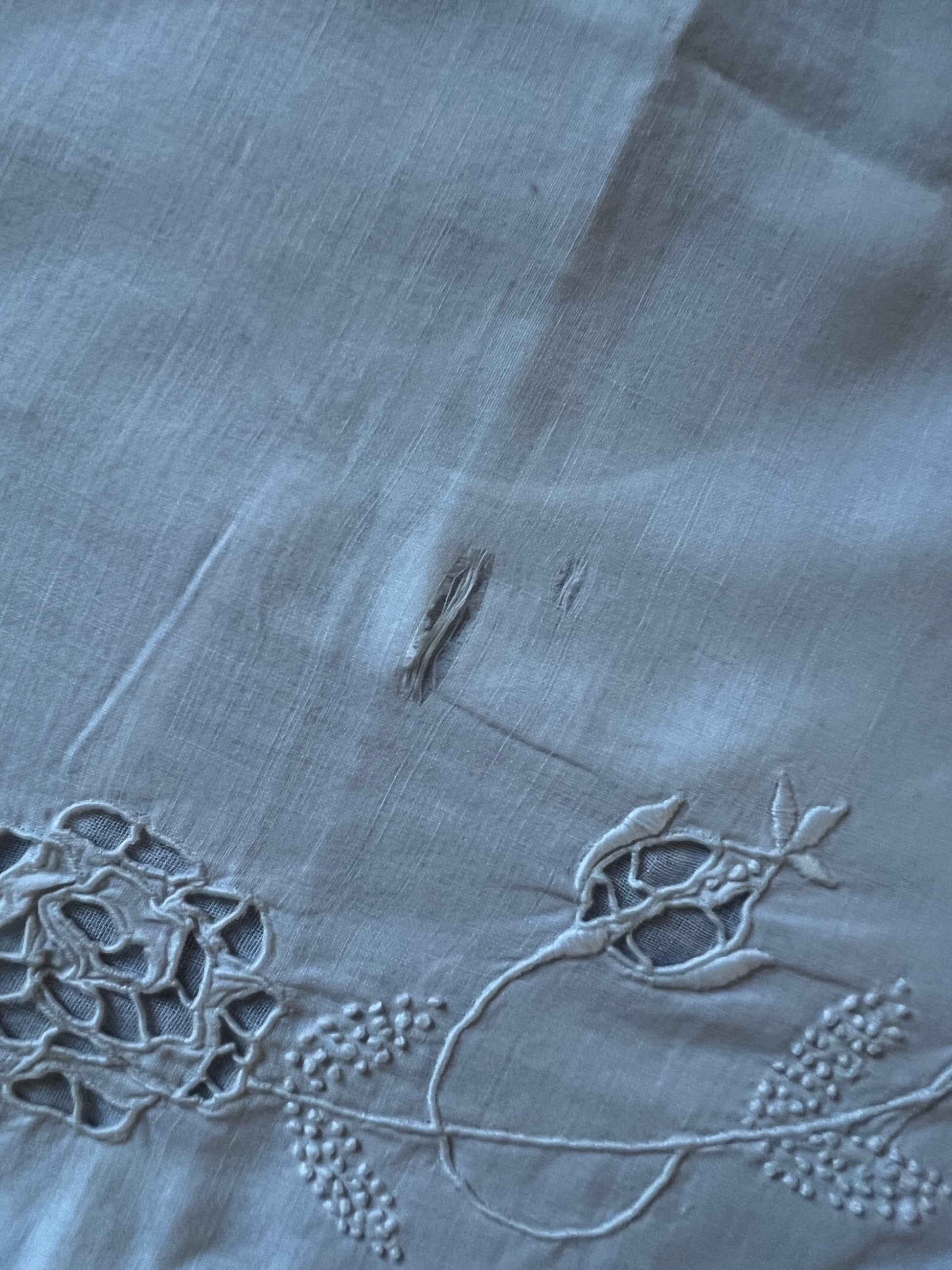 白刺繍の繊細なステッチが美しい、半月形のクッションカバーです