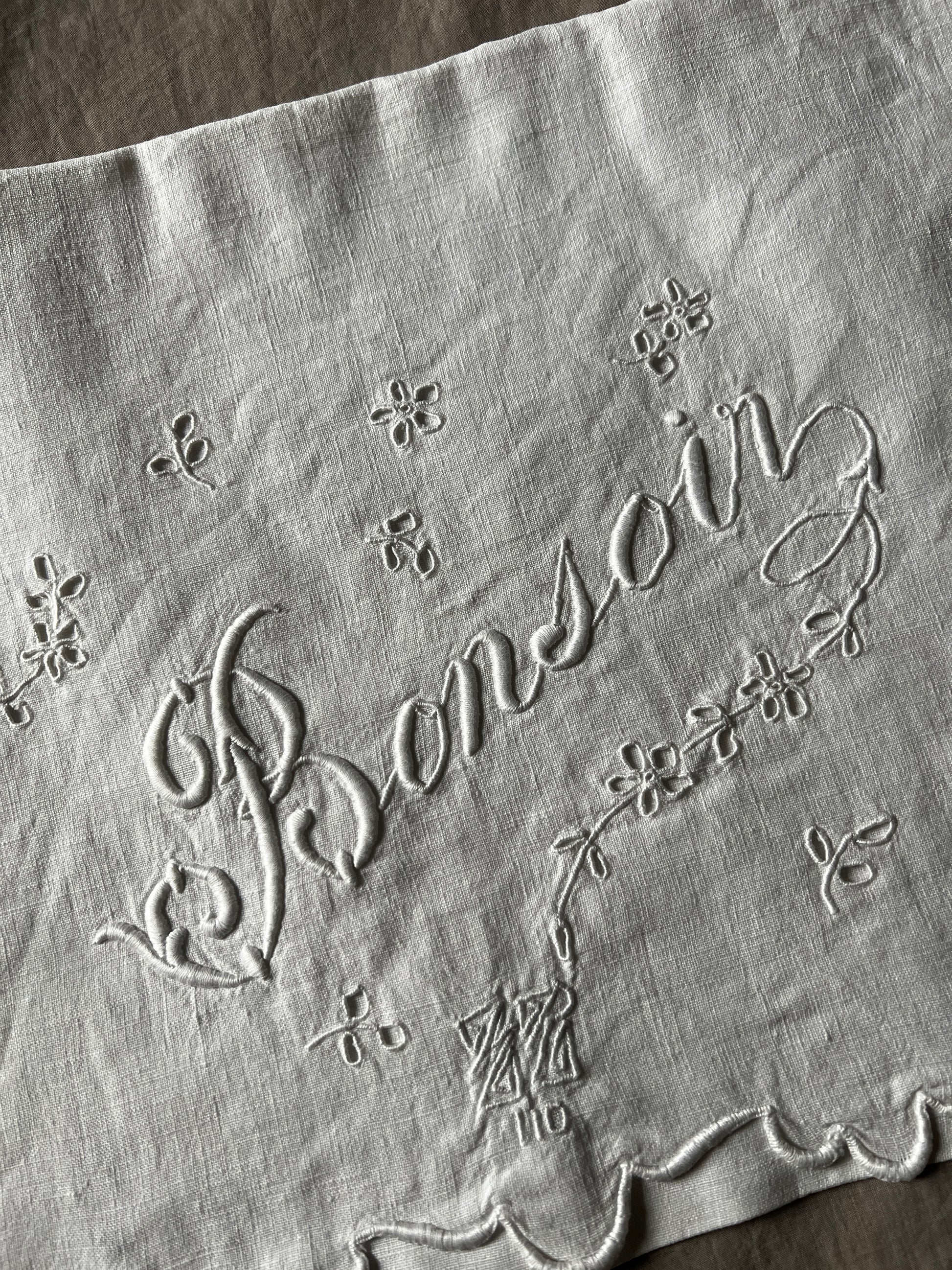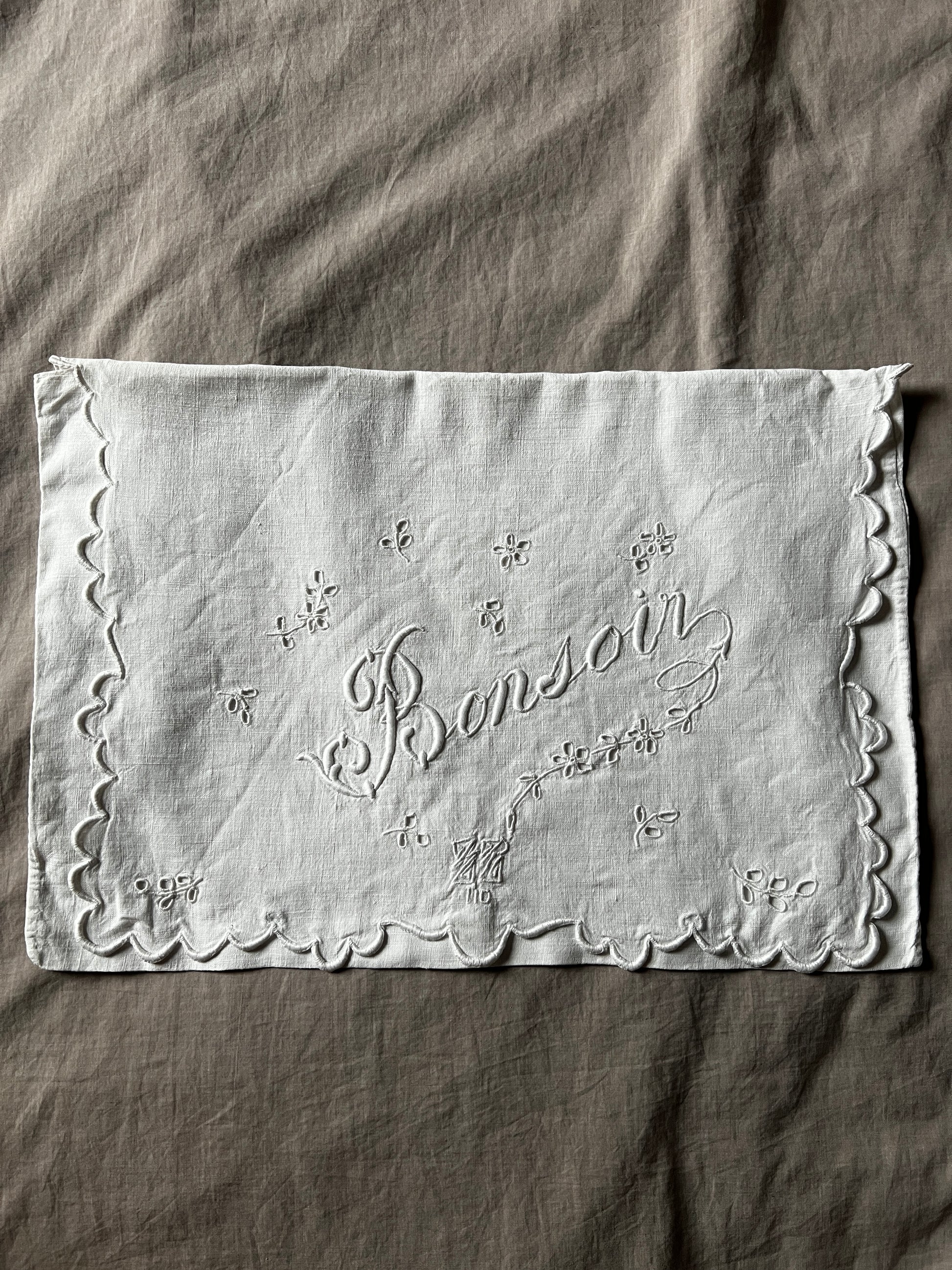 カットワーク刺繍で小花と「Bonsoir」の文字が描かれた、リネン製のランジェリーサックです