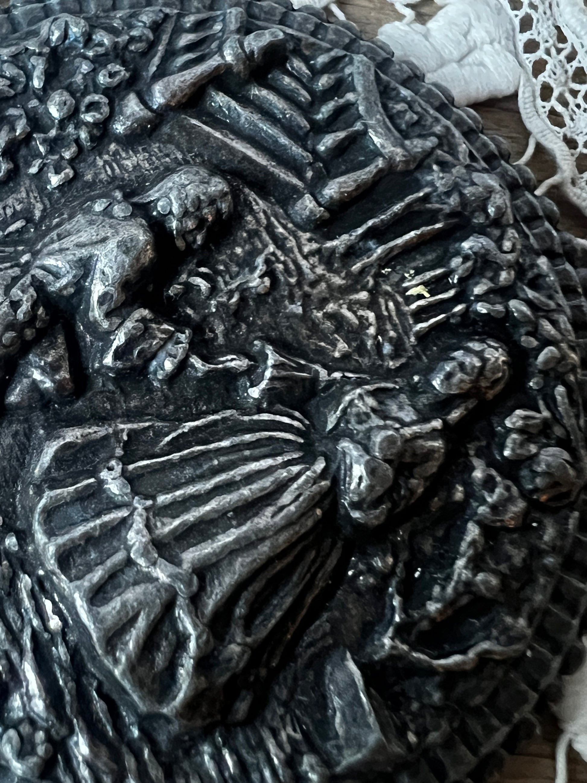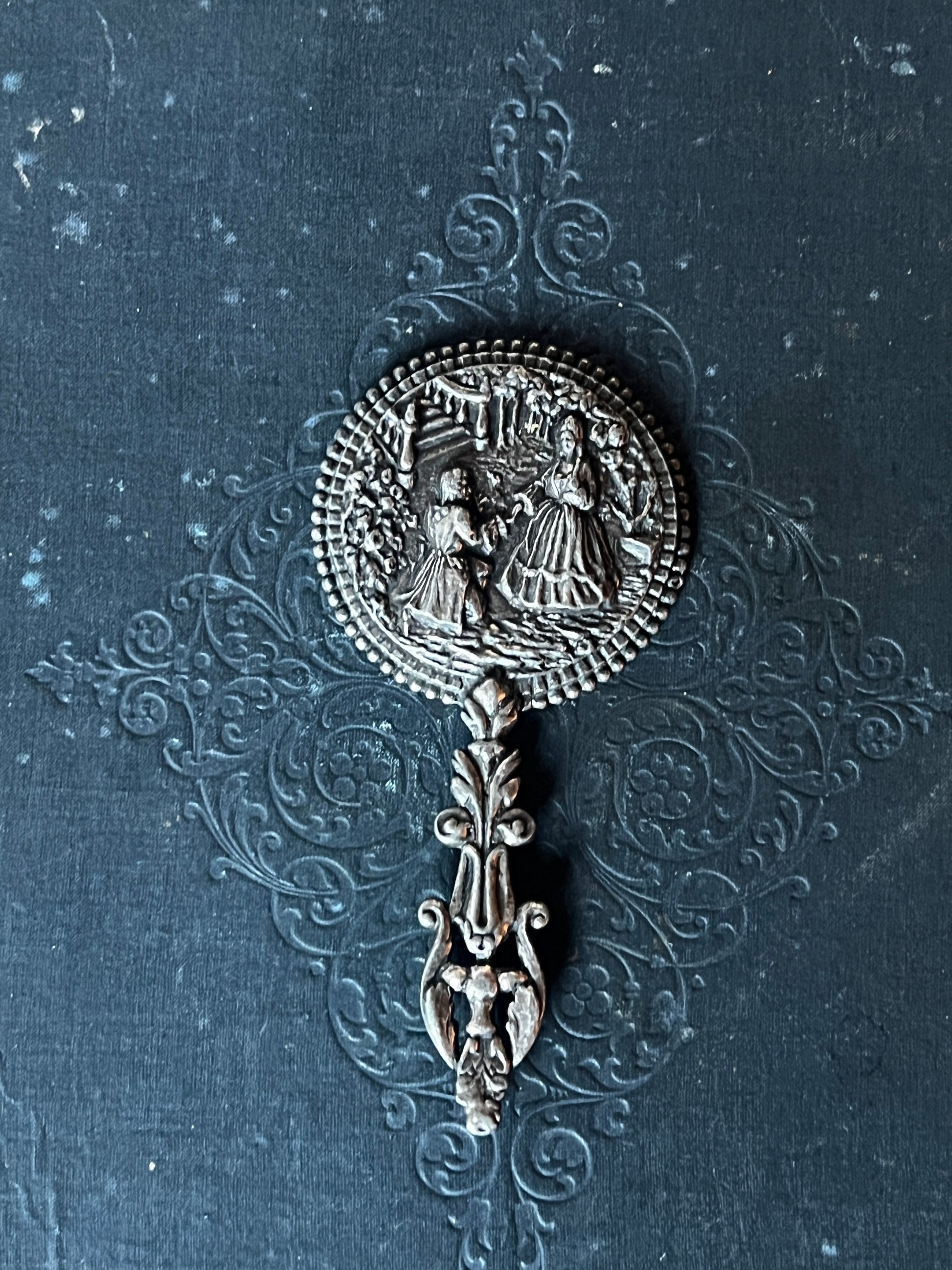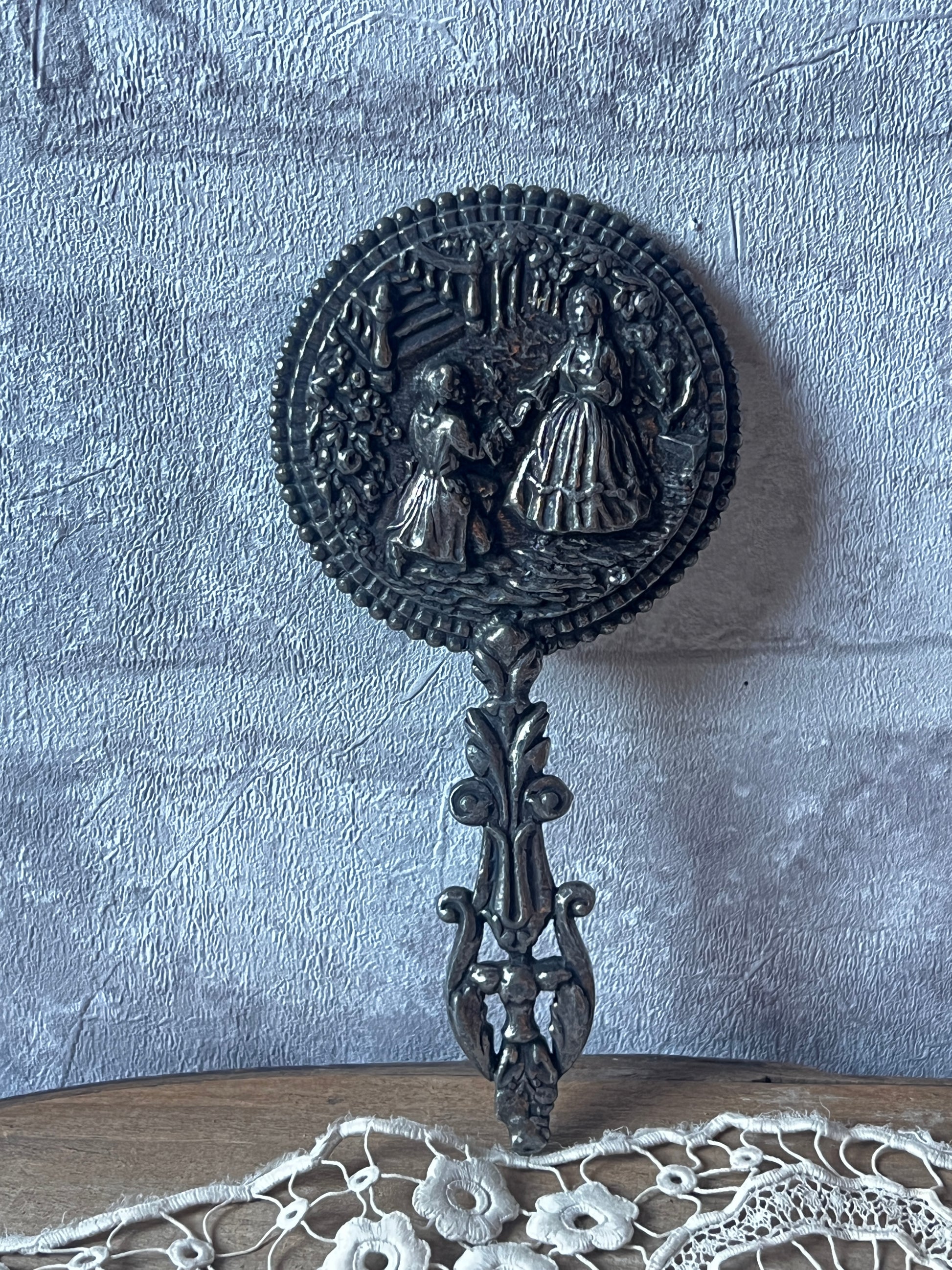 庭園で戯れる貴族たちの姿を描いた装飾が美しい、メタル製の小さな手鏡です