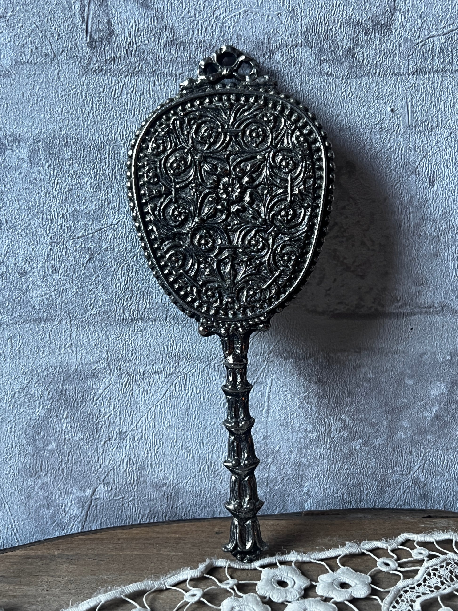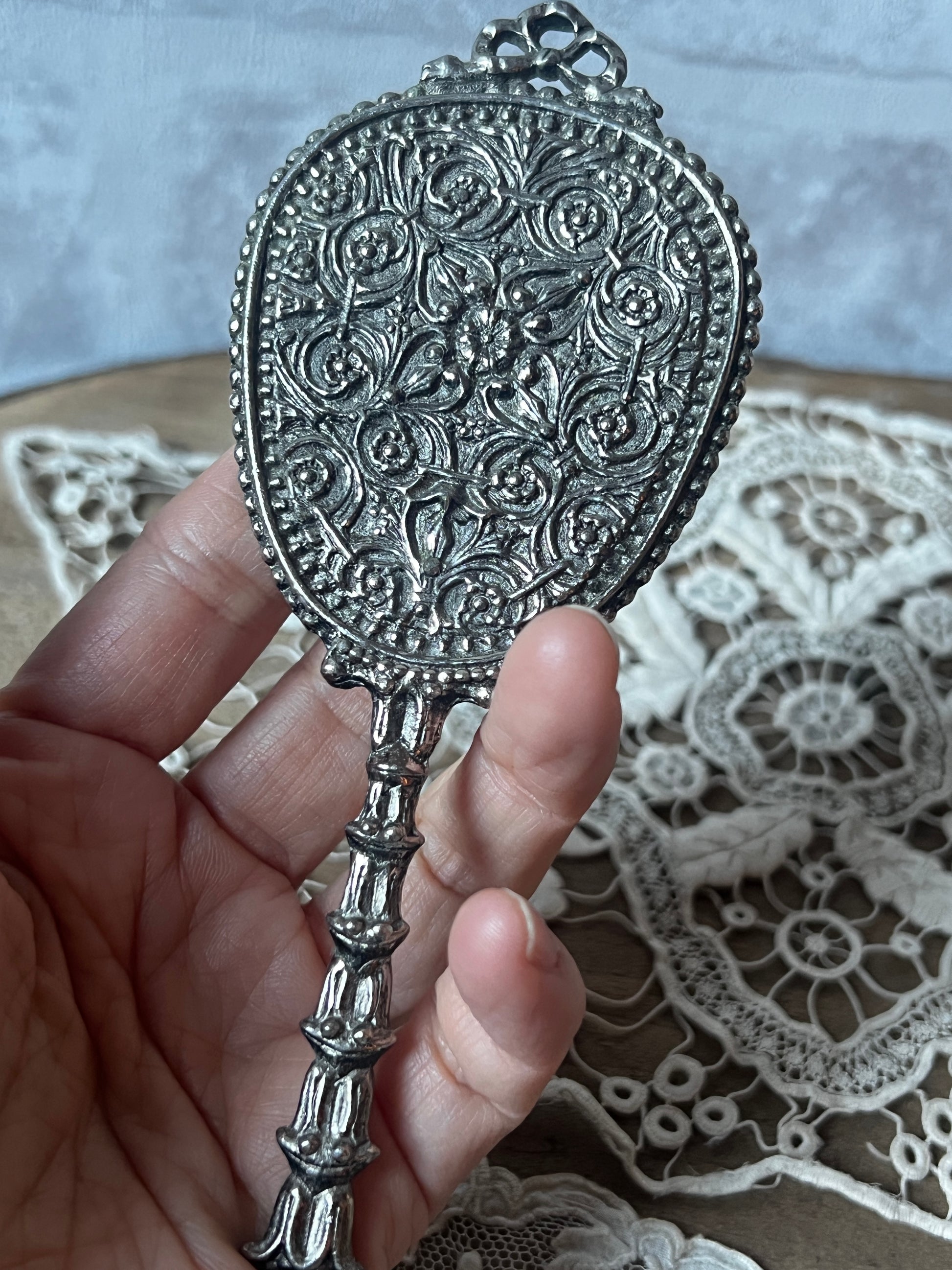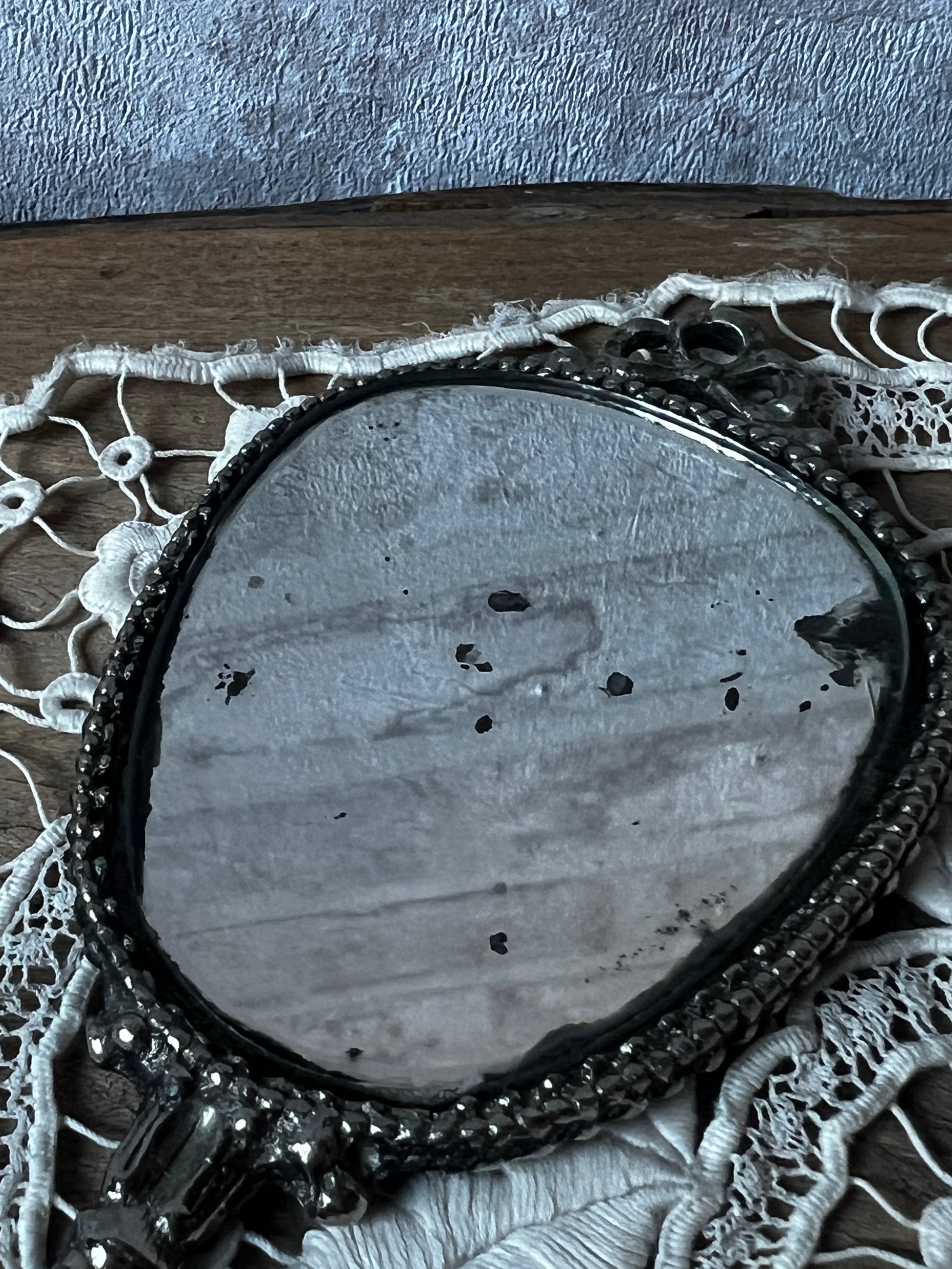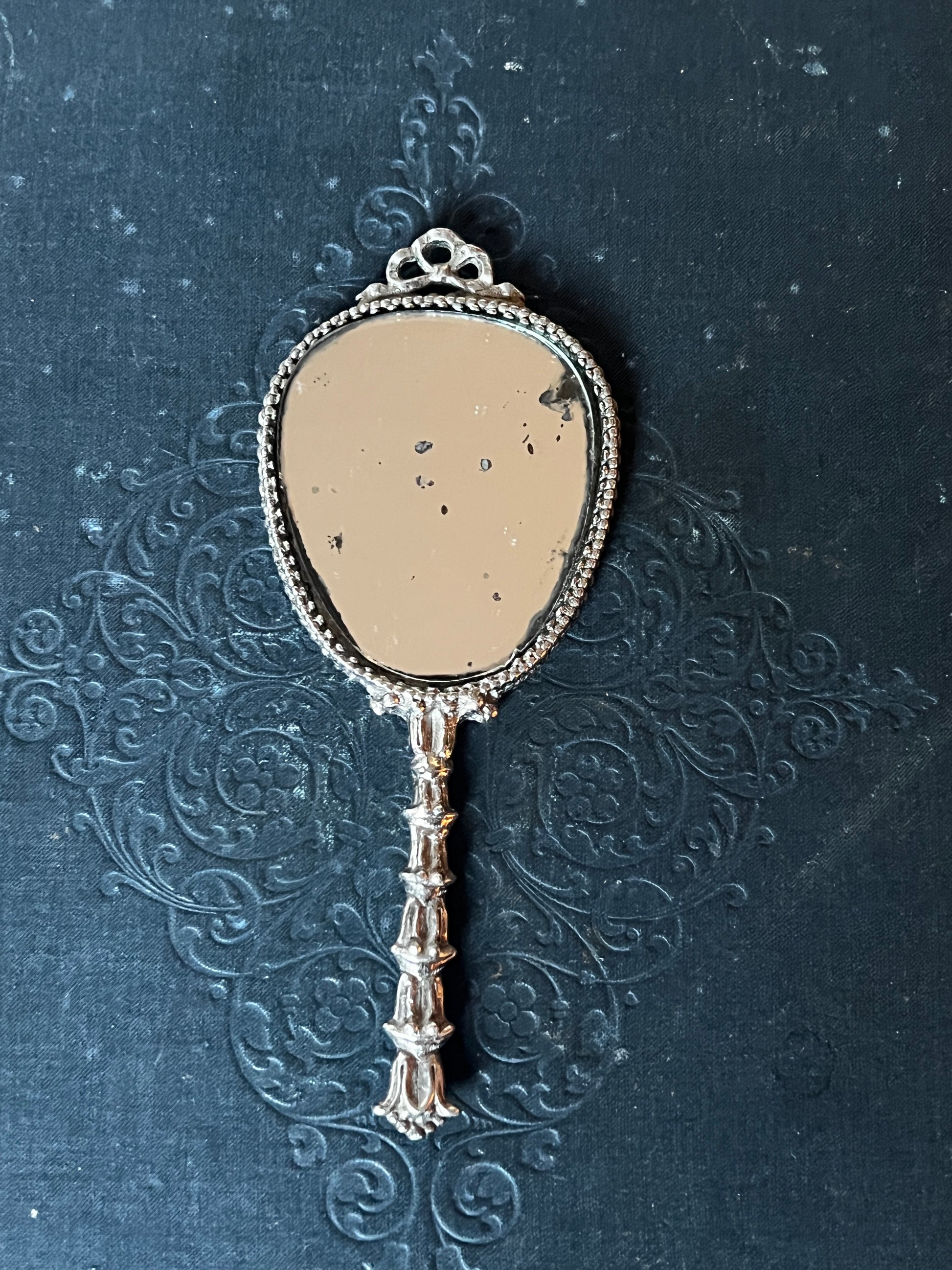 リボンモチーフと小薔薇の装飾が美しい小さな手鏡です