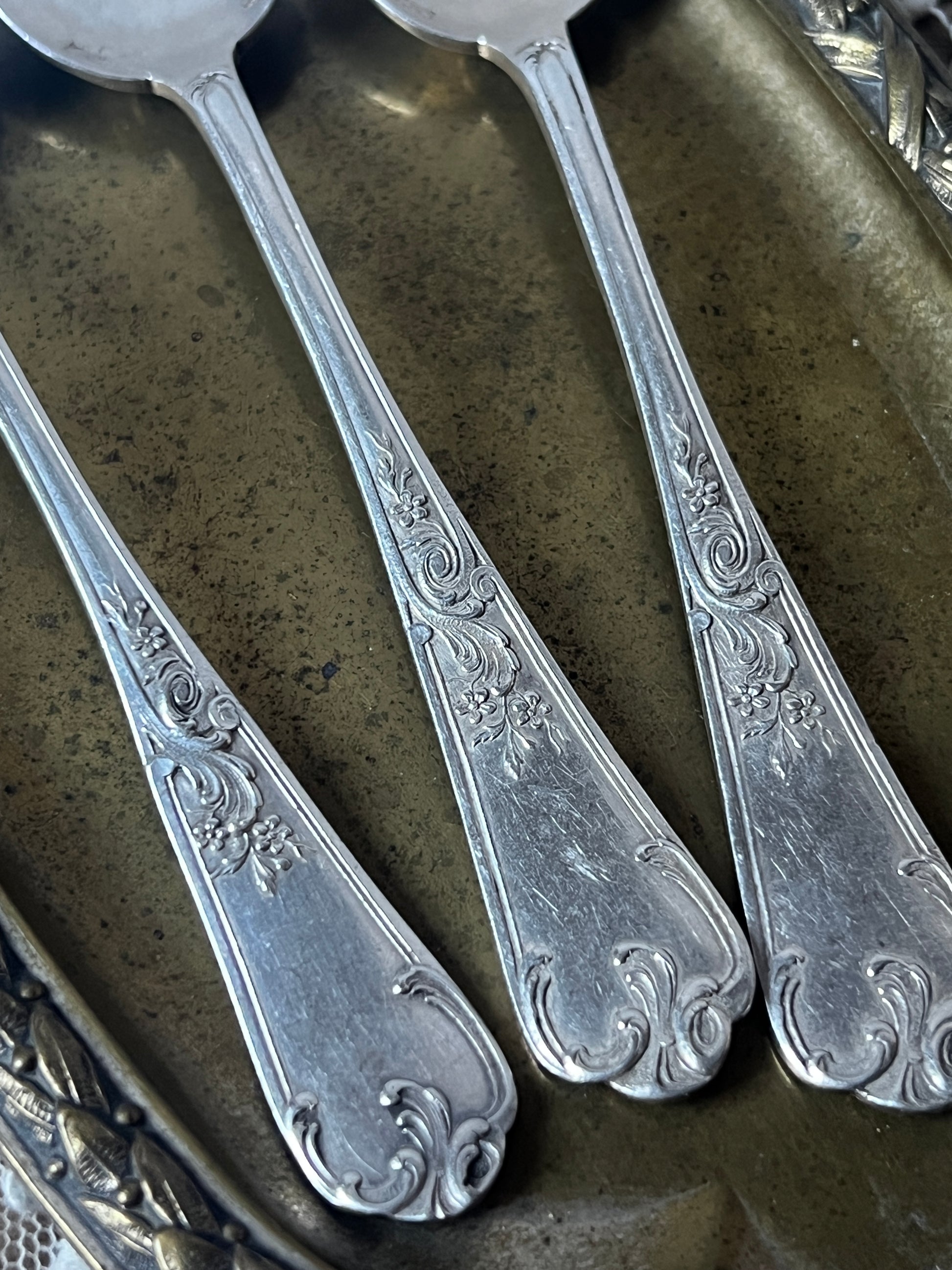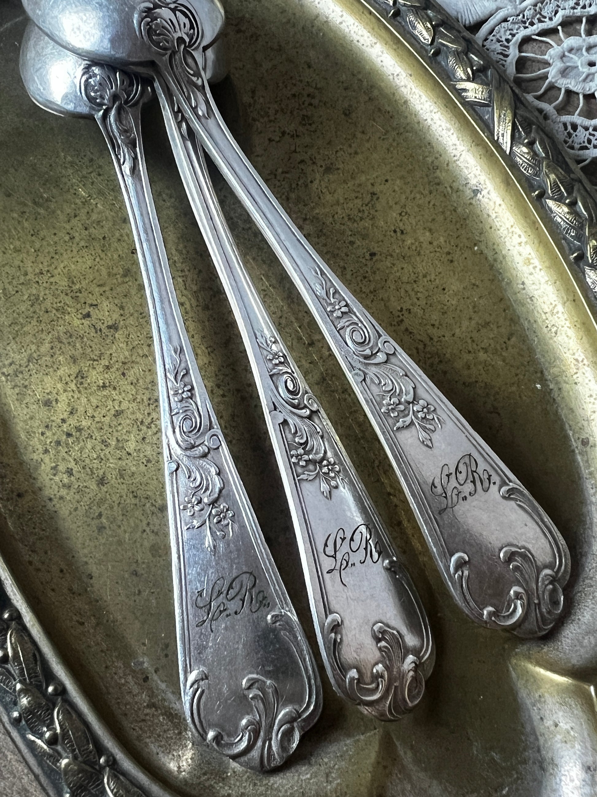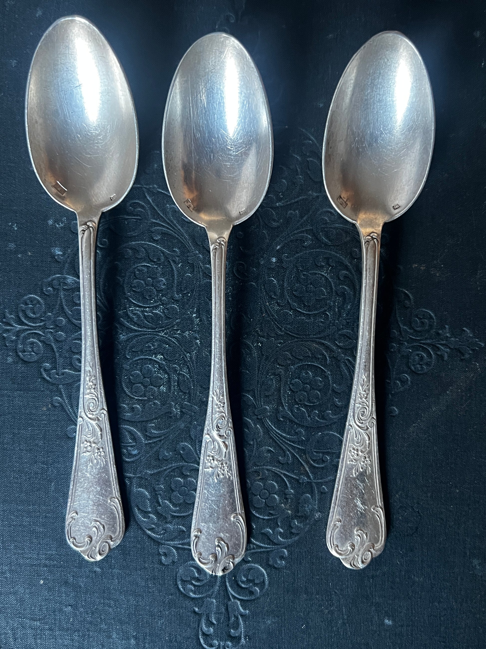 柄の部分のデザインが美しい銀メッキ製のカフェスプーン3本セットです