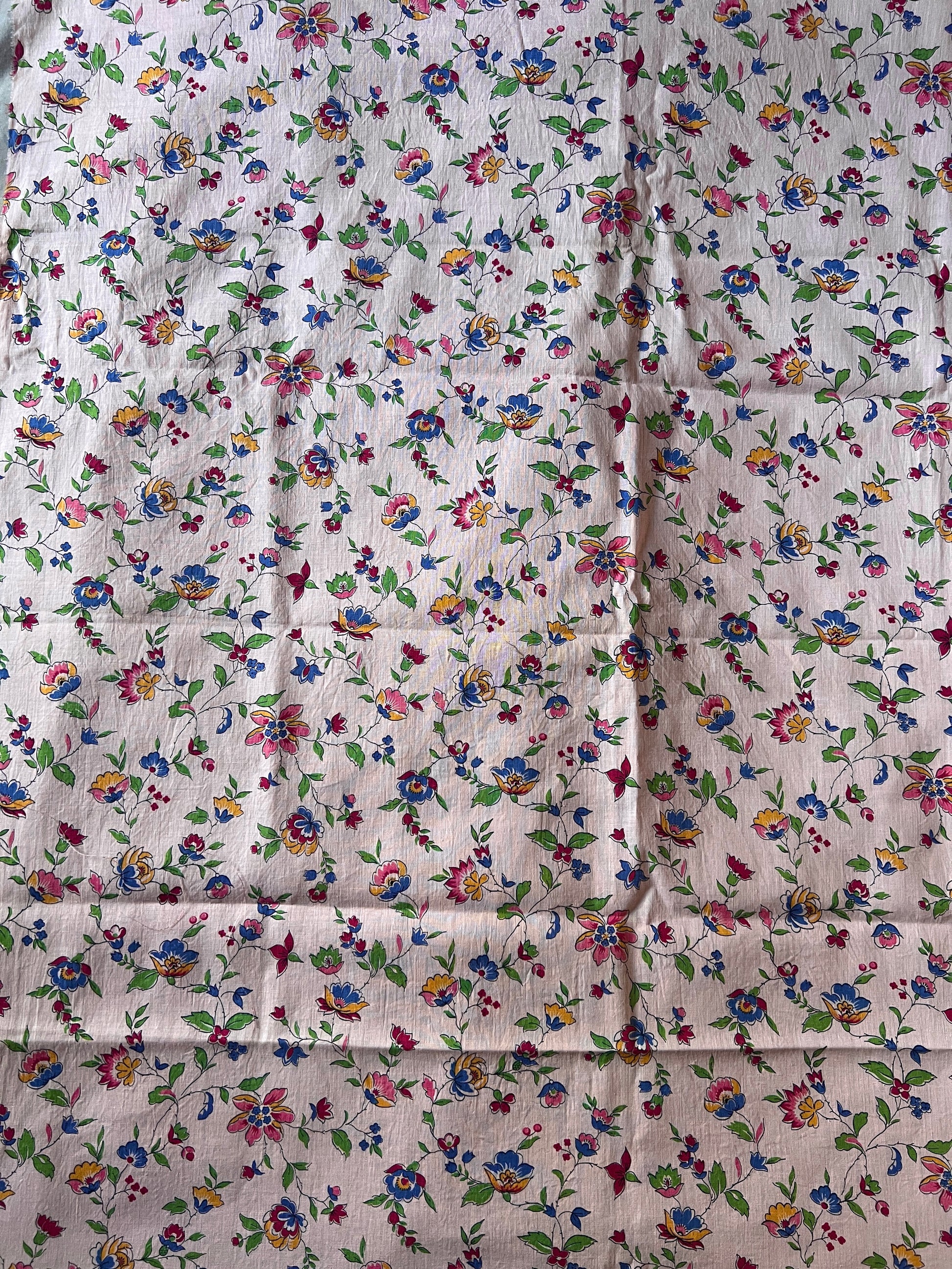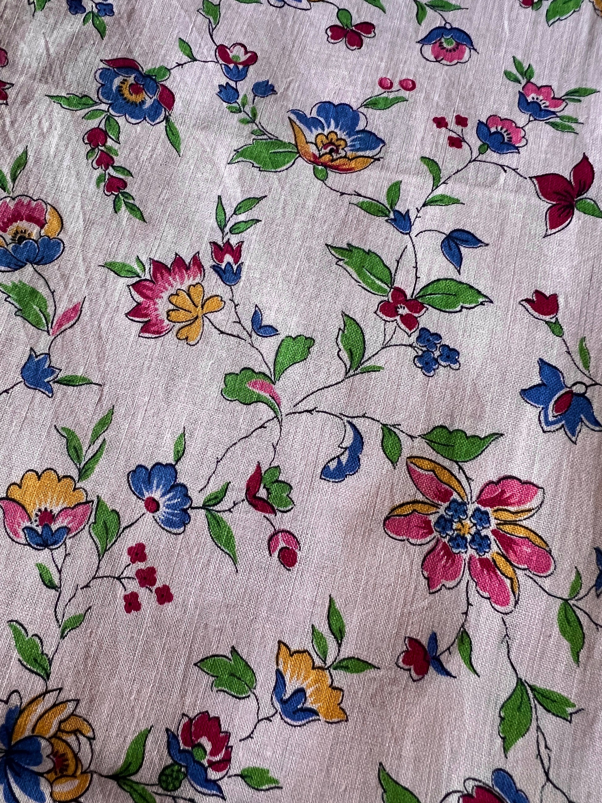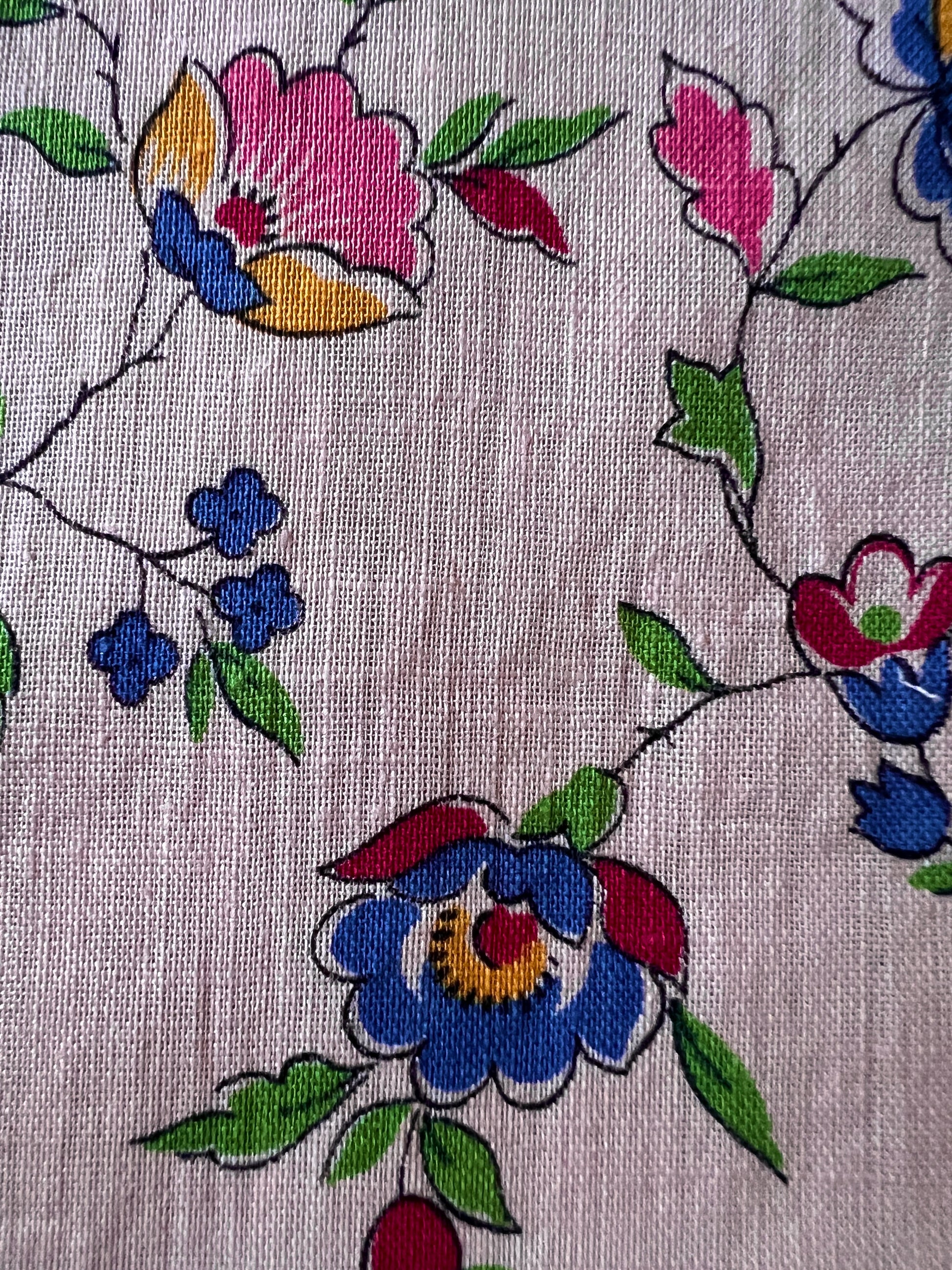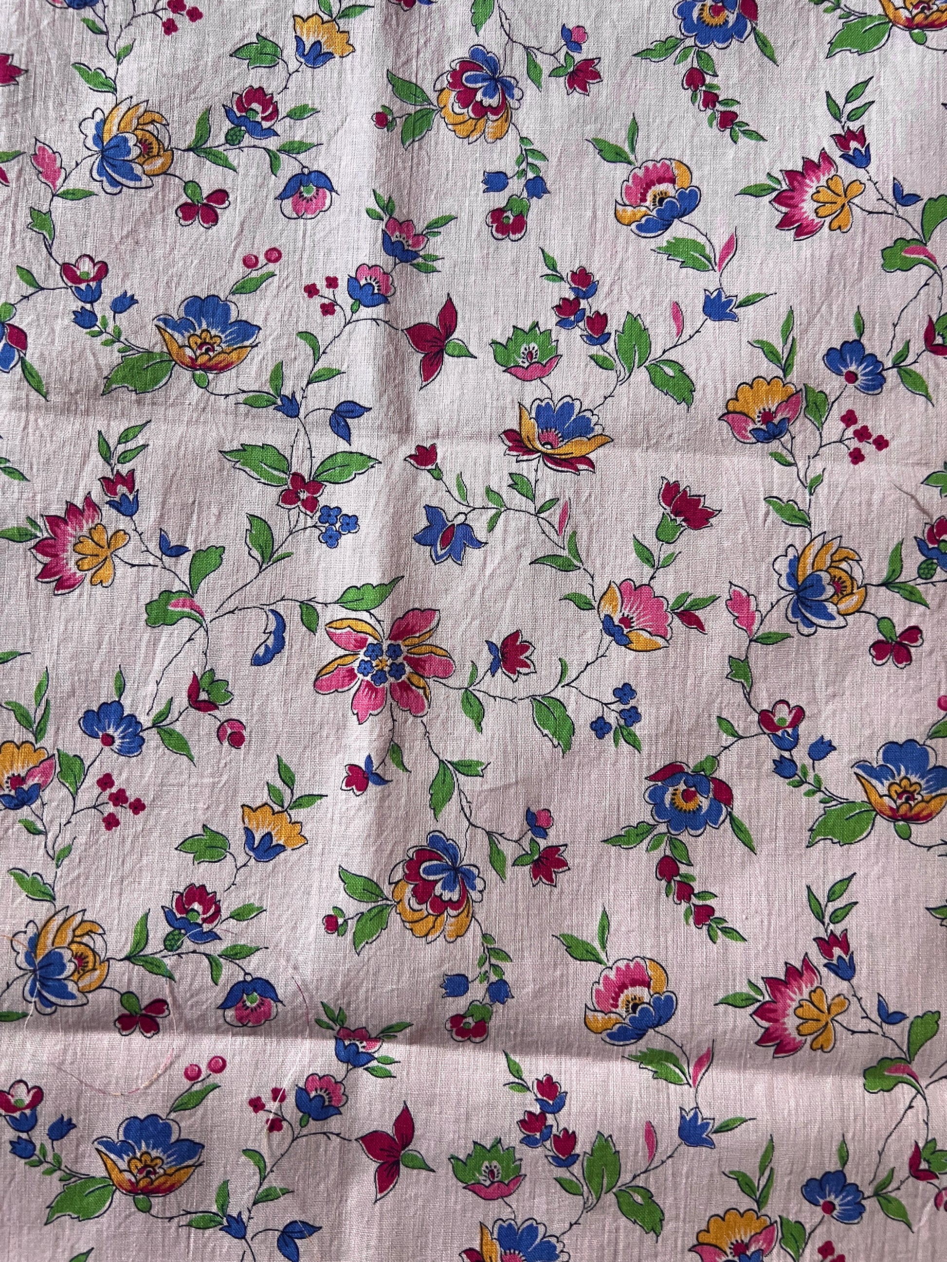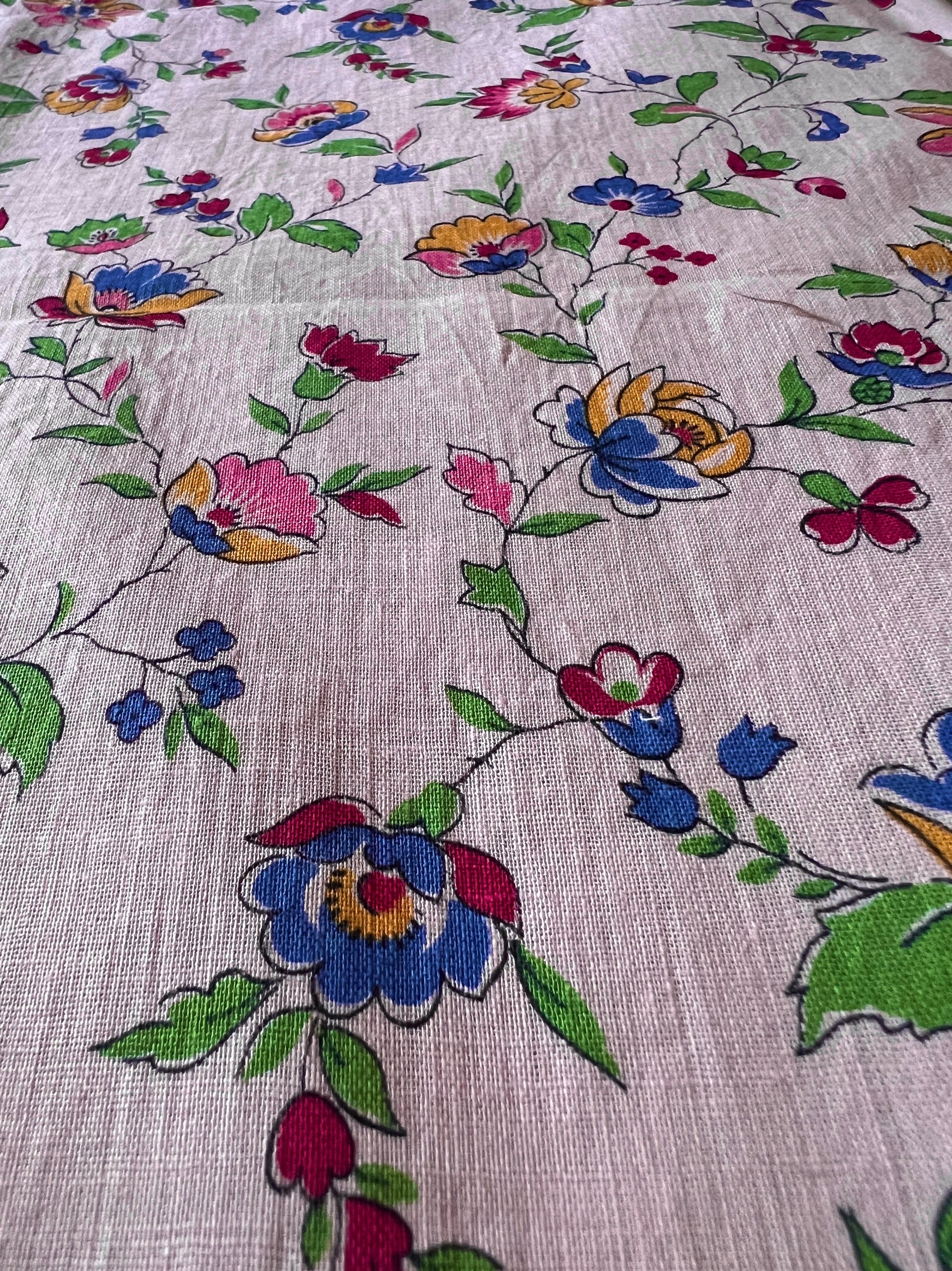 柔らかな桃色の布地に色鮮やかな花模様がプリントされたビンテージ布の2枚セットです