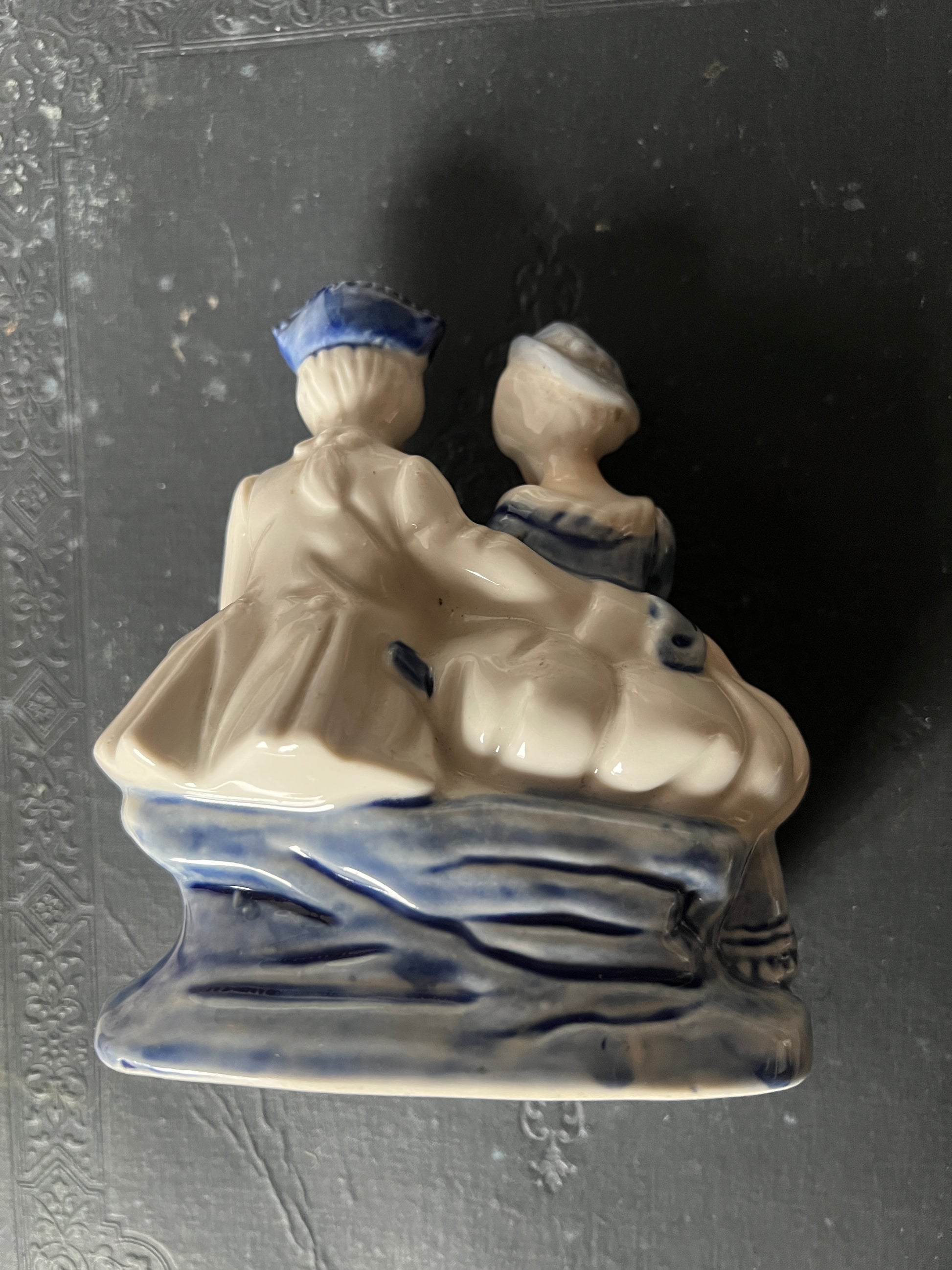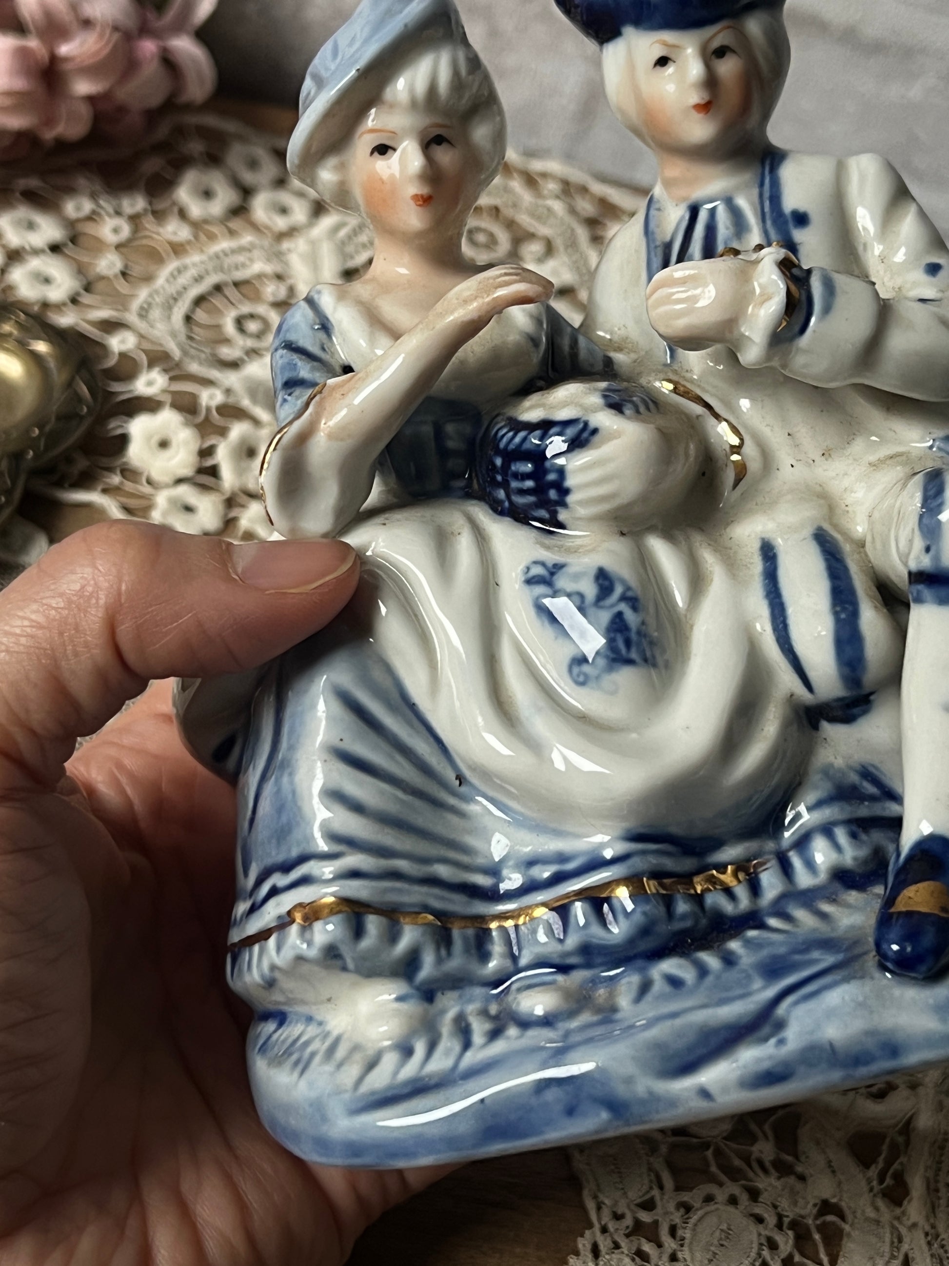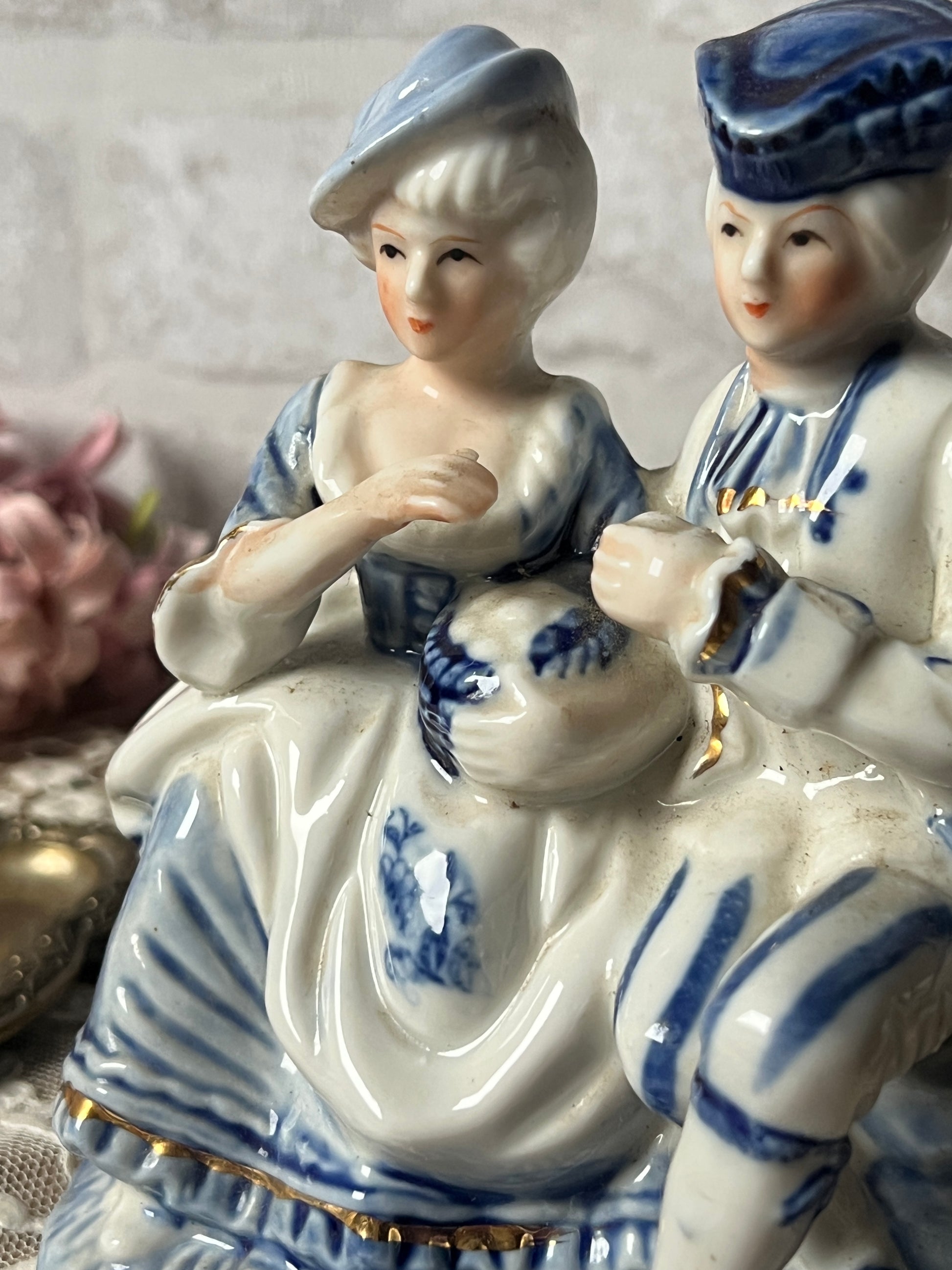 ヨーロッパ貴族のような衣装を纏った男女が並んで座る姿を象った磁器製フィギュリンです