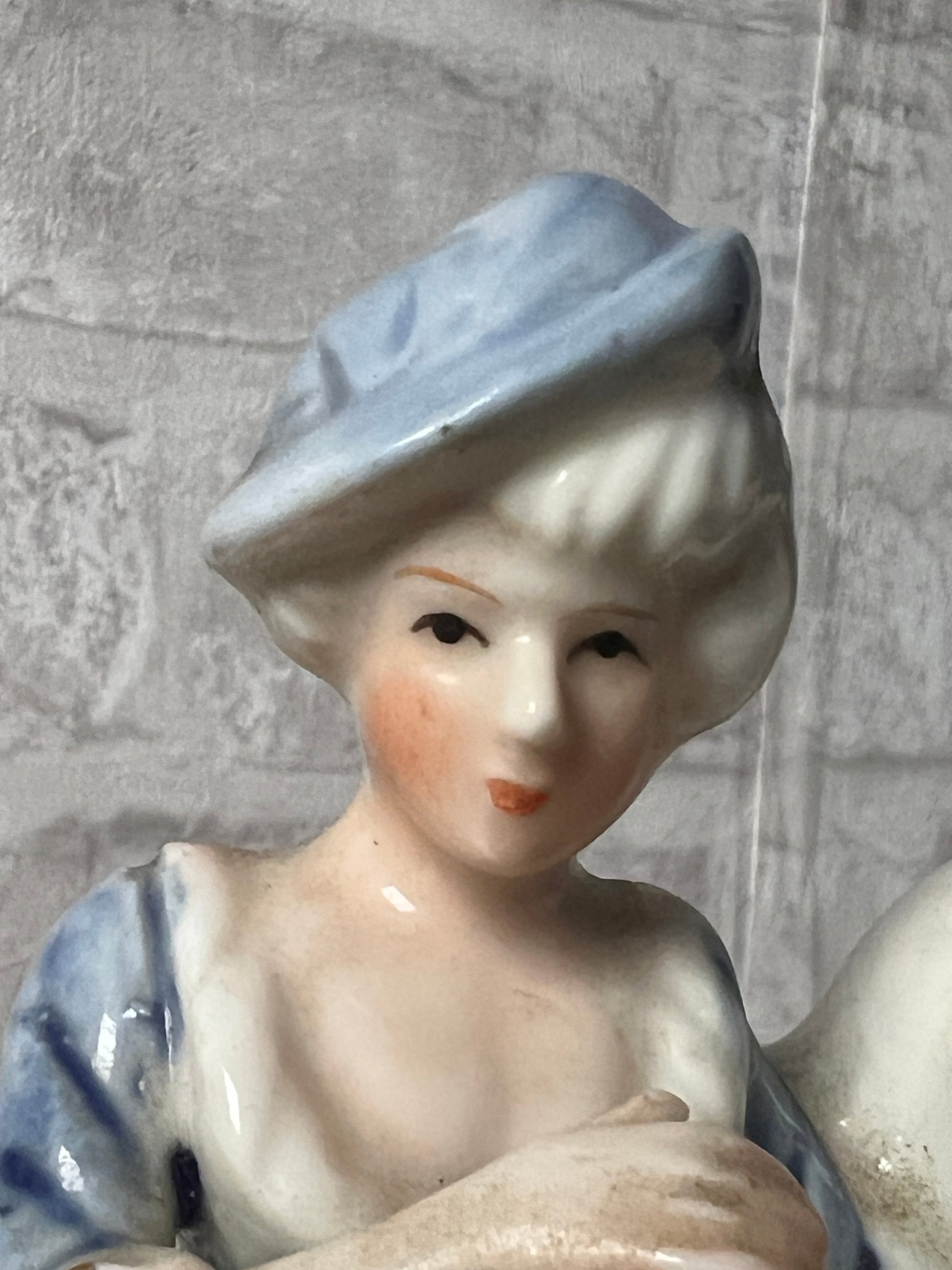 白磁に青色の彩色と、衣装のディテールを際立たせる金彩がポイントで施されています