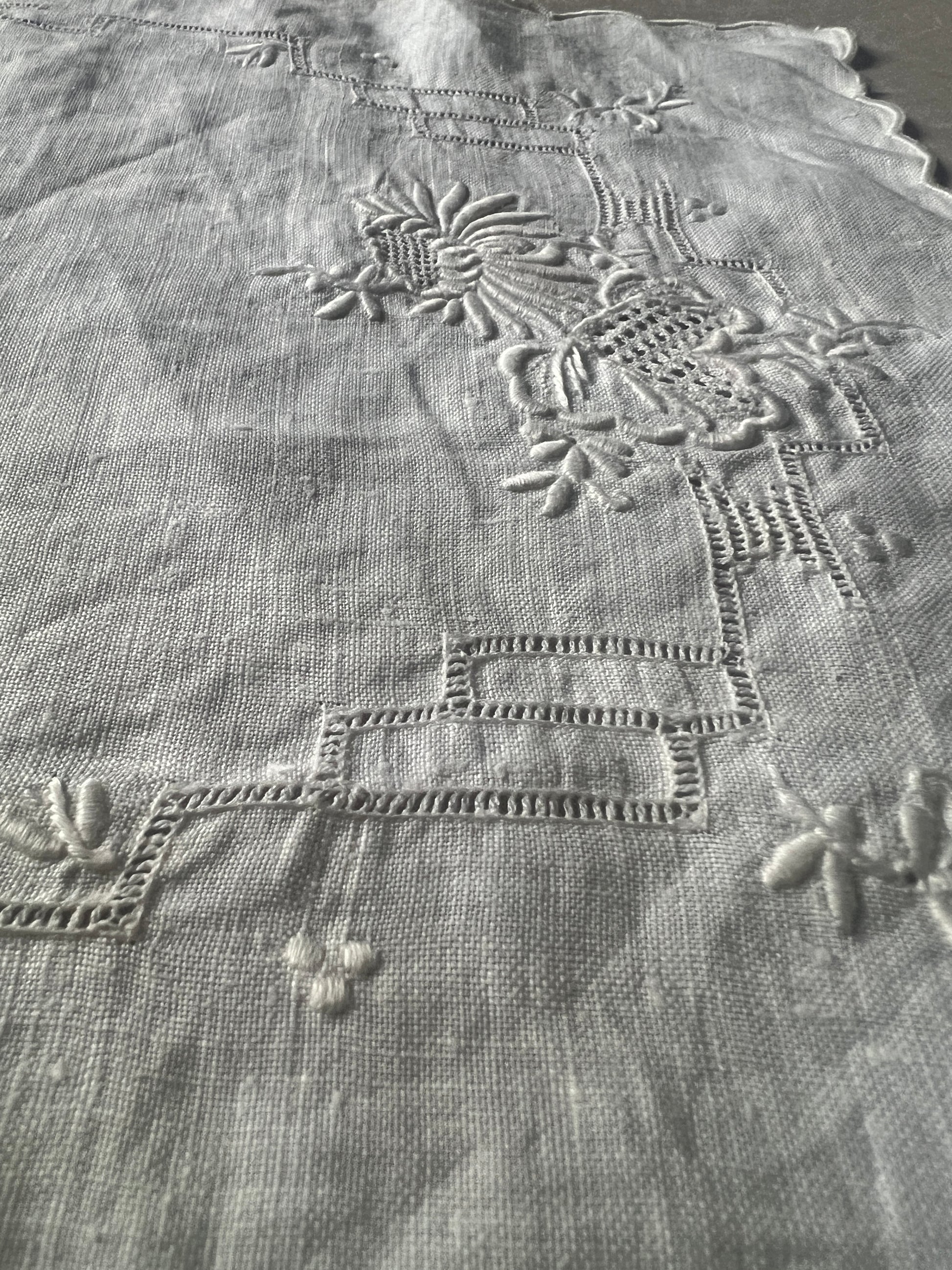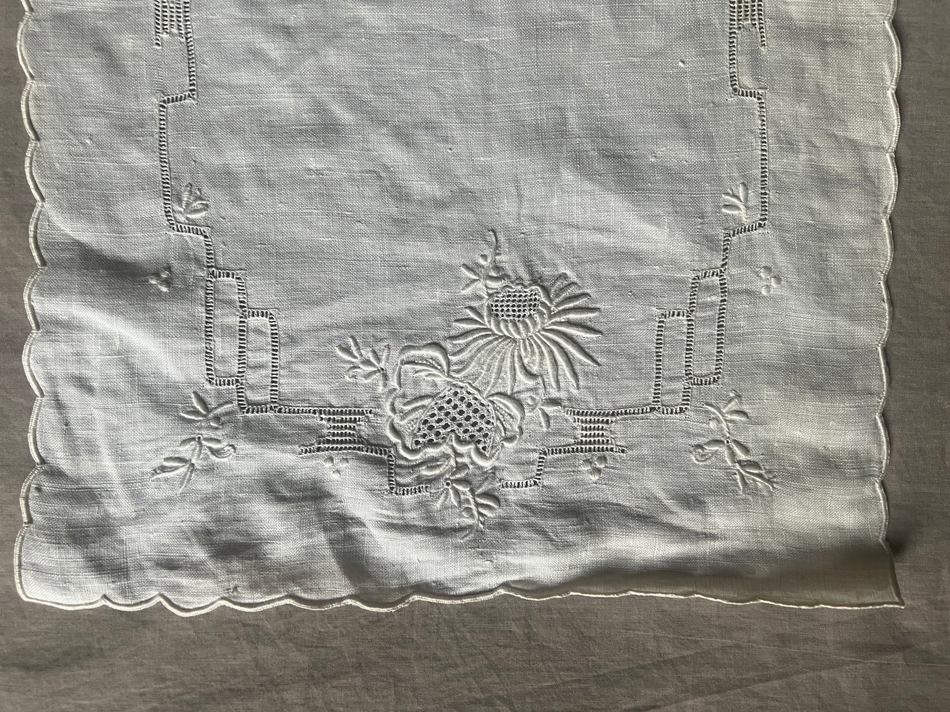 清涼感のある白糸で施された緻密な花々の刺繍と、透かし彫りのようなドロンワーク(引き解き解し)が美しく調和し、食卓やチェストの上を優雅に彩ります