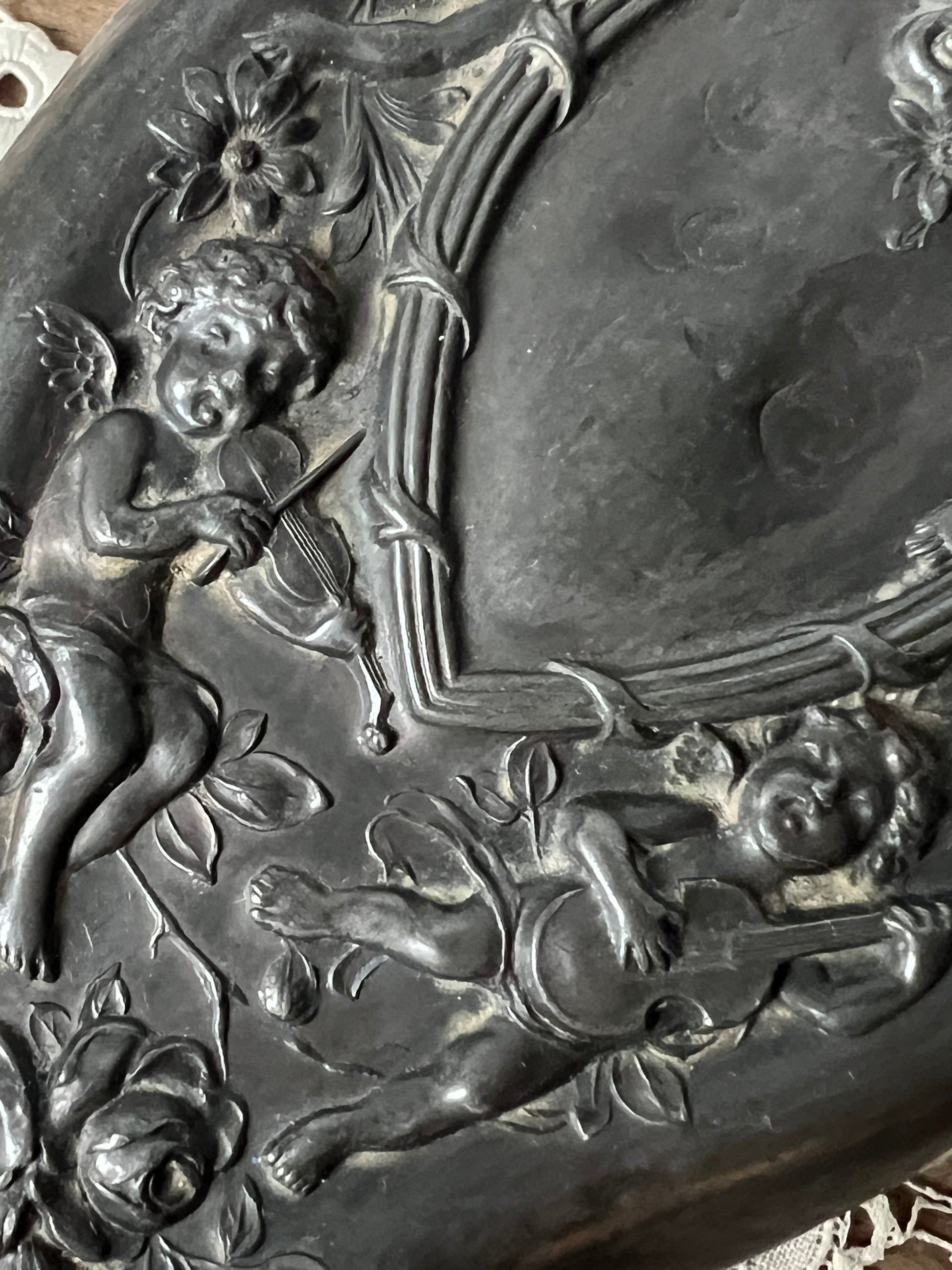メタル製本体の背面には、楽器を奏でる愛らしい天使たちと薔薇の意匠が立体的に描かれています