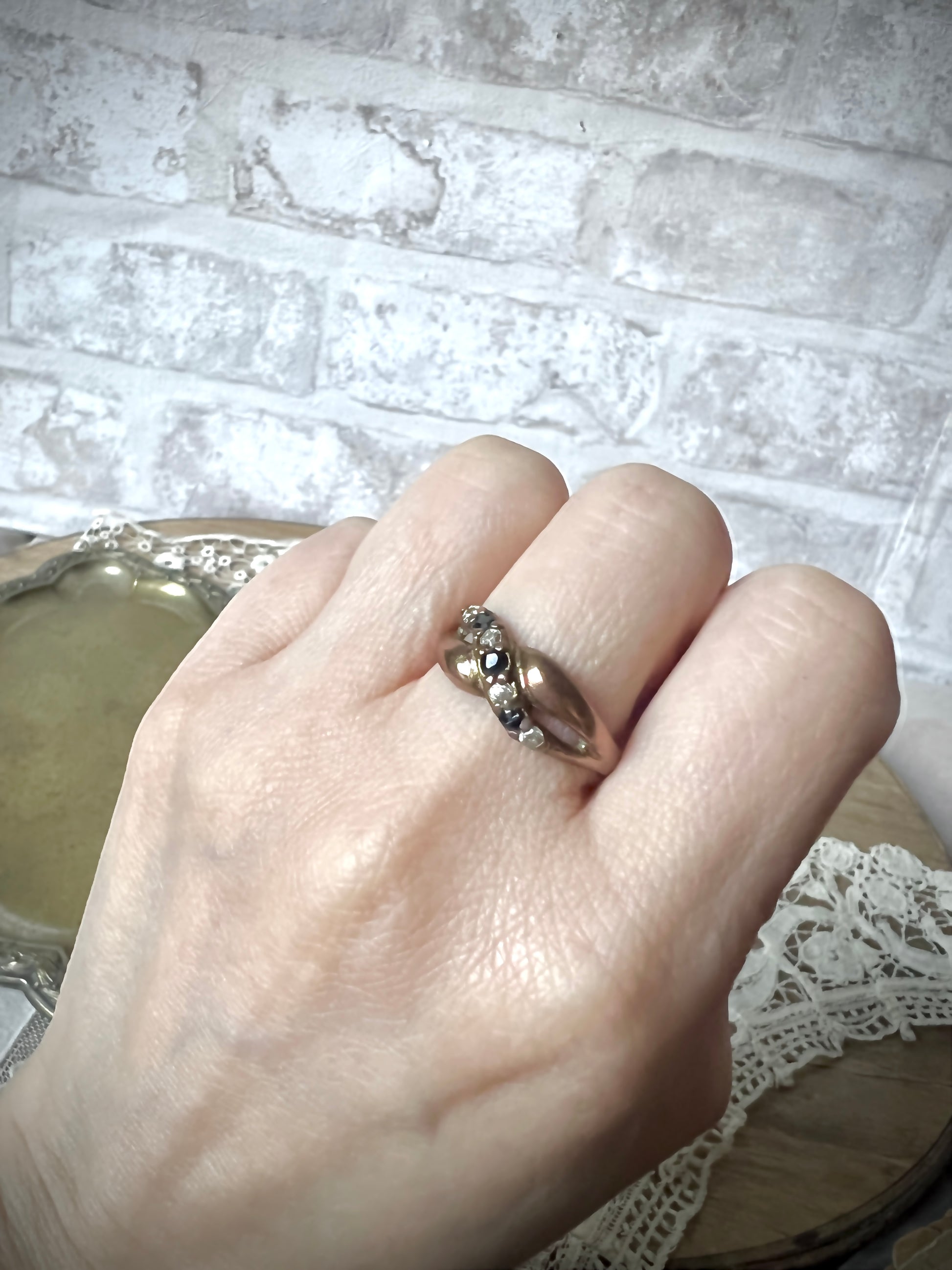 センターには深みのあるダークカラーのストーンが配され、その周囲を小さなクリアストーンが取り巻く、クラシカルなデザイン