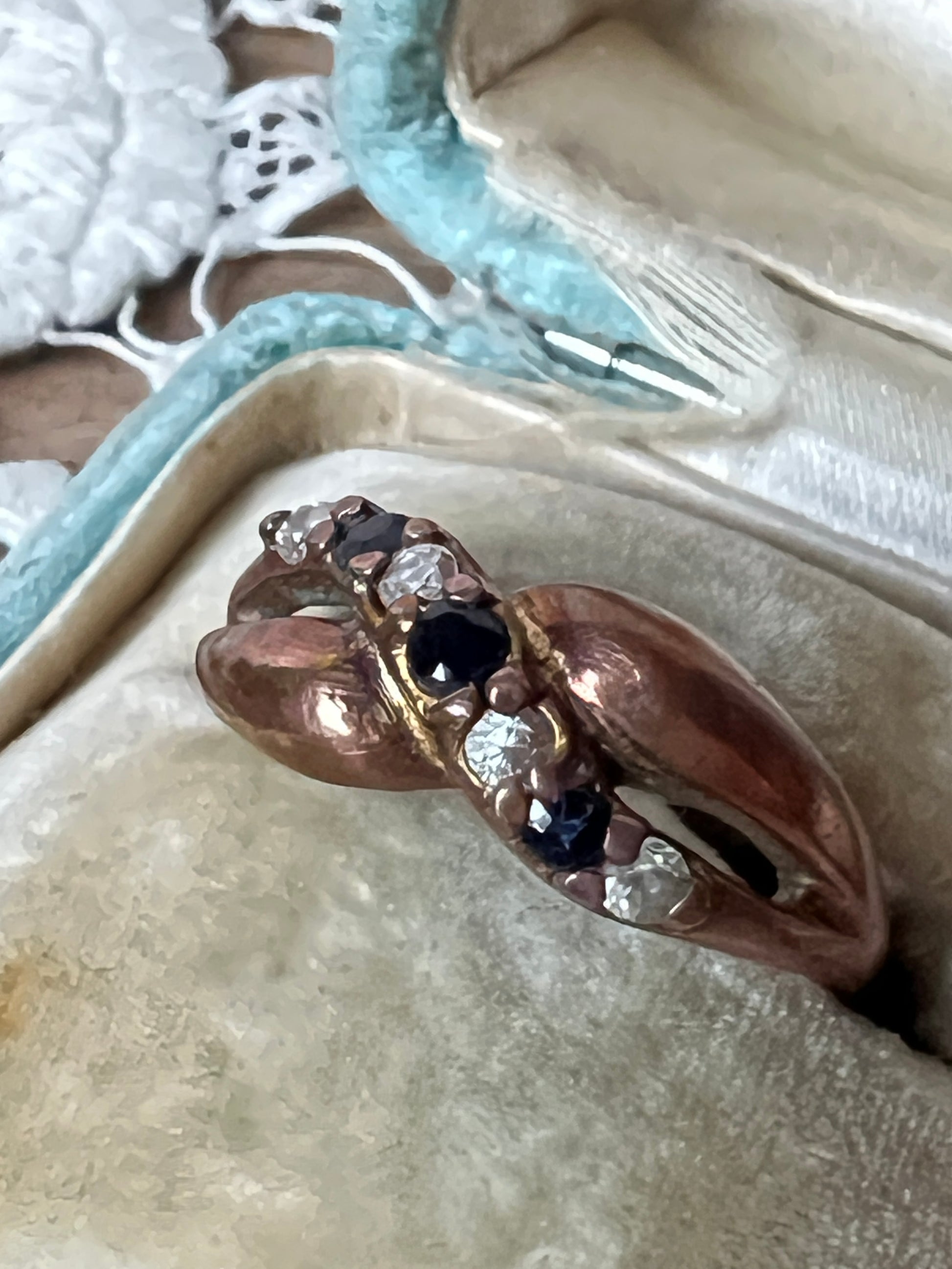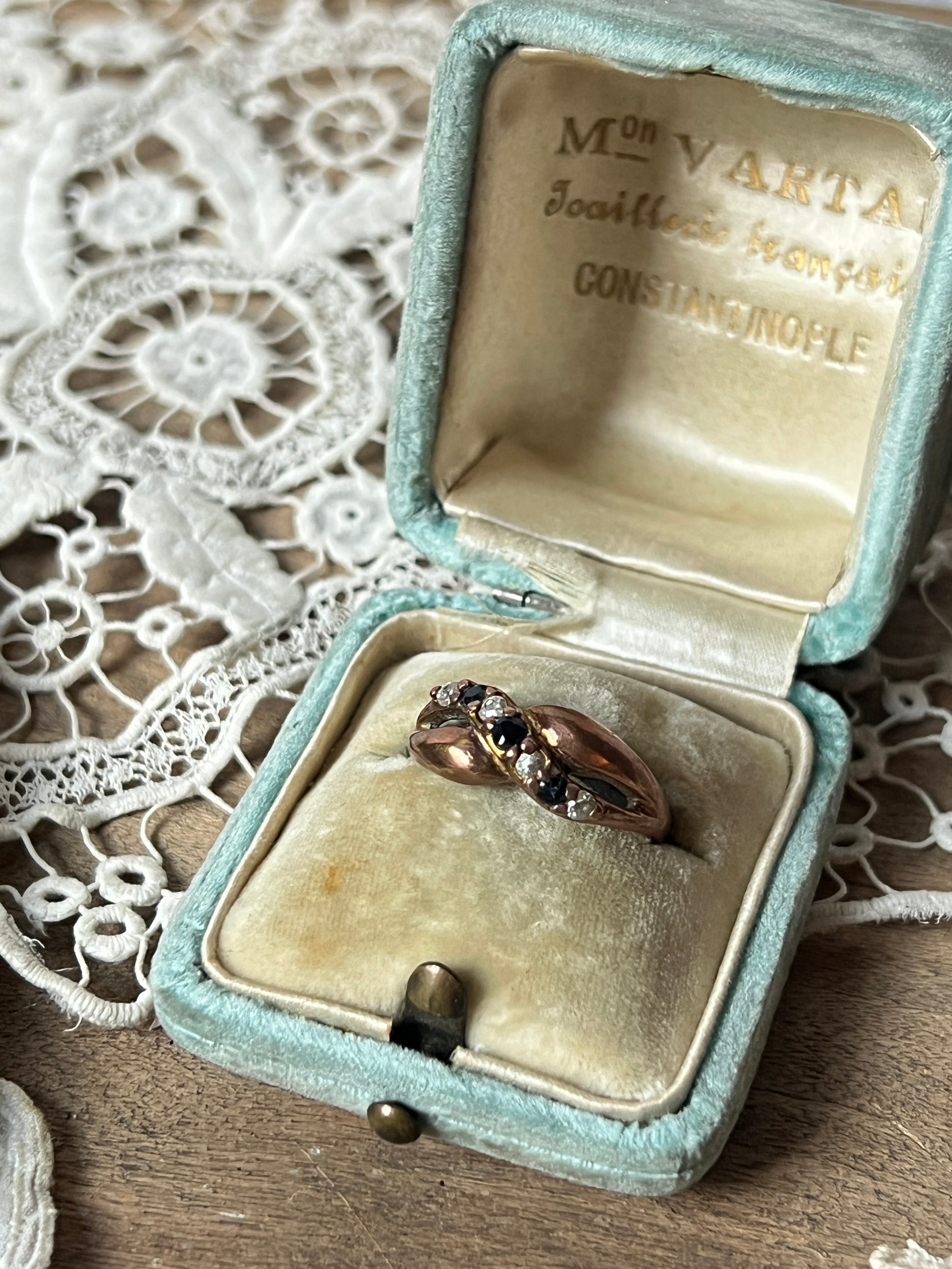 長い年月を経てきたアンティーク品のため、金属部分にはわずかな小傷や経年による風合いが見られますが、全体の印象を損なうものではなく、むしろ時を重ねたジュエリーならではの味わいとしてお楽しみいただけます