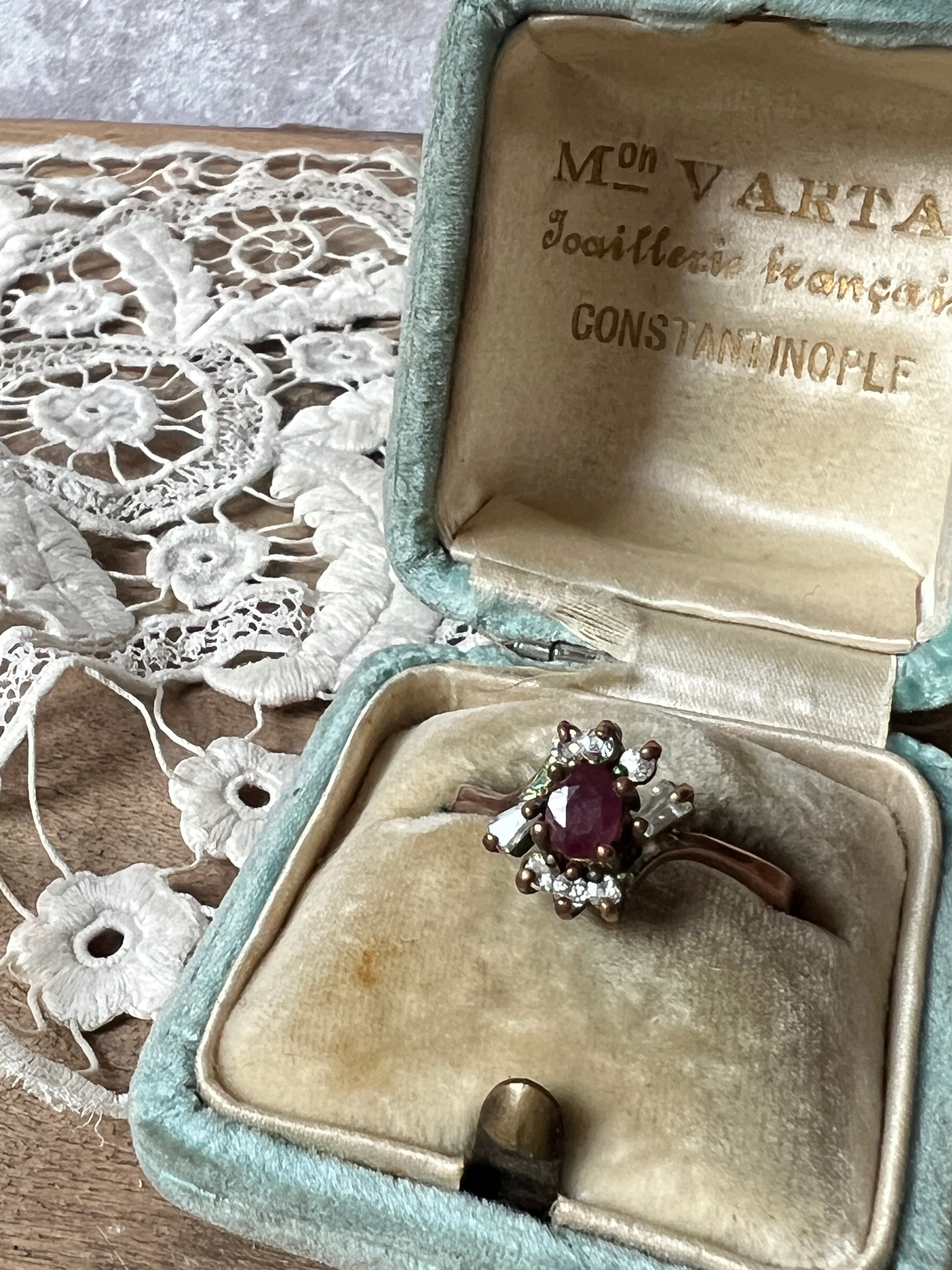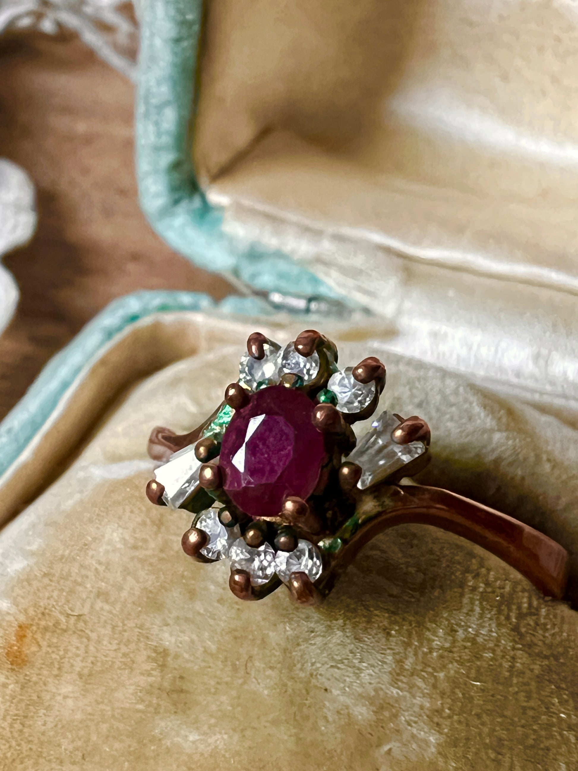時を重ねた深い色を纏うルビー色パーツのクラスターリングです