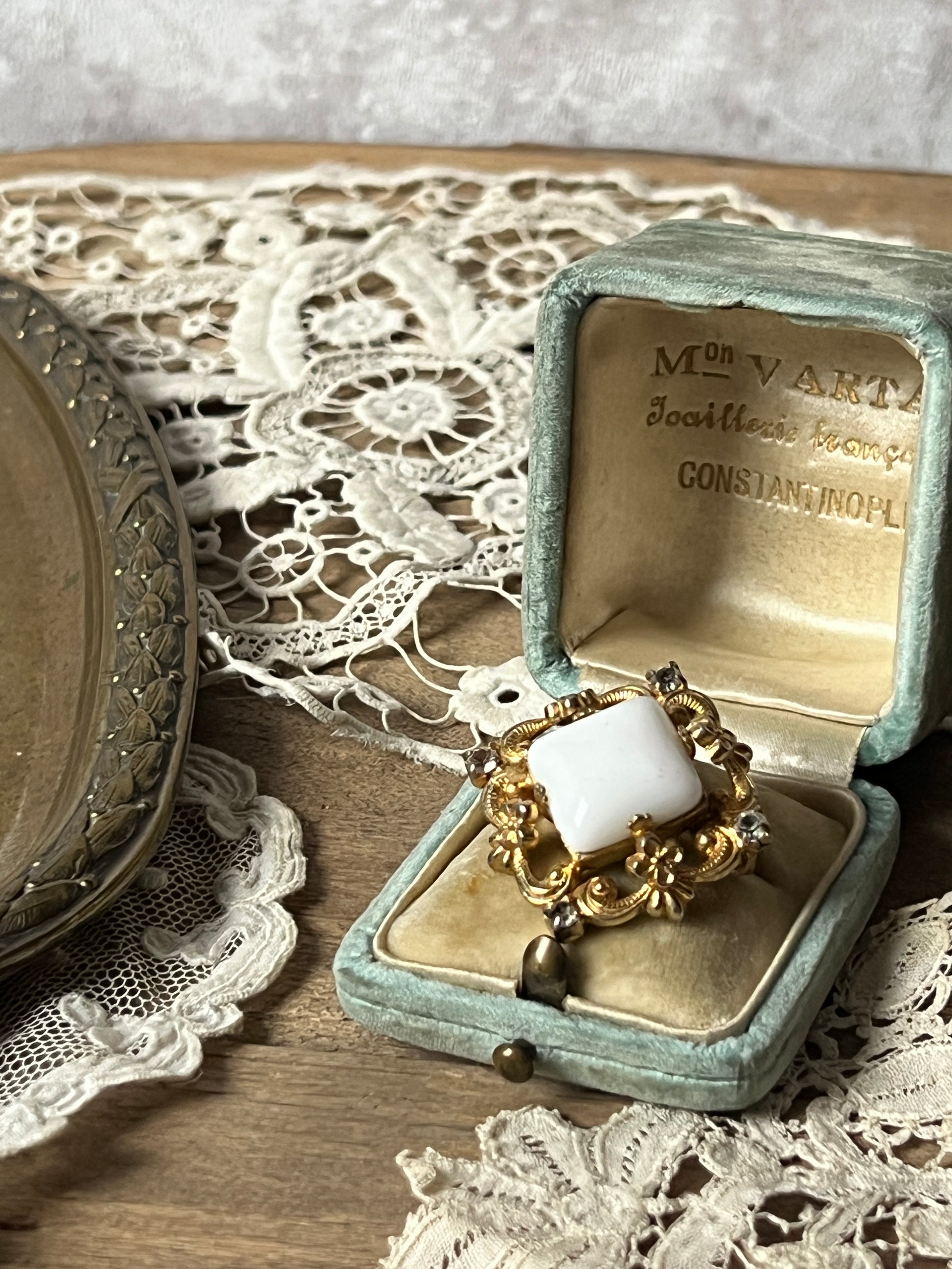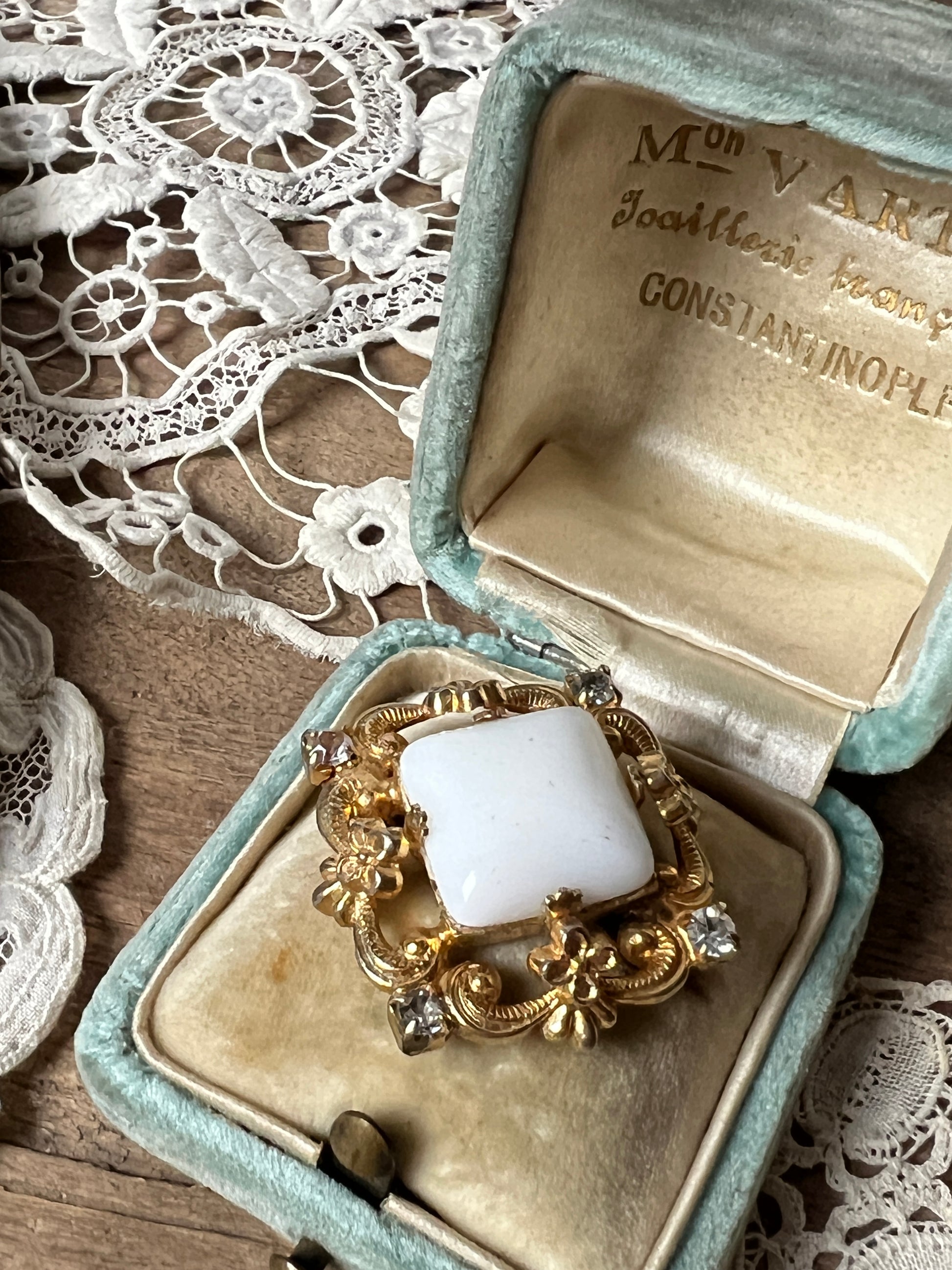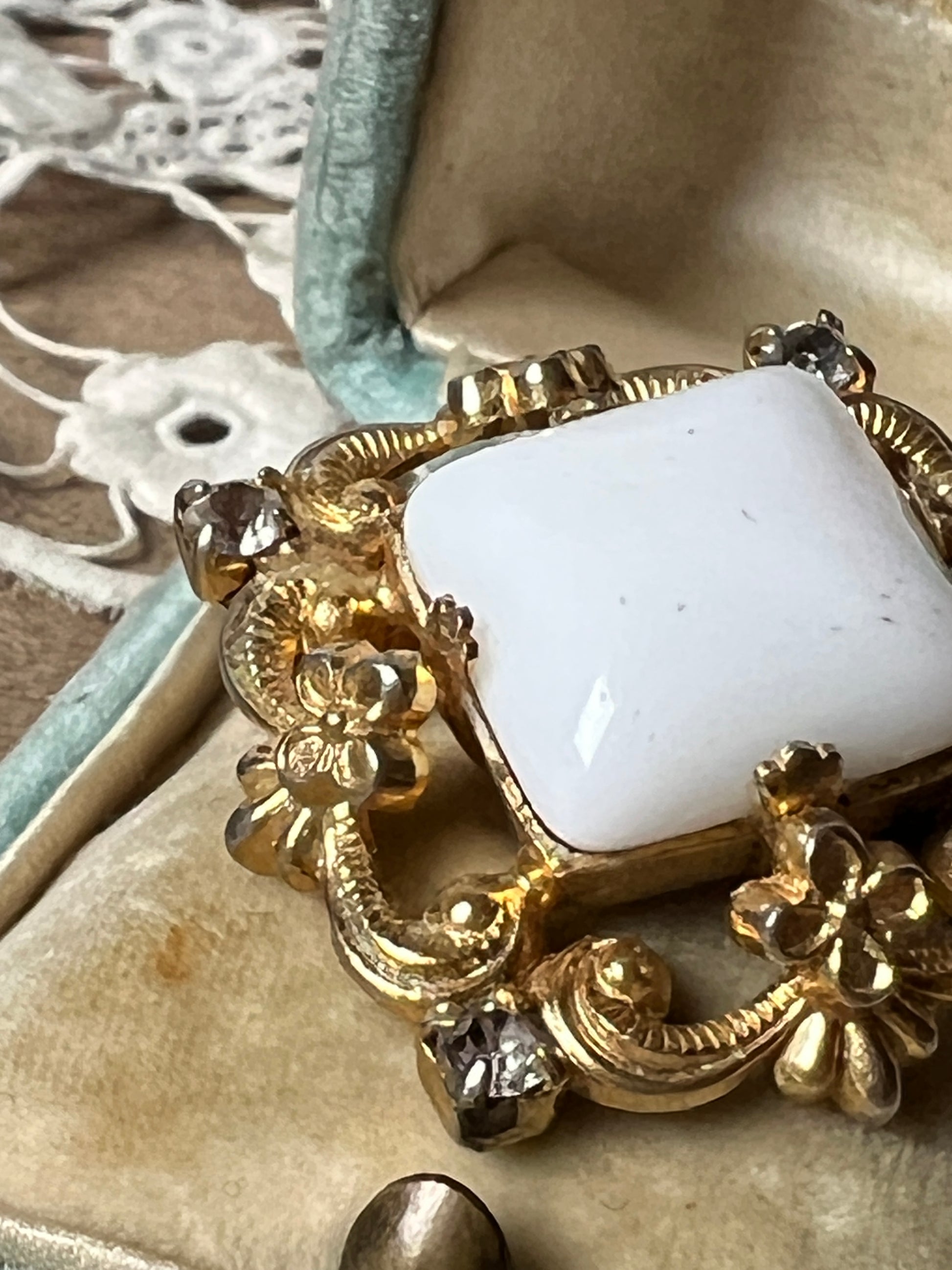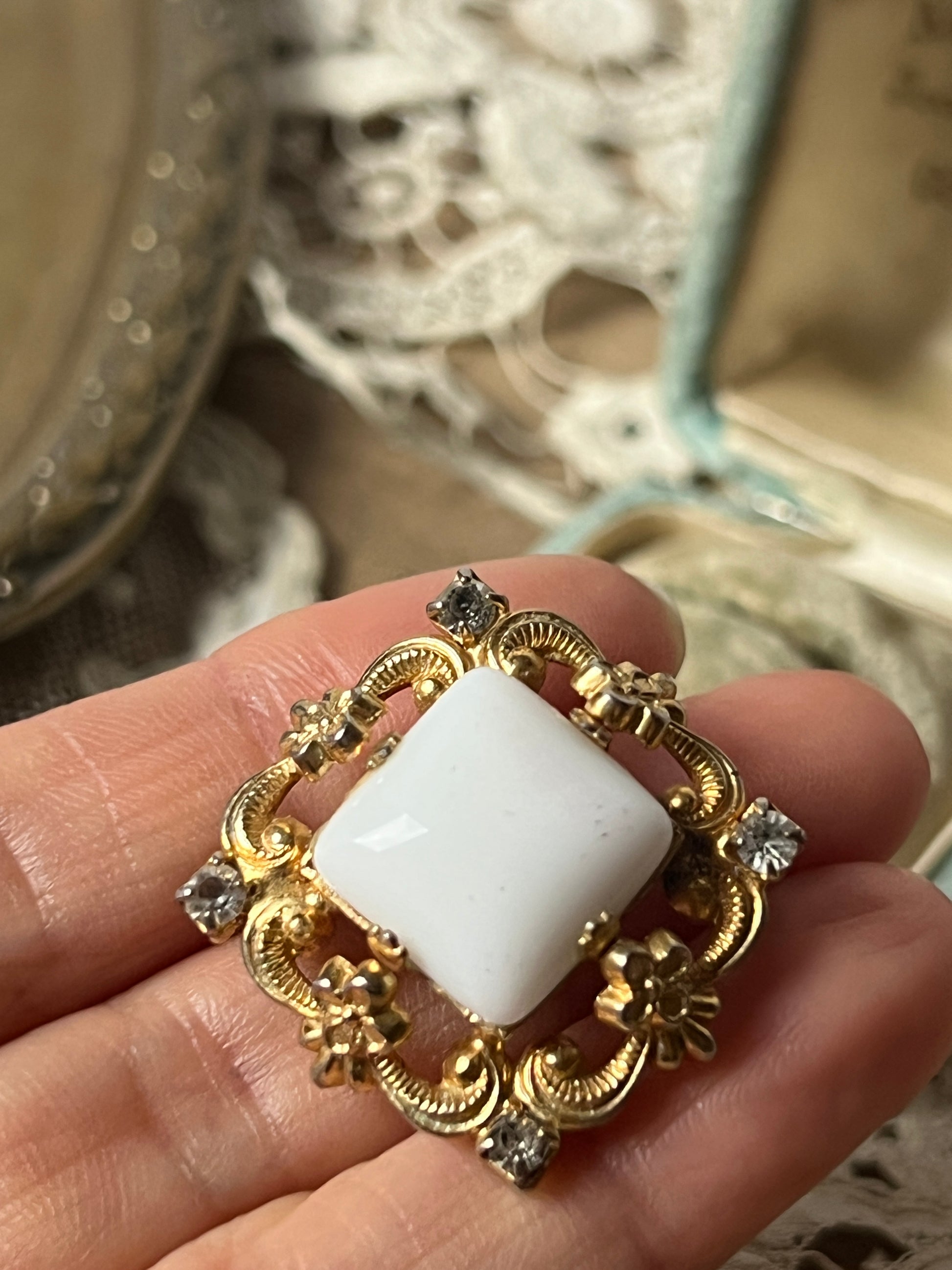 気品あふれる純白のパーツを主役に、緻密な細工が華を添えるビンテージブローチです