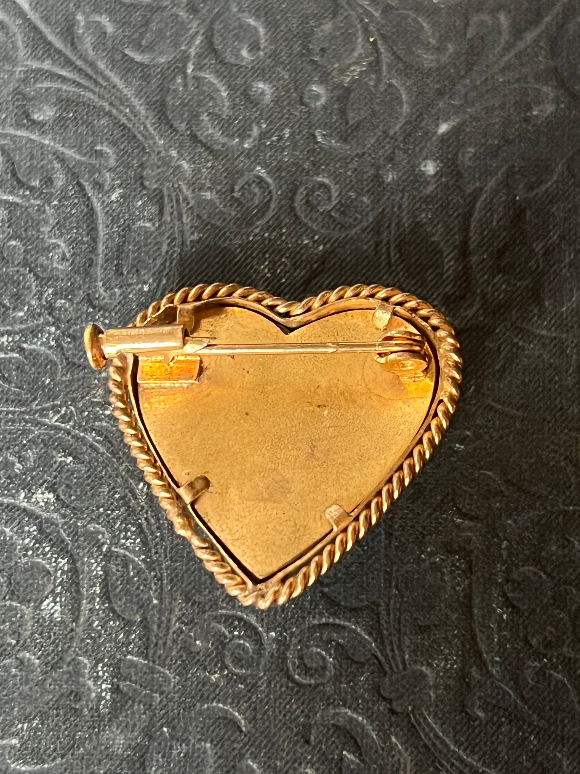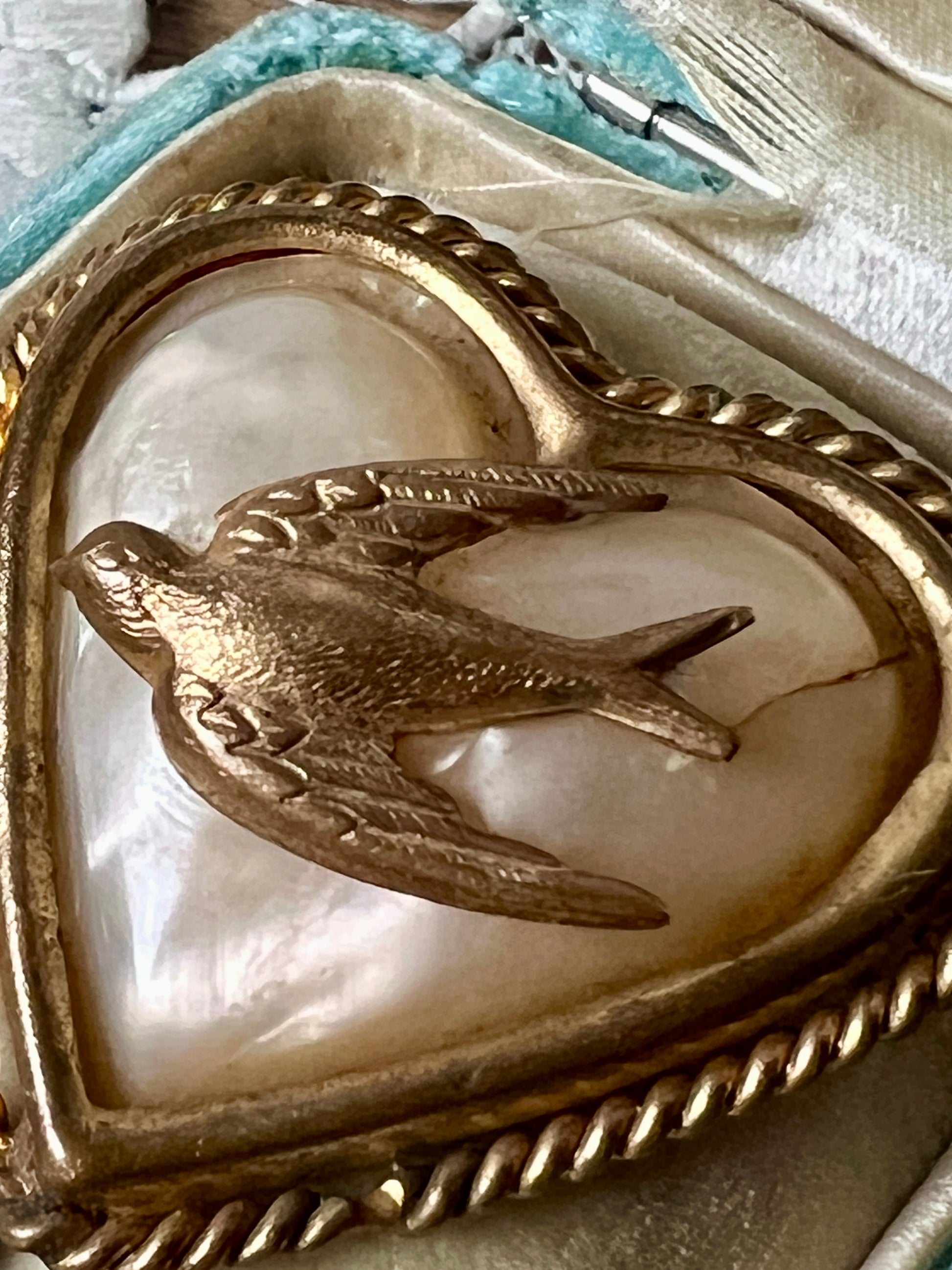 真鍮製台座にセルロイドのパーツ、つばめのモチーフが配置されたアンティークのハート型ブローチです