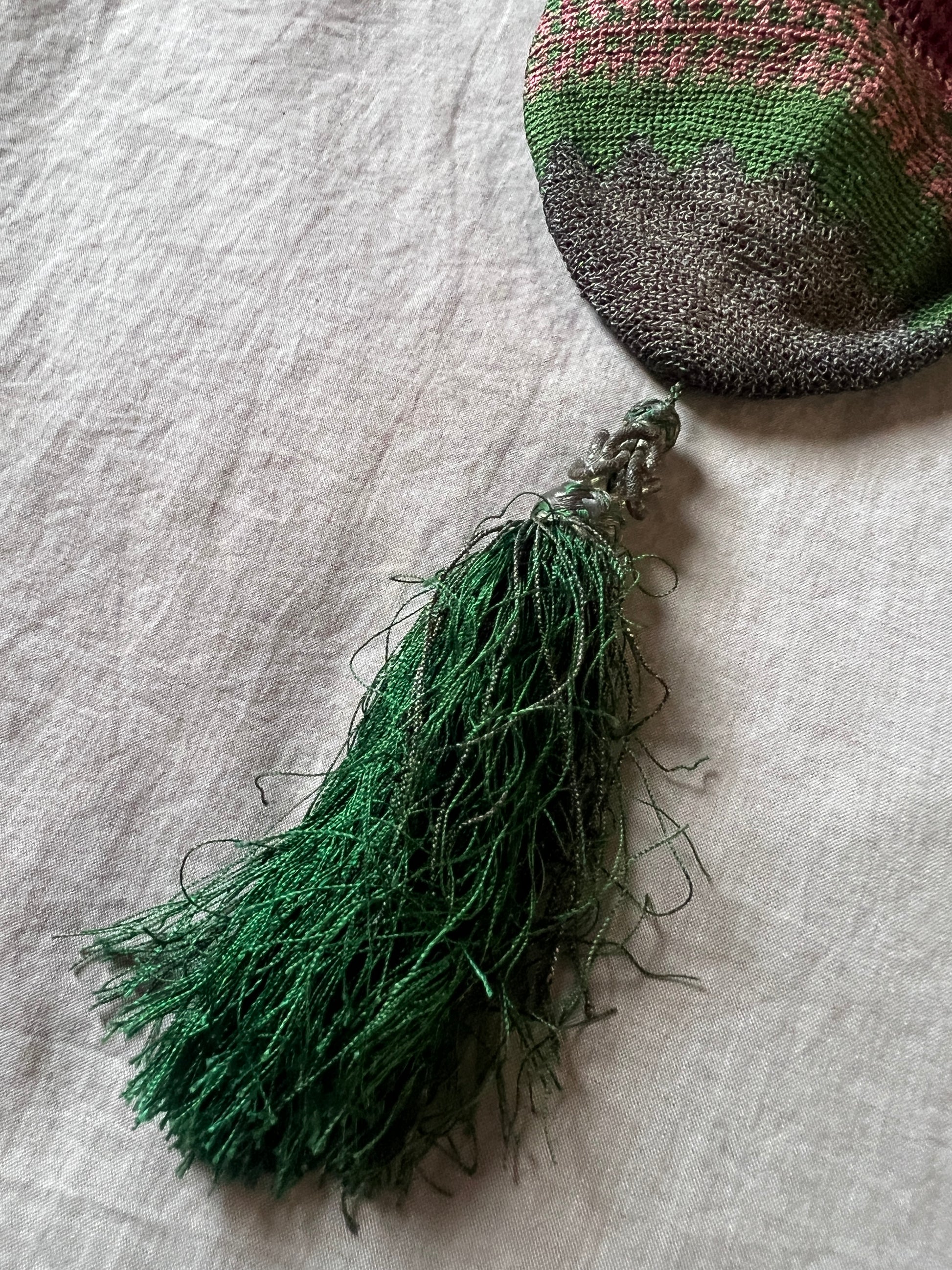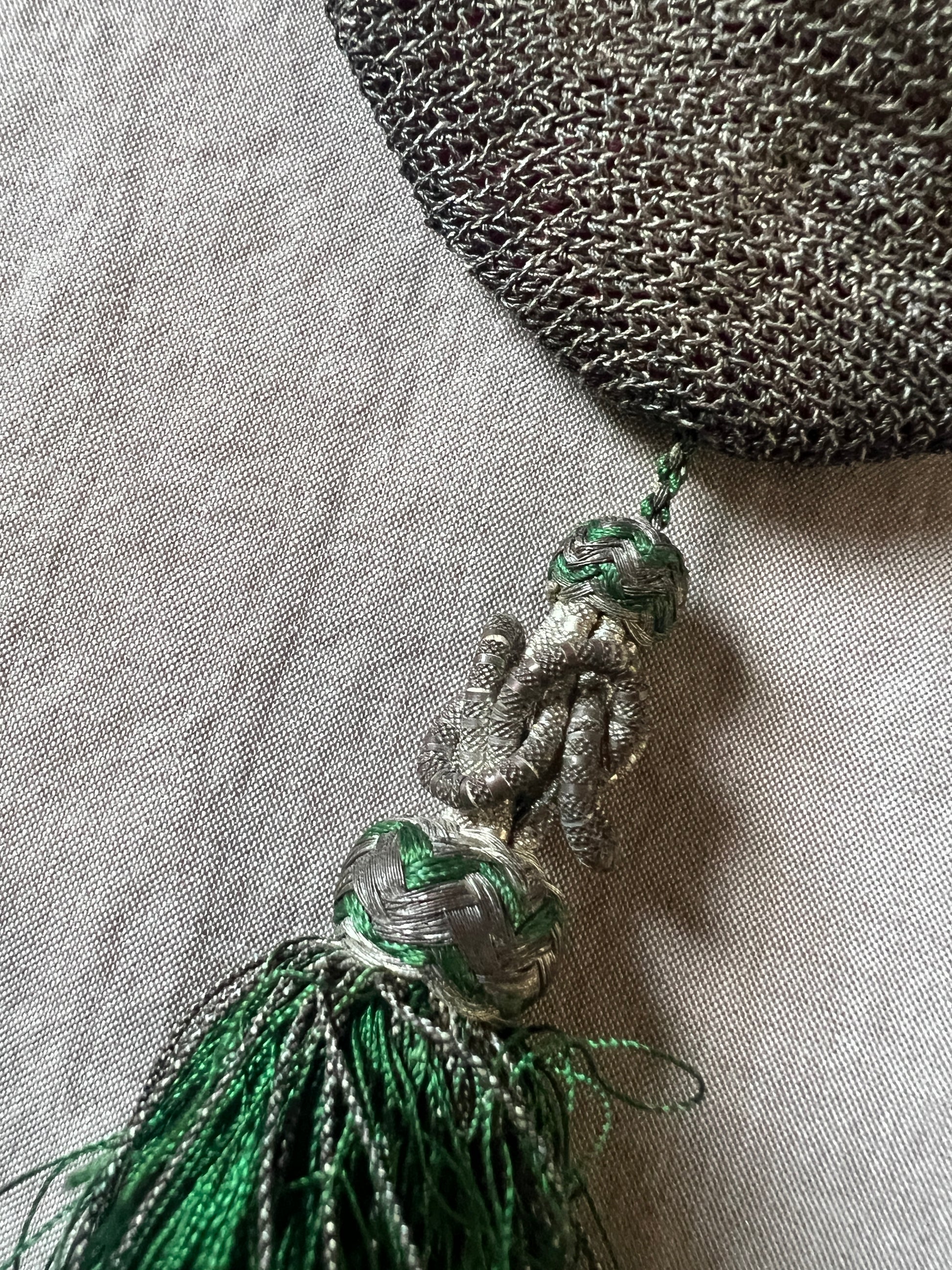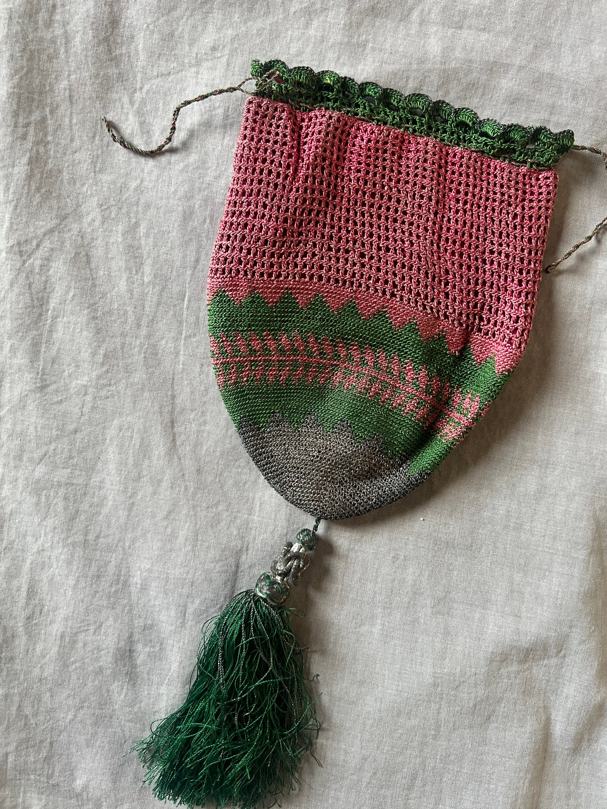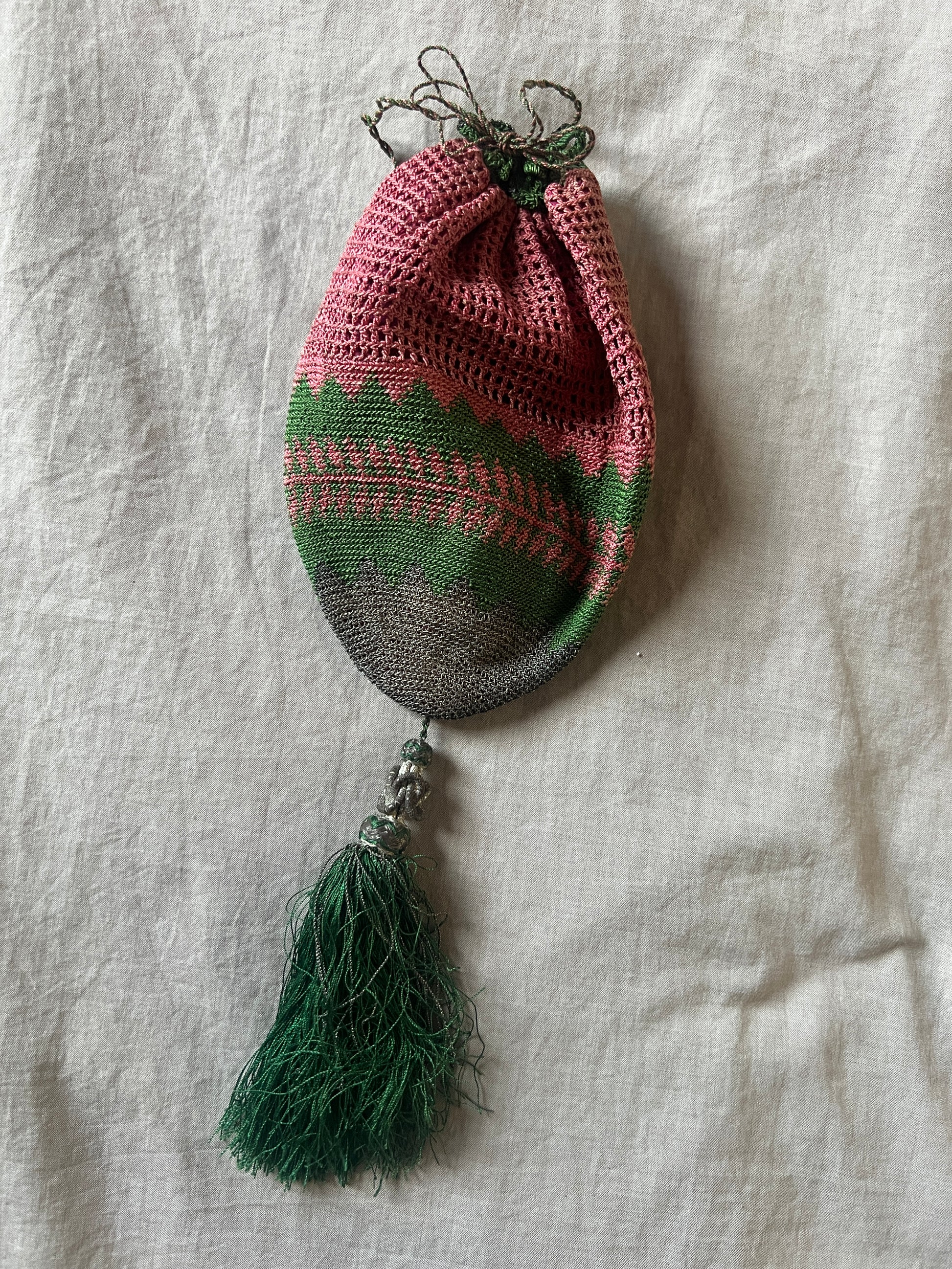 メタルヤーンを使って細い糸で緻密に編み上げられた幾何学模様や、開口部の繊細な縁飾りに、当時の手仕事の熟練した技術が光ります