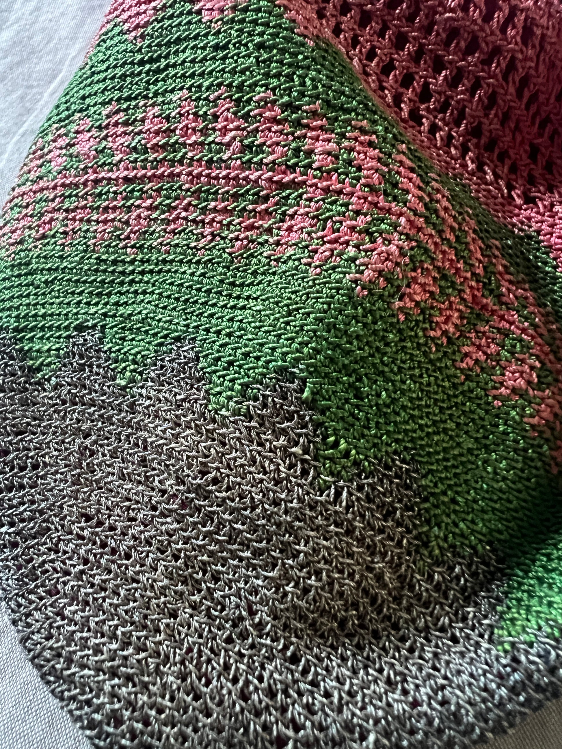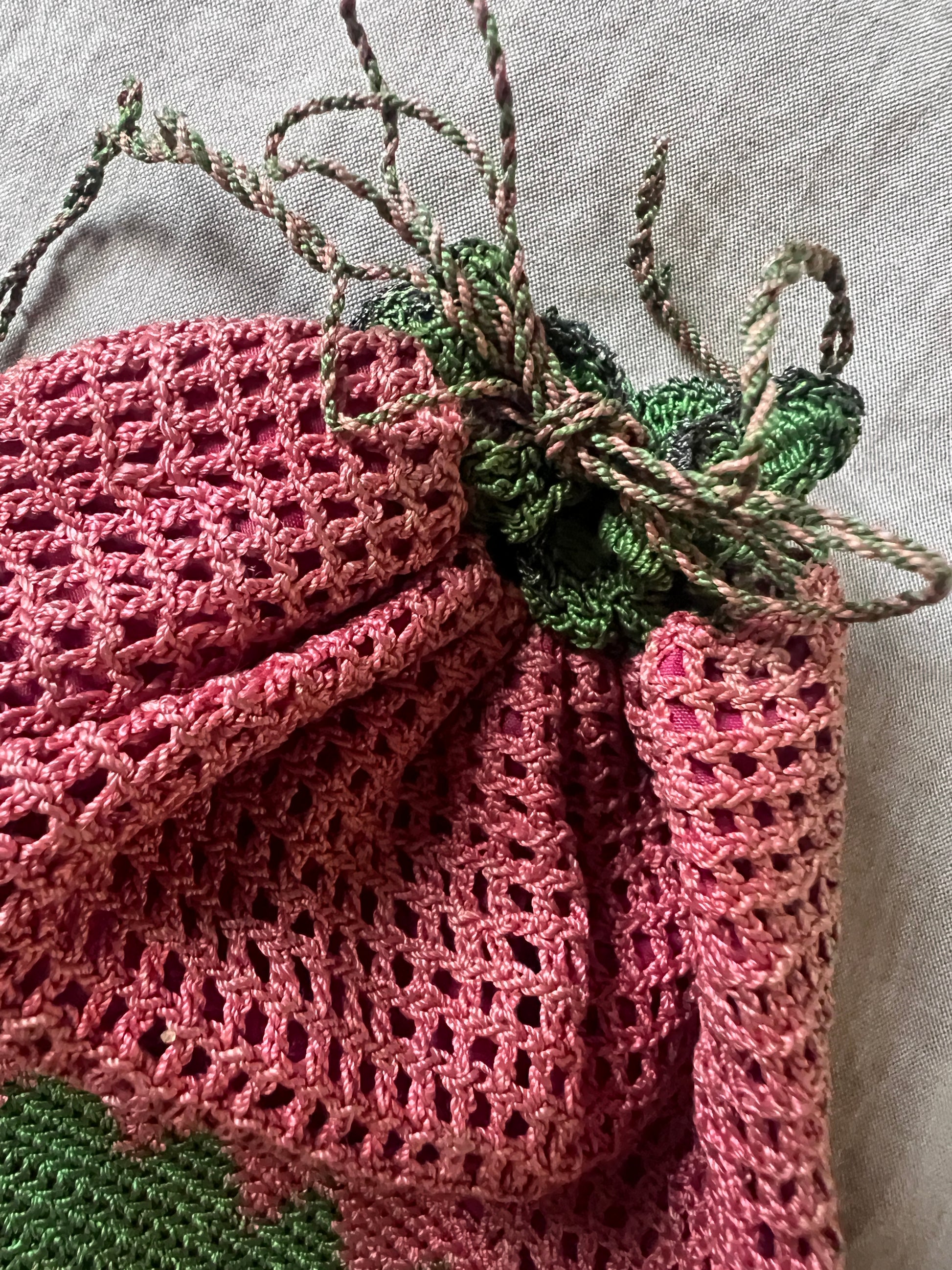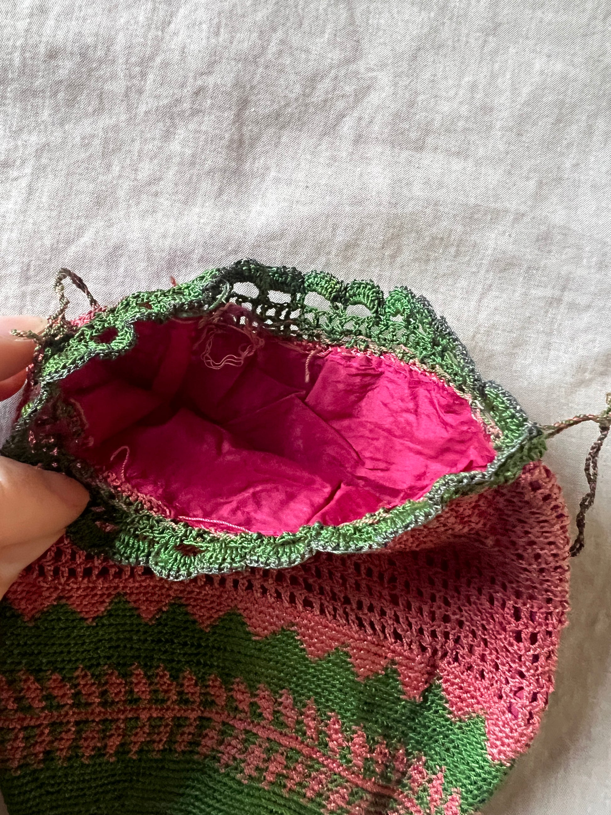 深みあるピンクとグリーンのコントラストが目を引く房飾り付き巾着(裏地付き)です
