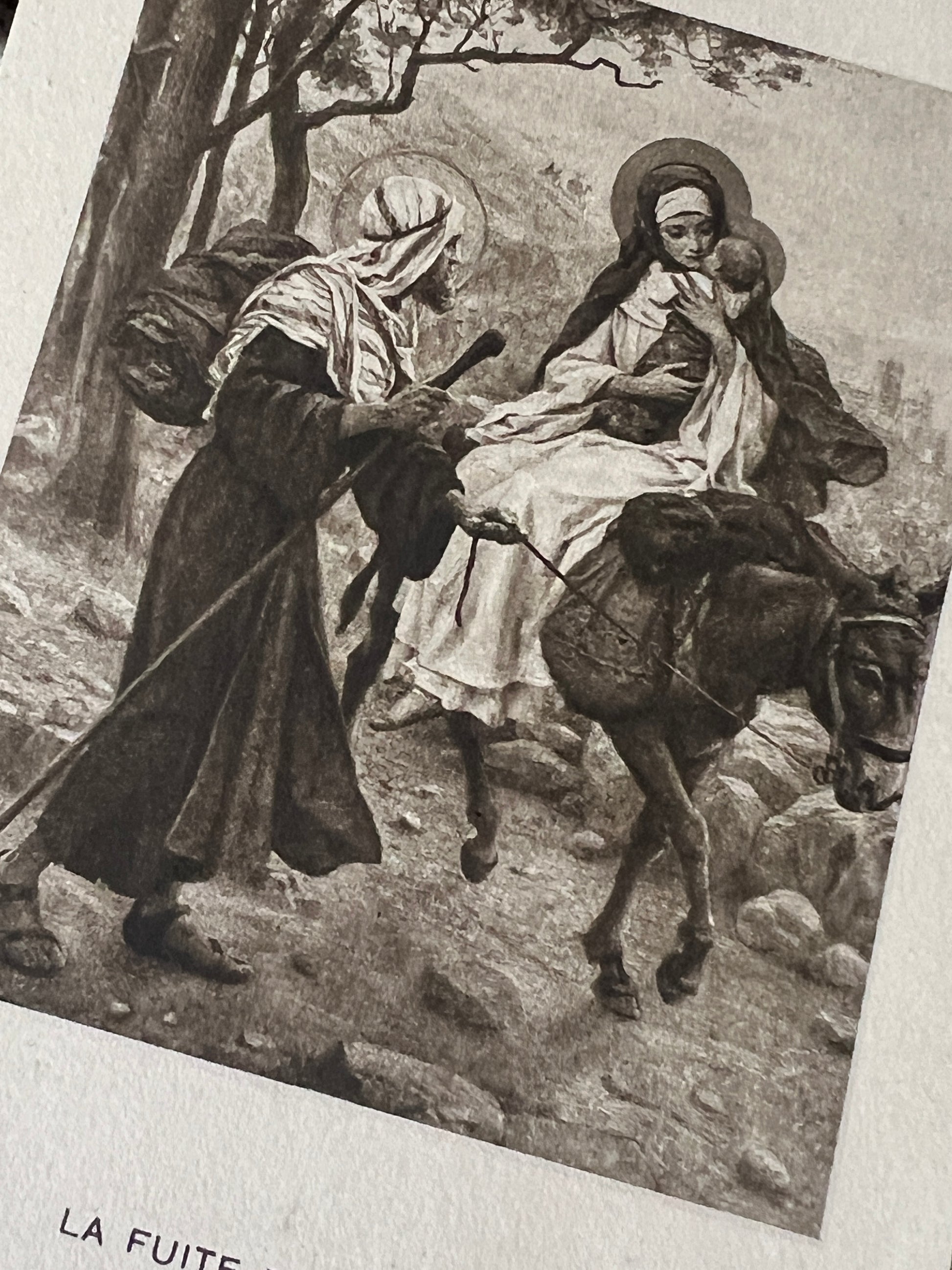 エジプトへの逃避や十字架降架といった聖書の重要な場面が、重厚なグラフィックと細やかな陰影でドラマチックに描かれています