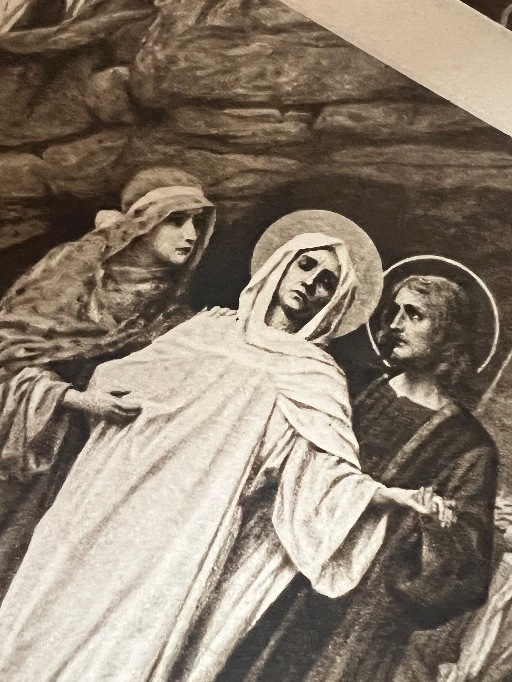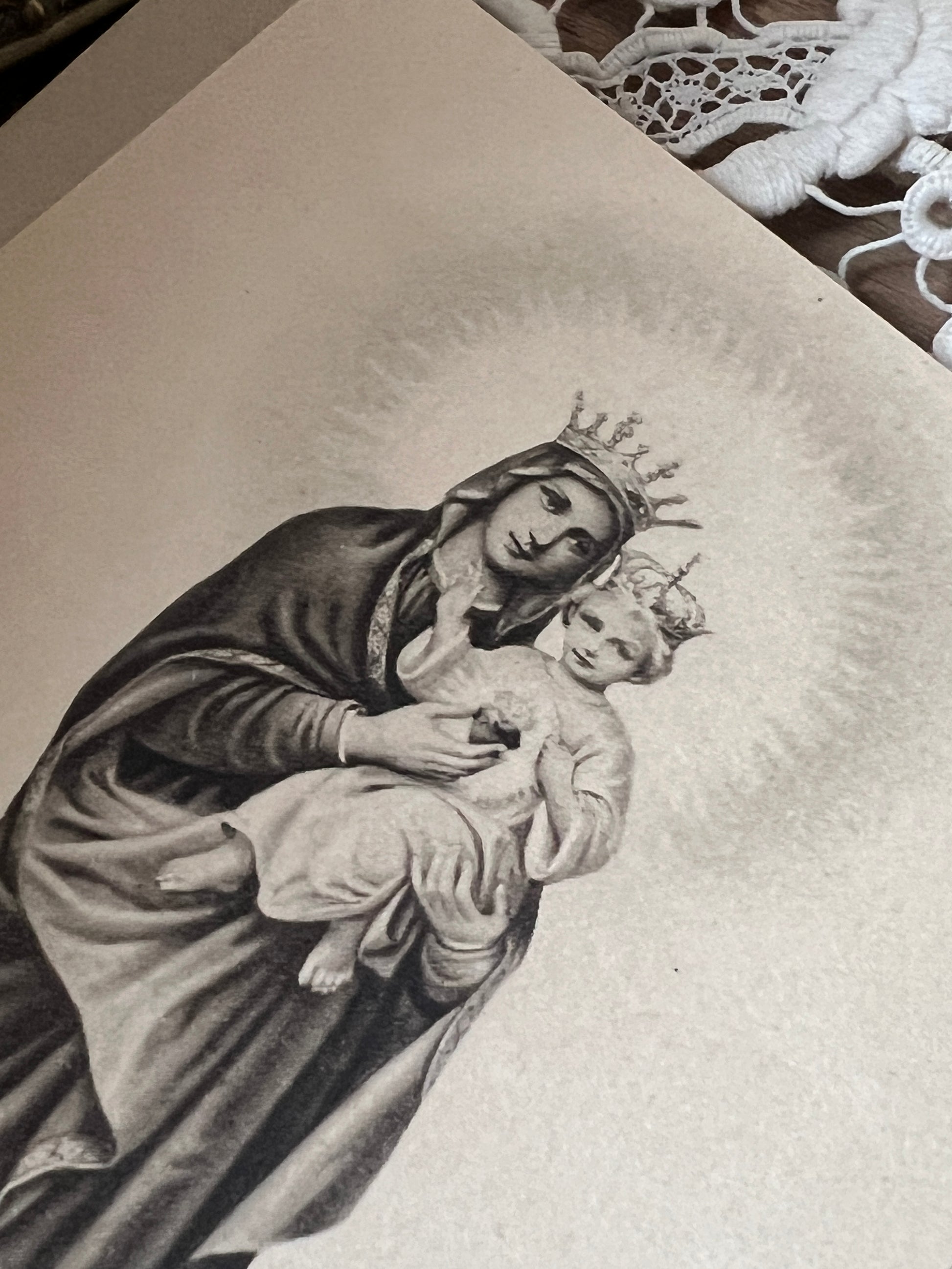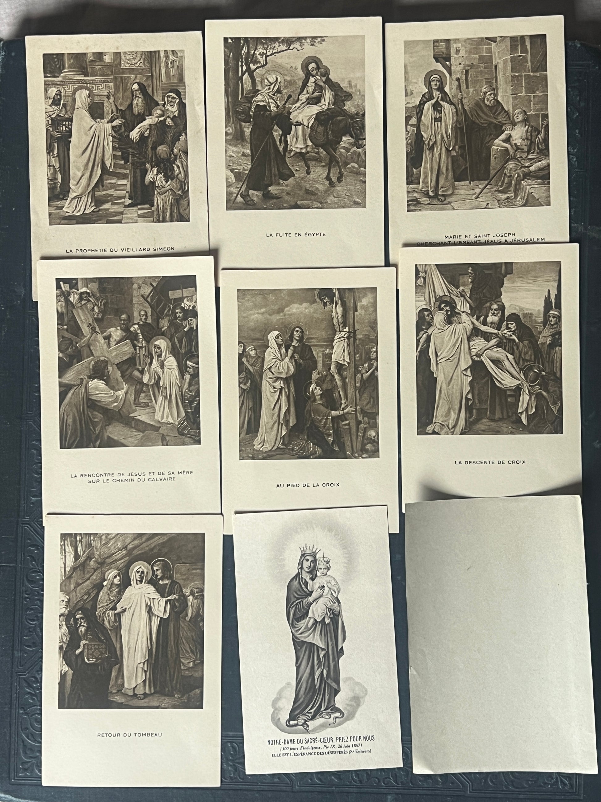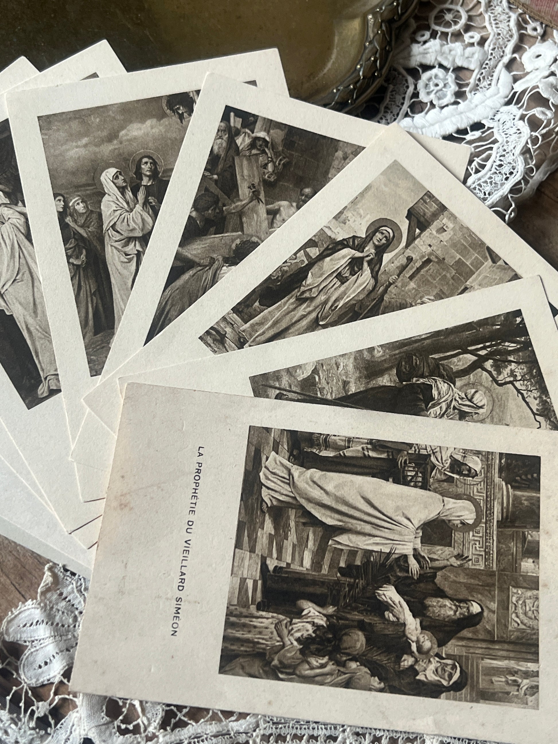 キリストの生涯や聖母マリアを主題とした、モノクロームのアンティーク聖画カードのセットです