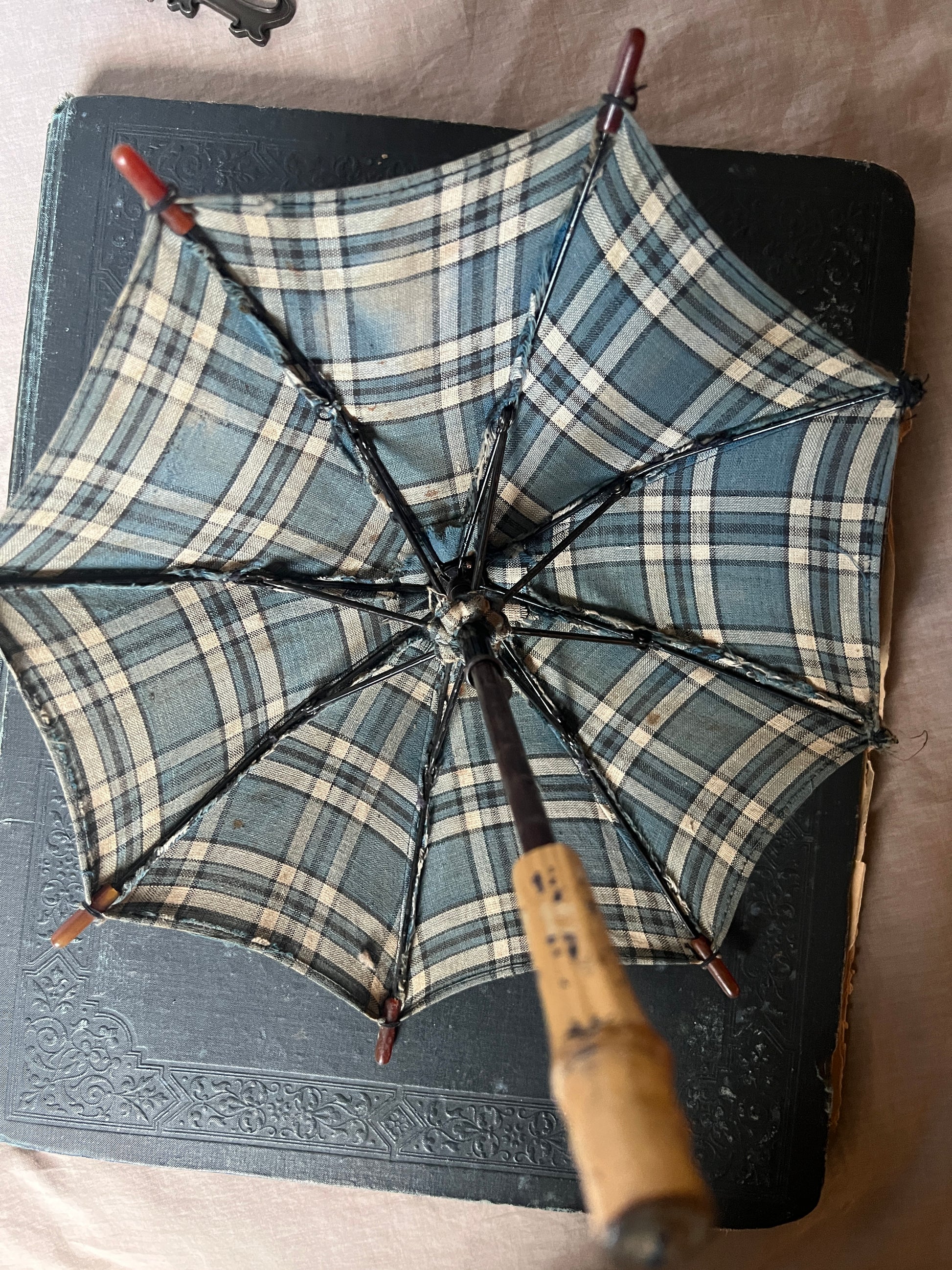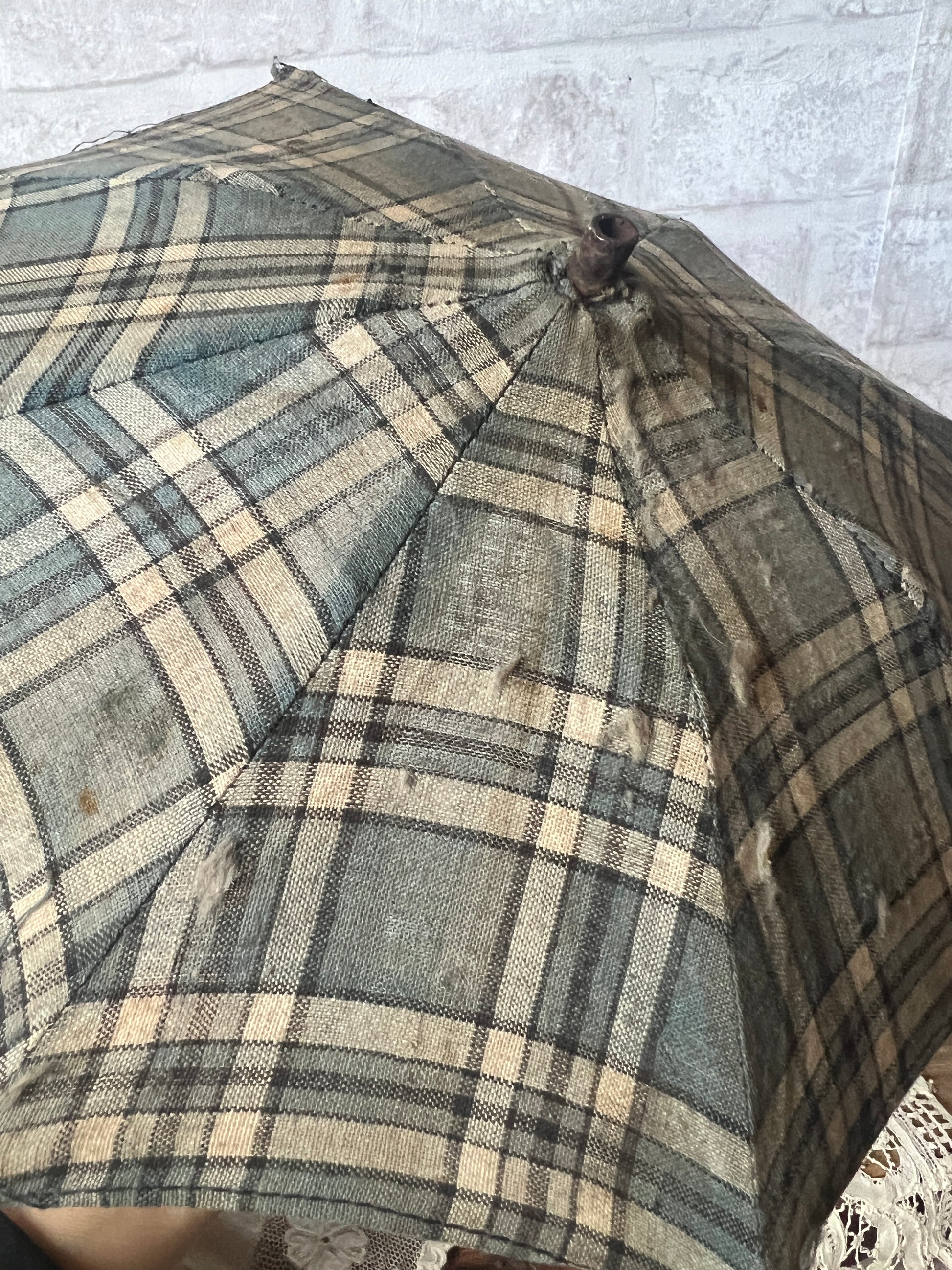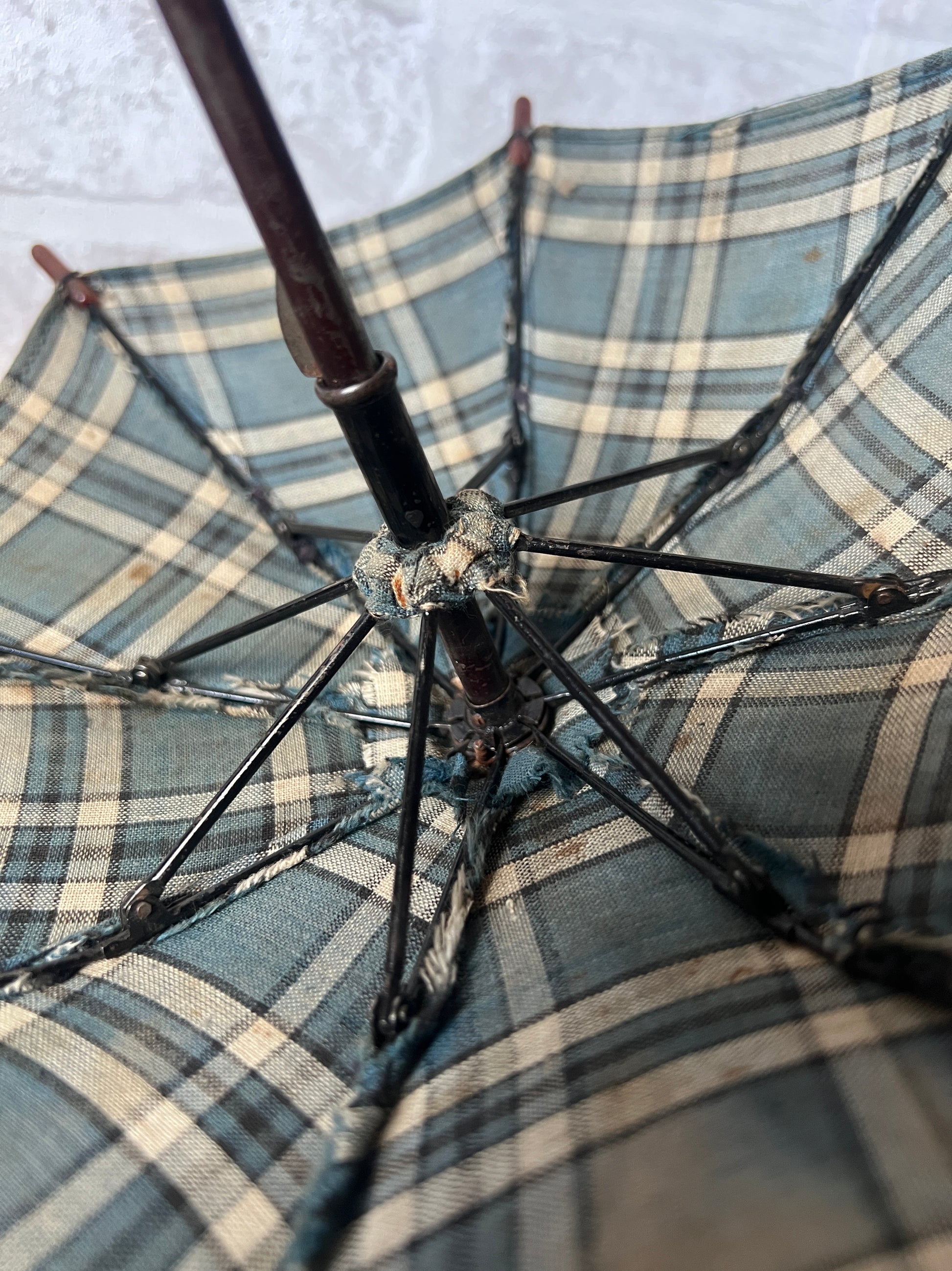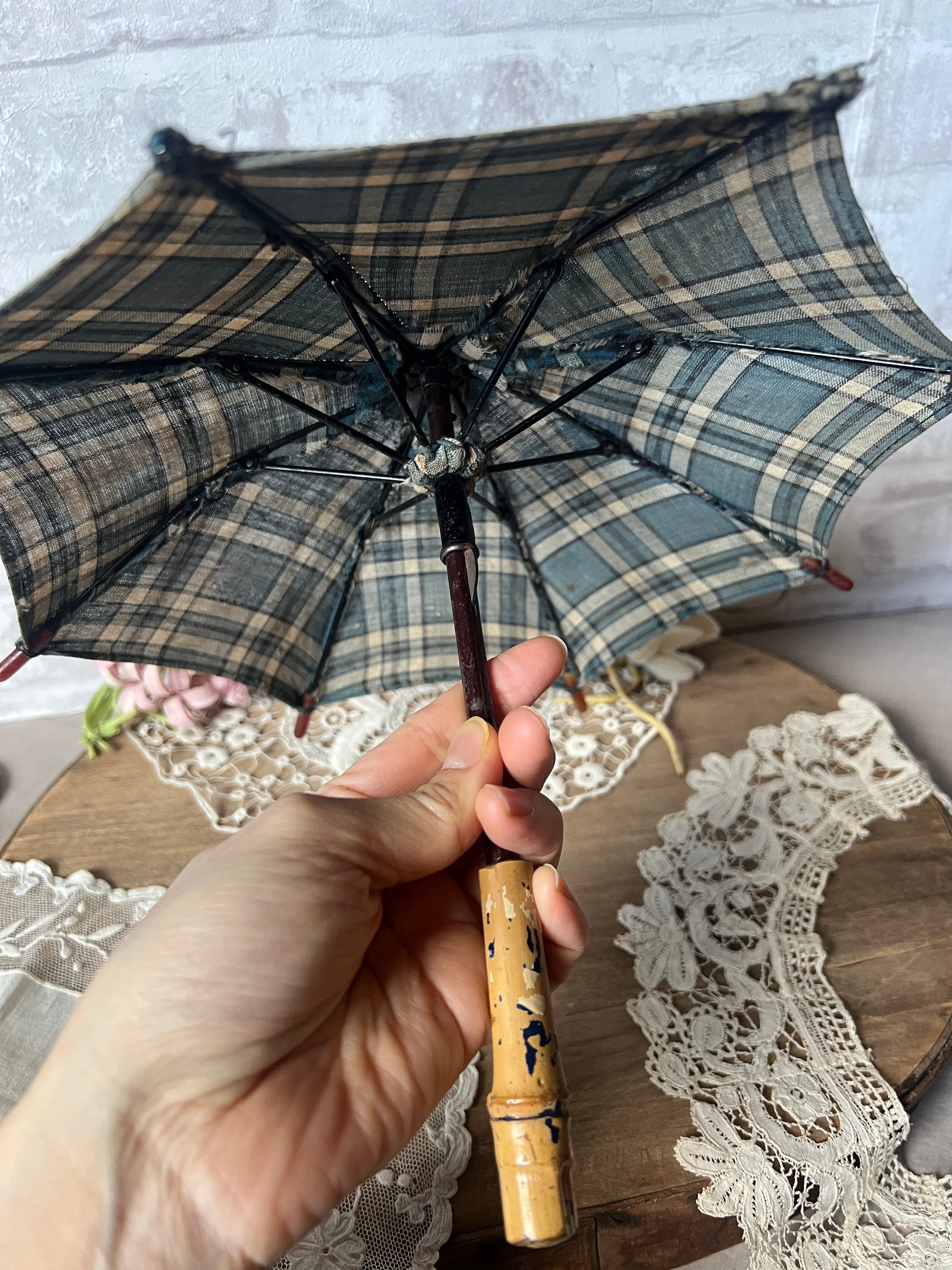 落ち着いたブルーとベージュのチェック柄のフランスのアンティーク・ドールパラソルです